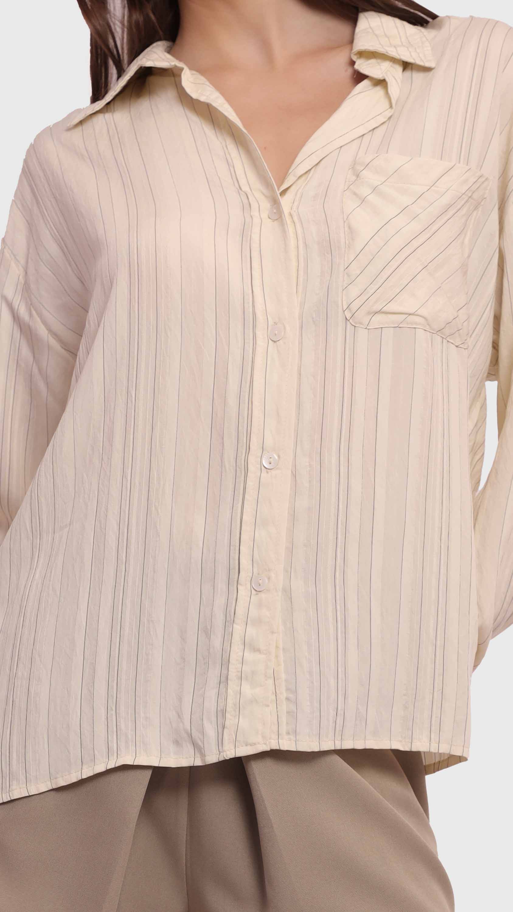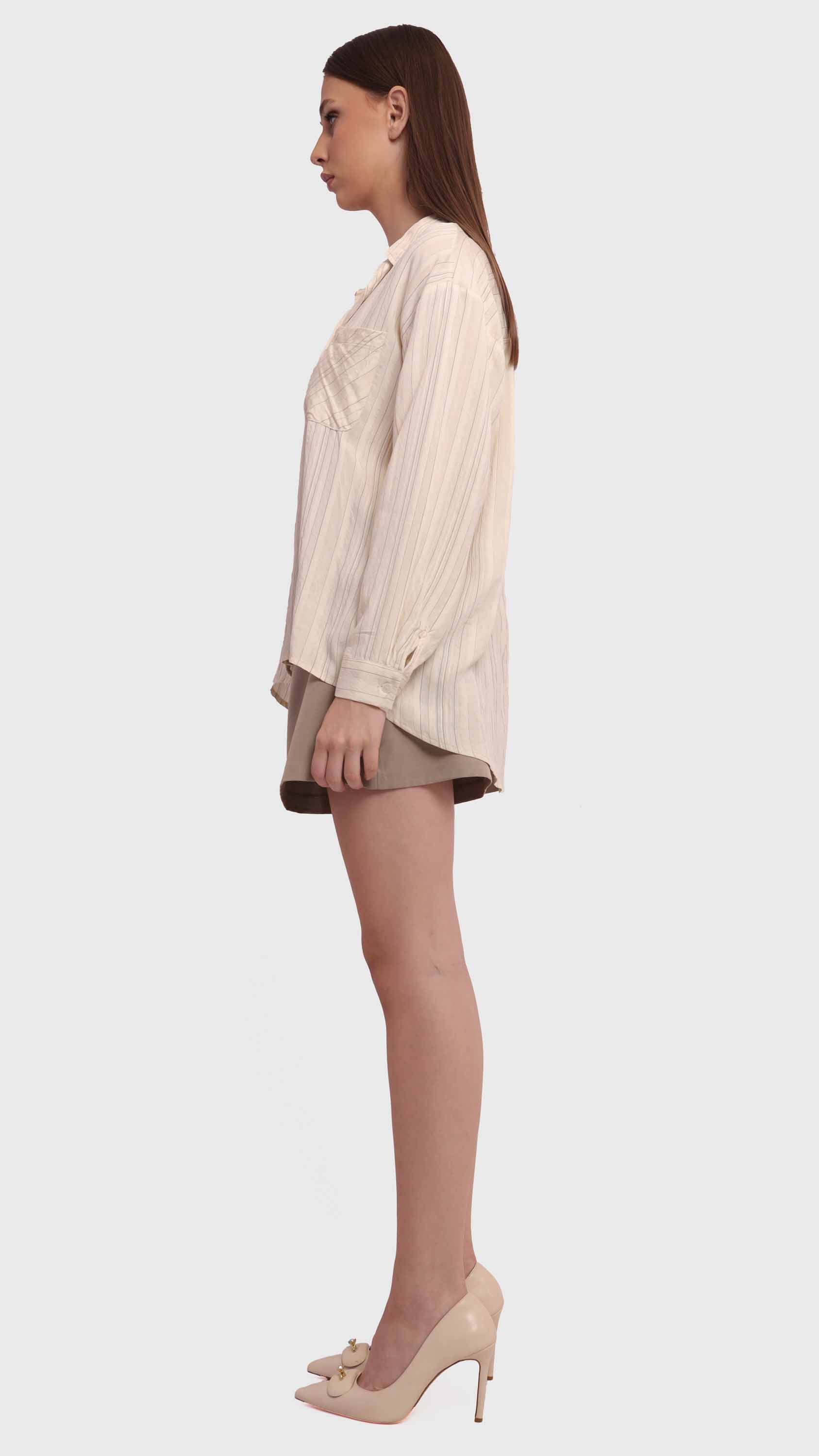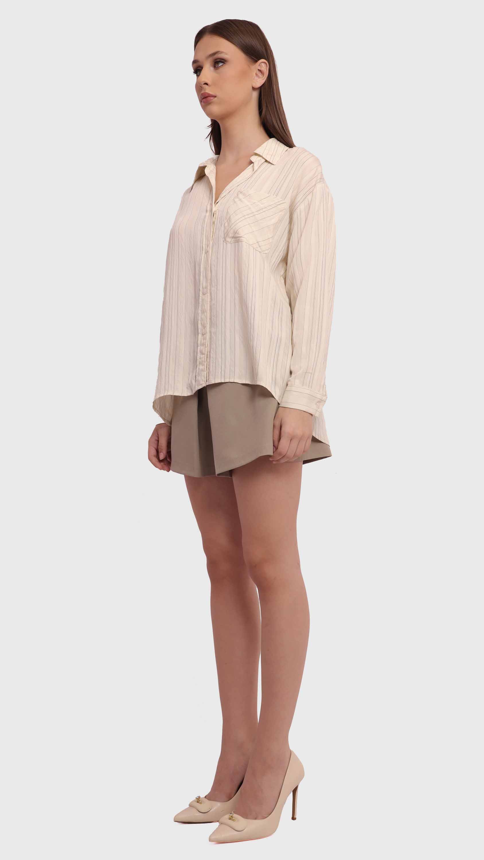 This is an oversized shirt featuring a vertical stripe pattern in soft contrasting tones. Designed with a relaxed, flowy fit, it has a high-low hem and a pointed collar. The shirt includes a chest pocket with horizontal stripes, adding a subtle detail to its overall look. Long sleaves with buttoned cuffs complete the casual yet elegant style.