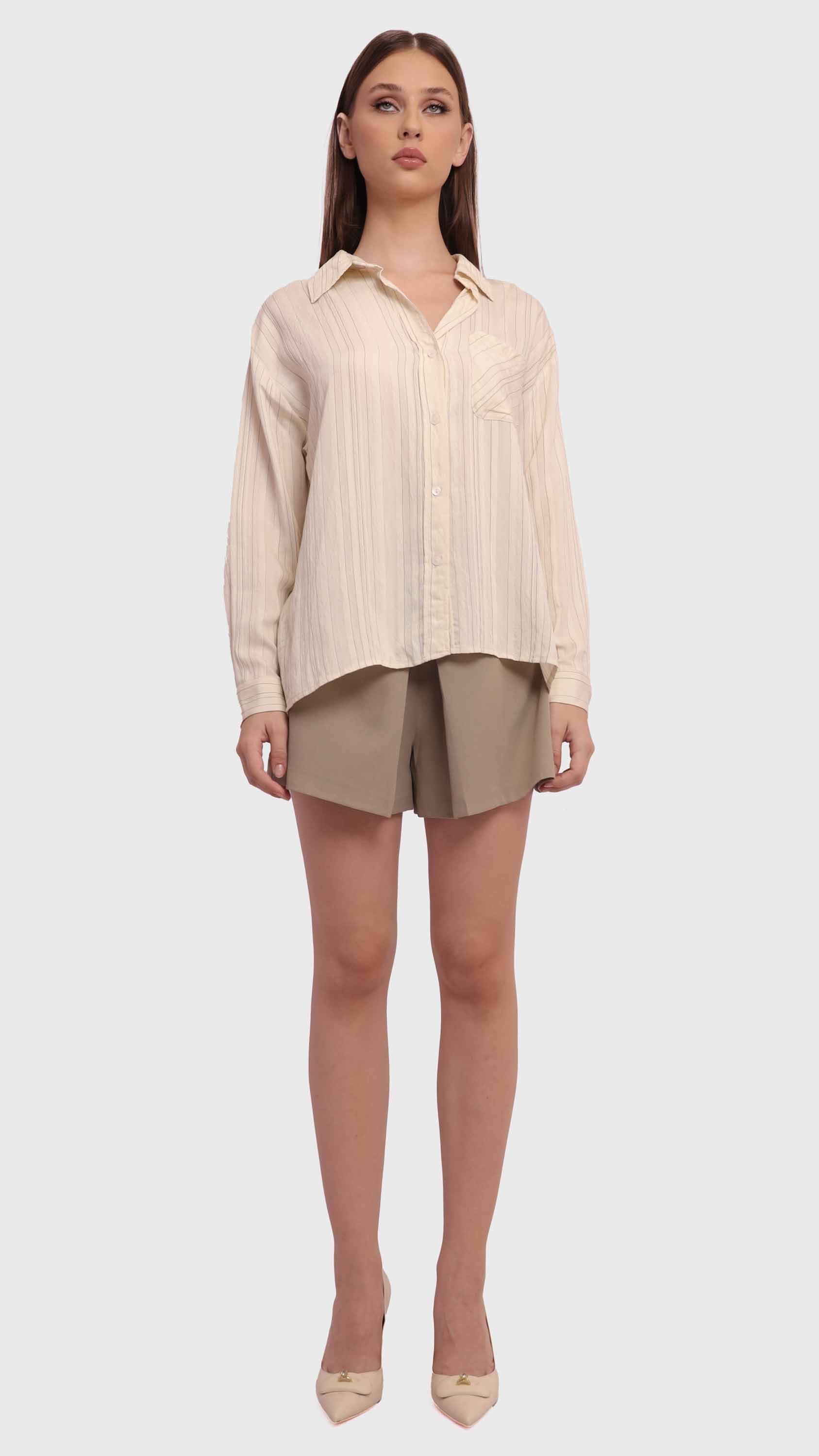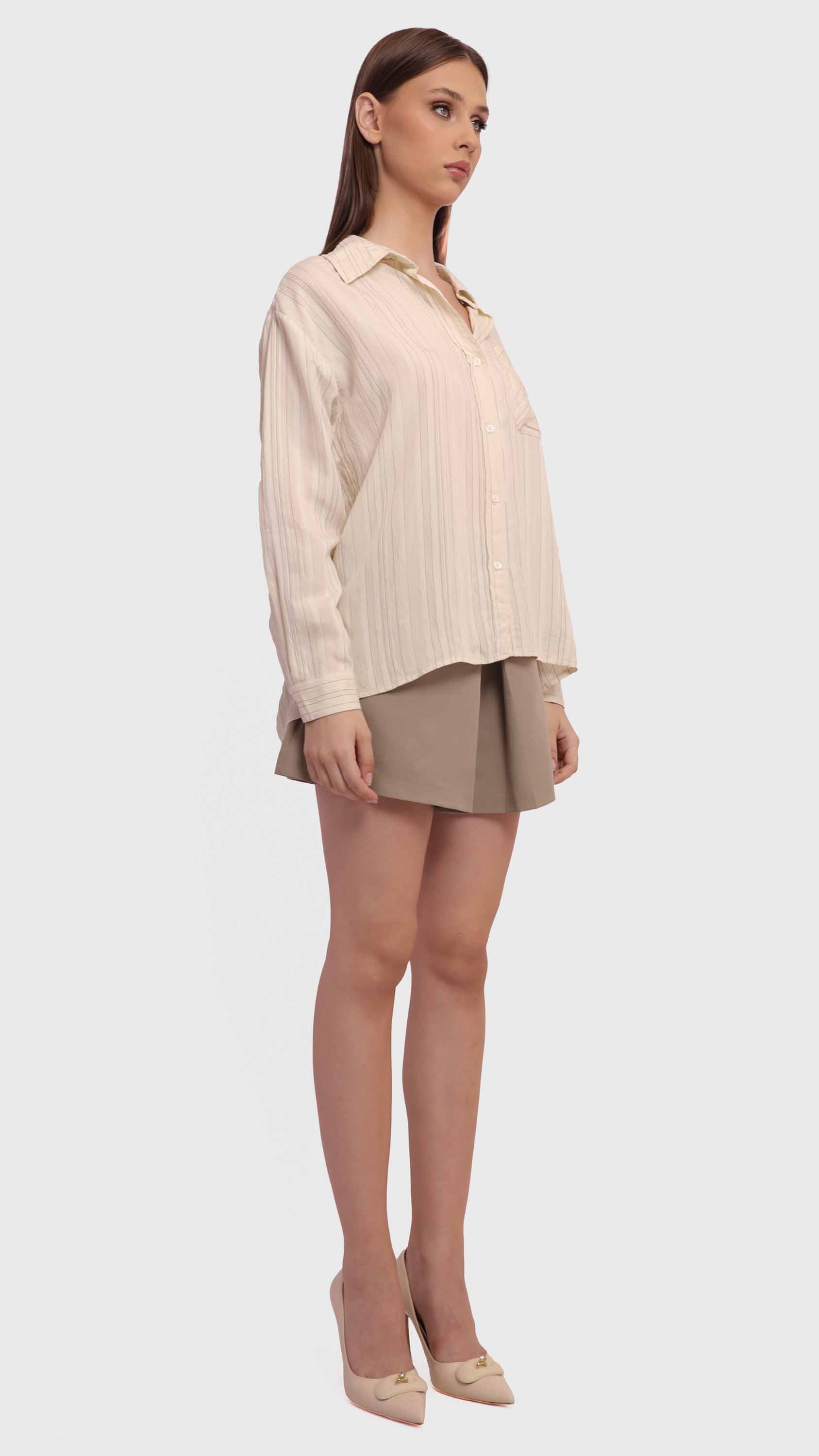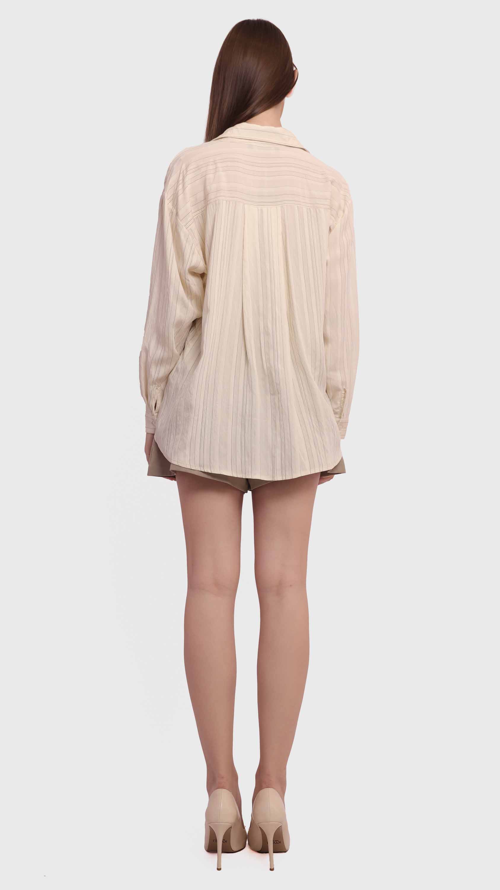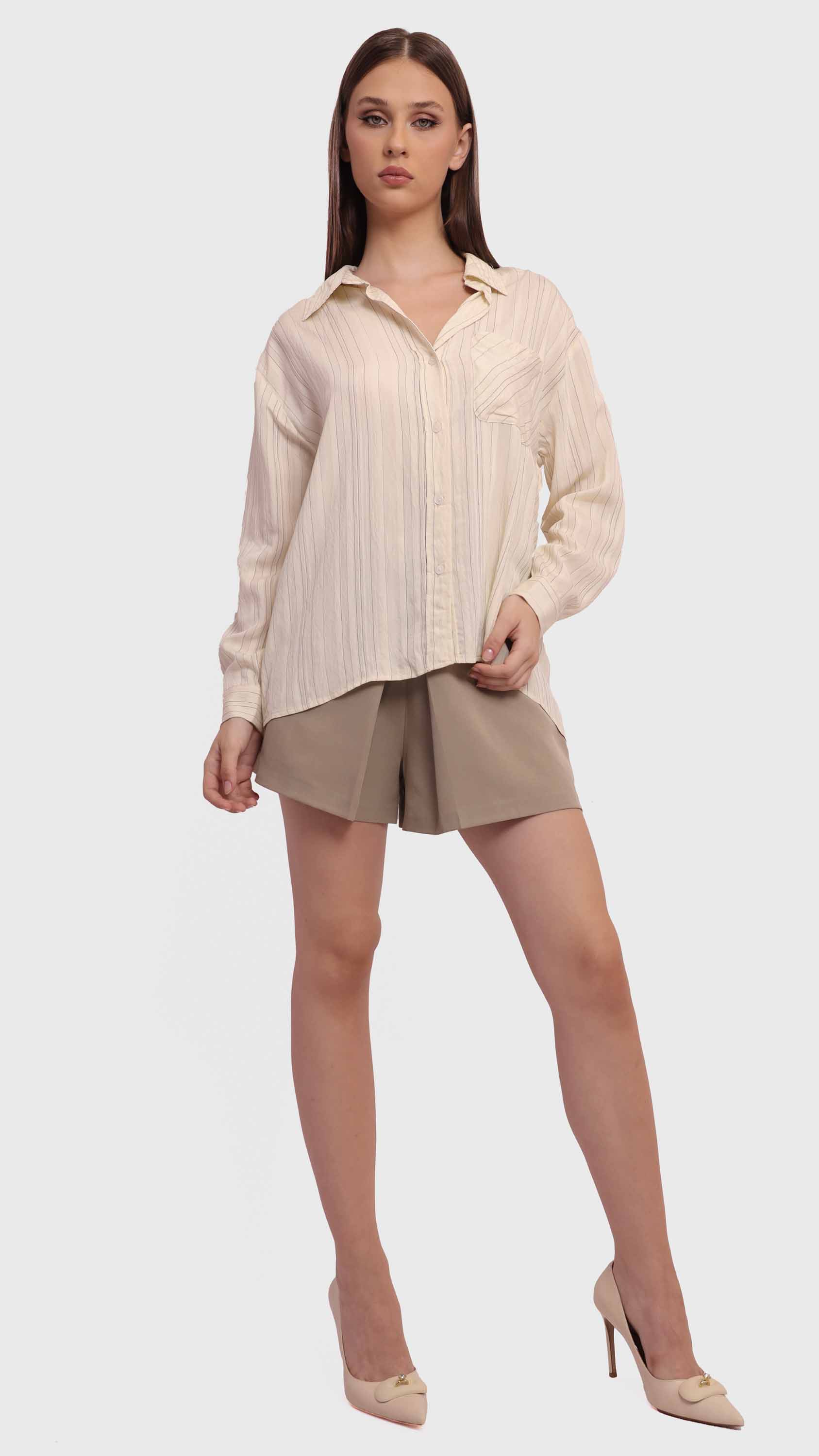 This is an oversized shirt featuring a vertical stripe pattern in soft contrasting tones. Designed with a relaxed, flowy fit, it has a high-low hem and a pointed collar. The shirt includes a chest pocket with horizontal stripes, adding a subtle detail to its overall look. Long sleaves with buttoned cuffs complete the casual yet elegant style.