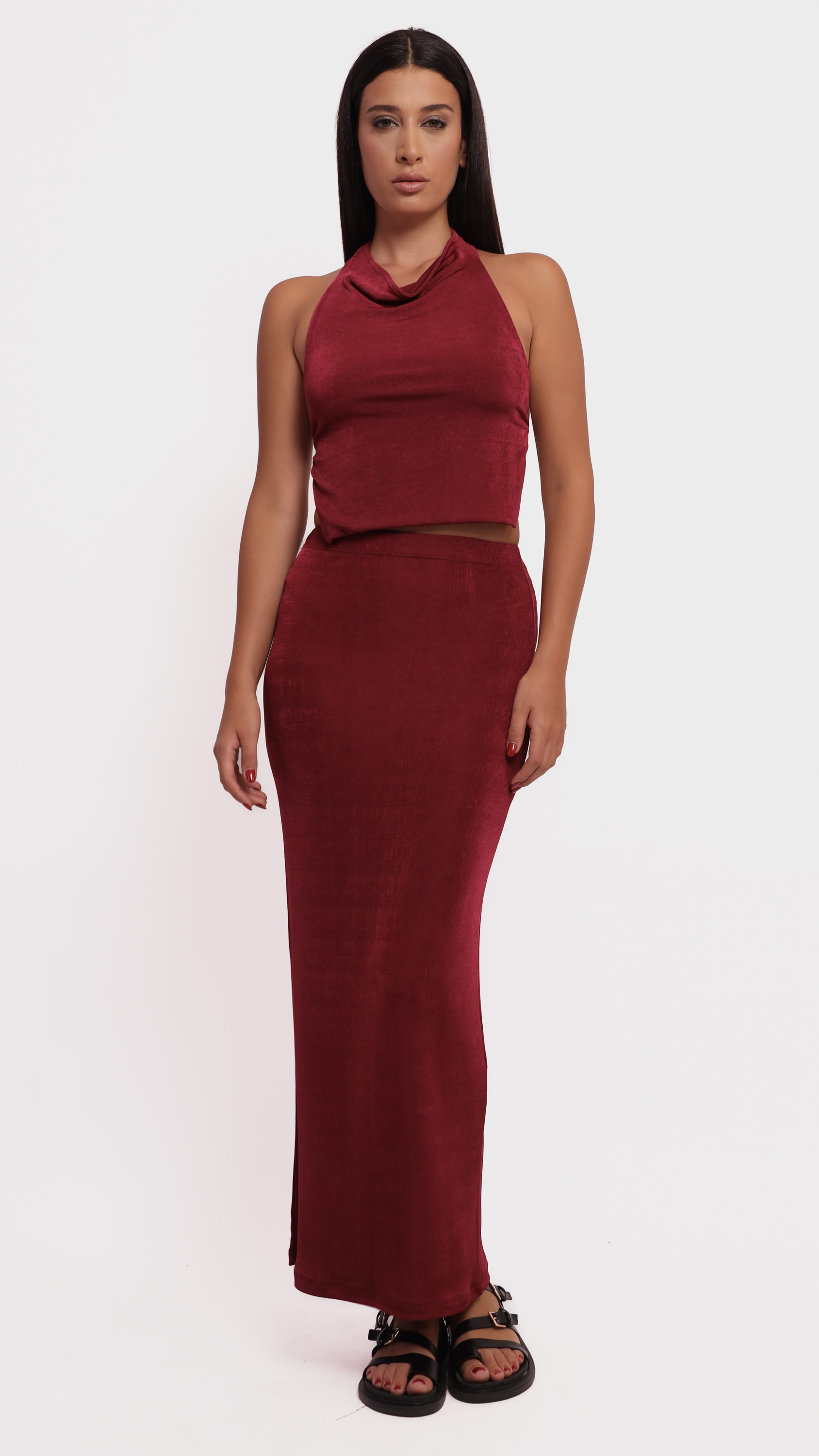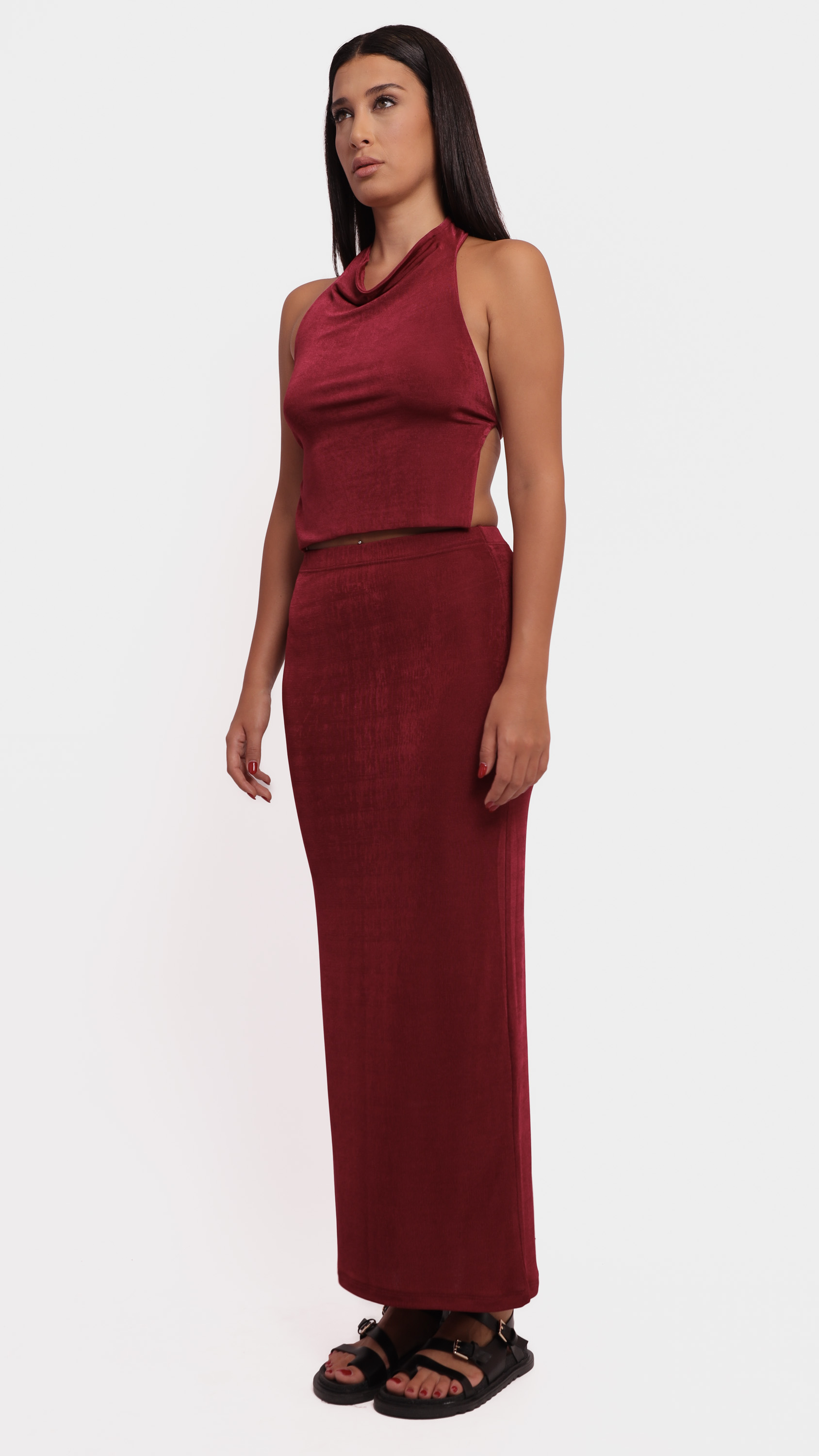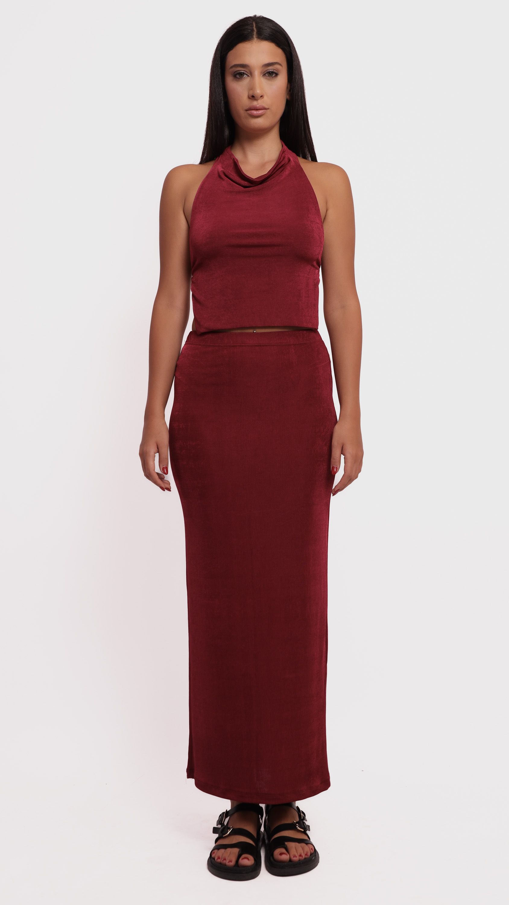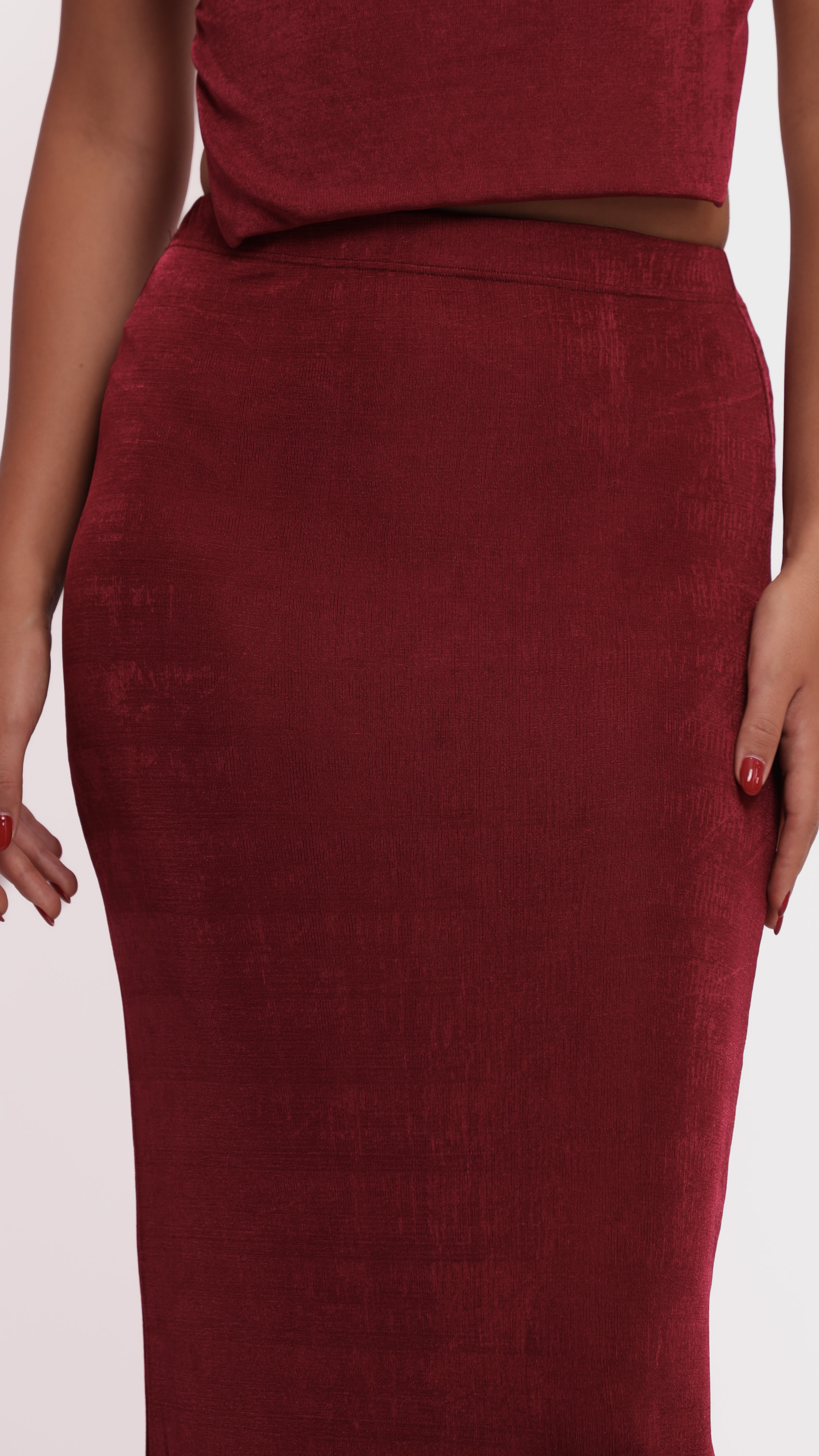 Make a statement with this abstract satin midi skirt, designed for fluid movement and artistic elegance.