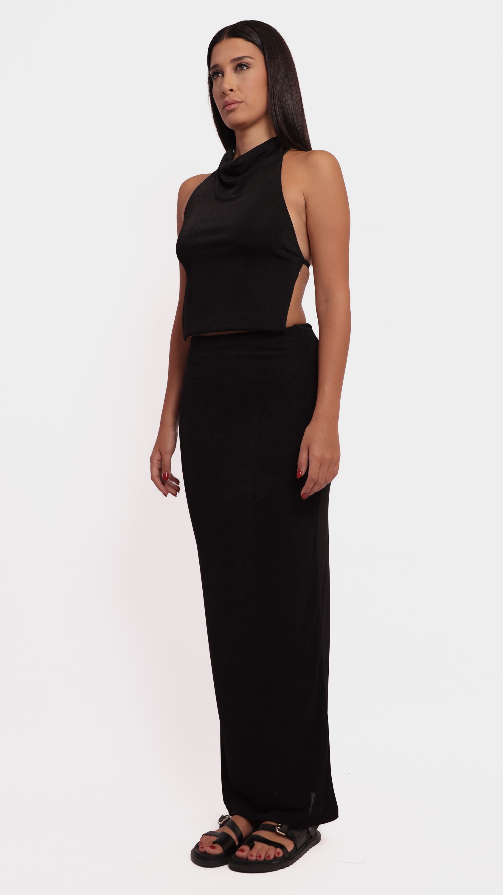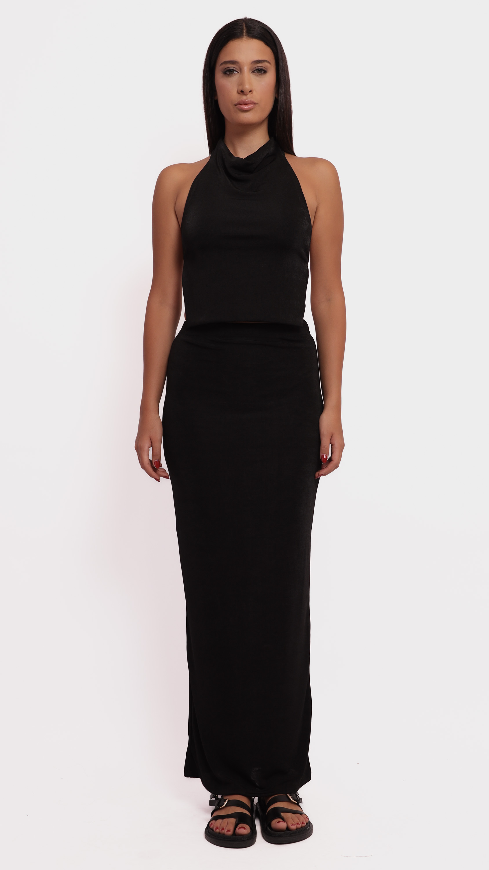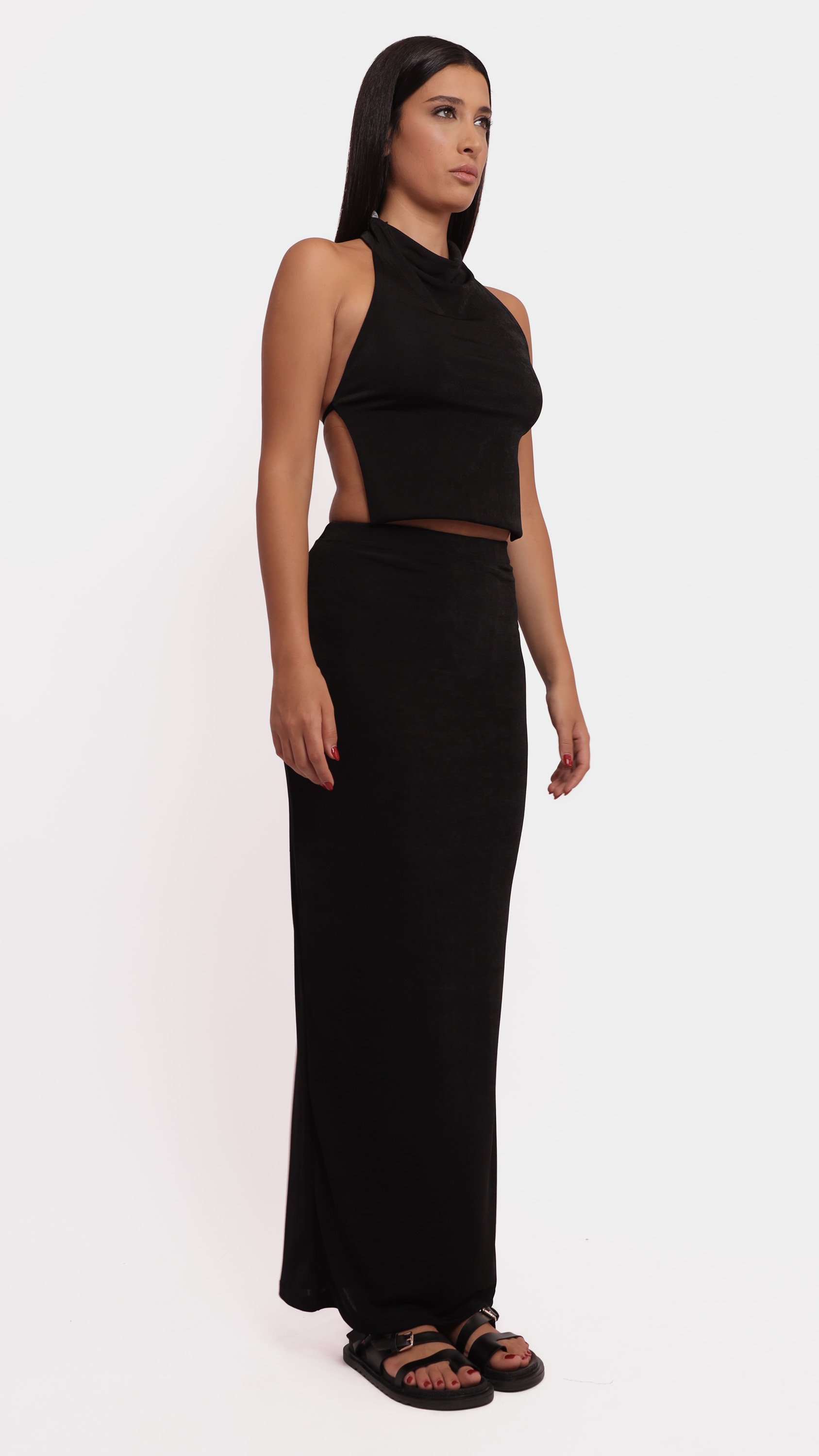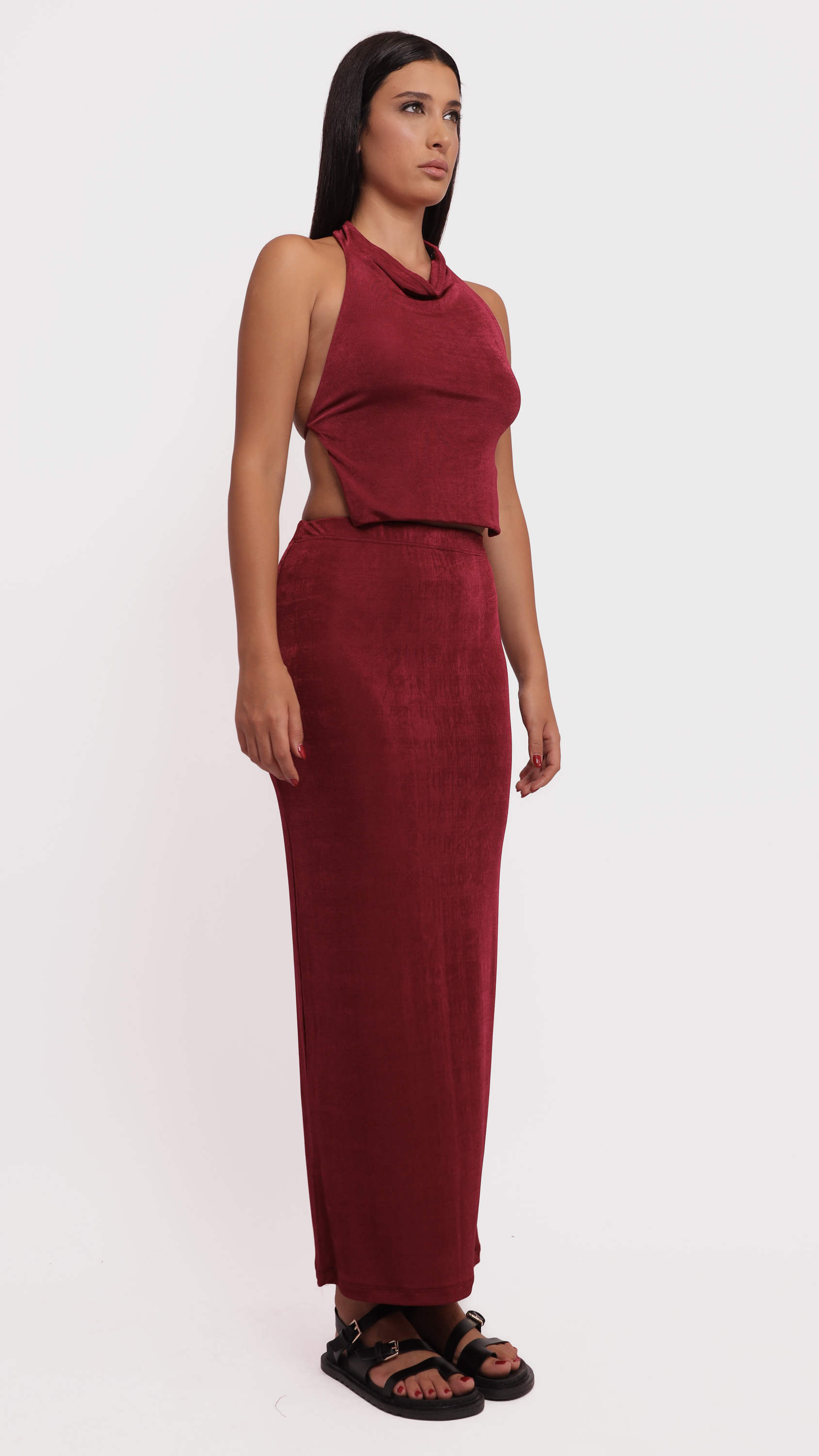 Make a statement with this abstract satin midi skirt, designed for fluid movement and artistic elegance.