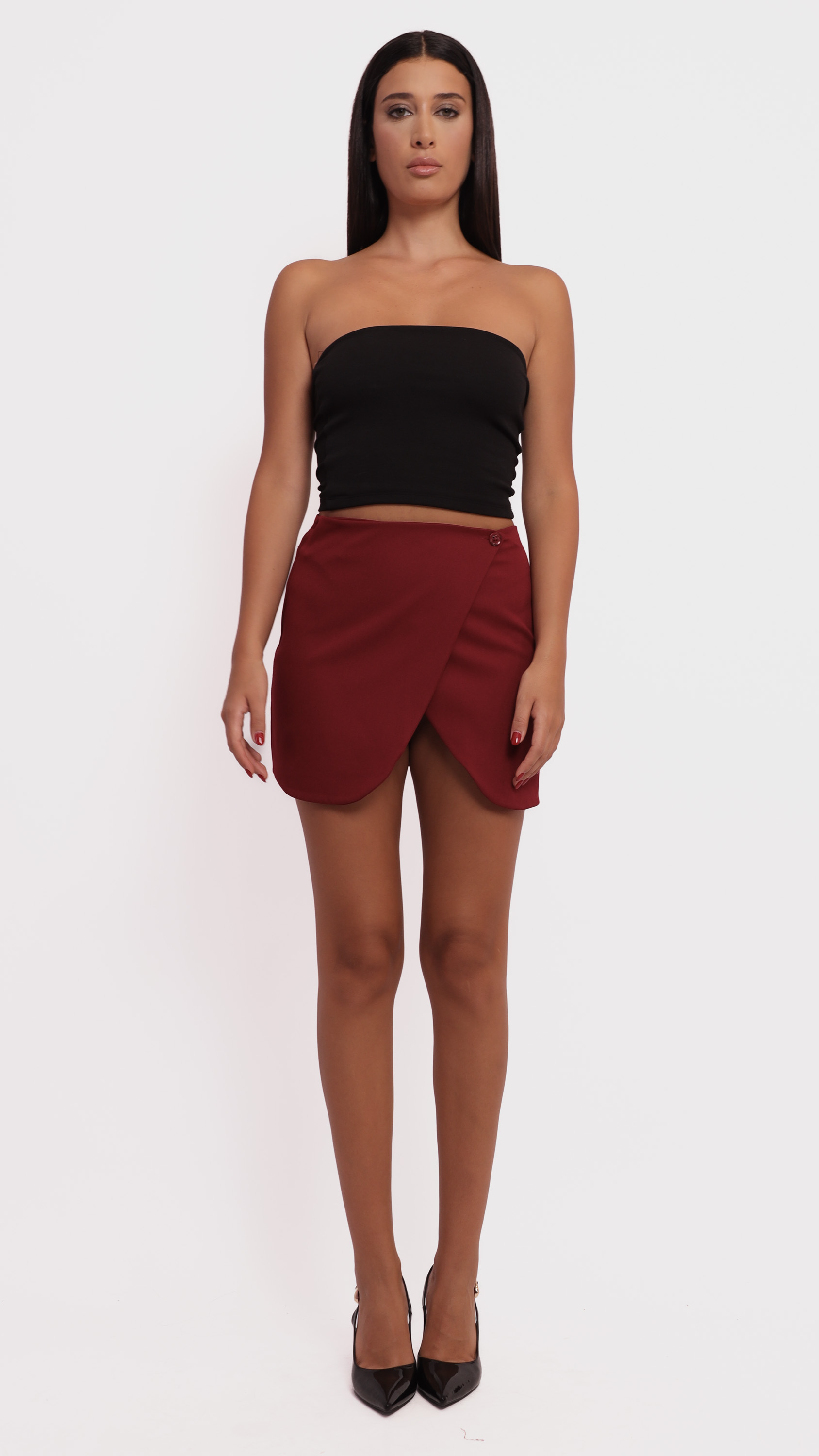 Step into standout style with this asymmetric wrap mini skirt—tailored for a sharp yet sophisticated statement.