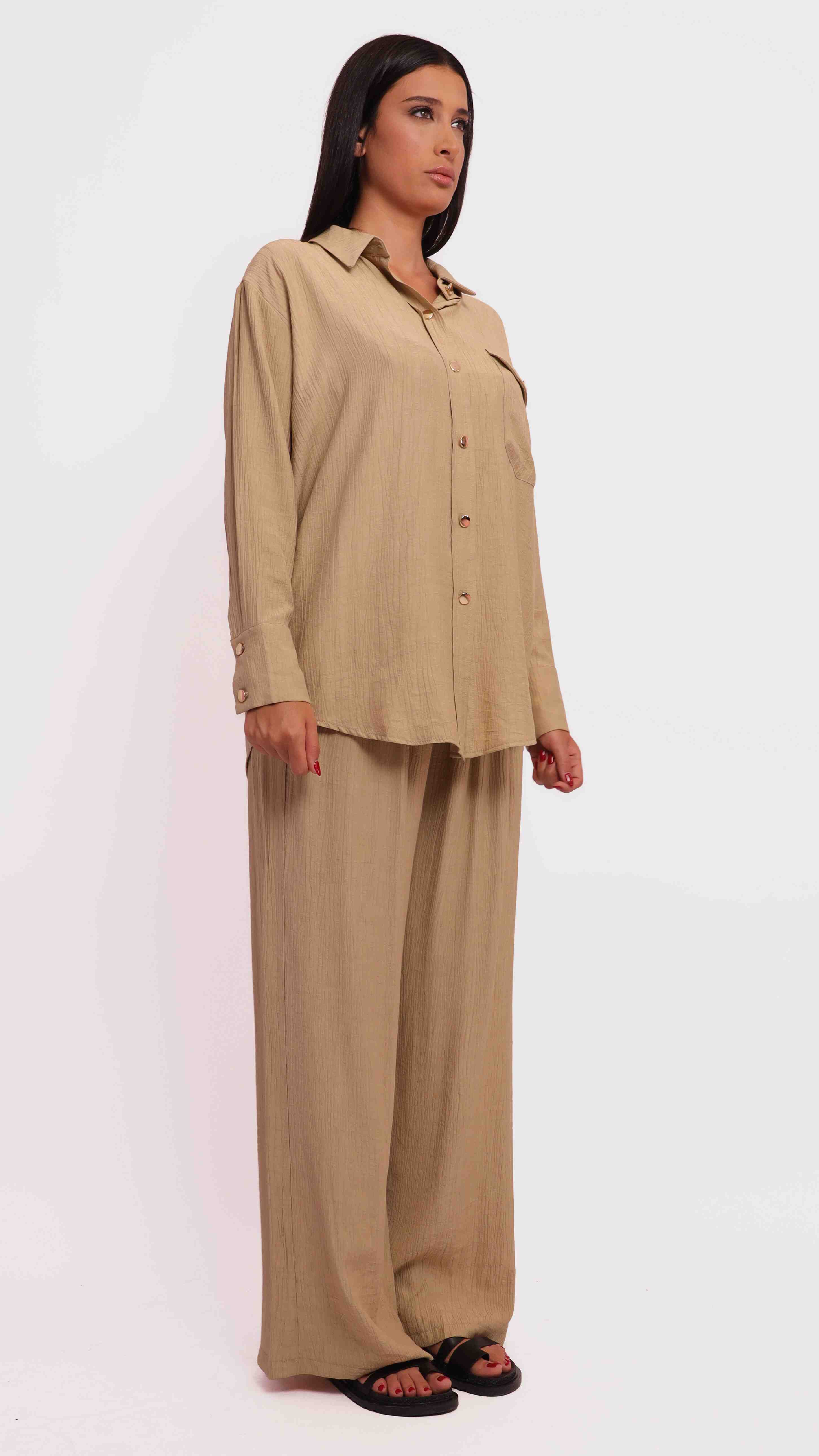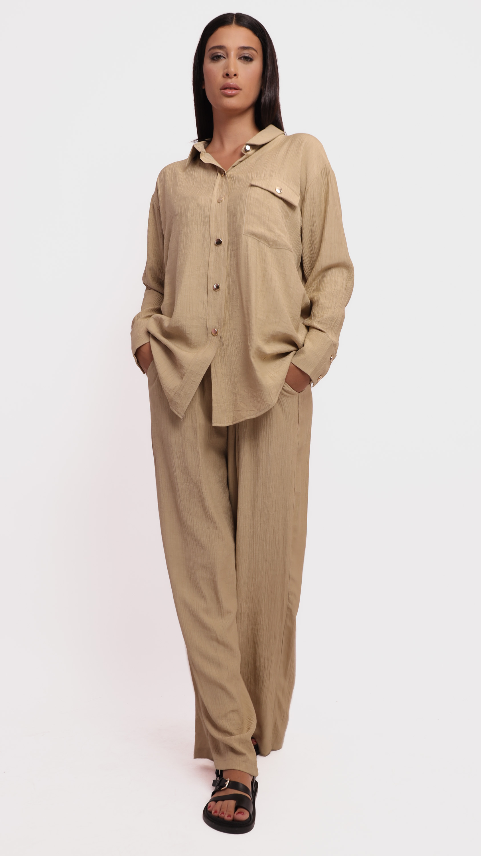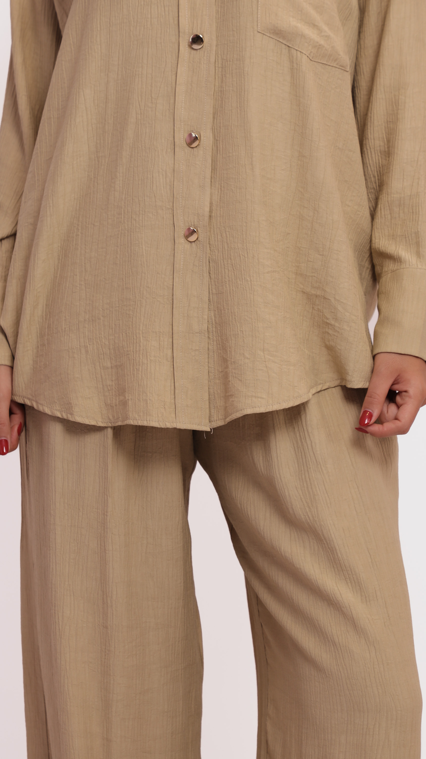 Stay effortlessly chic in this Beige Crinkled Co-Ord Set, featuring a relaxed button-up shirt and wide-leg trousers in breathable, textured fabric.