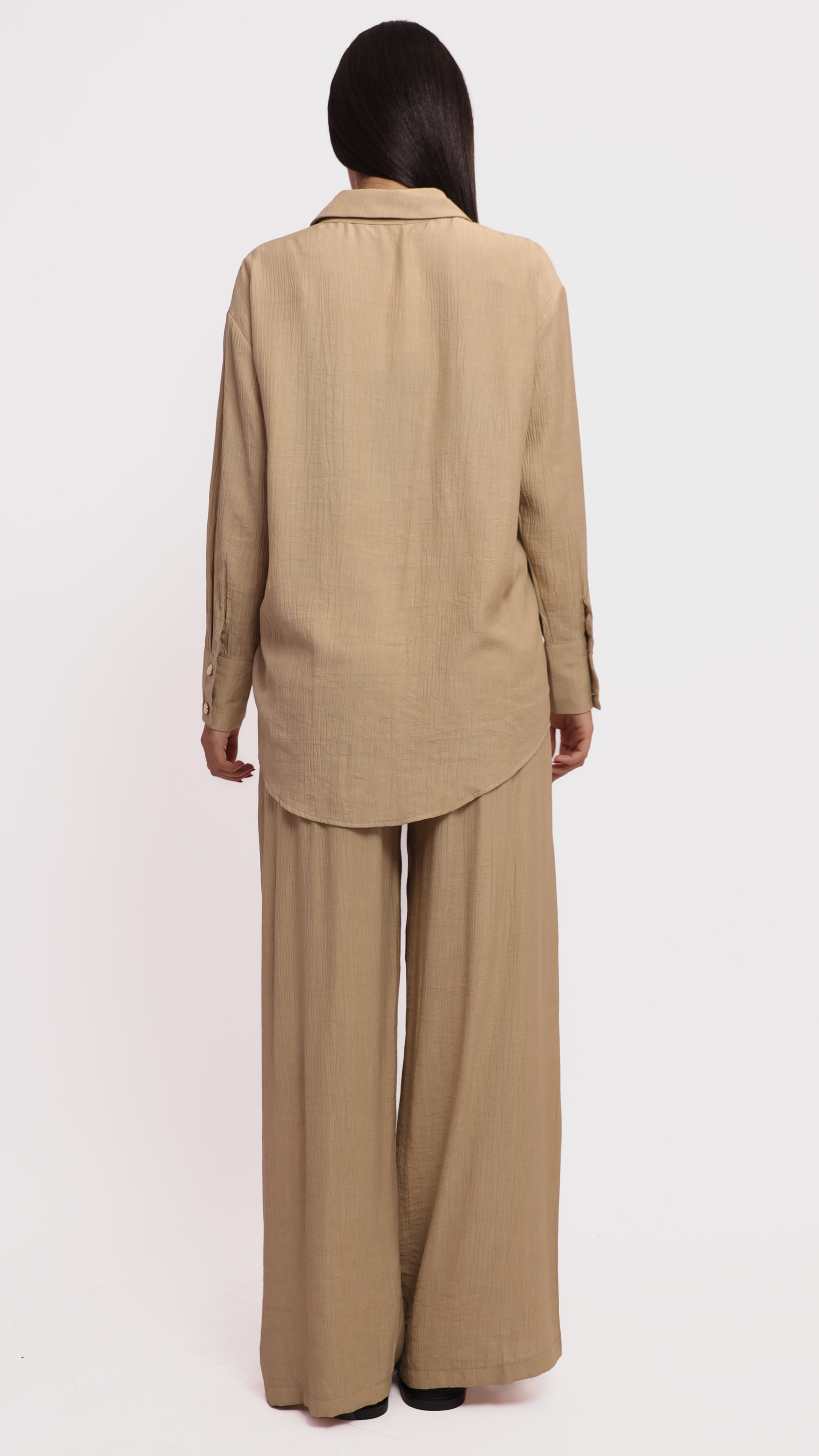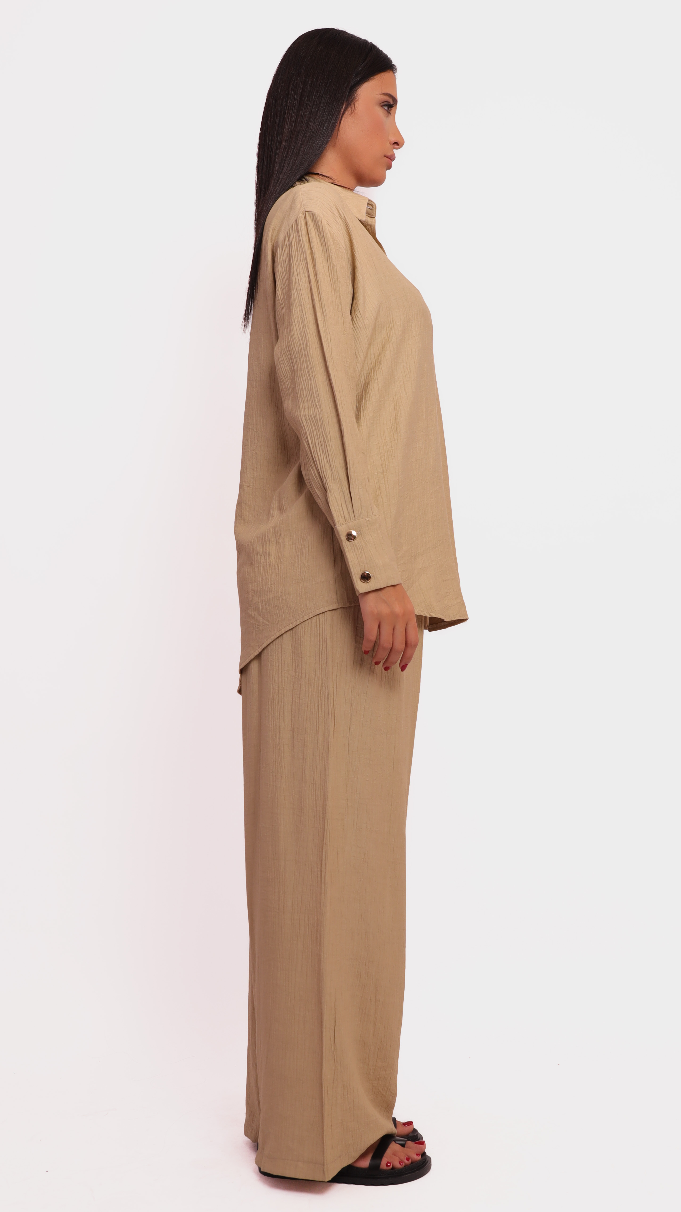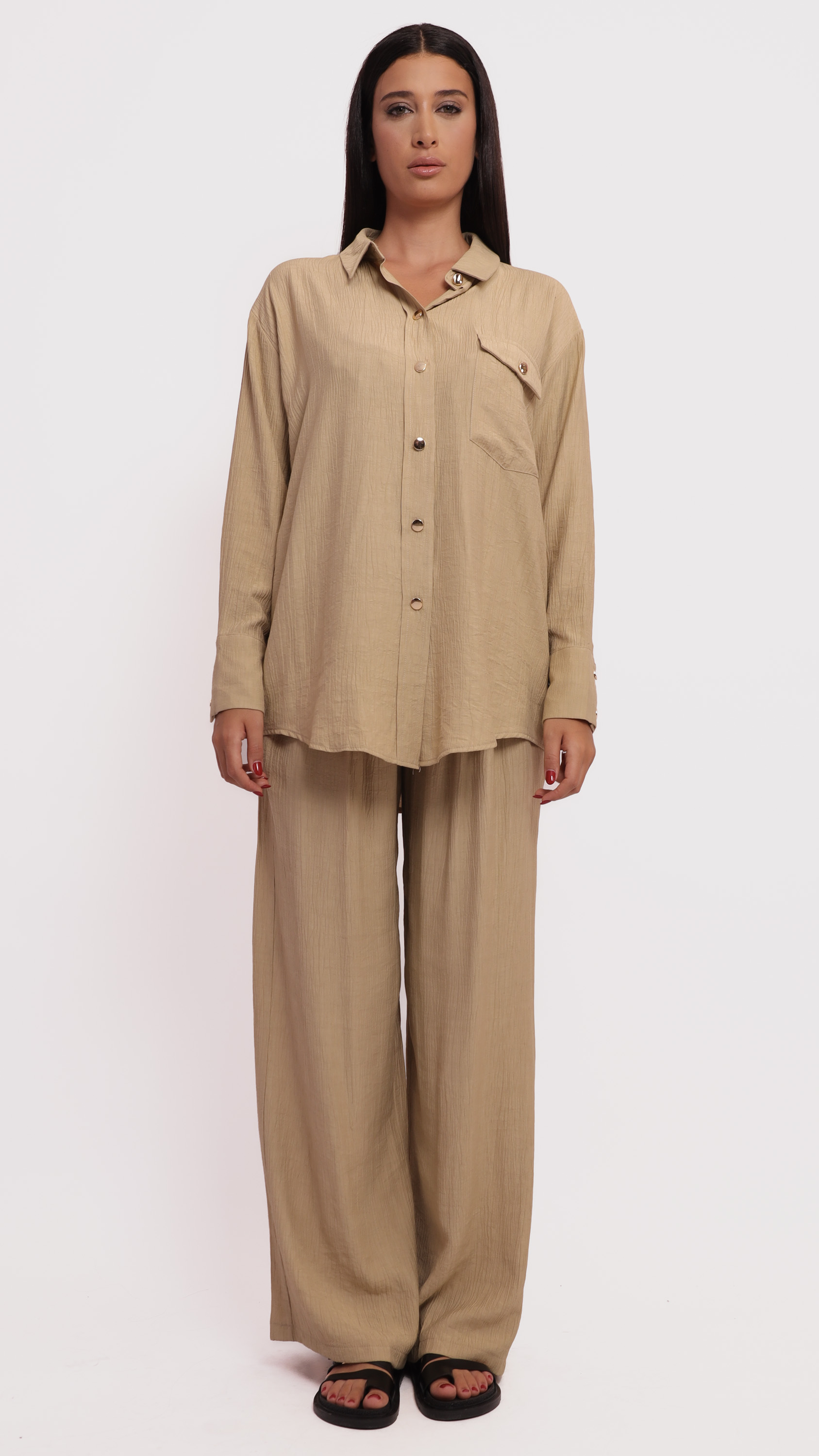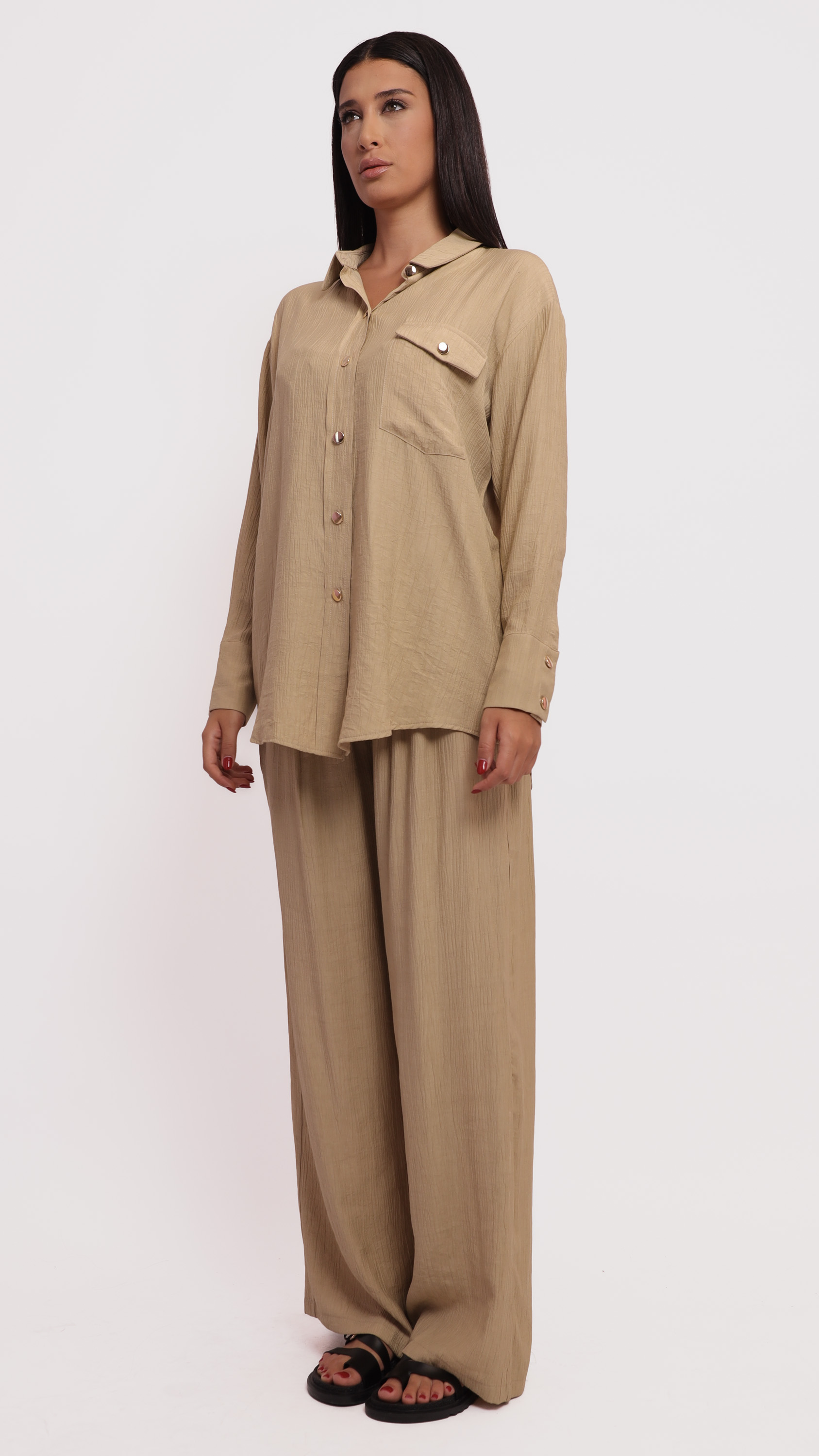 Stay effortlessly chic in this Beige Crinkled Co-Ord Set, featuring a relaxed button-up shirt and wide-leg trousers in breathable, textured fabric.