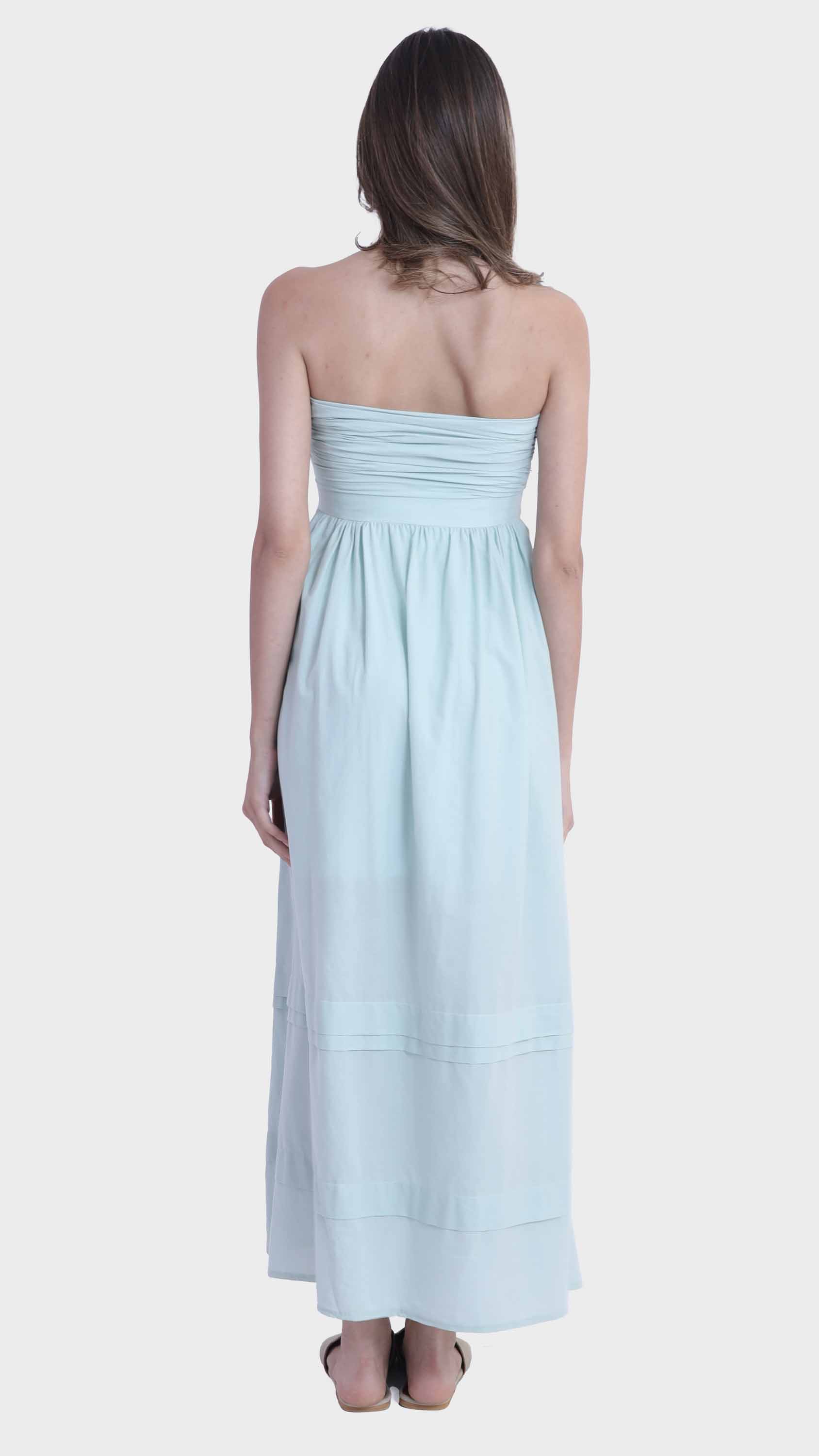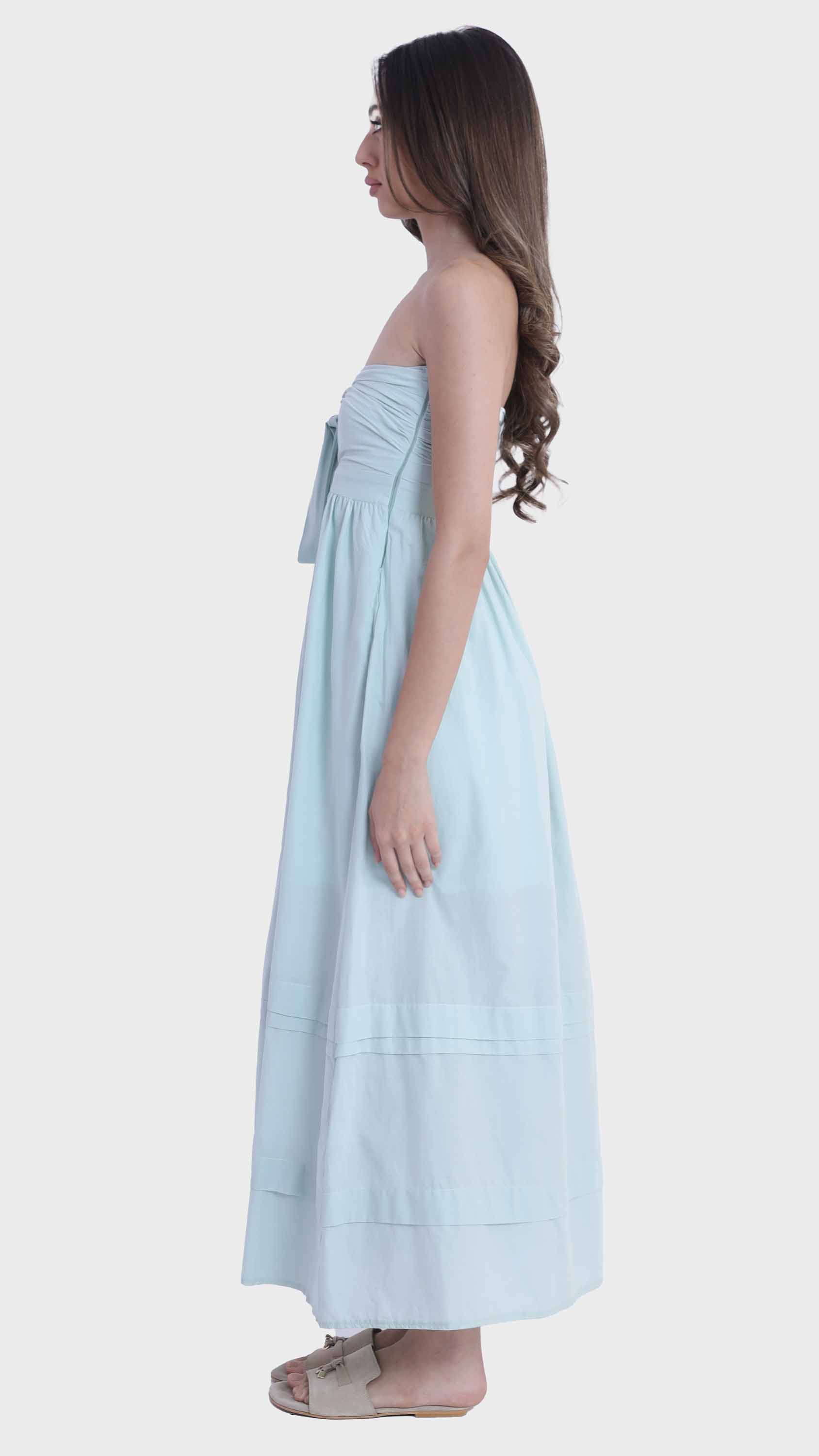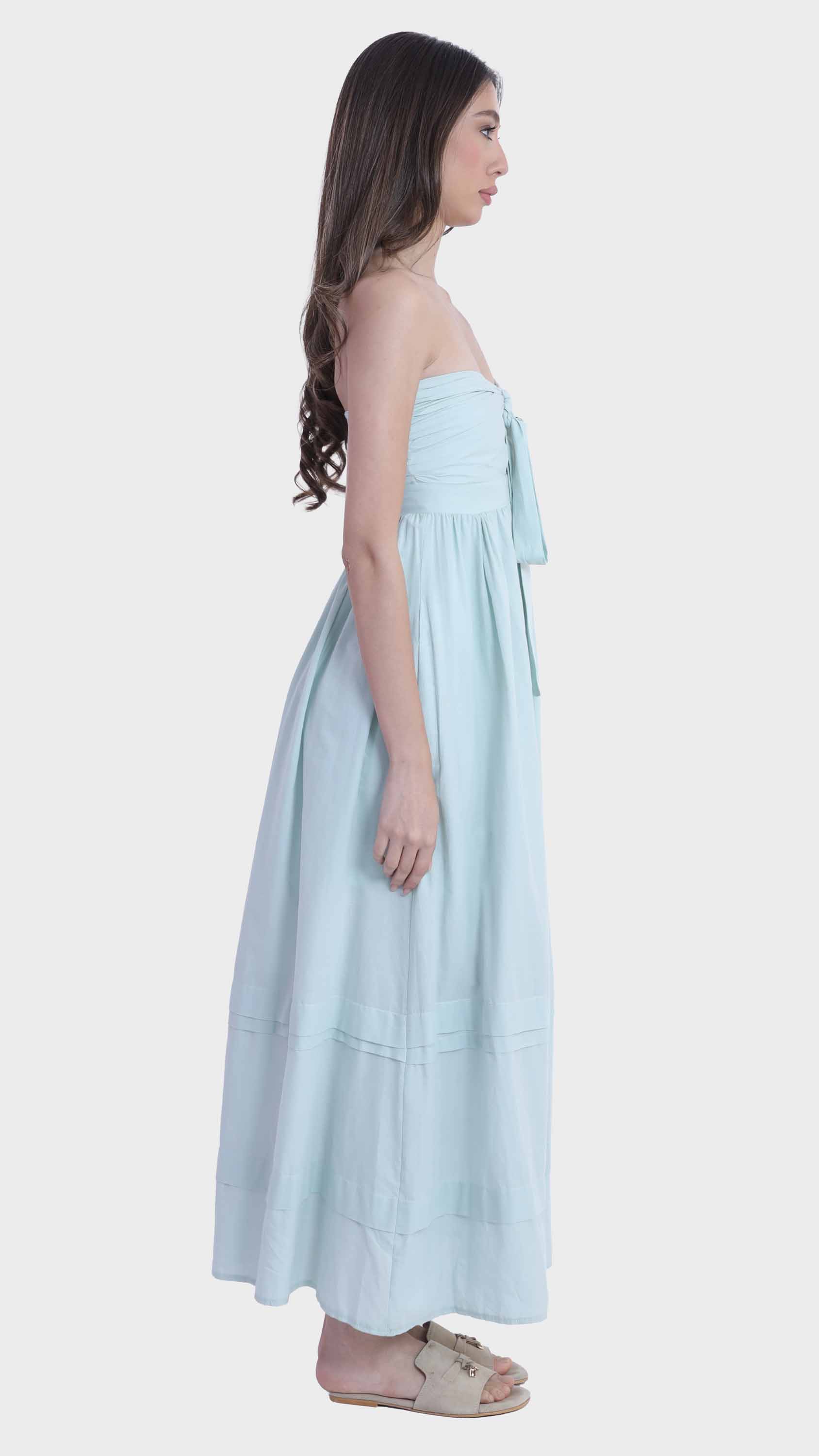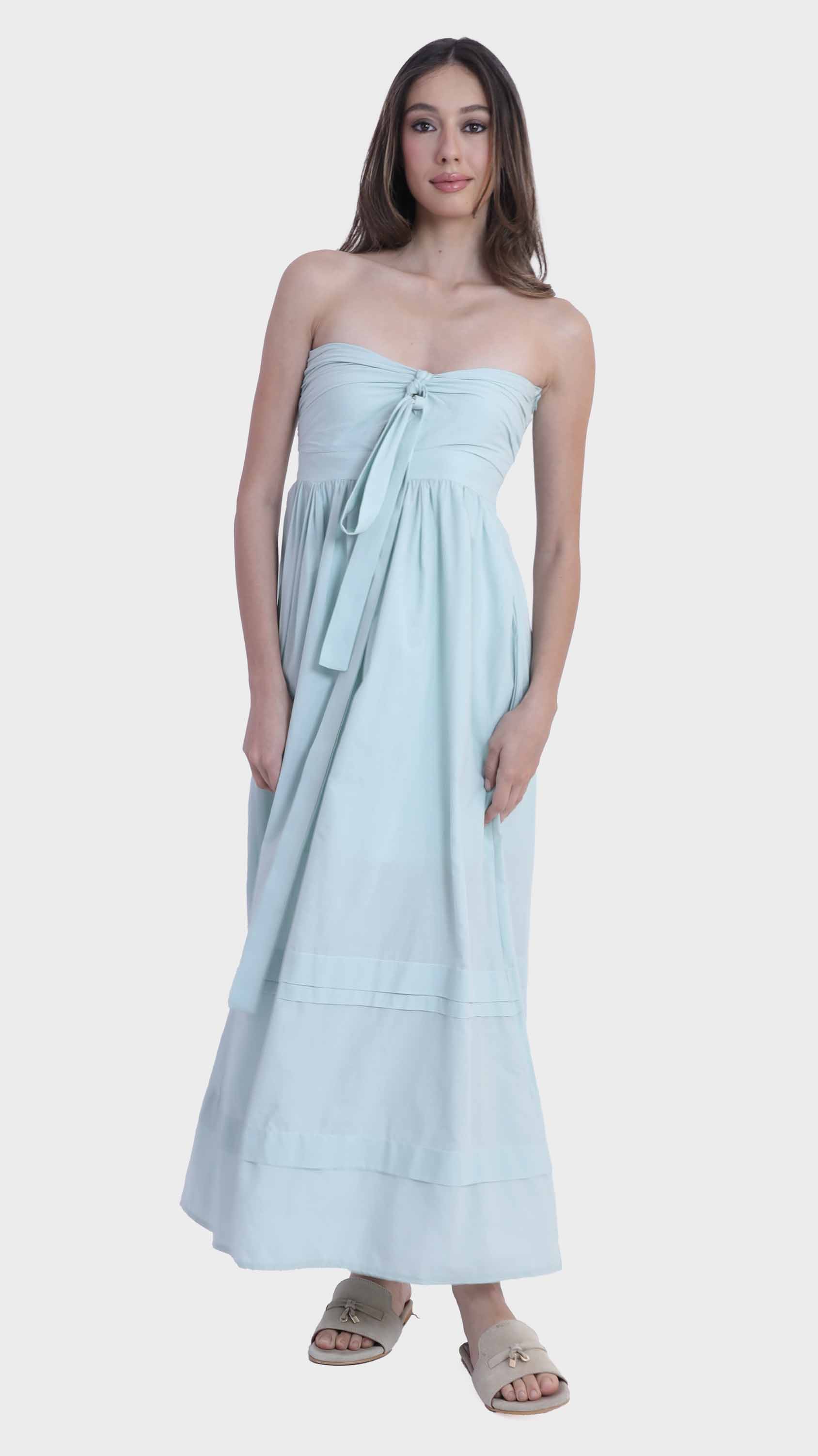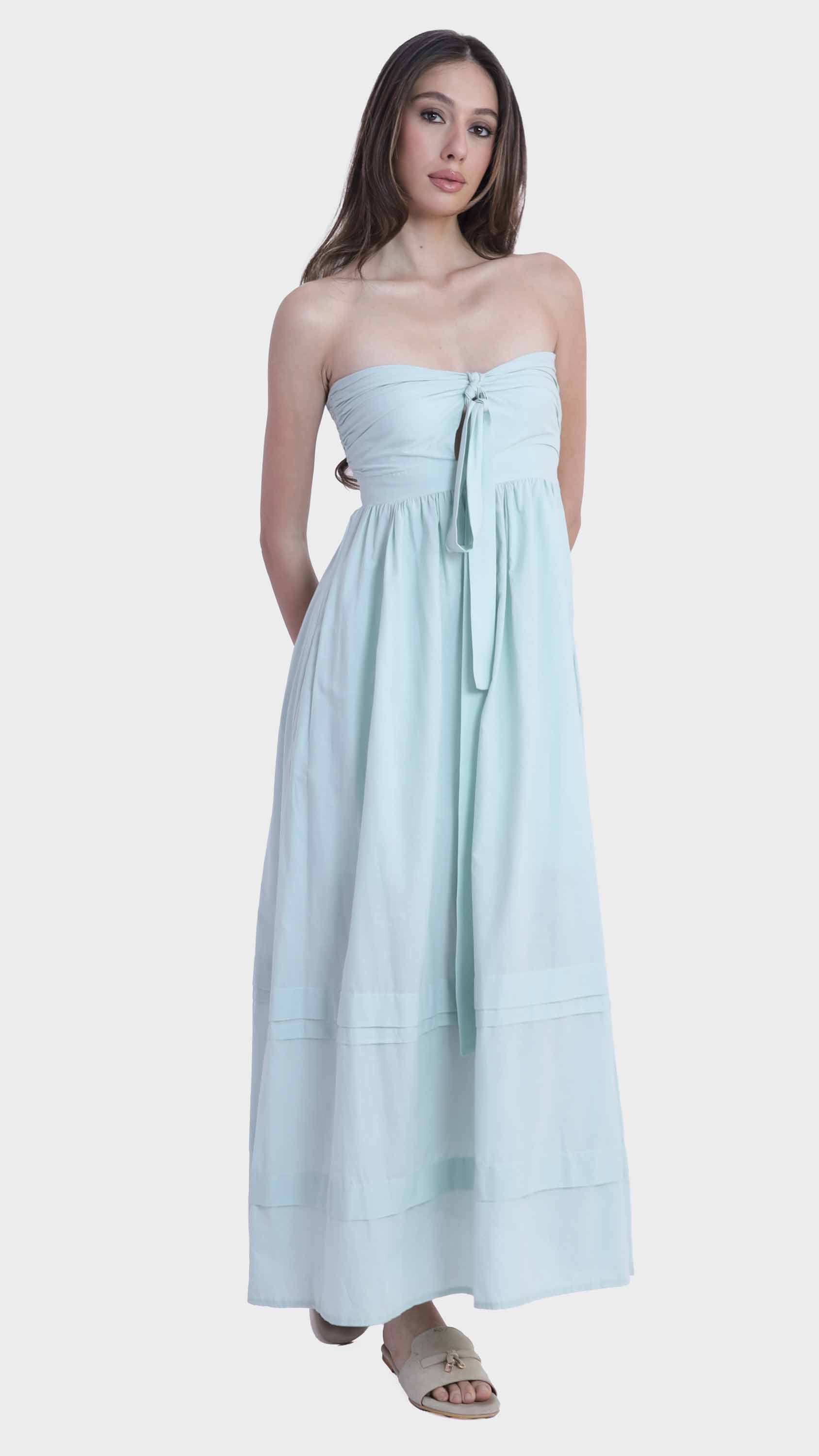 Embrace effortless summer elegance with this strapless tie-front maxi dress. Crafted from lightweight cotton, it features a flattering bandeau neckline and a charming front tie that accentuates the bust. The flowy A-line silhouette and tiered hem panels create a breezy, feminine movement, making it a perfect choice for sunny days, beach vacations, or relaxed gatherings.
