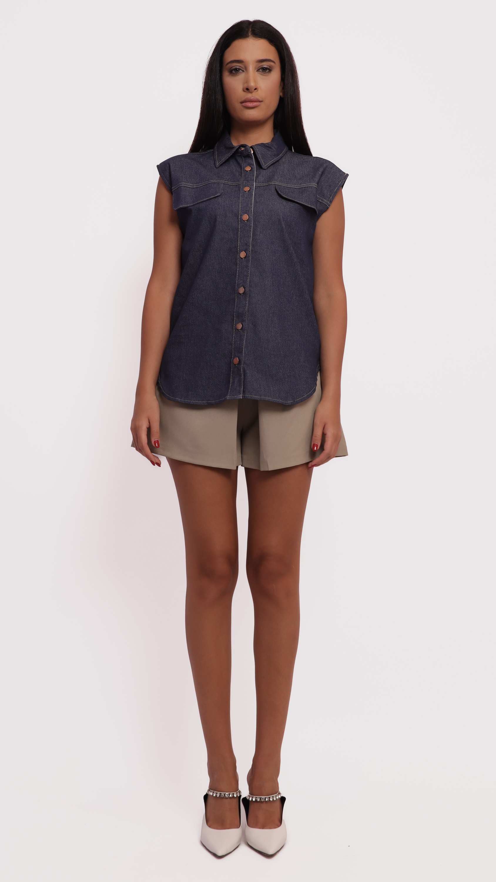 A stylish and versatile sleeveless denim shirt, perfect for casual and semi-casual looks. Made from high-quality denim, this piece features a button-down front and dual chest flap pockets for a modern, edgy vibe.