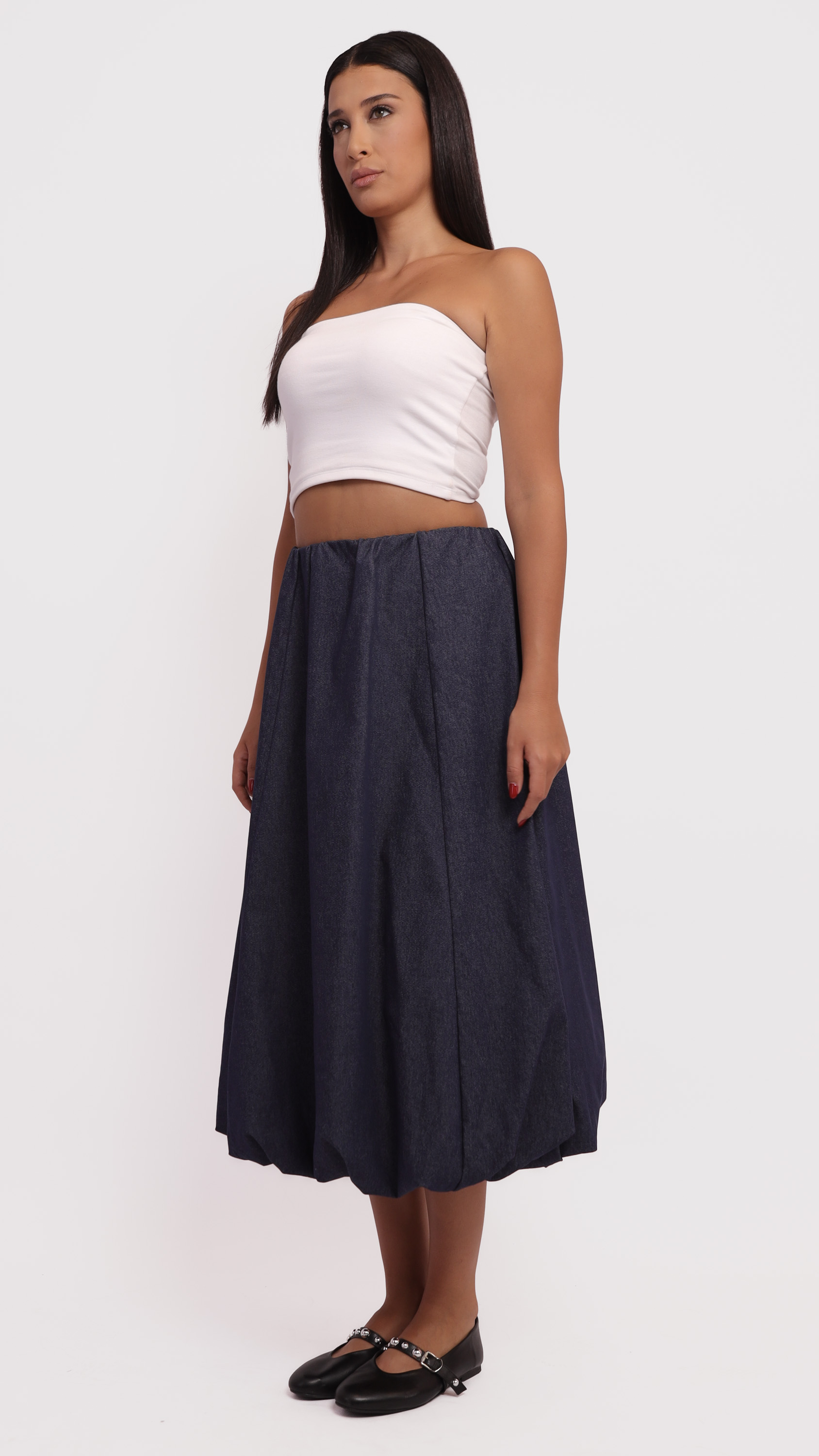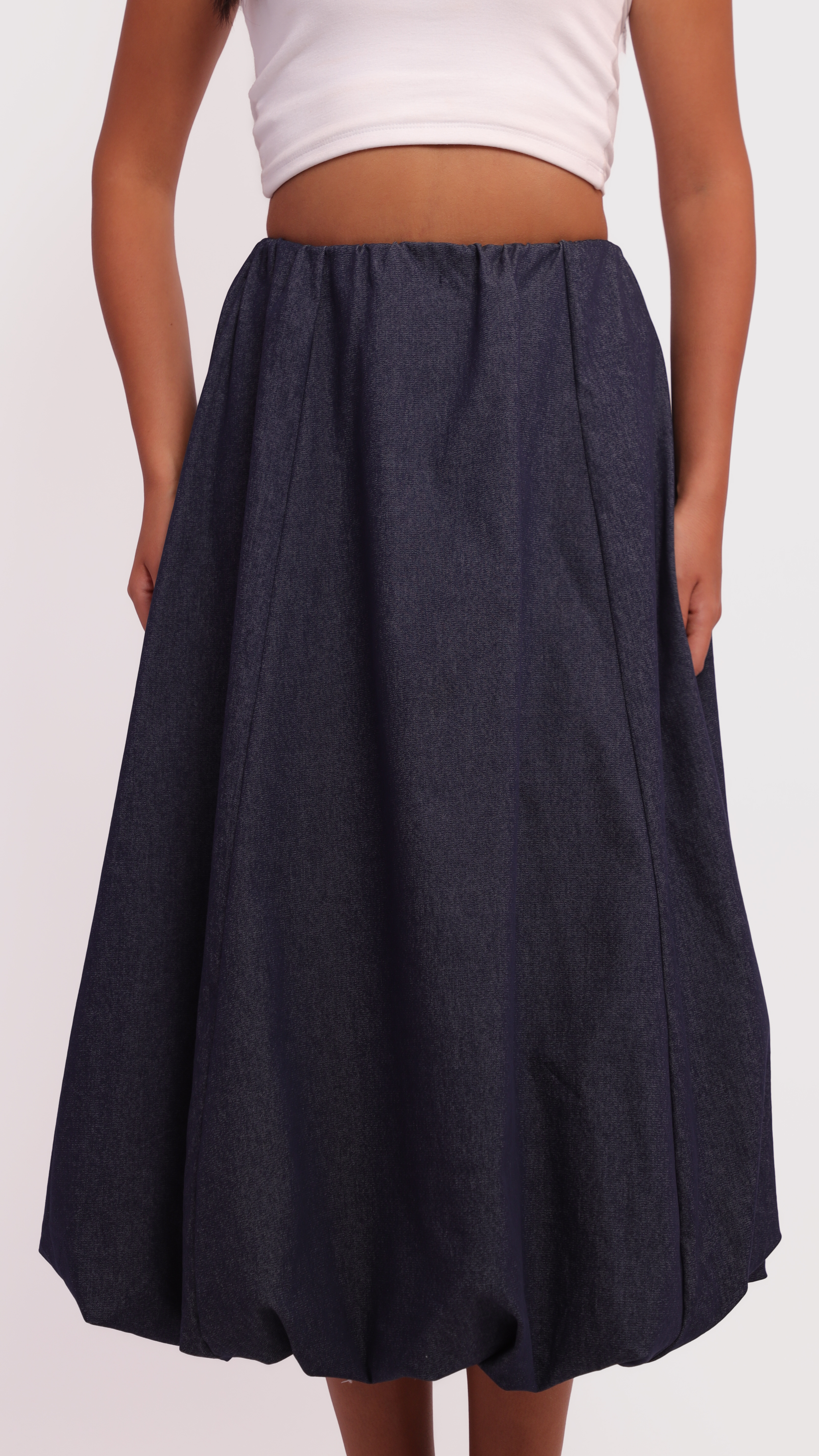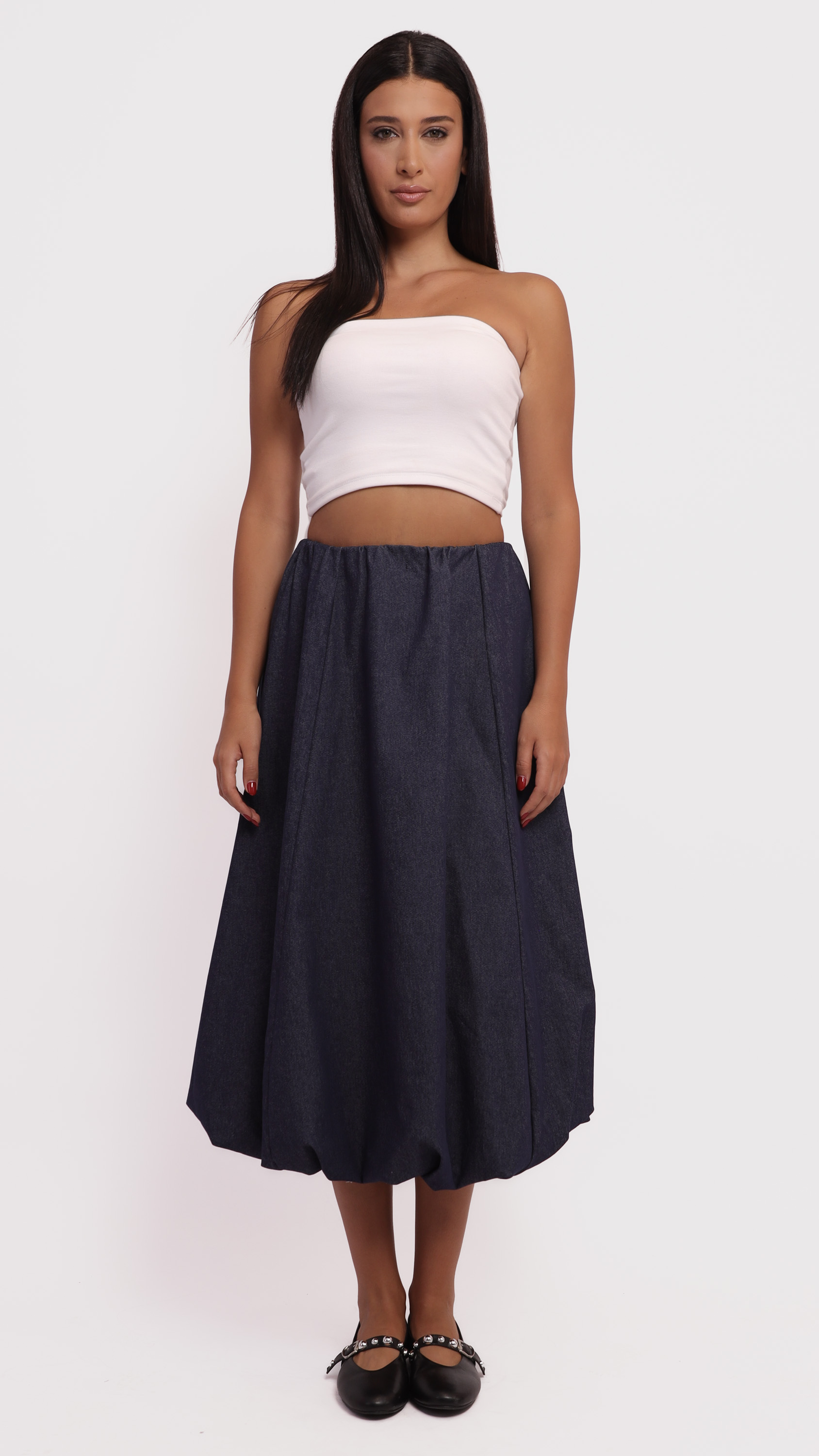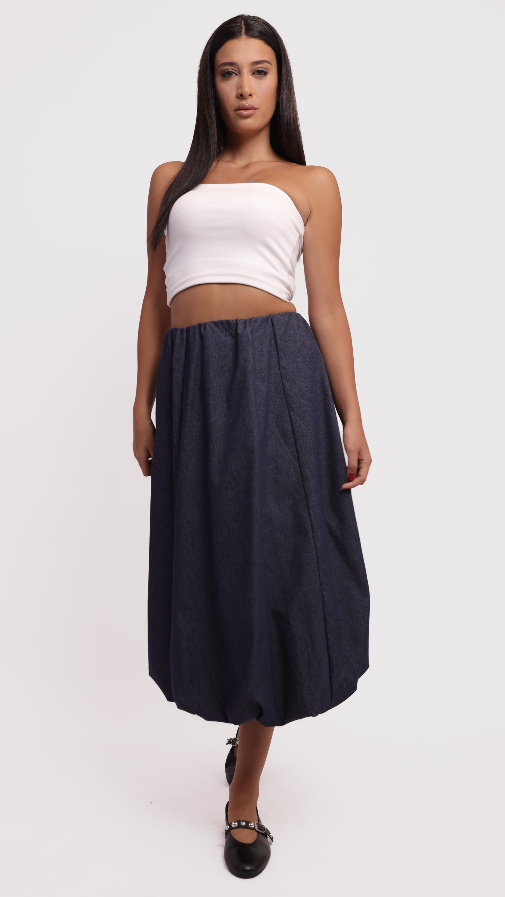 Elevate your everyday style with this chic balloon hem midi skirt. Made from soft denim-like fabric, it offers a modern silhouette with a unique voluminous shape. The elastic waistband ensures comfort while giving a flattering fit. Perfect for casual outings or dressed-up looks with heels and a blouse.