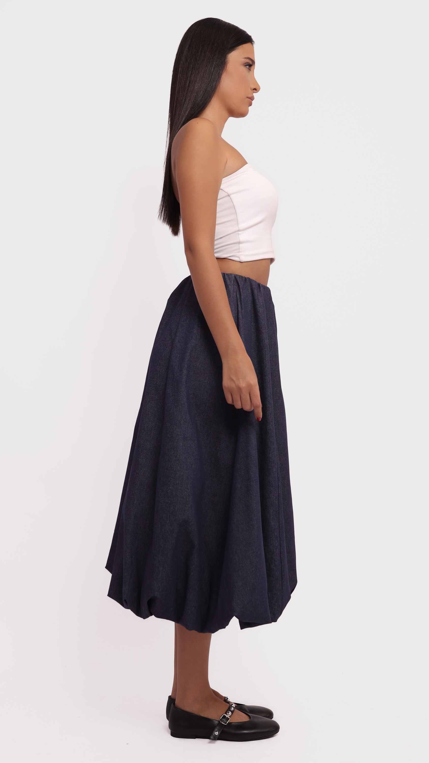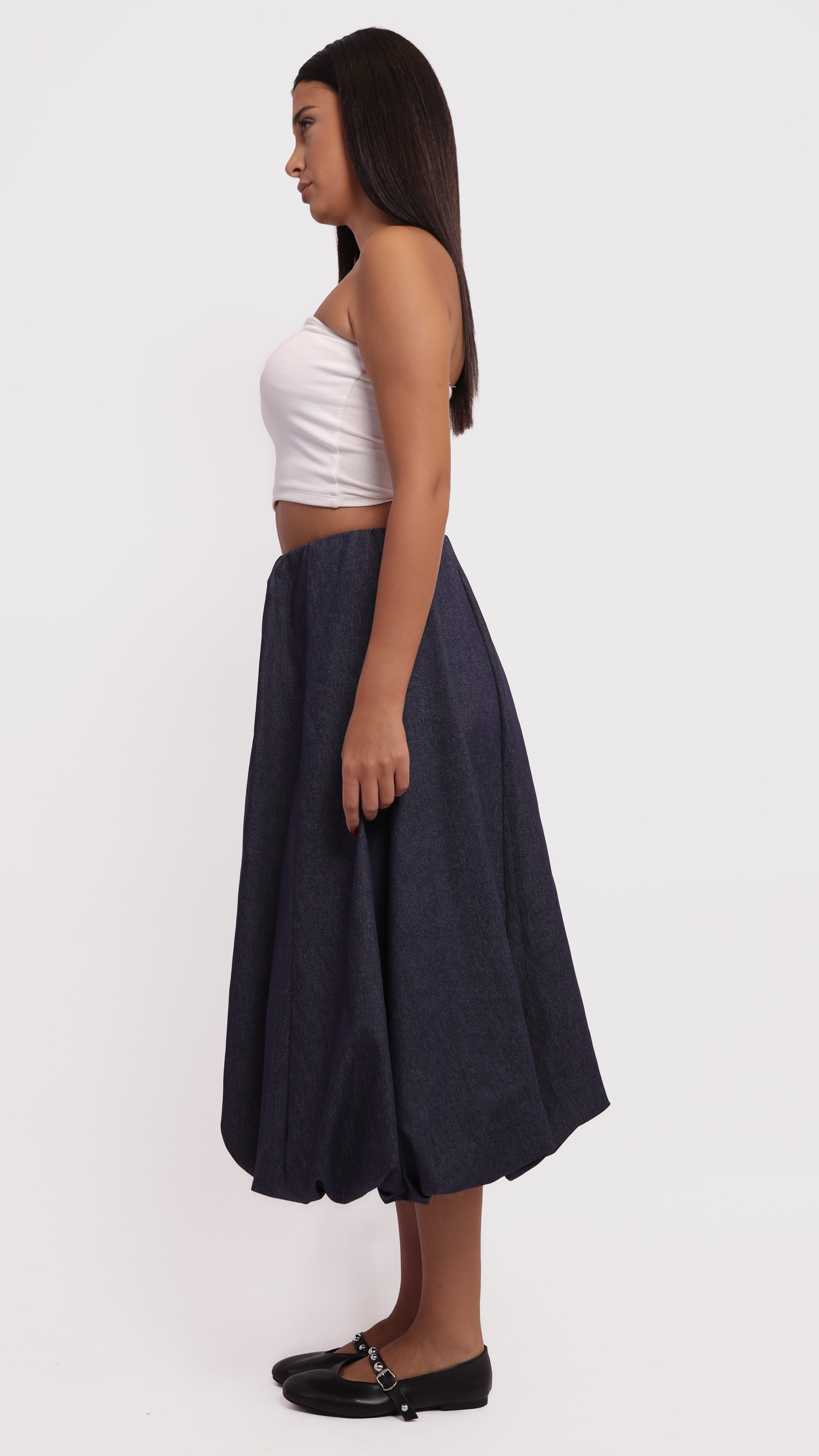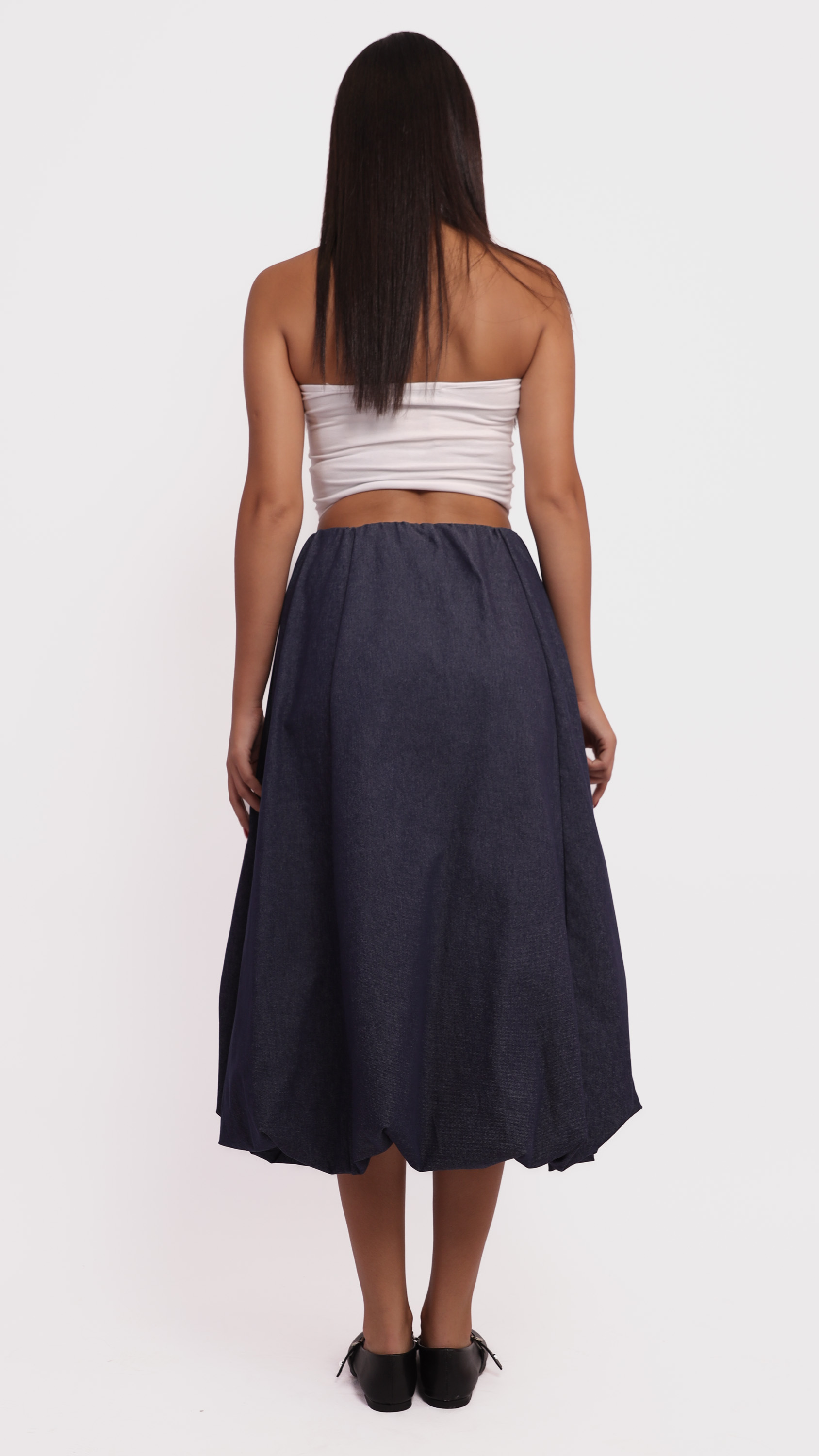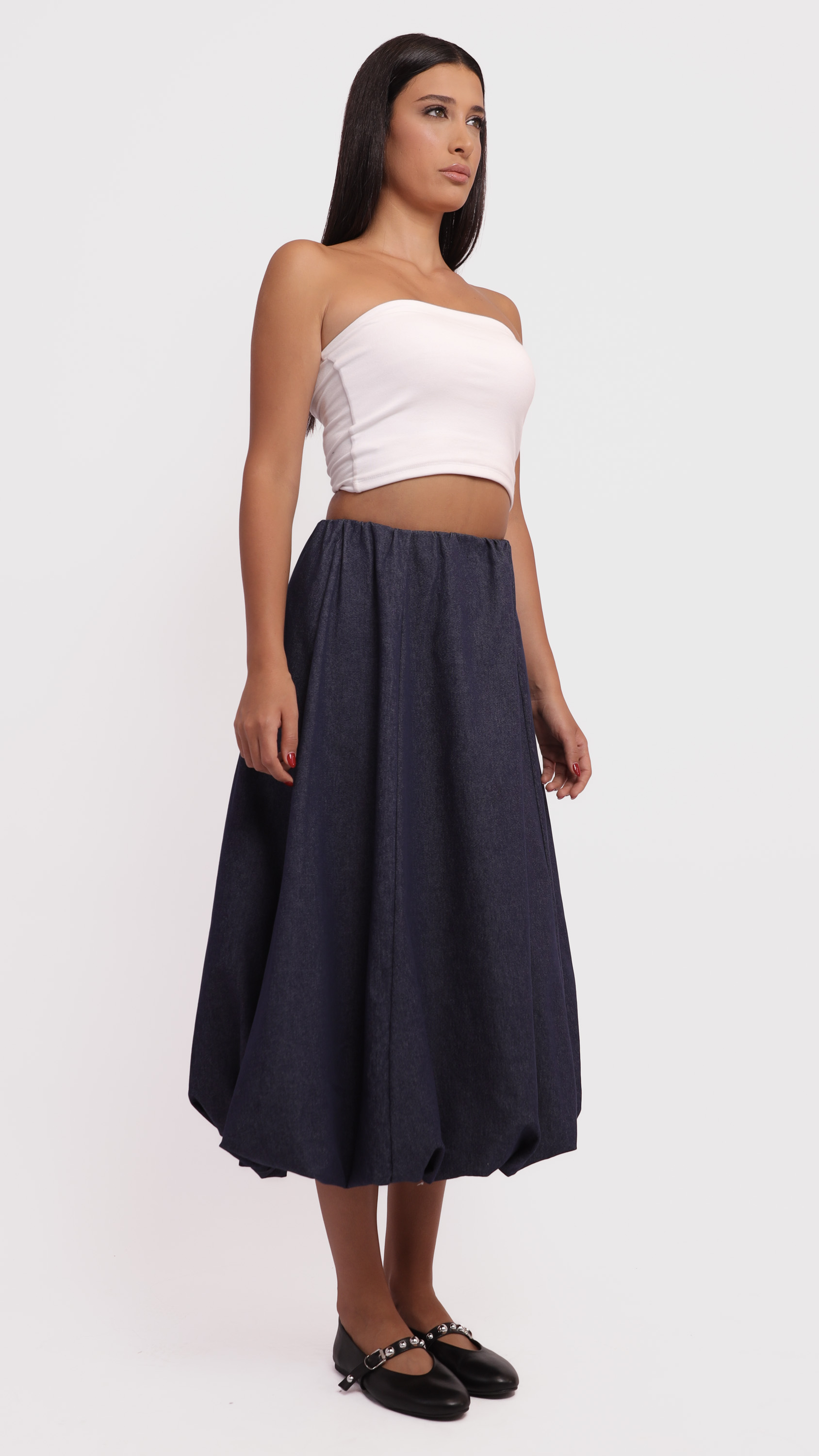 Elevate your everyday style with this chic balloon hem midi skirt. Made from soft denim-like fabric, it offers a modern silhouette with a unique voluminous shape. The elastic waistband ensures comfort while giving a flattering fit. Perfect for casual outings or dressed-up looks with heels and a blouse.