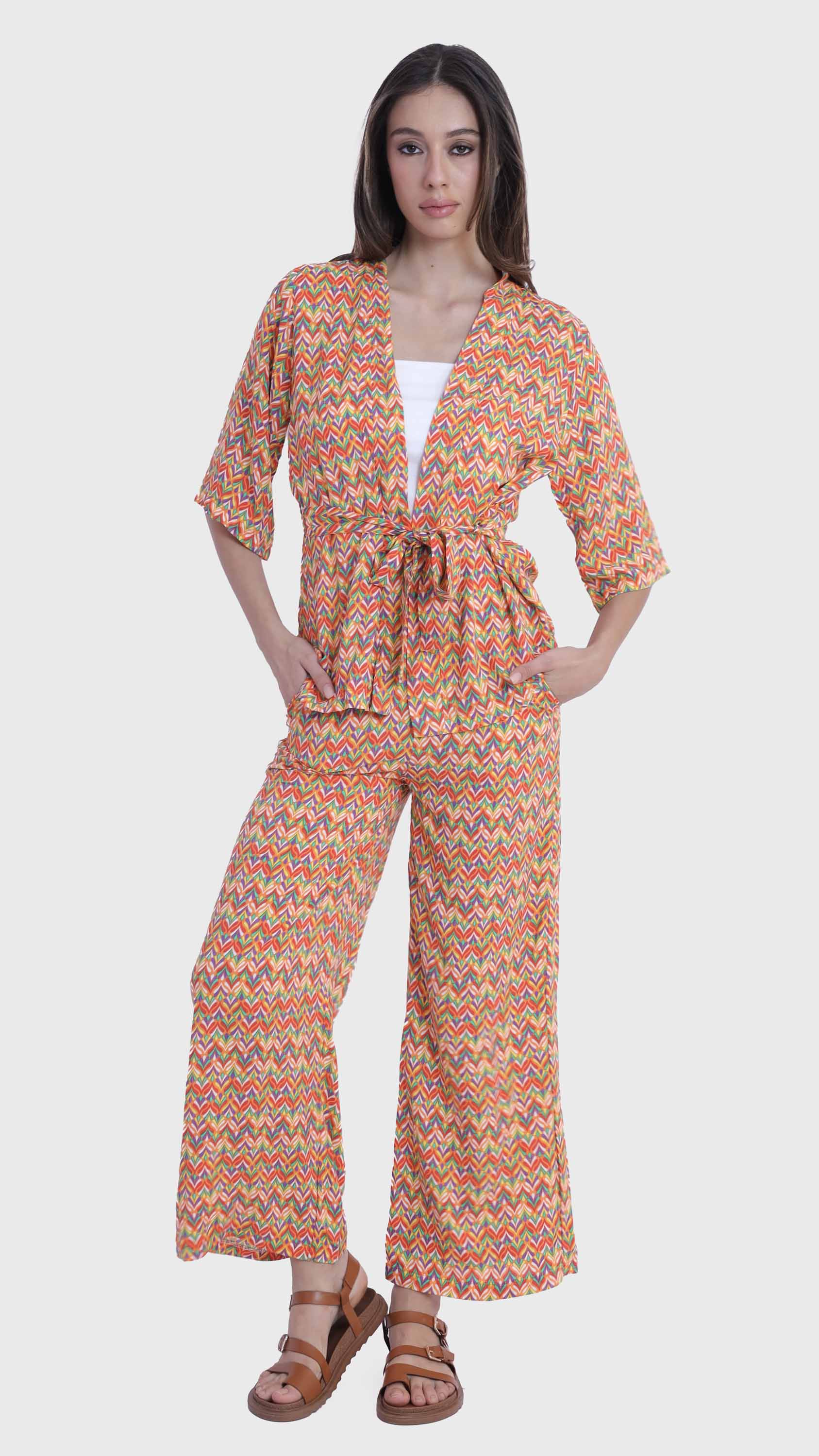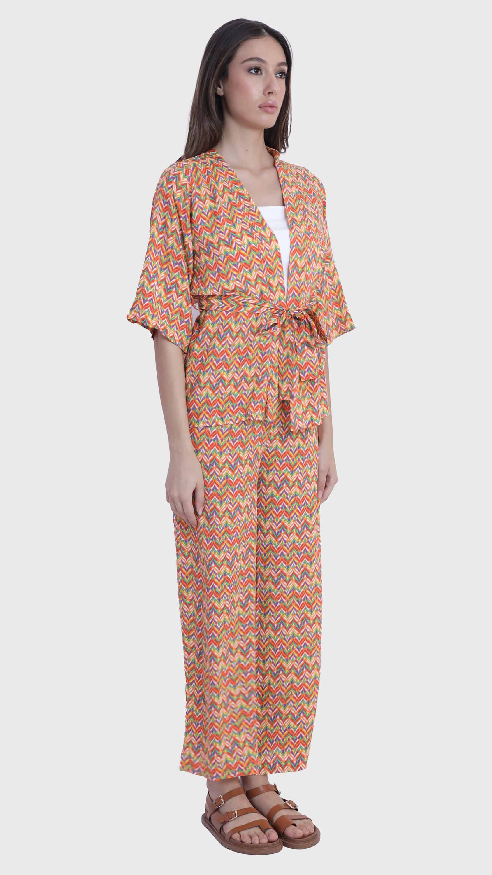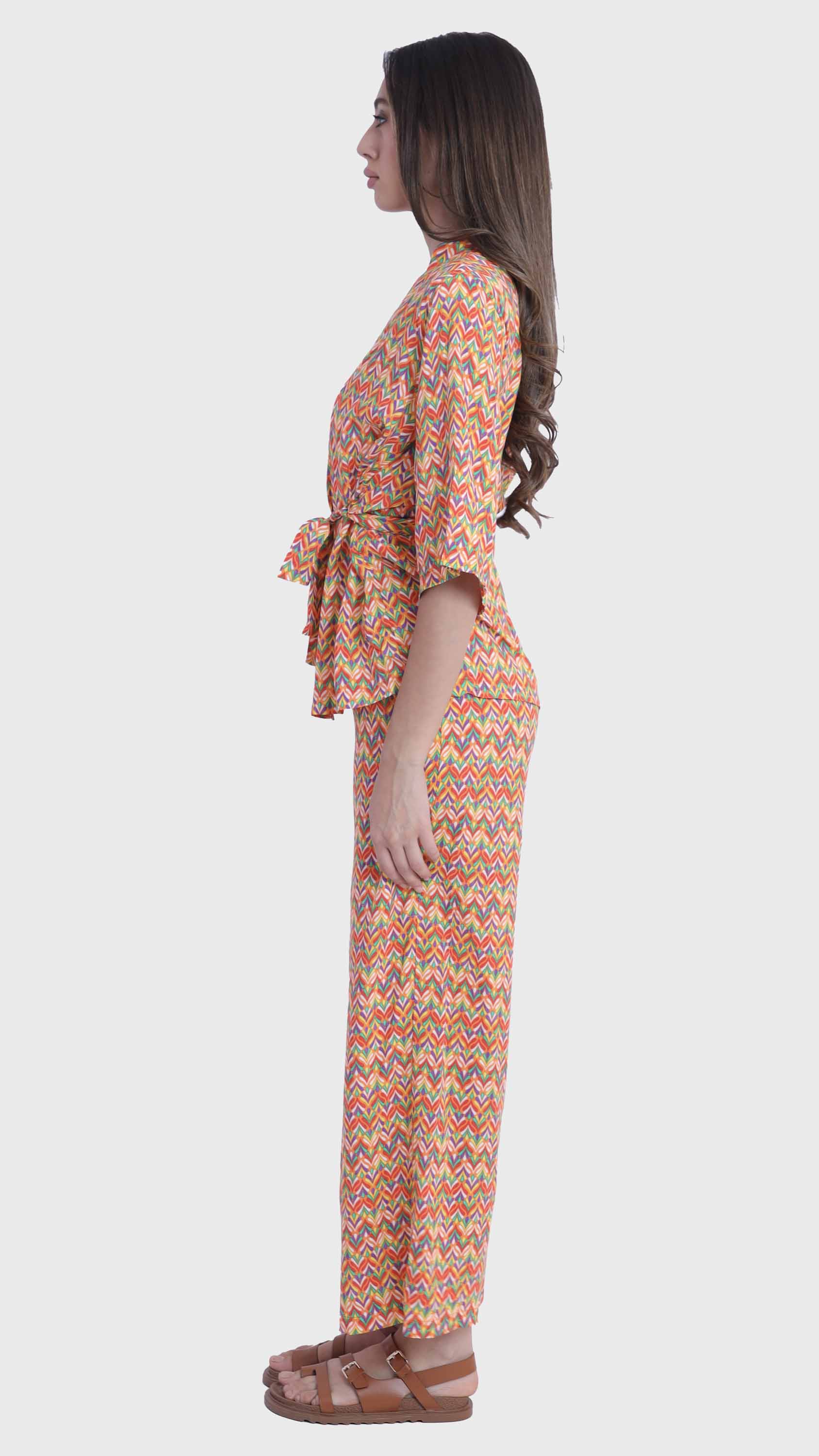 A vibrant and breezy two-piece lounge set perfect for relaxing in style. This set features a flowy, half-sleeve open-front top paired with wide-leg trousers, both adorned with a colorful chevron-inspired print in shades of blue, green, and yellow. Designed for ultimate comfort while maintaining a chic and fresh look, ideal for casual indoor wear or resort lounging.