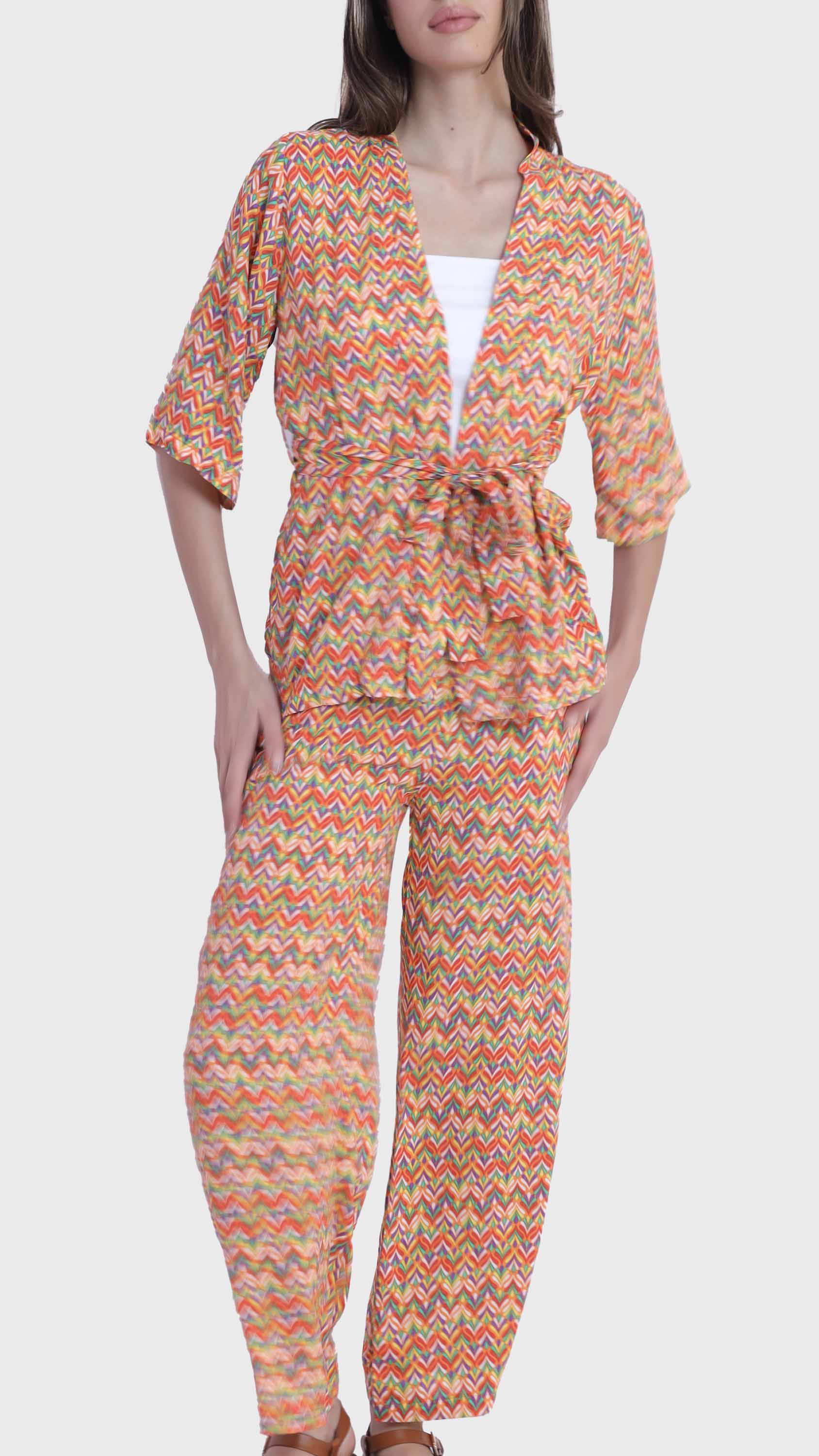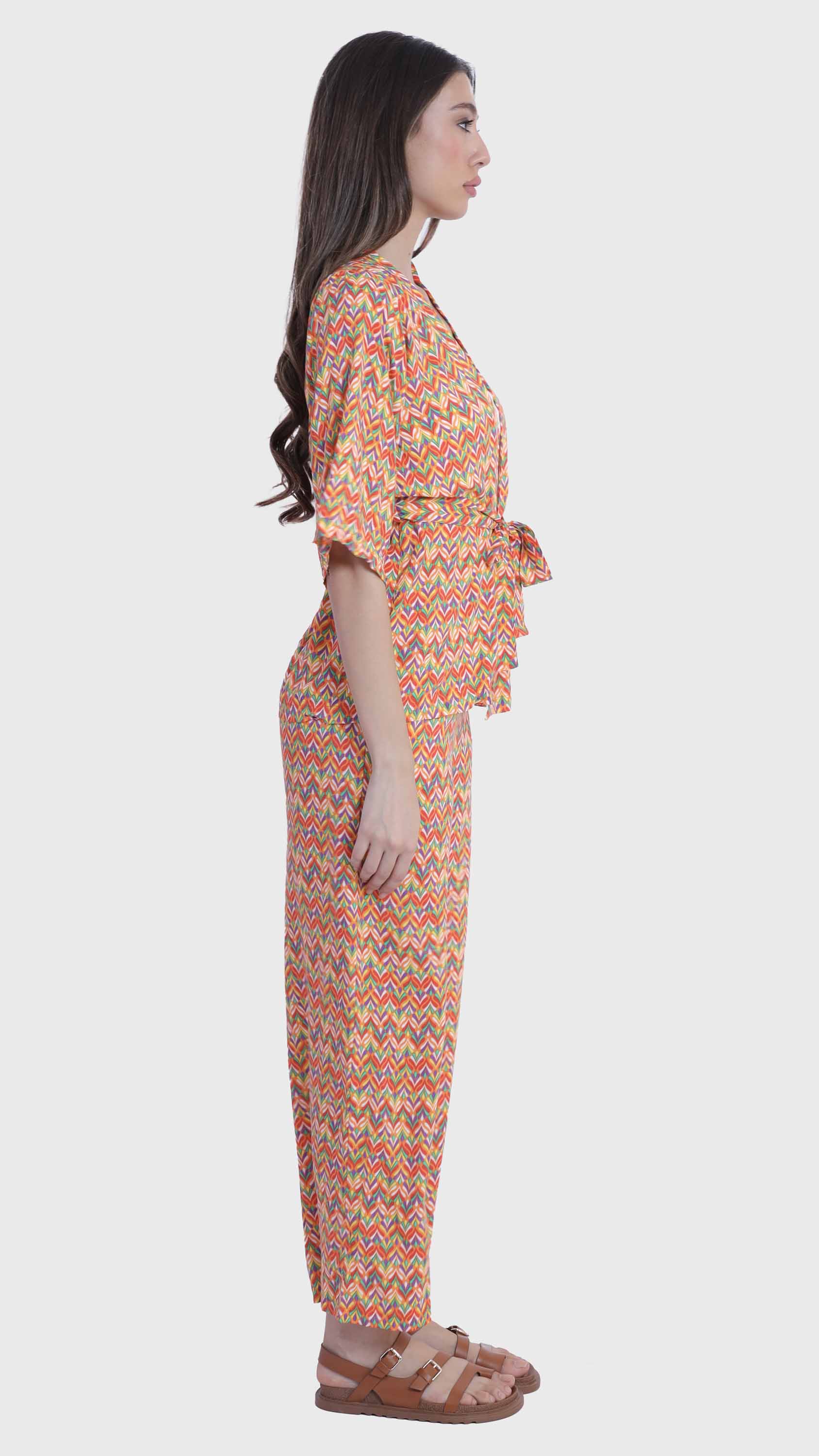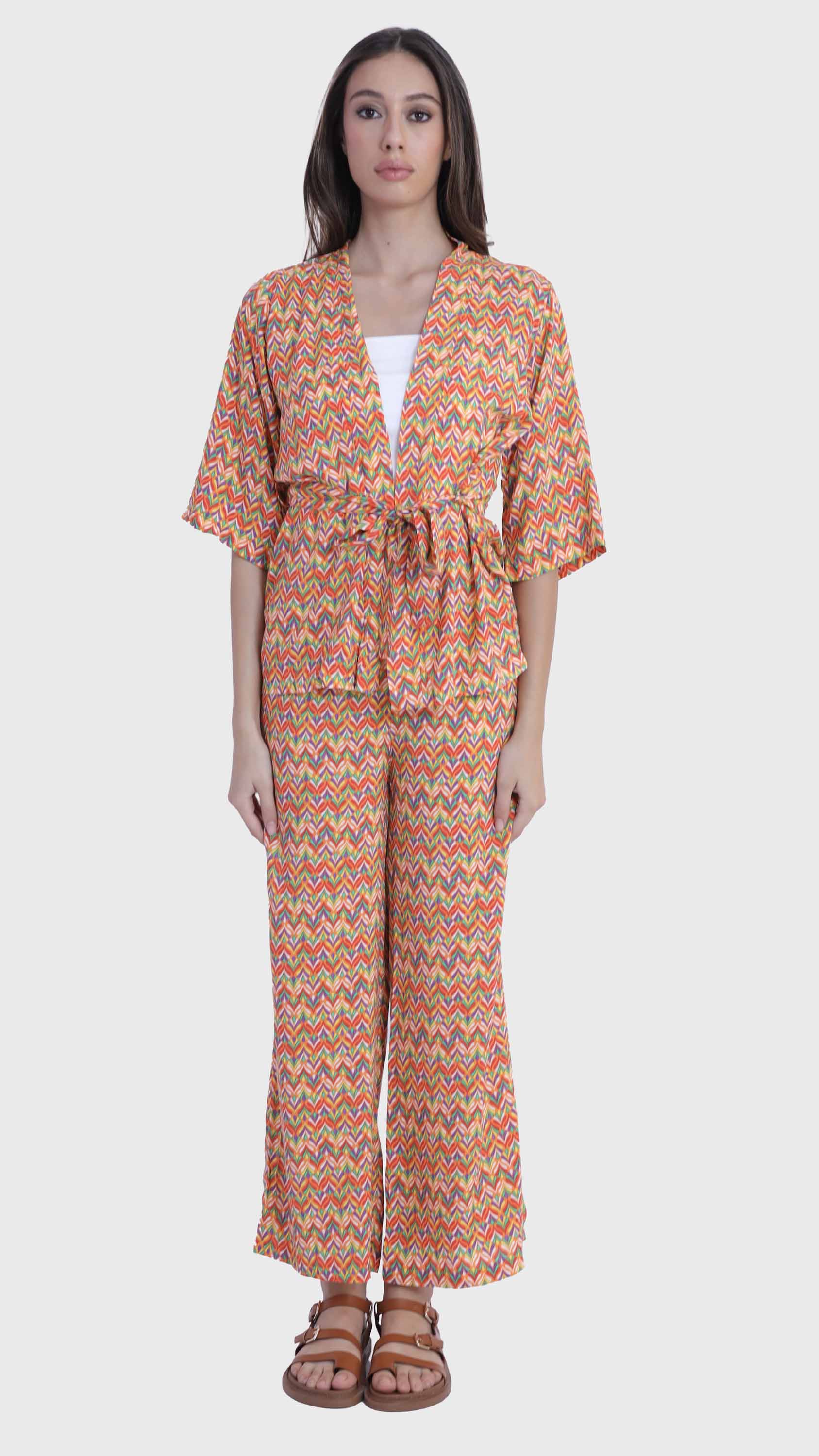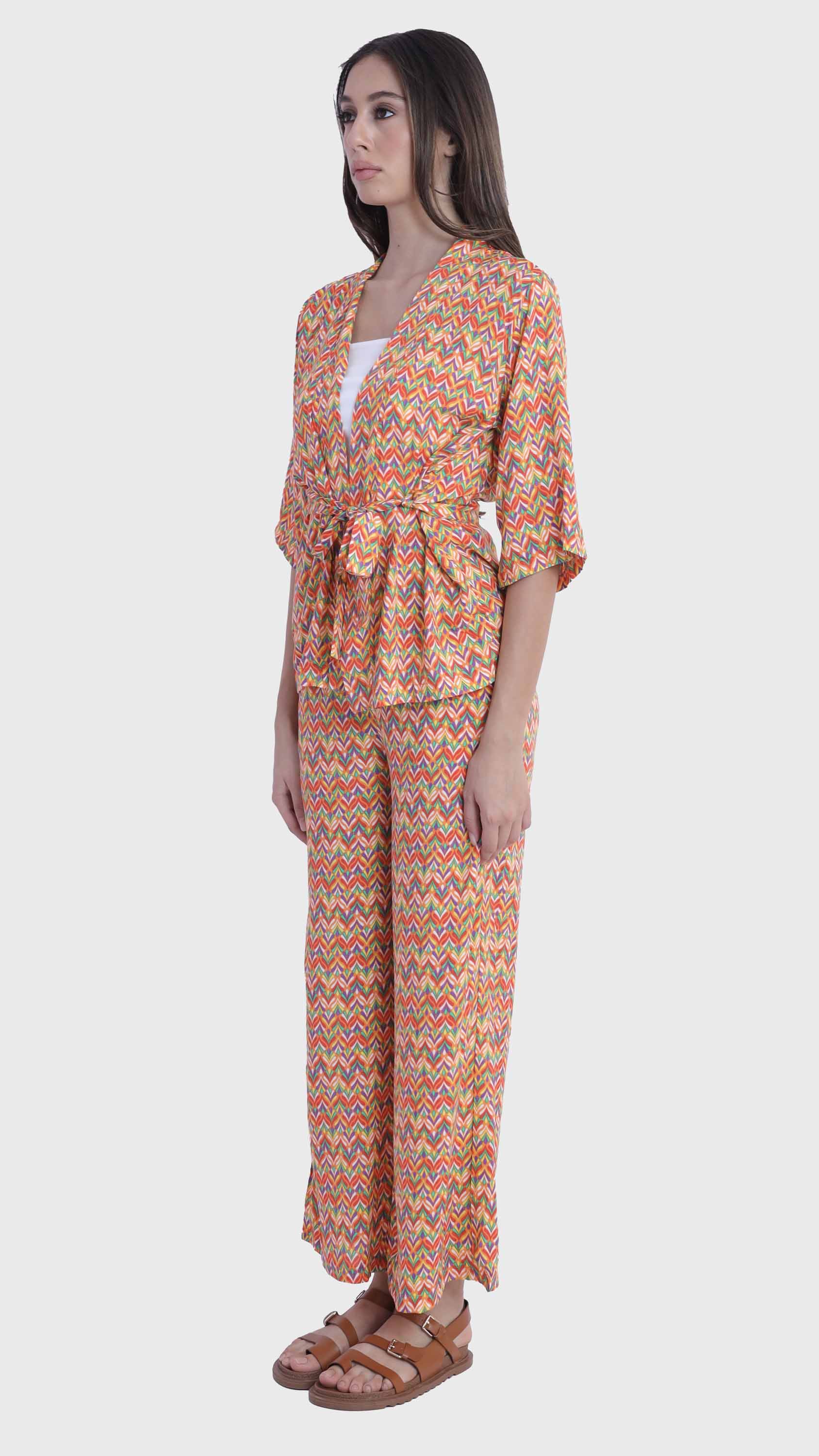 A vibrant and breezy two-piece lounge set perfect for relaxing in style. This set features a flowy, half-sleeve open-front top paired with wide-leg trousers, both adorned with a colorful chevron-inspired print in shades of blue, green, and yellow. Designed for ultimate comfort while maintaining a chic and fresh look, ideal for casual indoor wear or resort lounging.