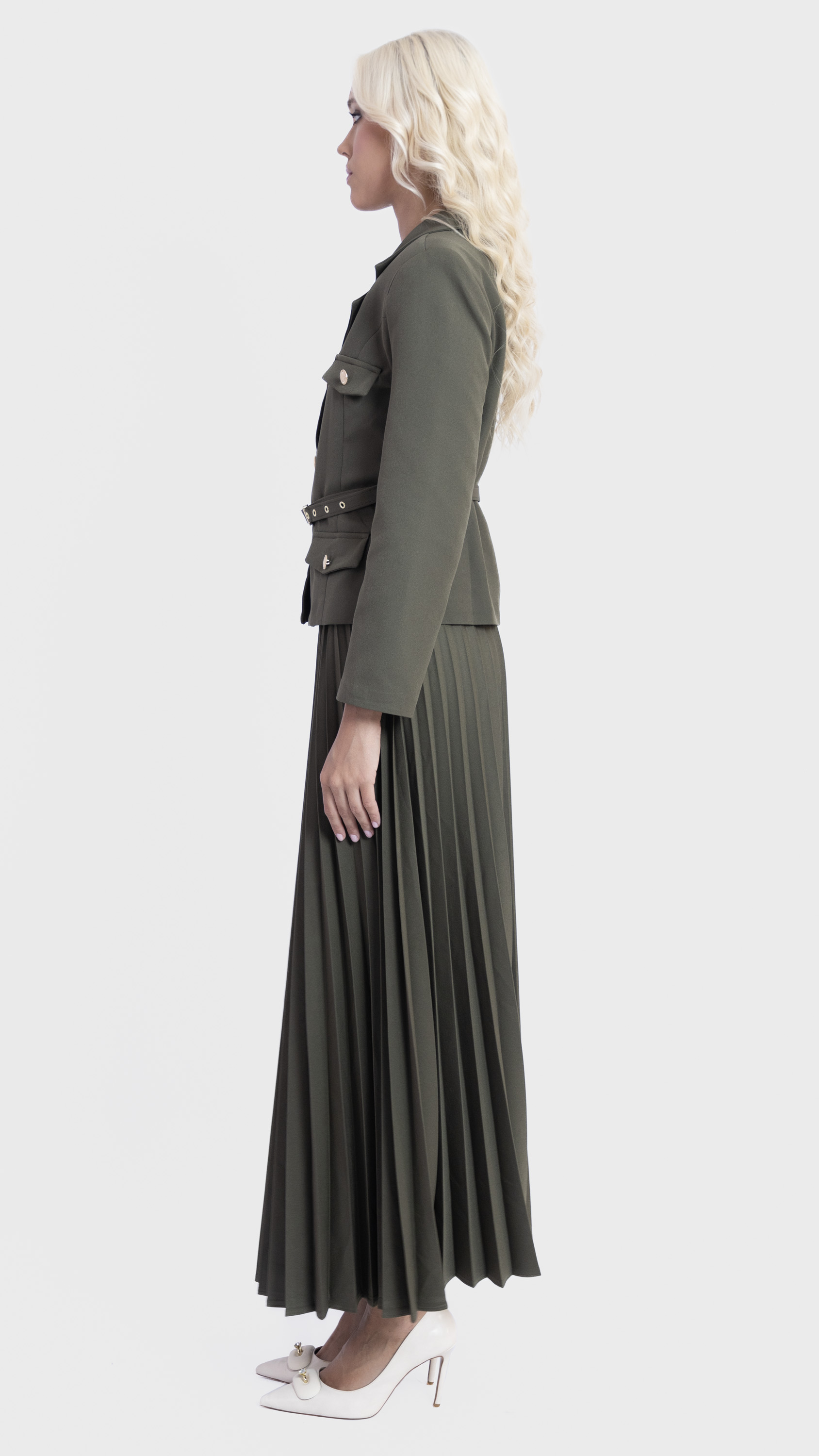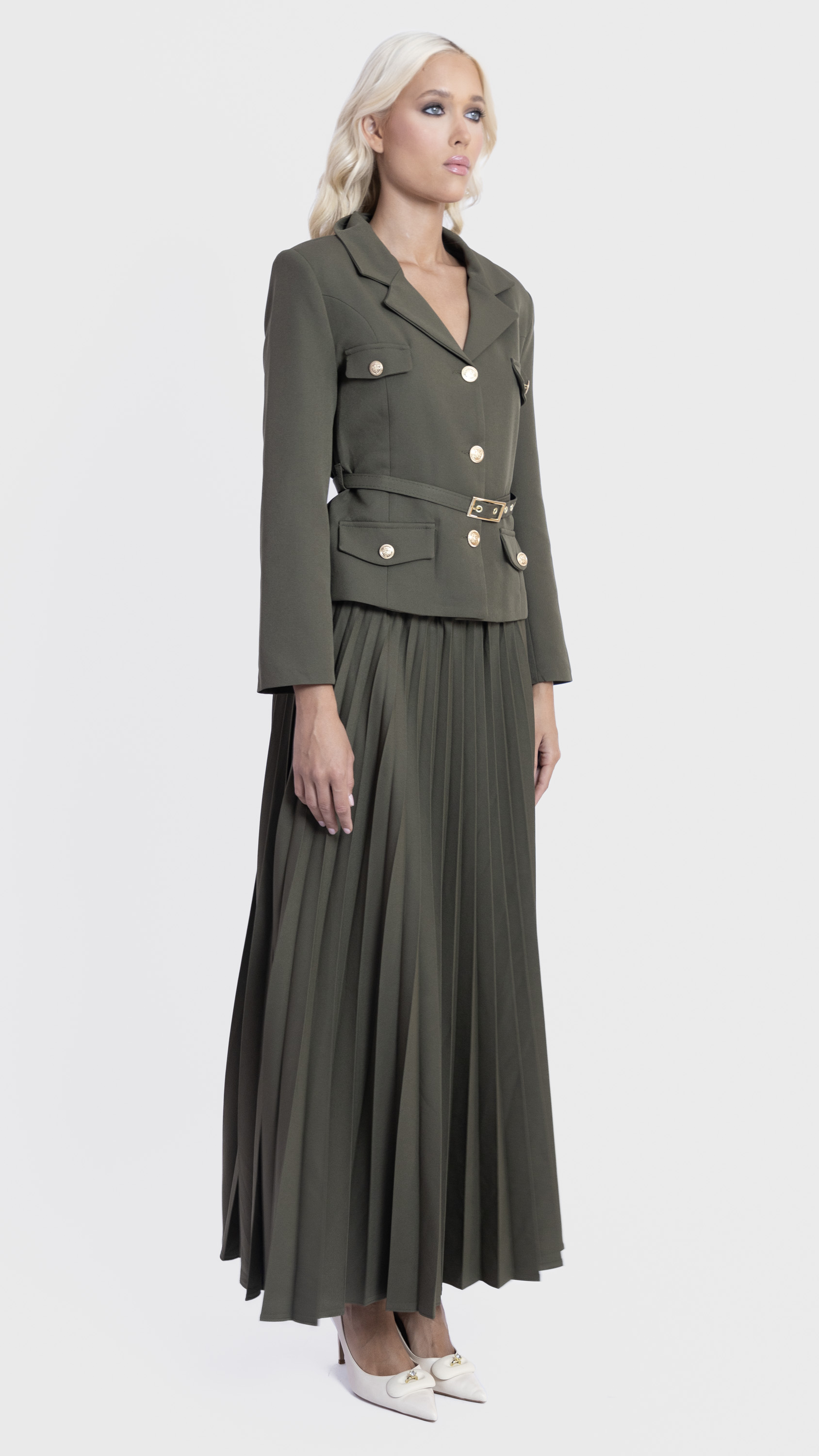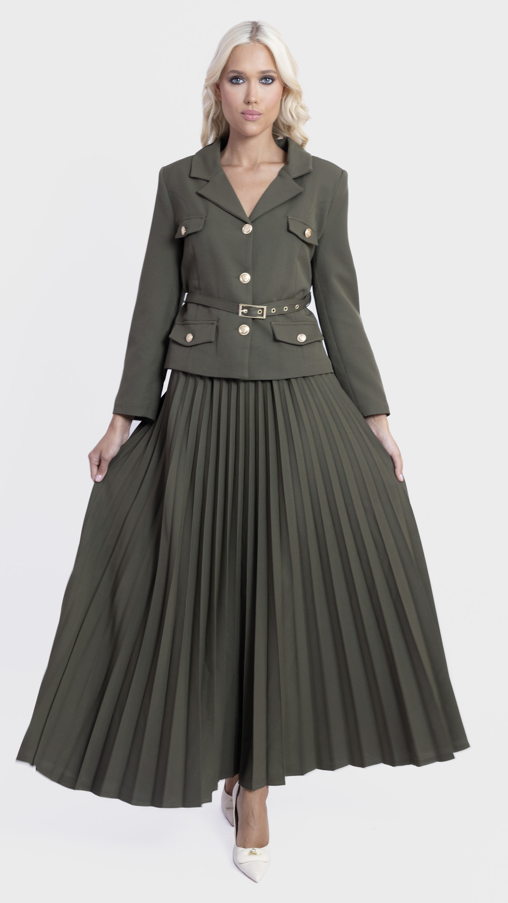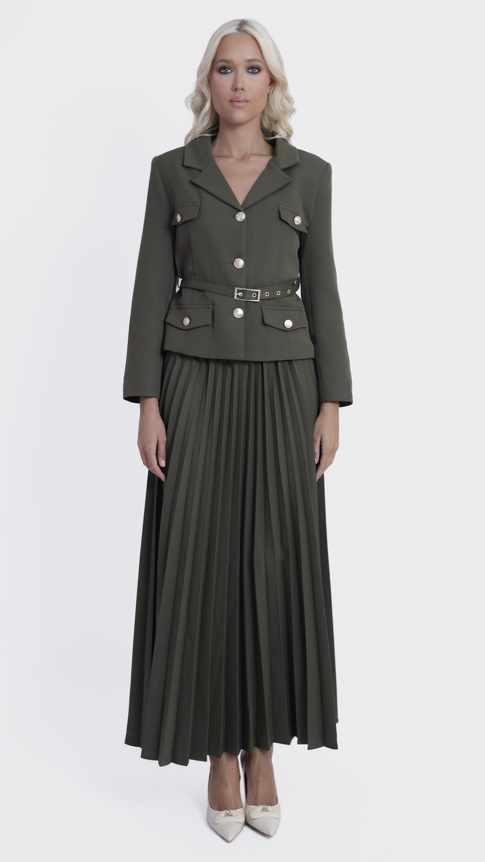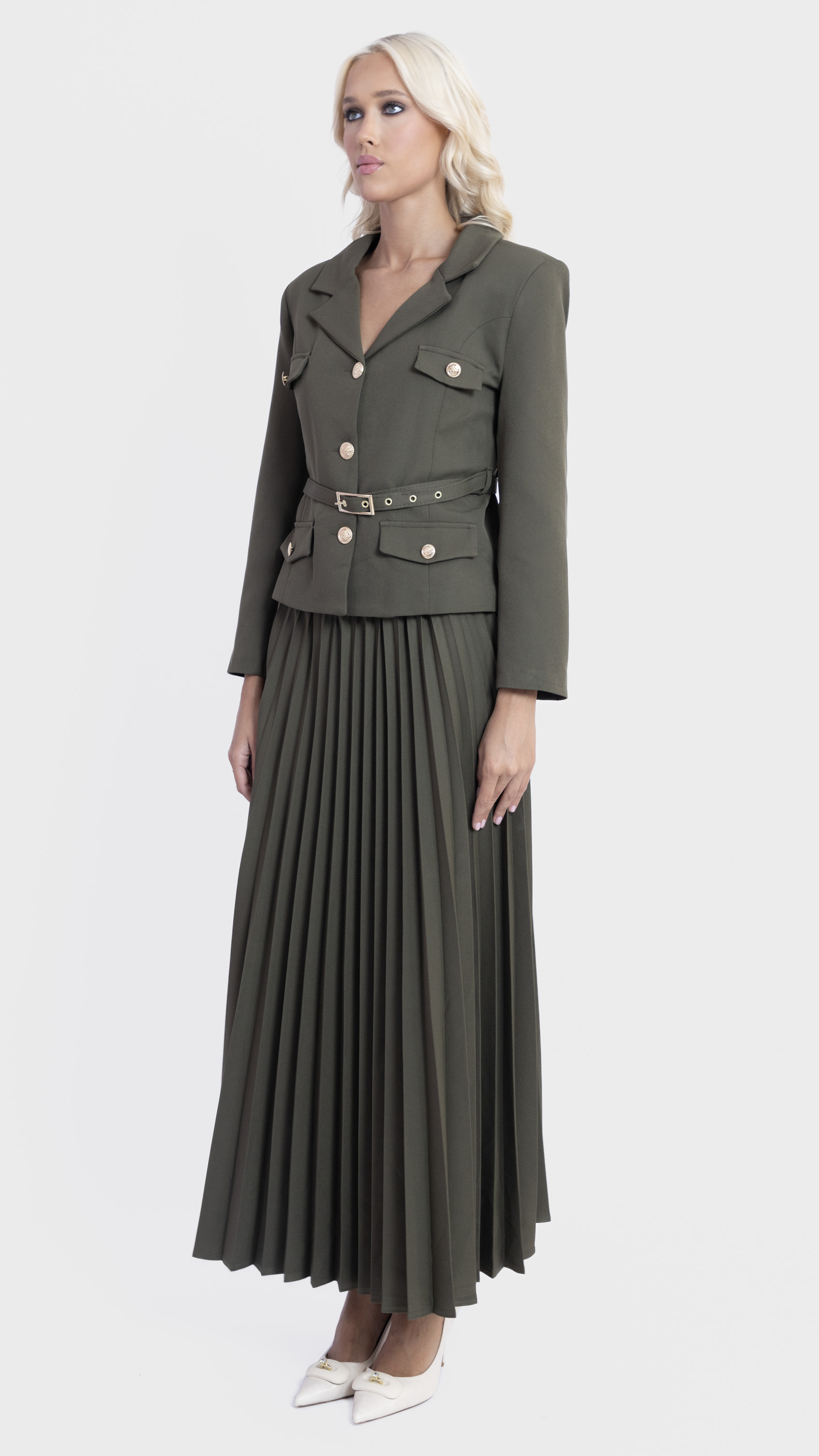 Step into elegance with this Khaki Pleated Skirt and Utility Blazer Set.