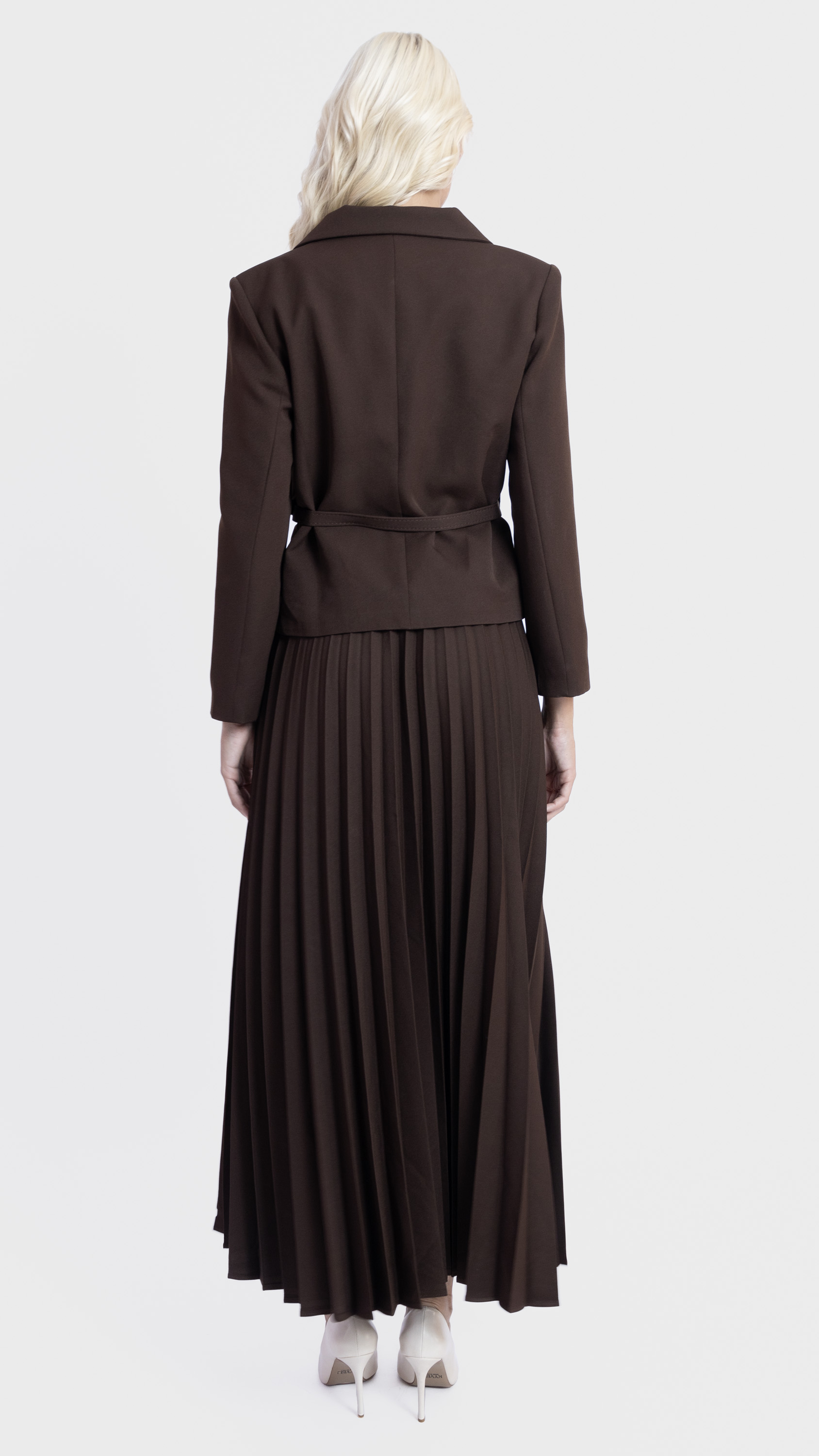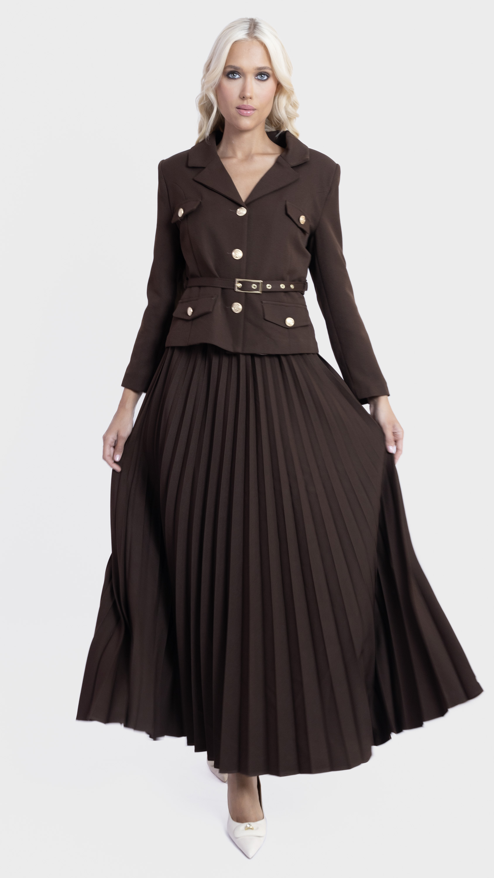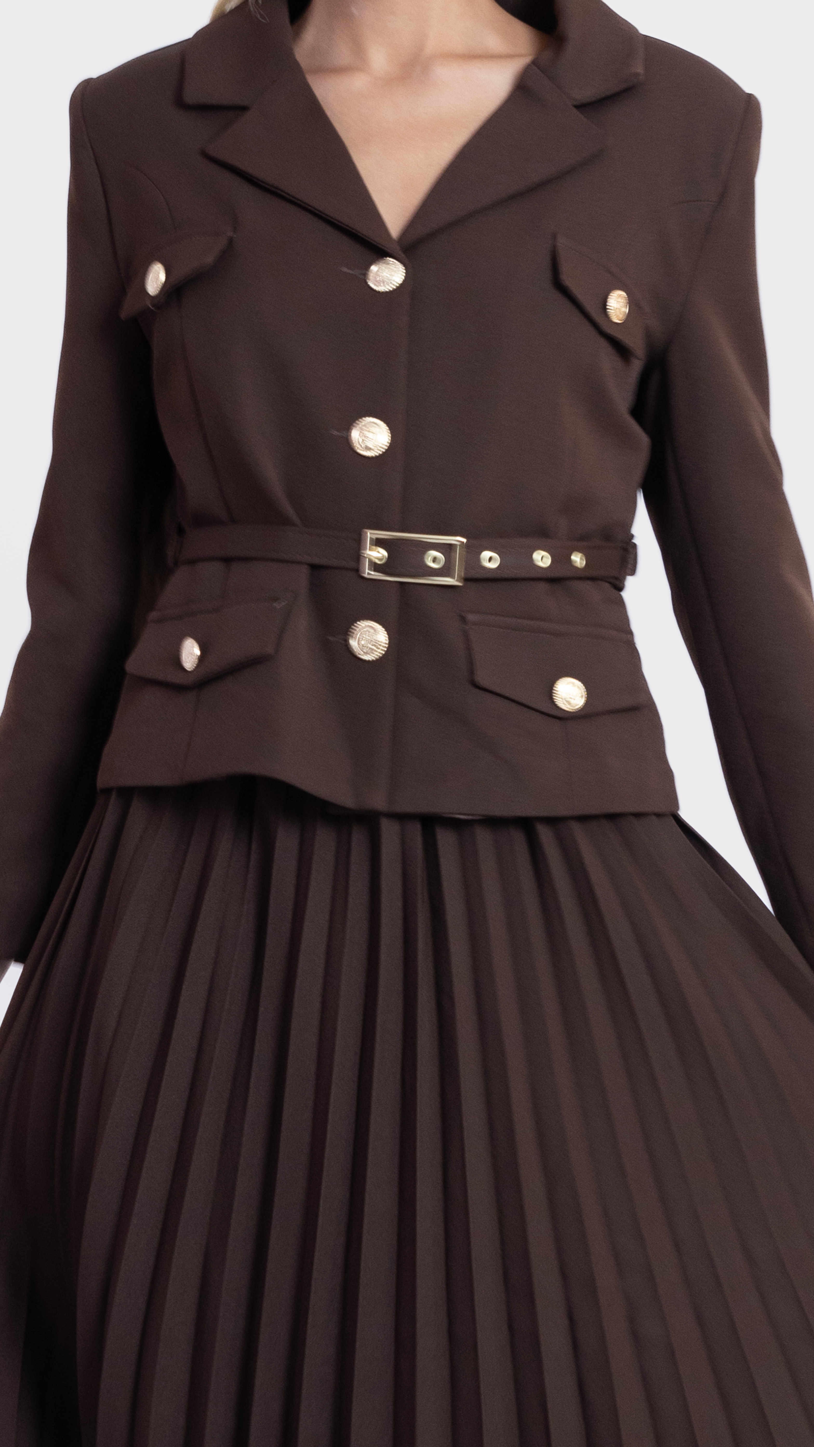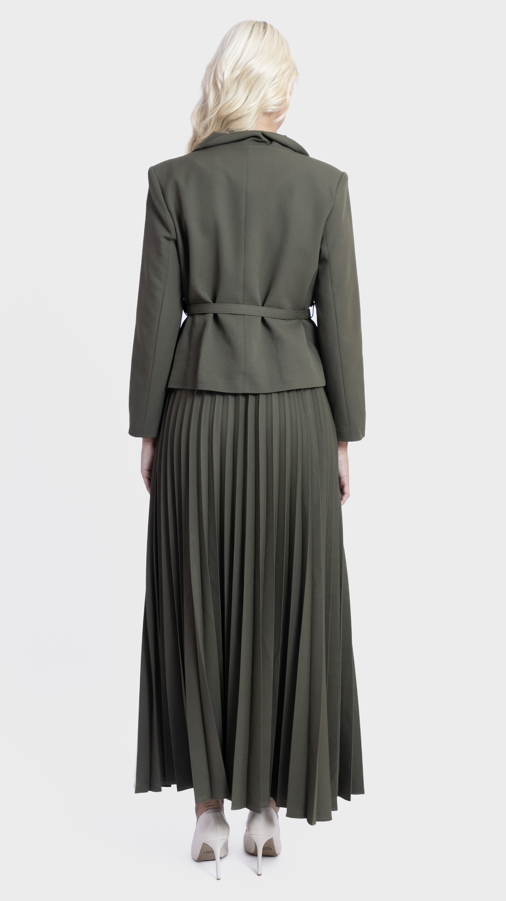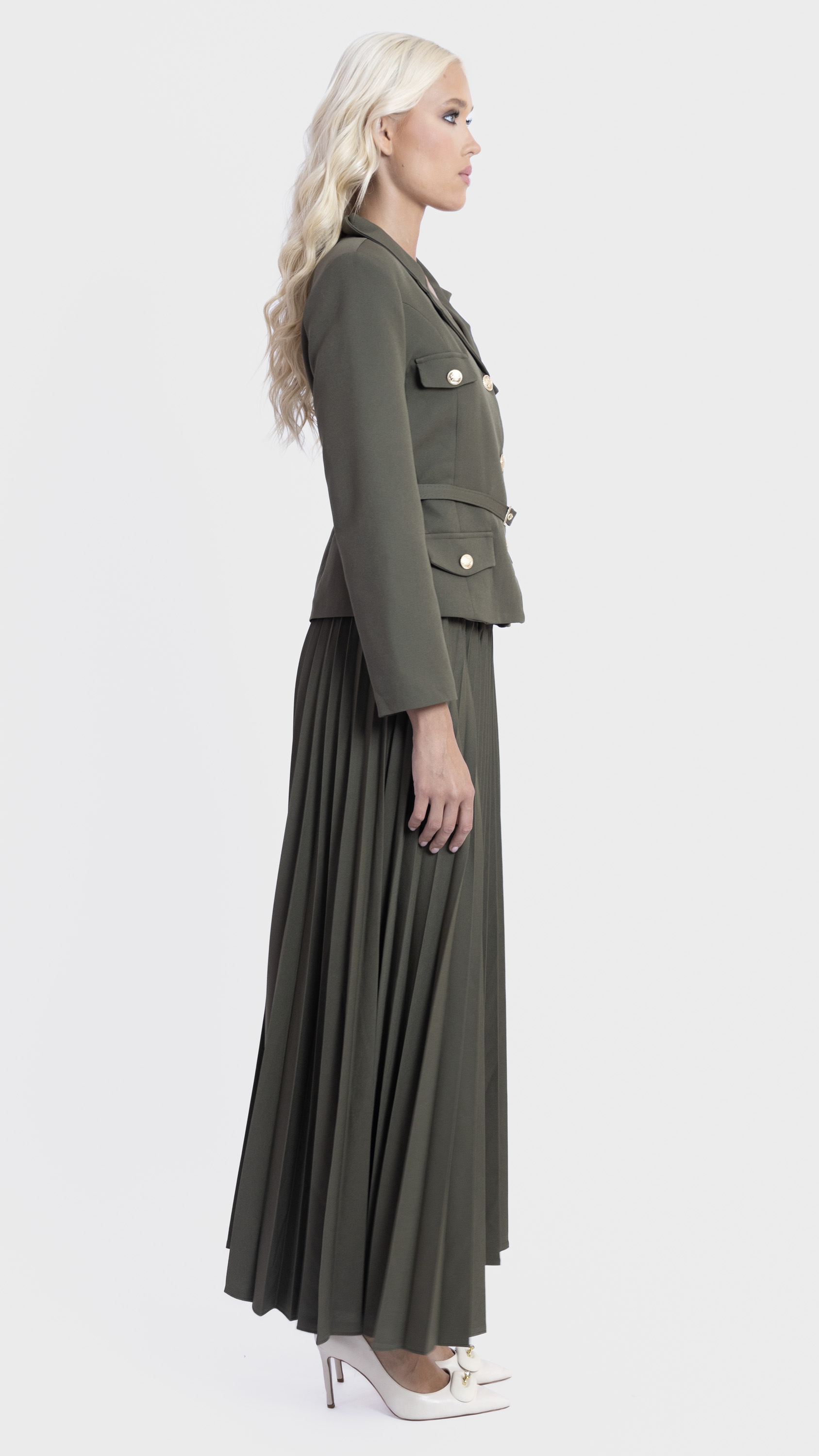 Step into elegance with this Khaki Pleated Skirt and Utility Blazer Set.