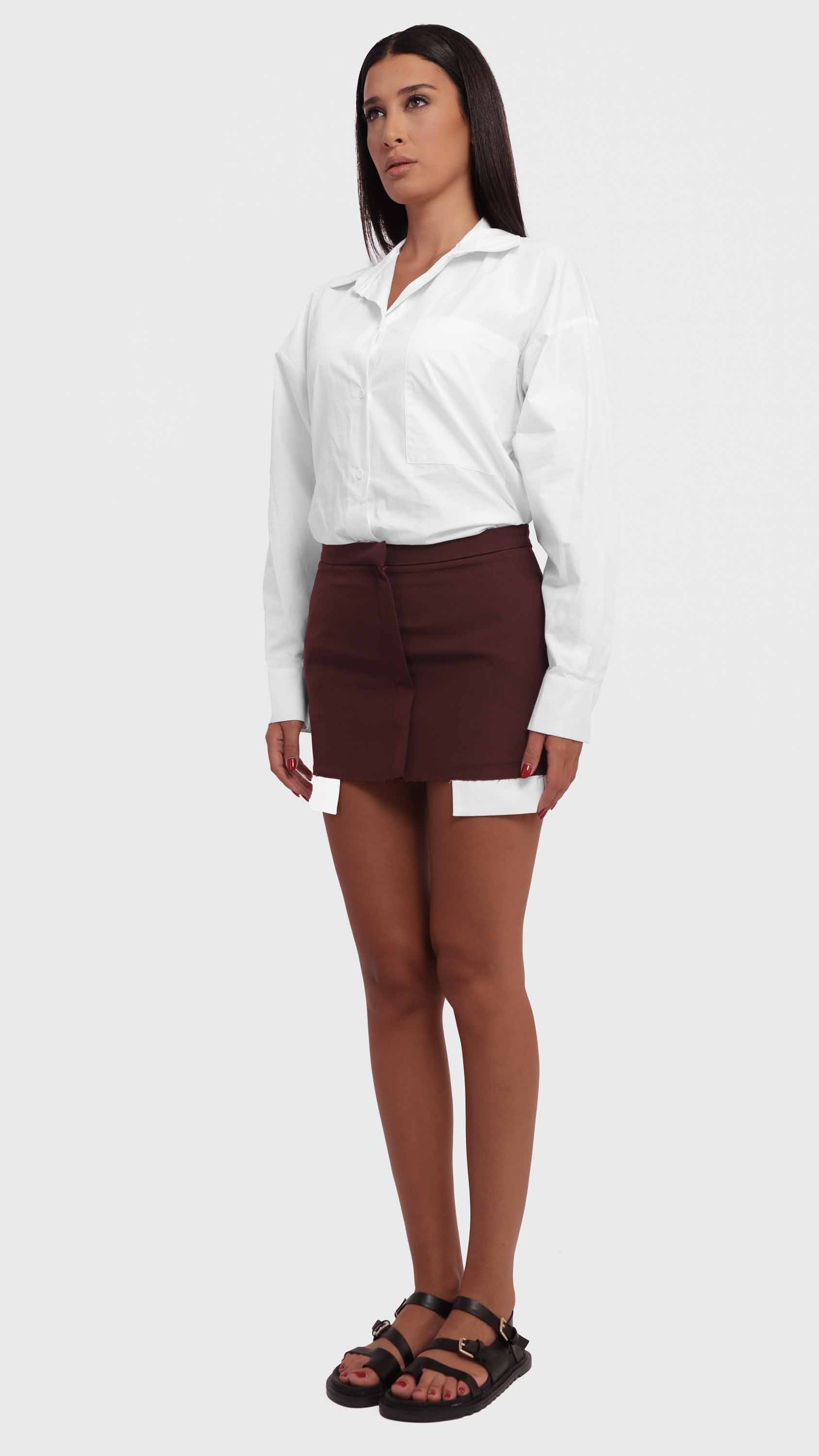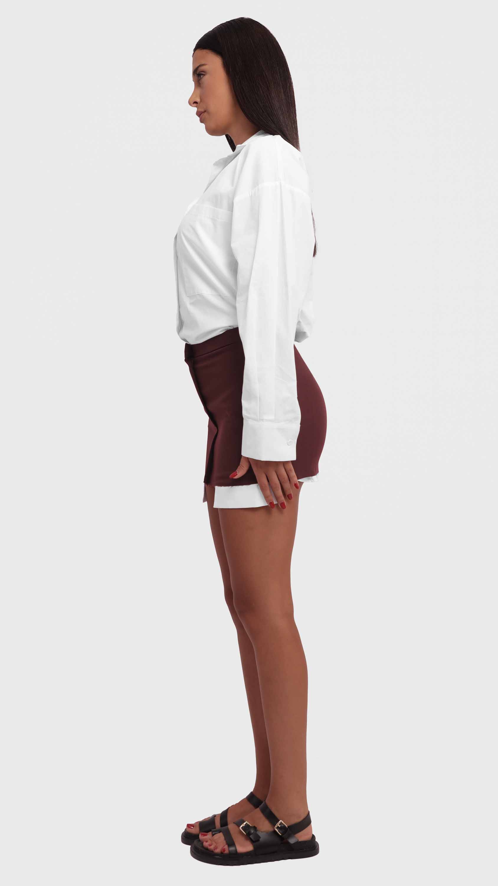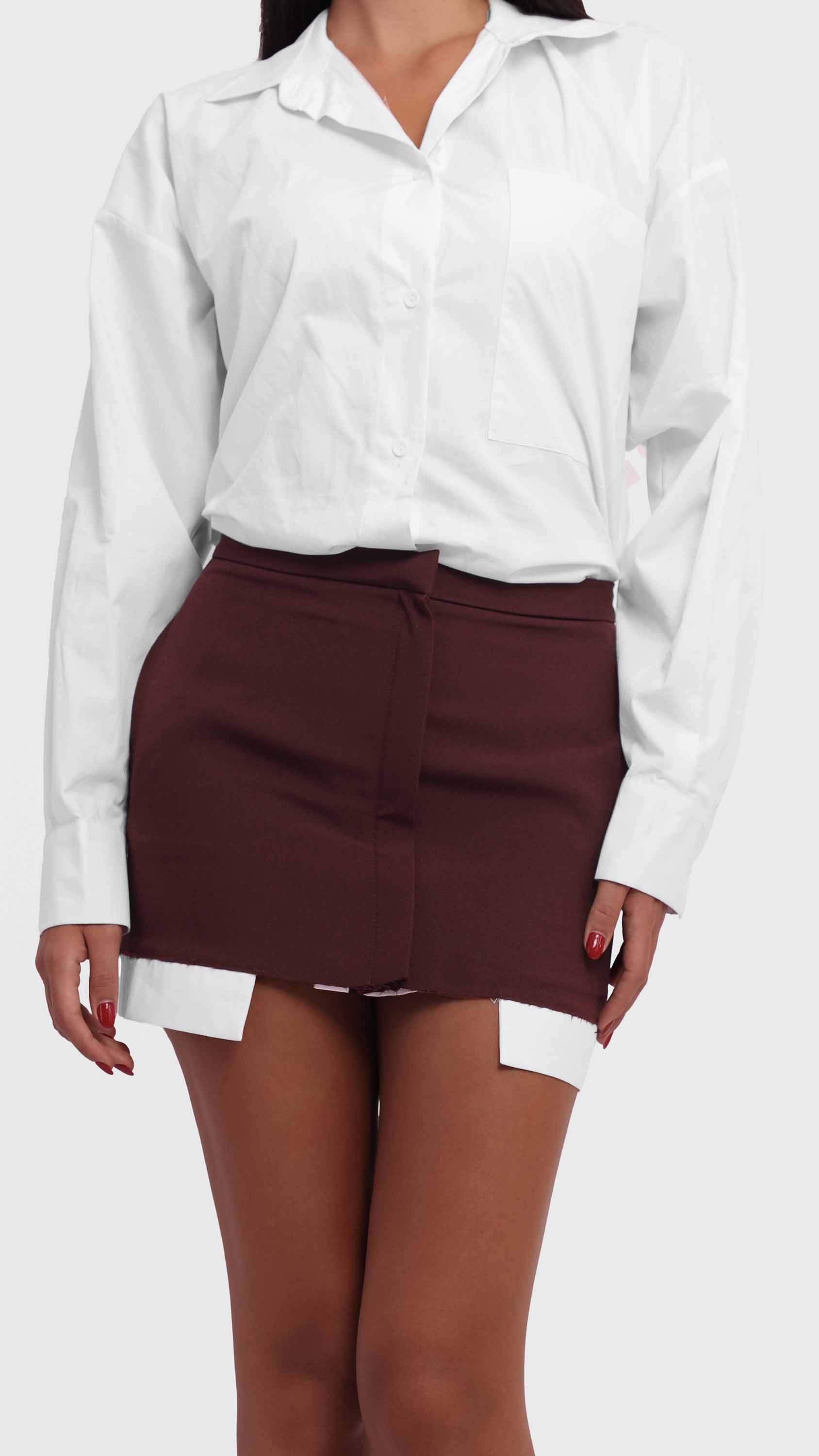 Make a bold statement with this two-tone contrast shirt featuring a maroon hem. Designed with an oversized, relaxed fit, this shirt combines classic tailoring with a modern, deconstructed twist. Crafted from a lightweight woven cotton blend, it features a crisp white upper, a single chest pocket, dropped shoulders, and raw-edge detailing, offering a perfect mix of casual comfort and edgy street style.