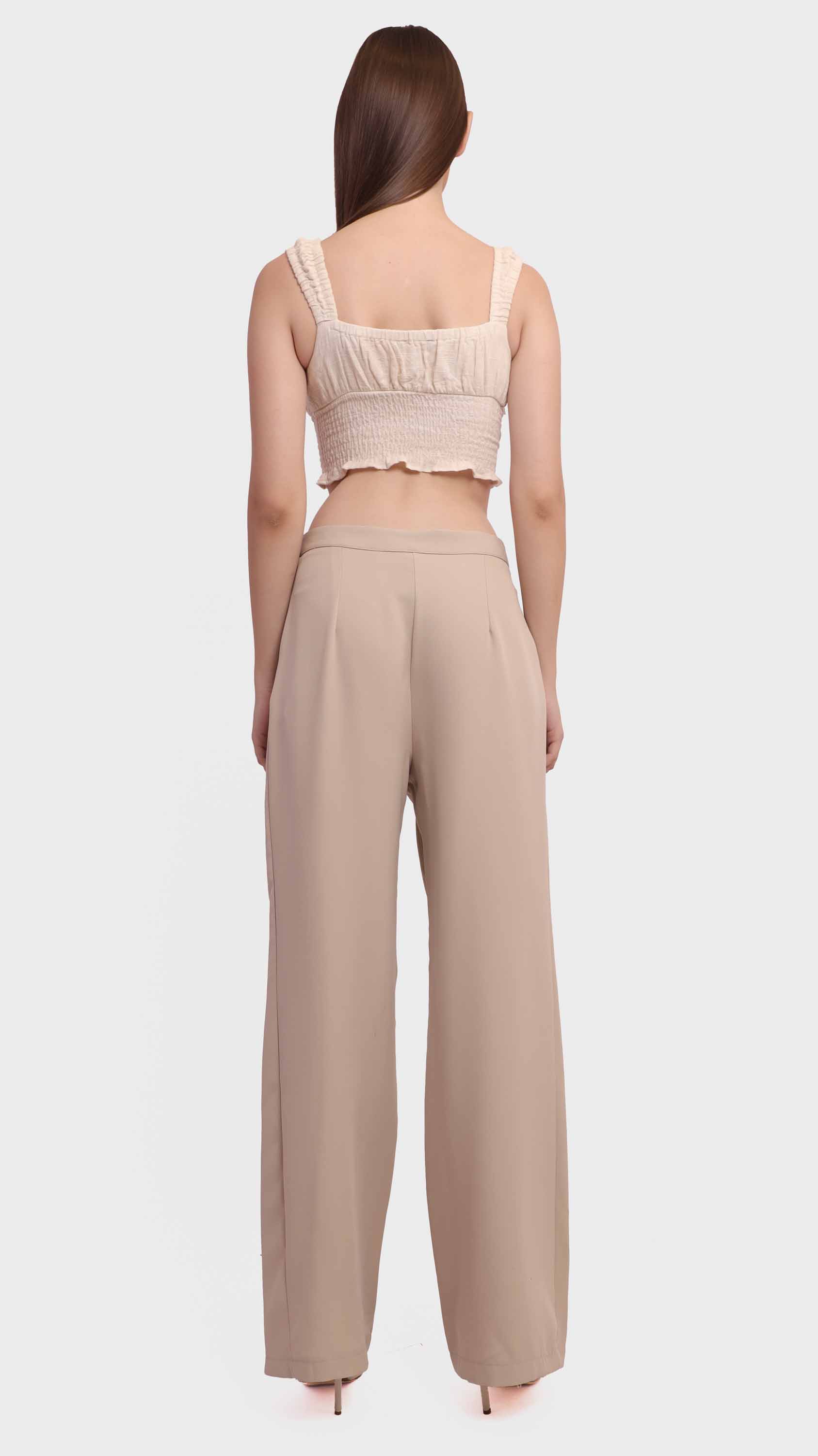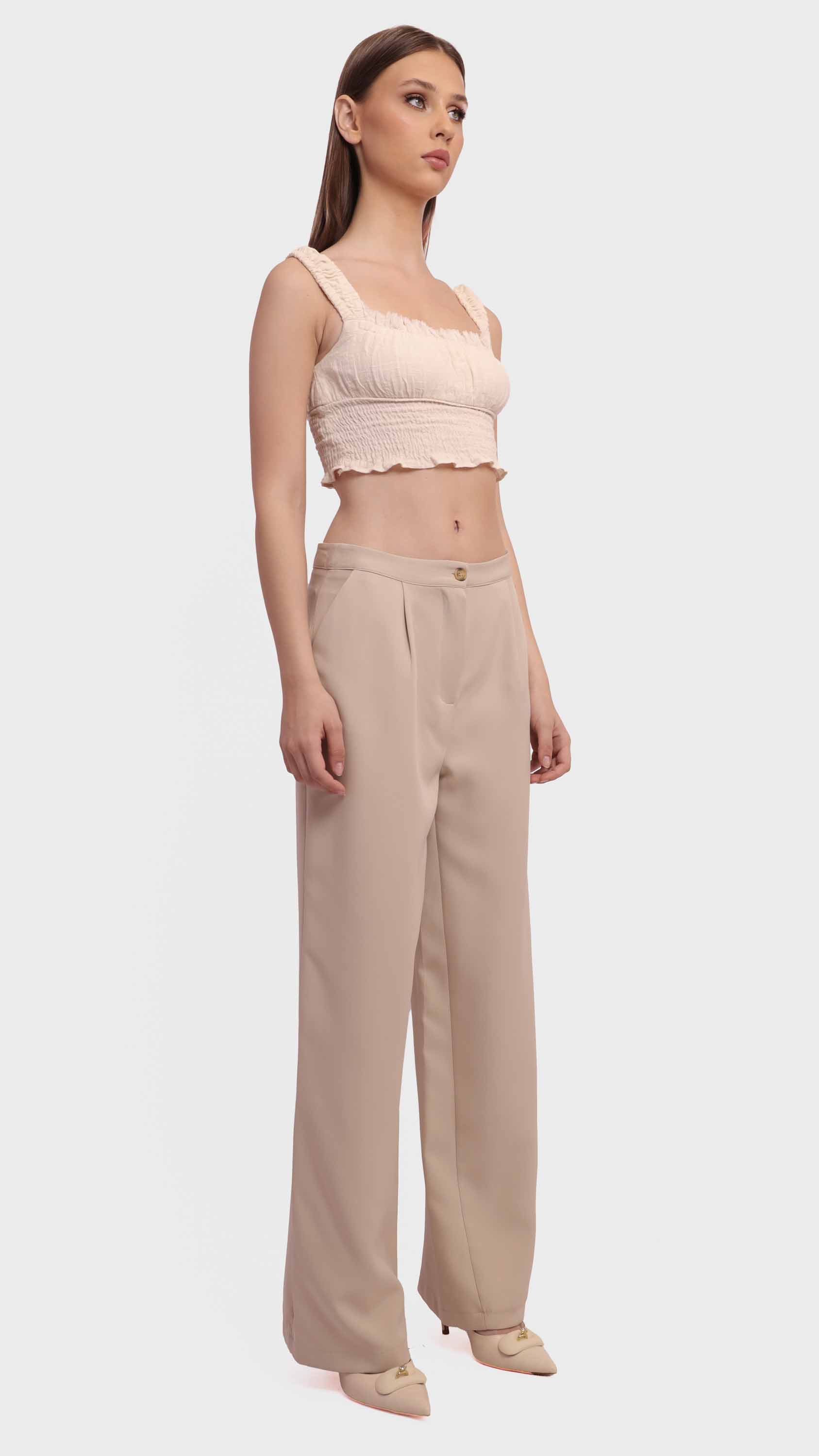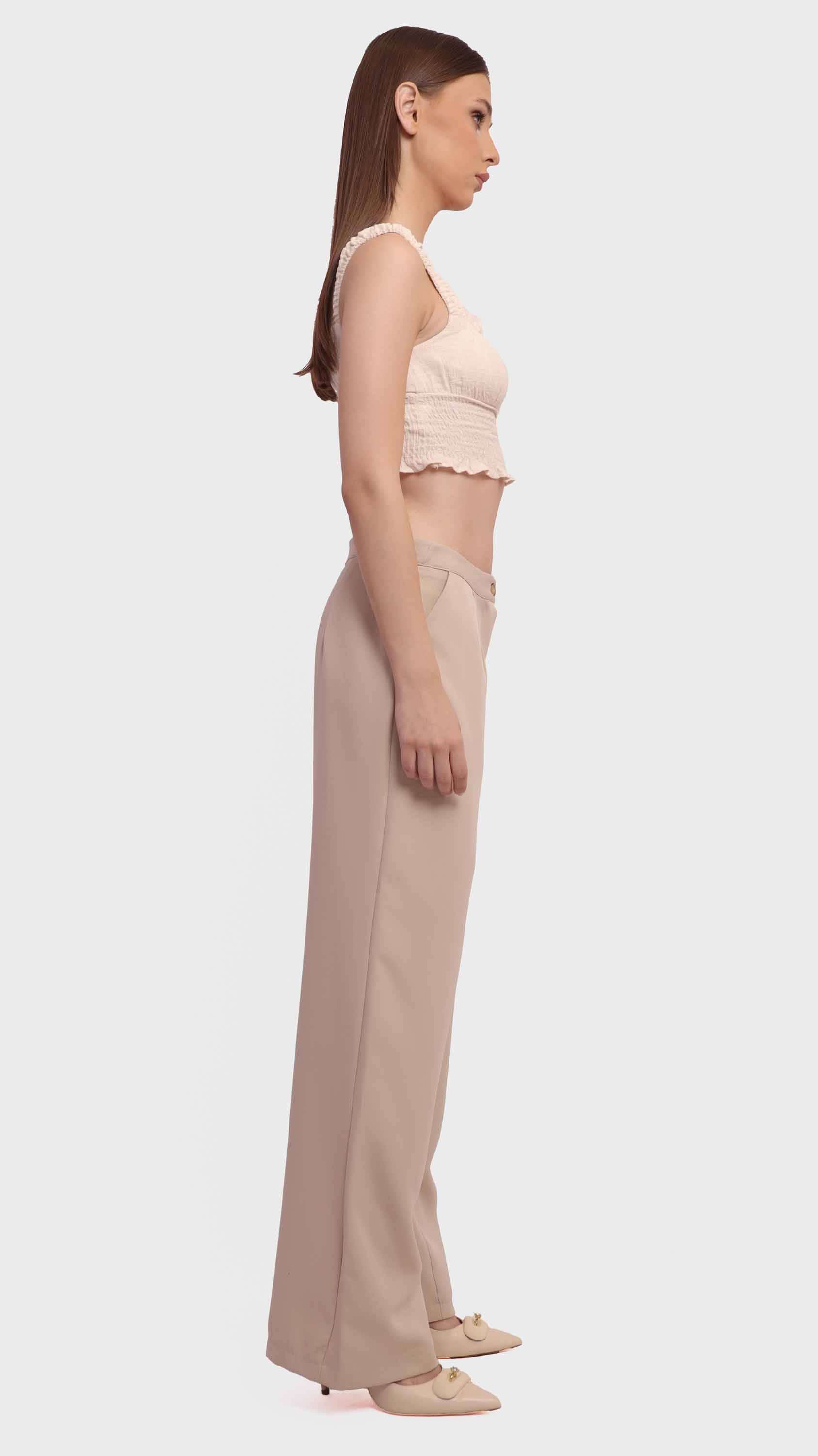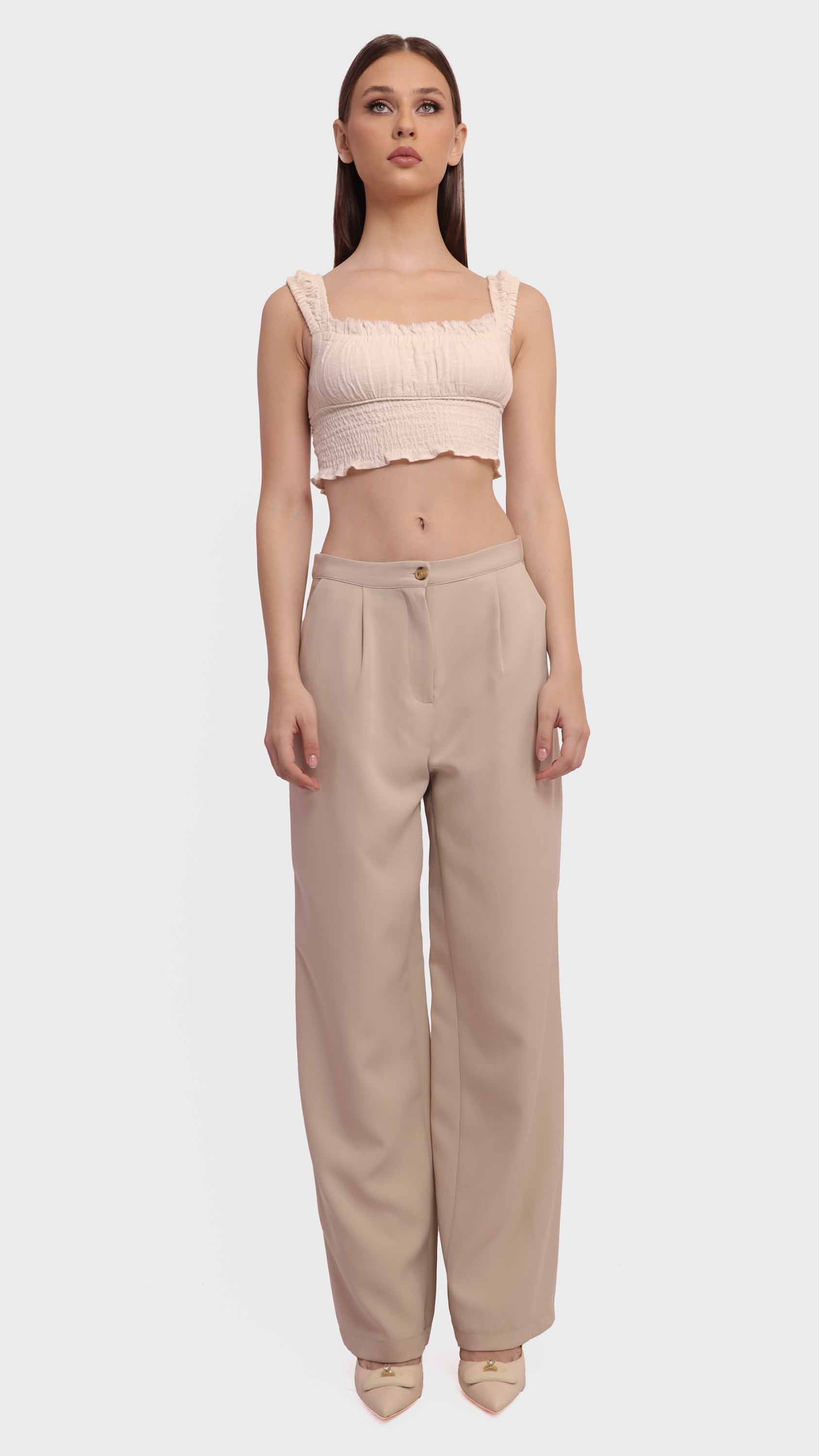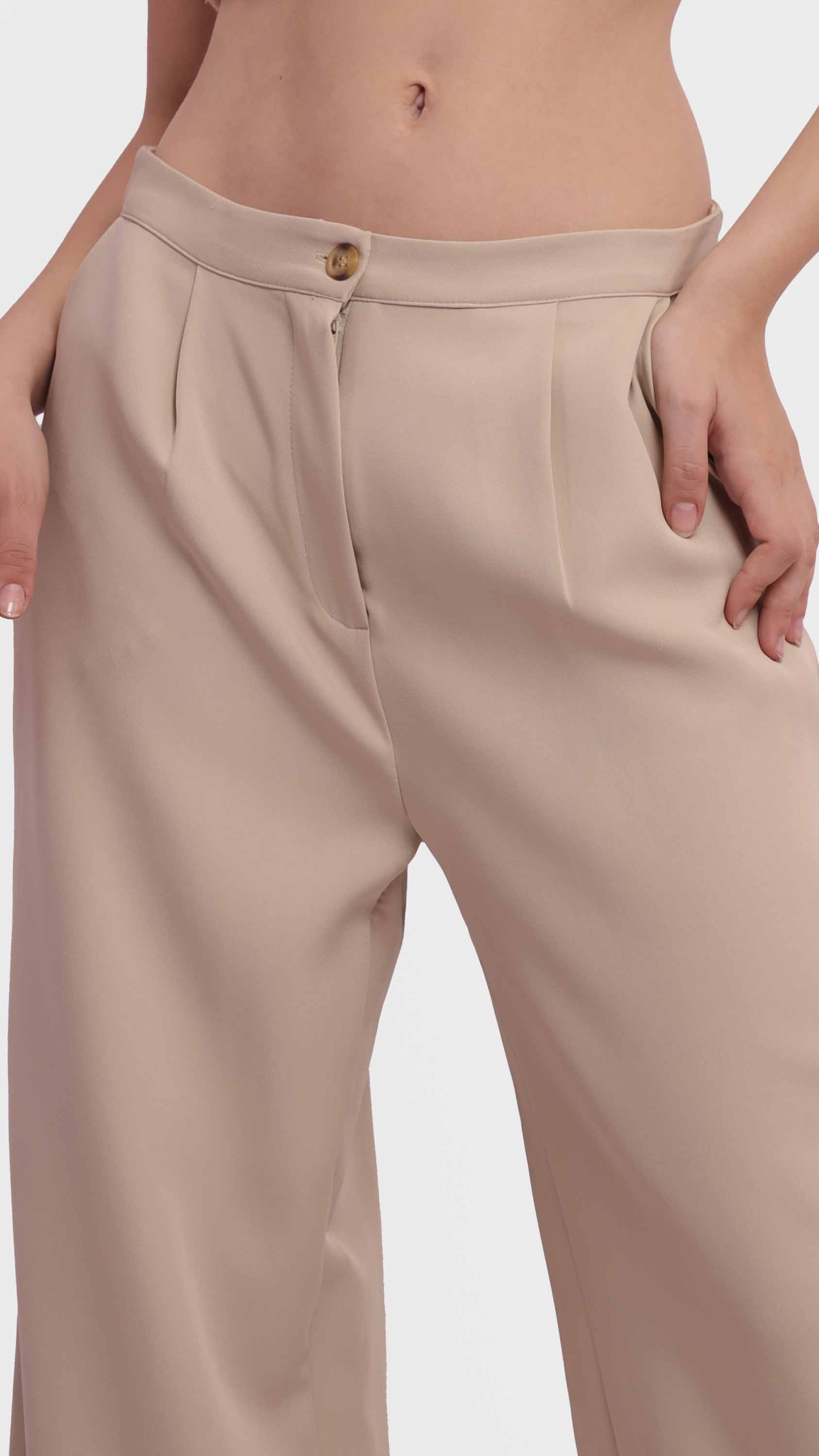 These straight-leg trousers feature classic front pleats and a tailored waistband for a polished look. The soft, textured fabric and minimal detailing make them a staple piece for office-ready outfits or elevated casual looks.