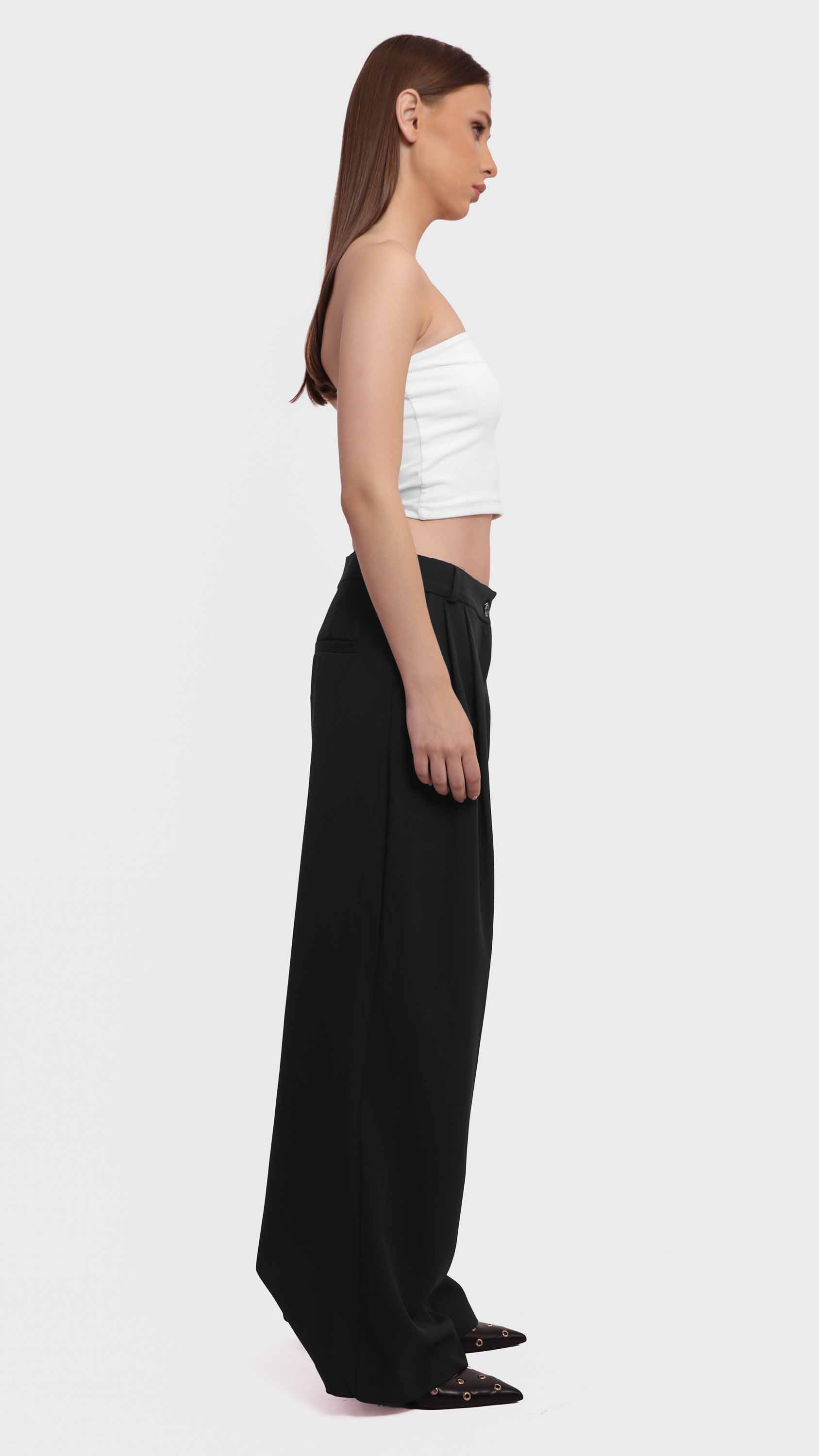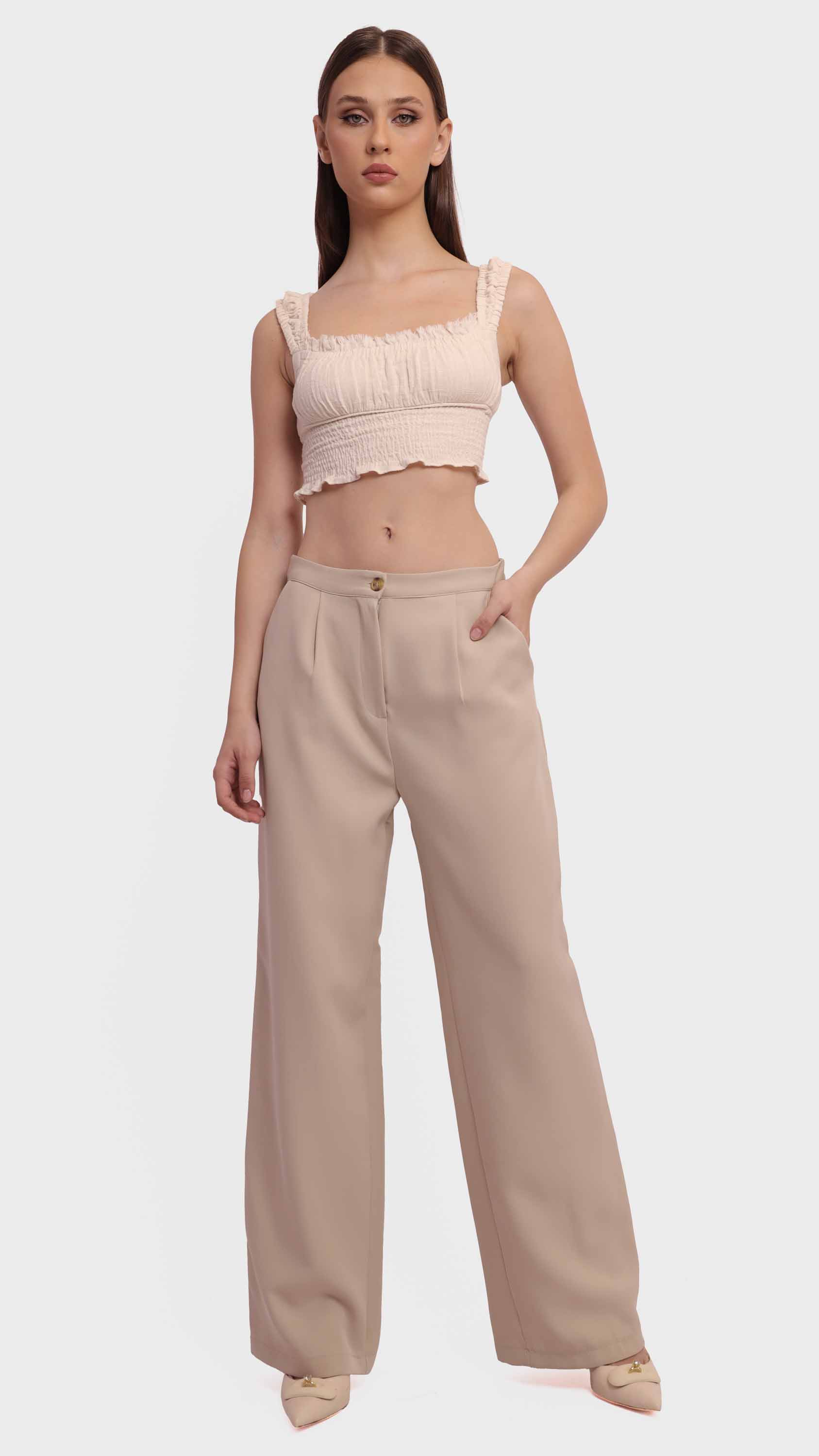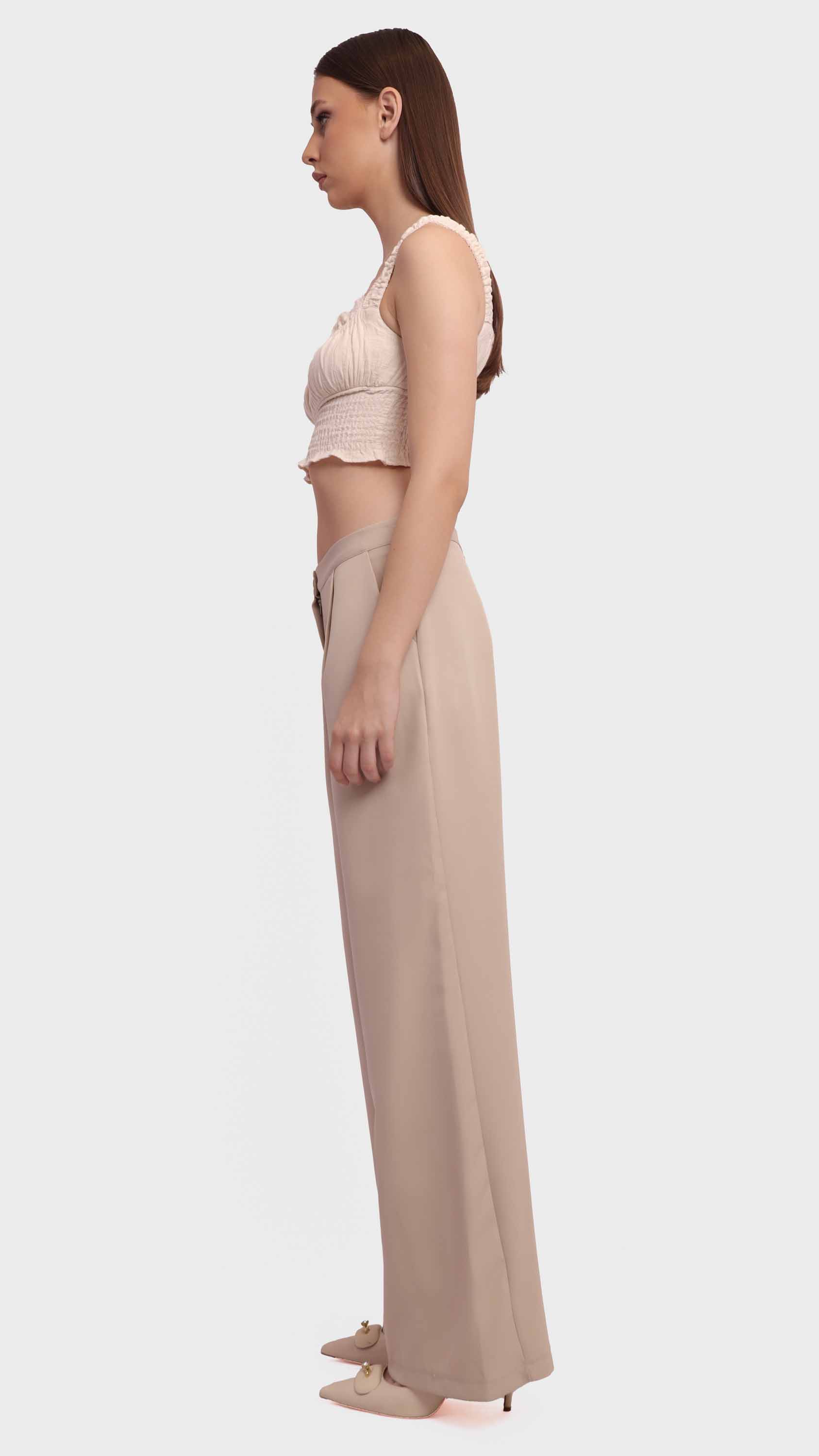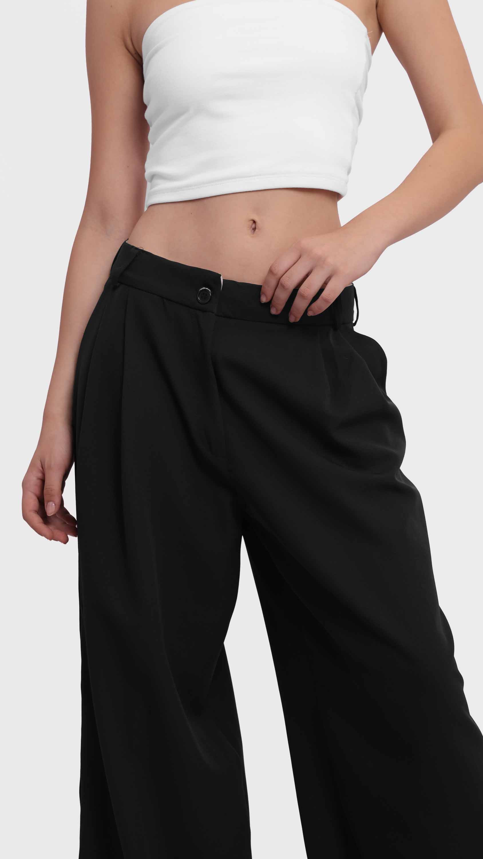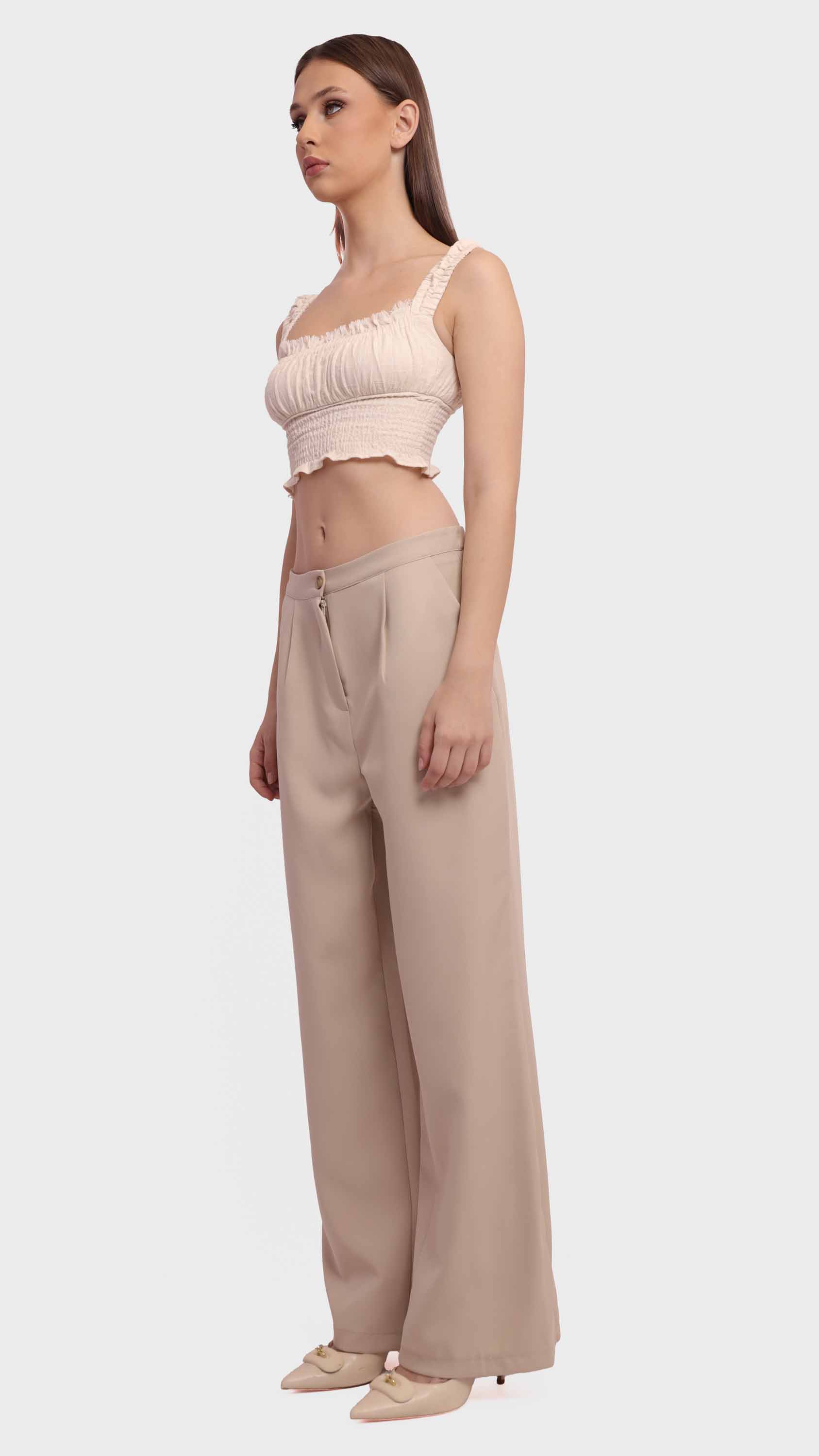 These straight-leg trousers feature classic front pleats and a tailored waistband for a polished look. The soft, textured fabric and minimal detailing make them a staple piece for office-ready outfits or elevated casual looks.