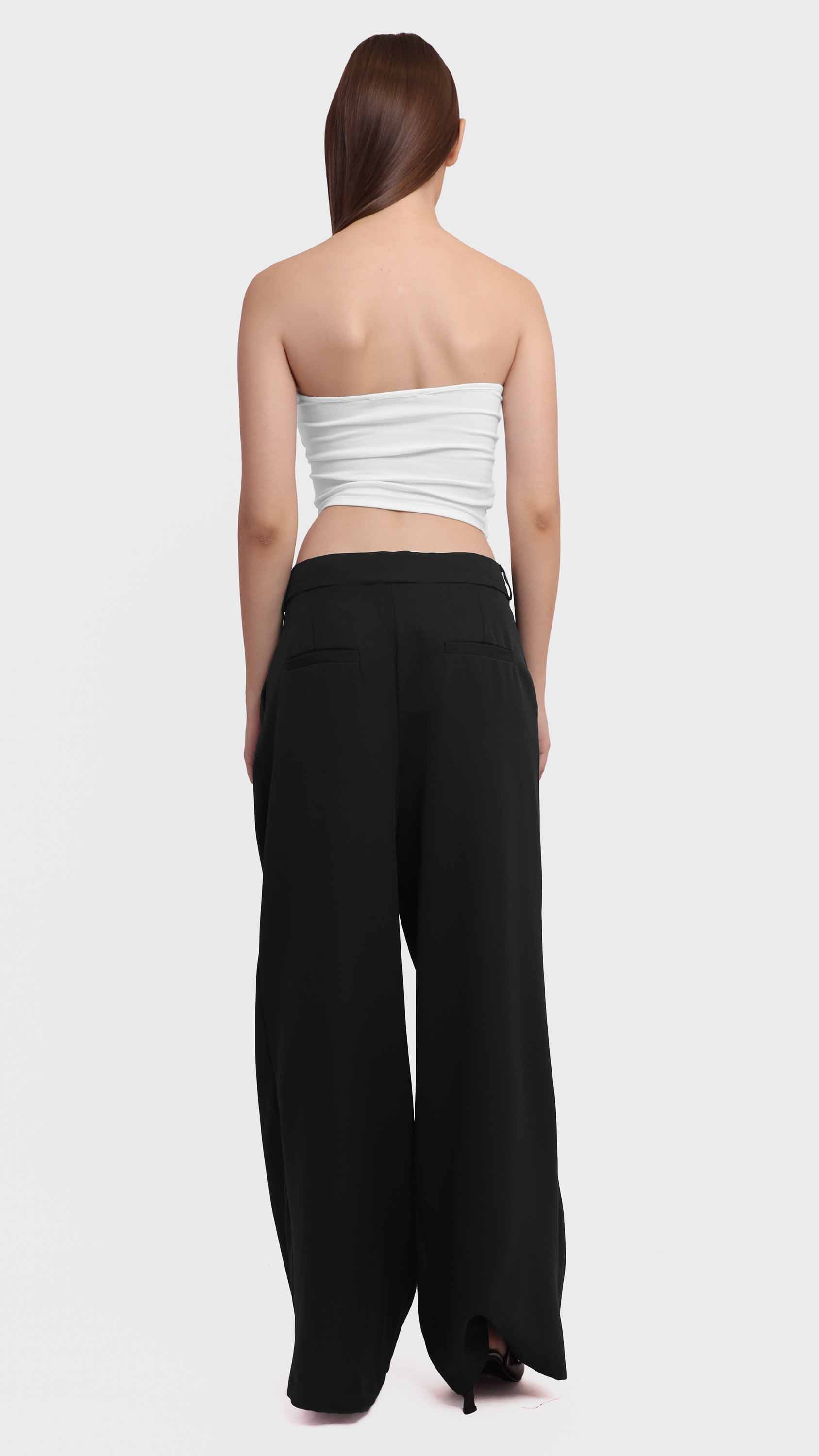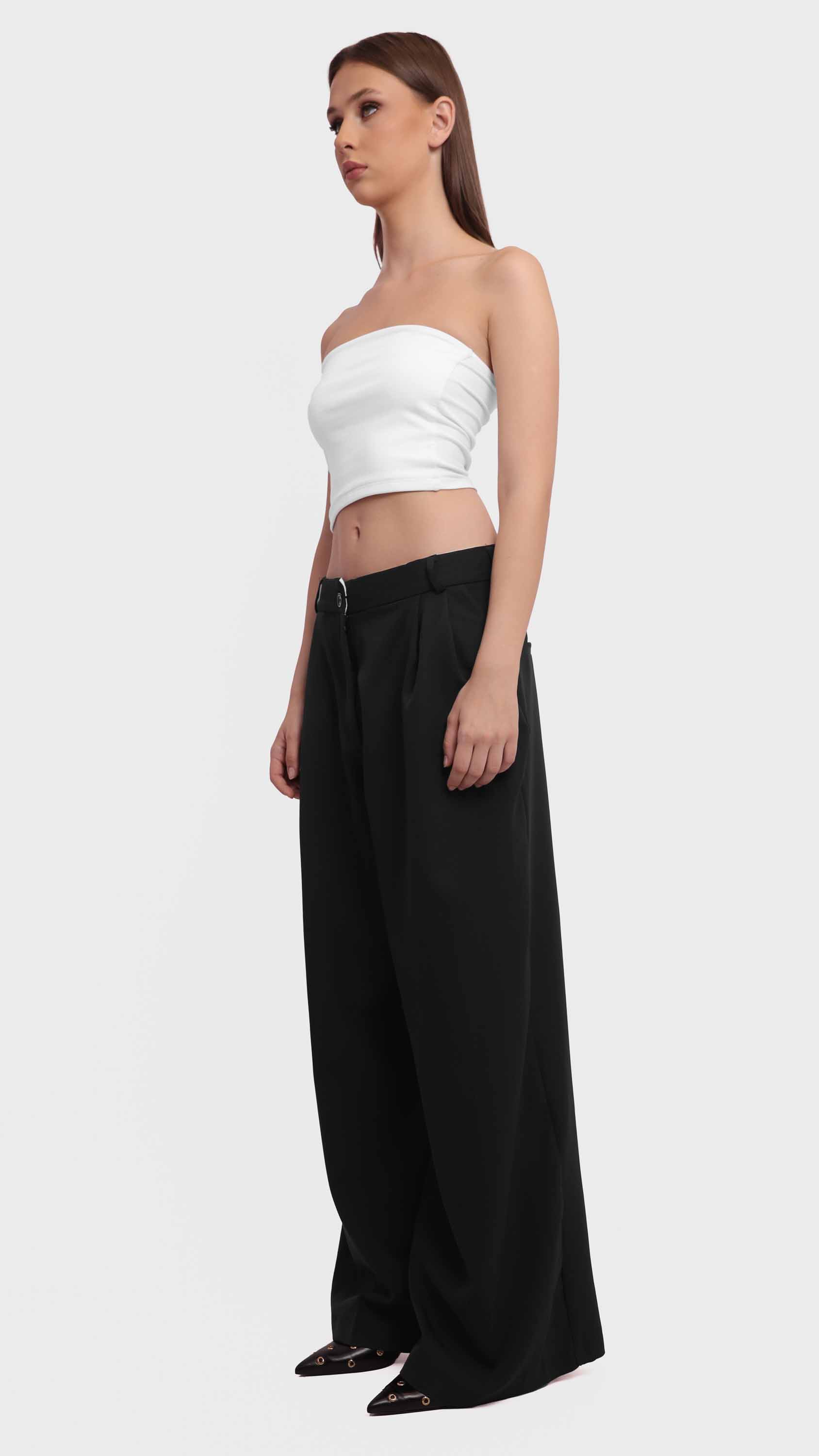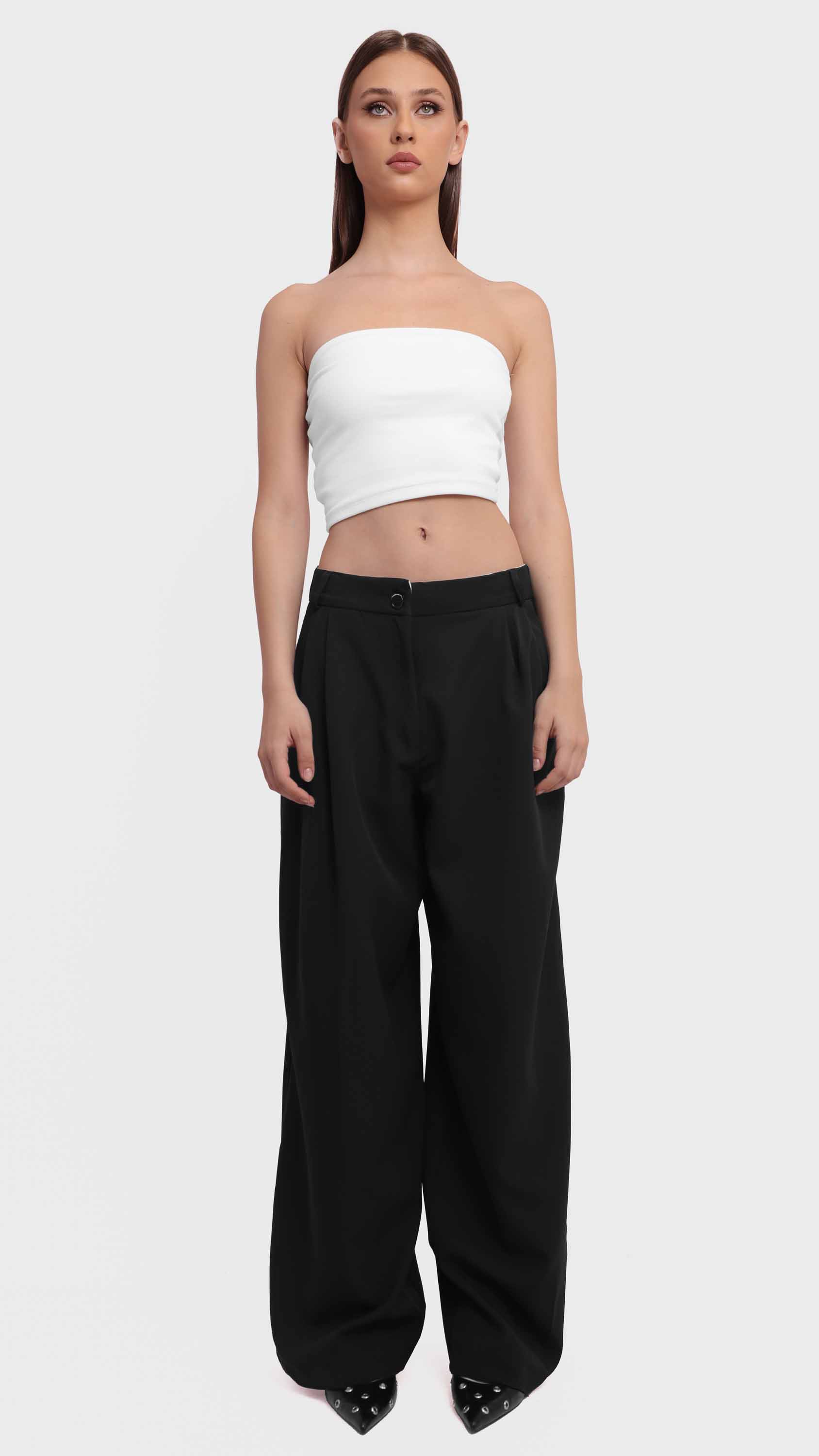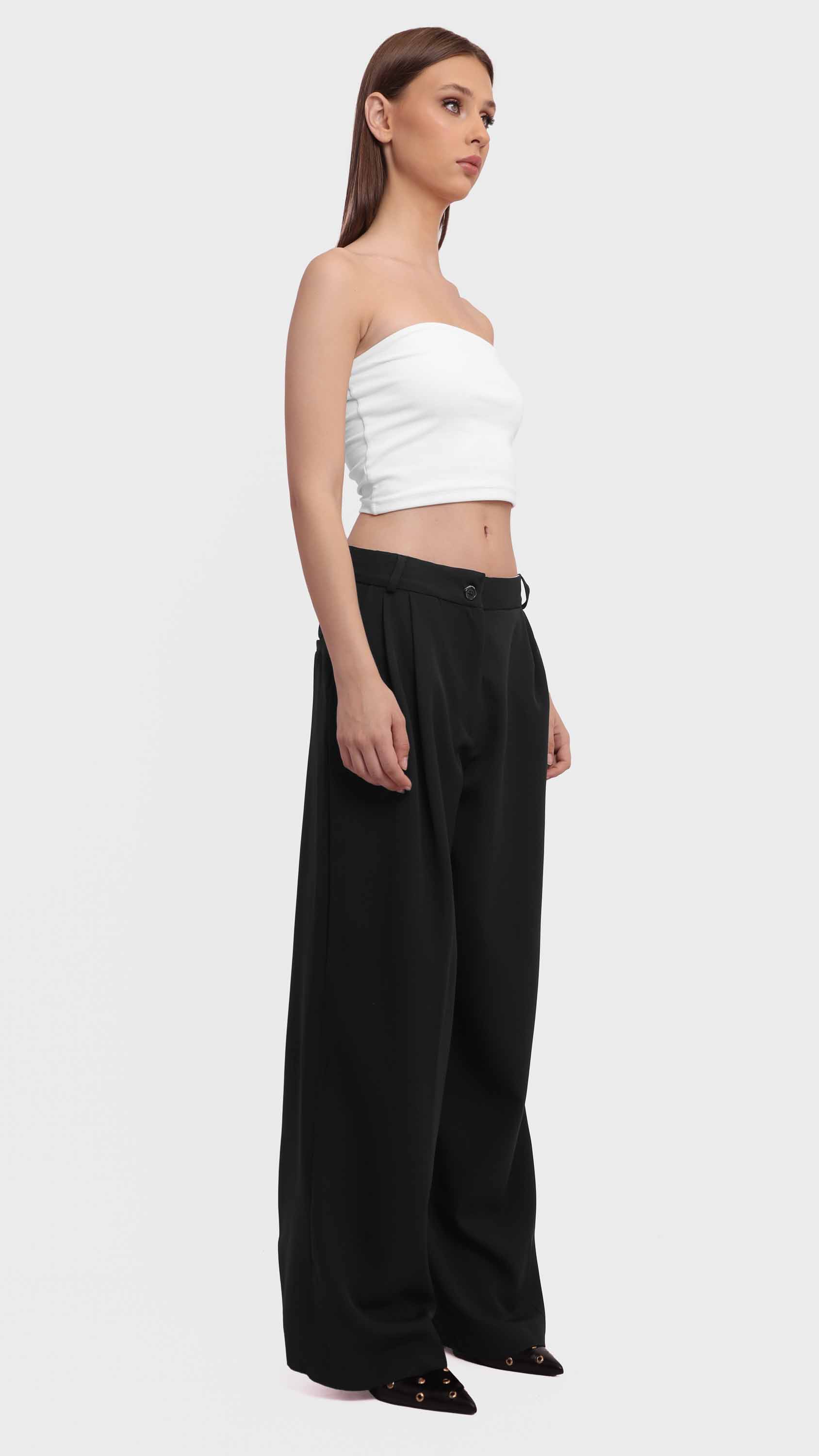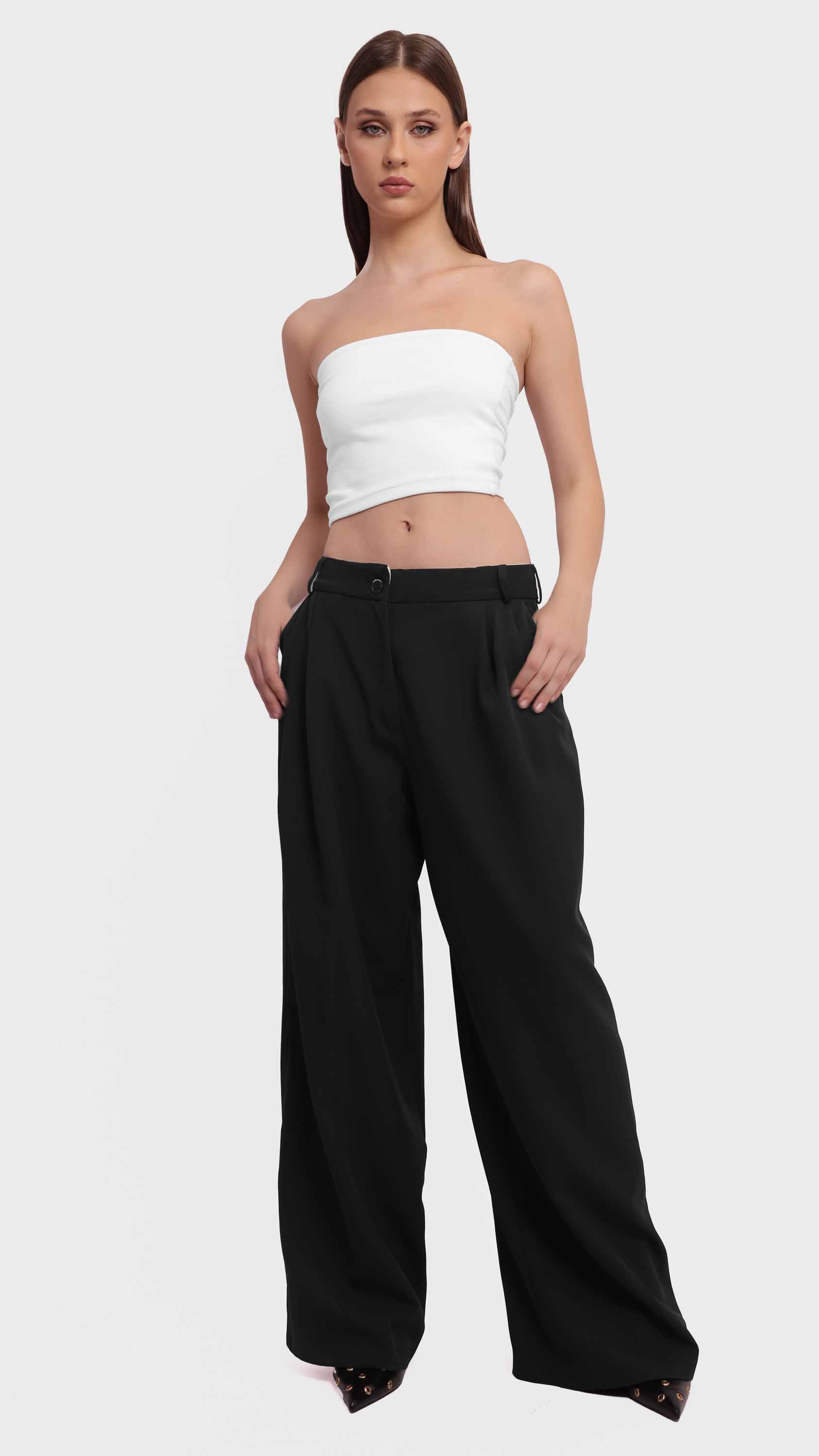 These straight-leg trousers feature classic front pleats and a tailored waistband for a polished look. The soft, textured fabric and minimal detailing make them a staple piece for office-ready outfits or elevated casual looks.
