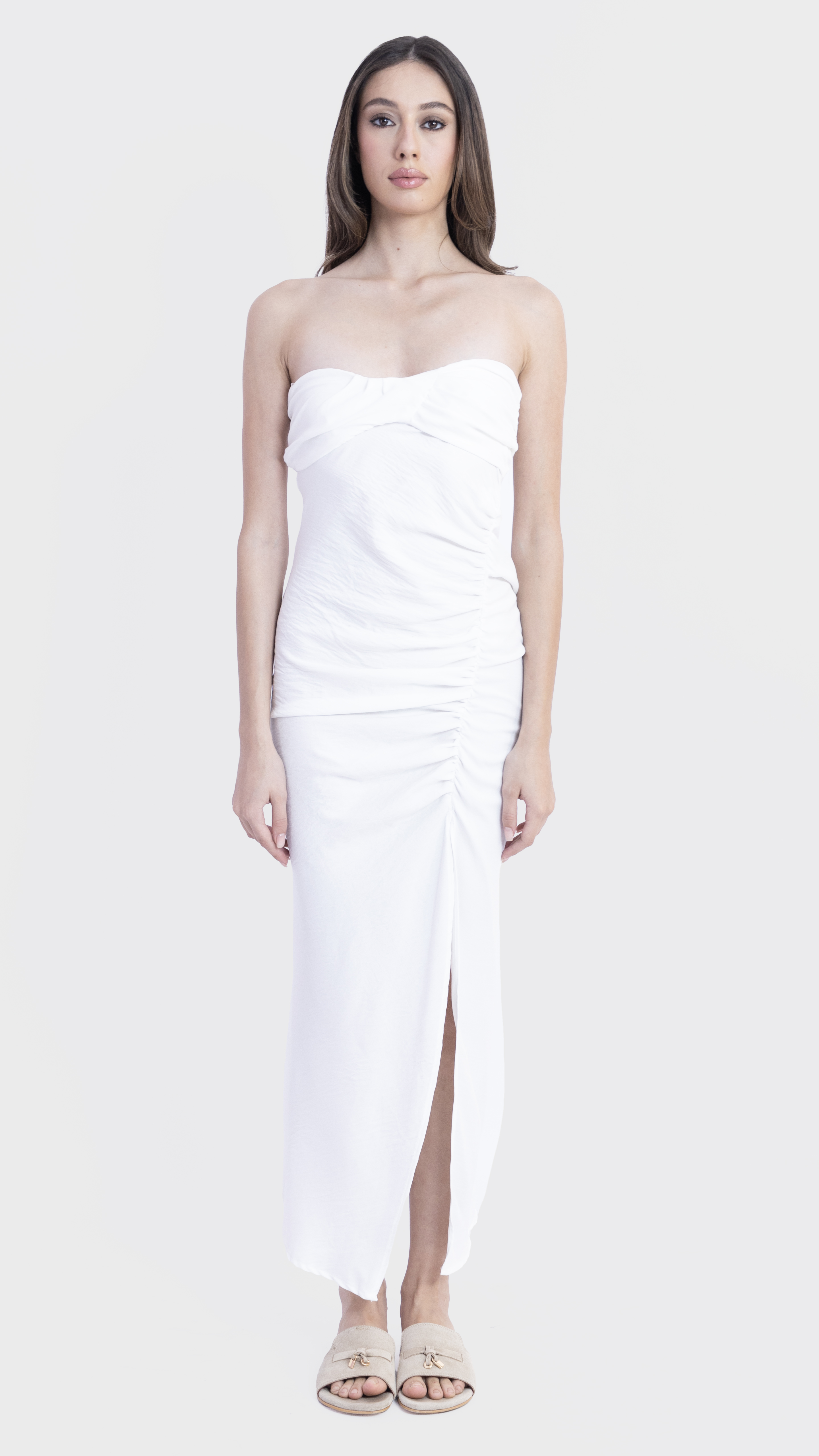 Make a statement in this ruched strapless maxi dress, designed with a sleek bodycon fit and soft stretch fabric for a confident, refined look.