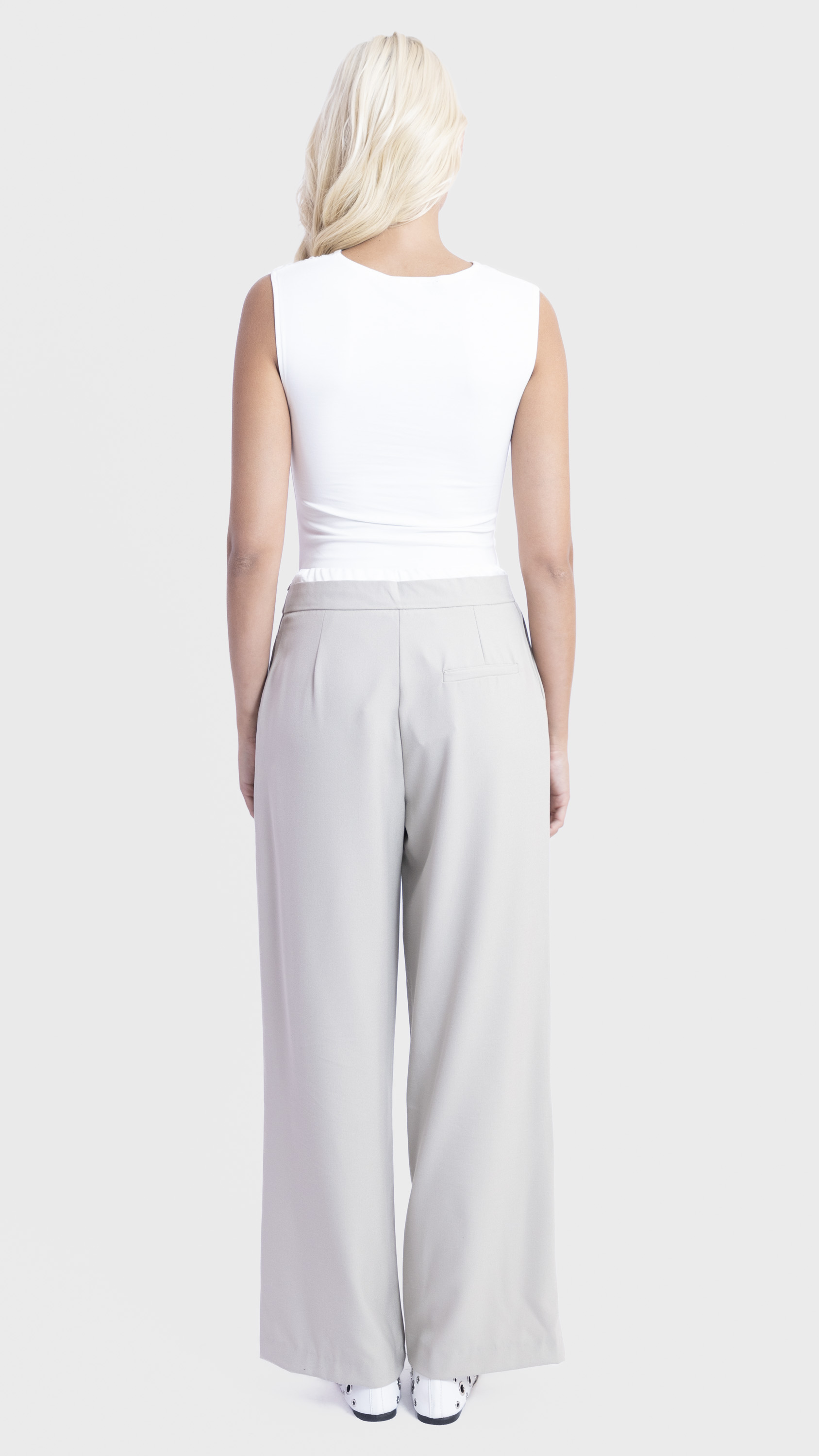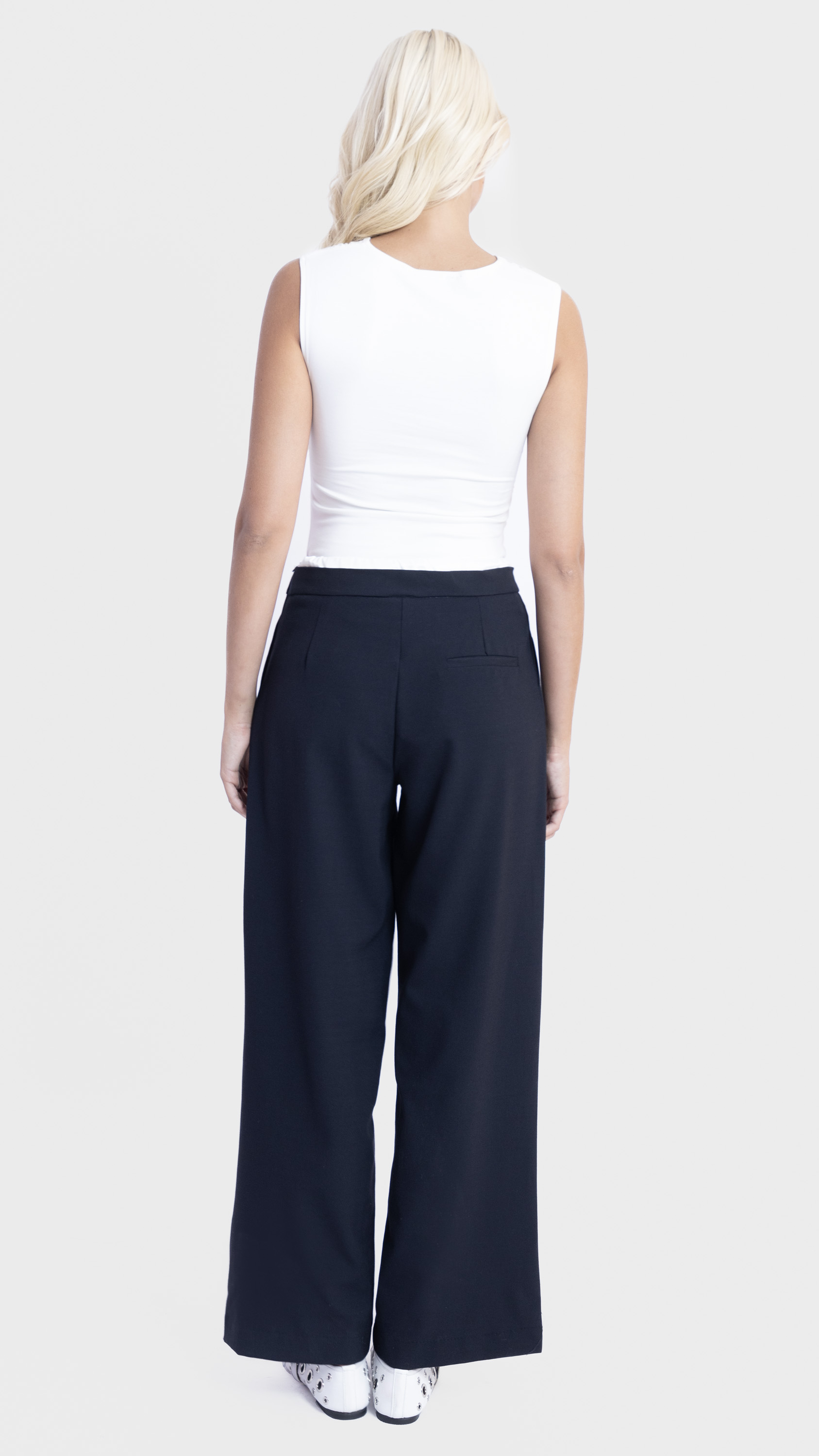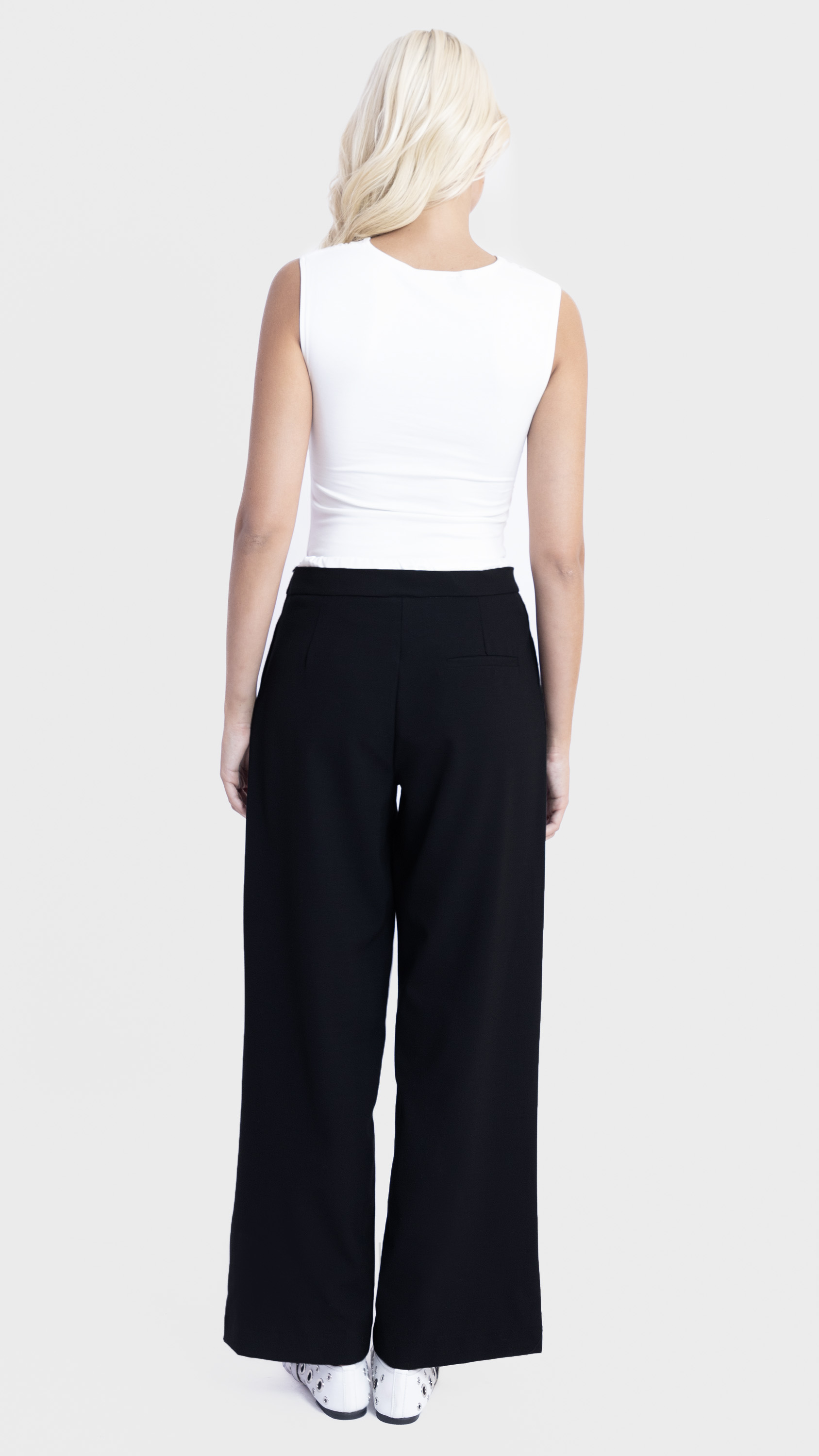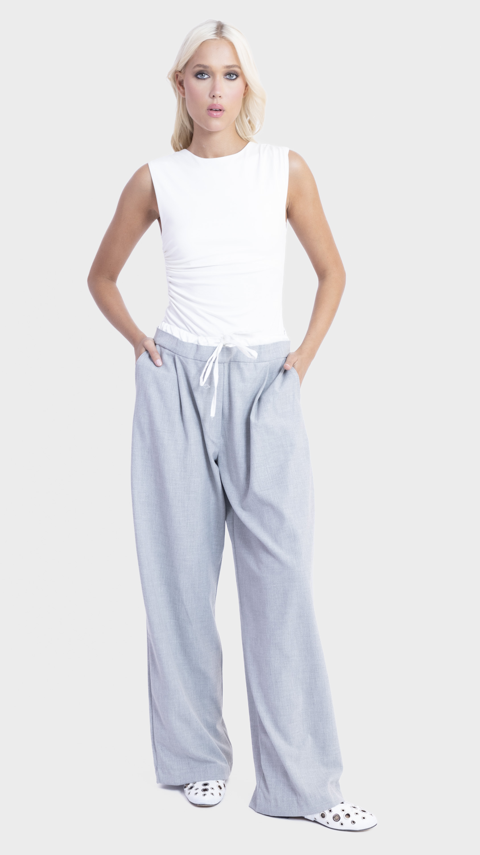 Blending sporty accents with everyday comfort, these wide-leg pants feature a contrast-trimmed elastic waistband and matching side piping. The relaxed fit and soft fabric make them perfect for casual styling, travel, or laid-back days.