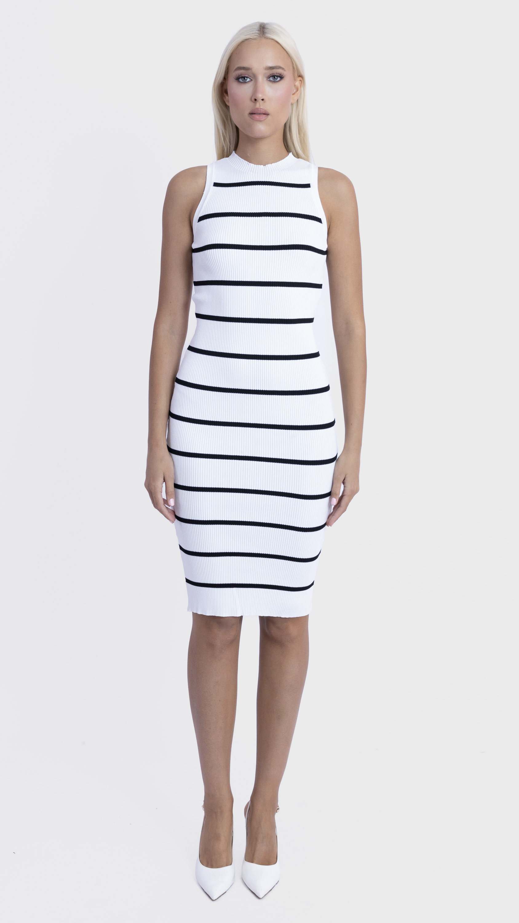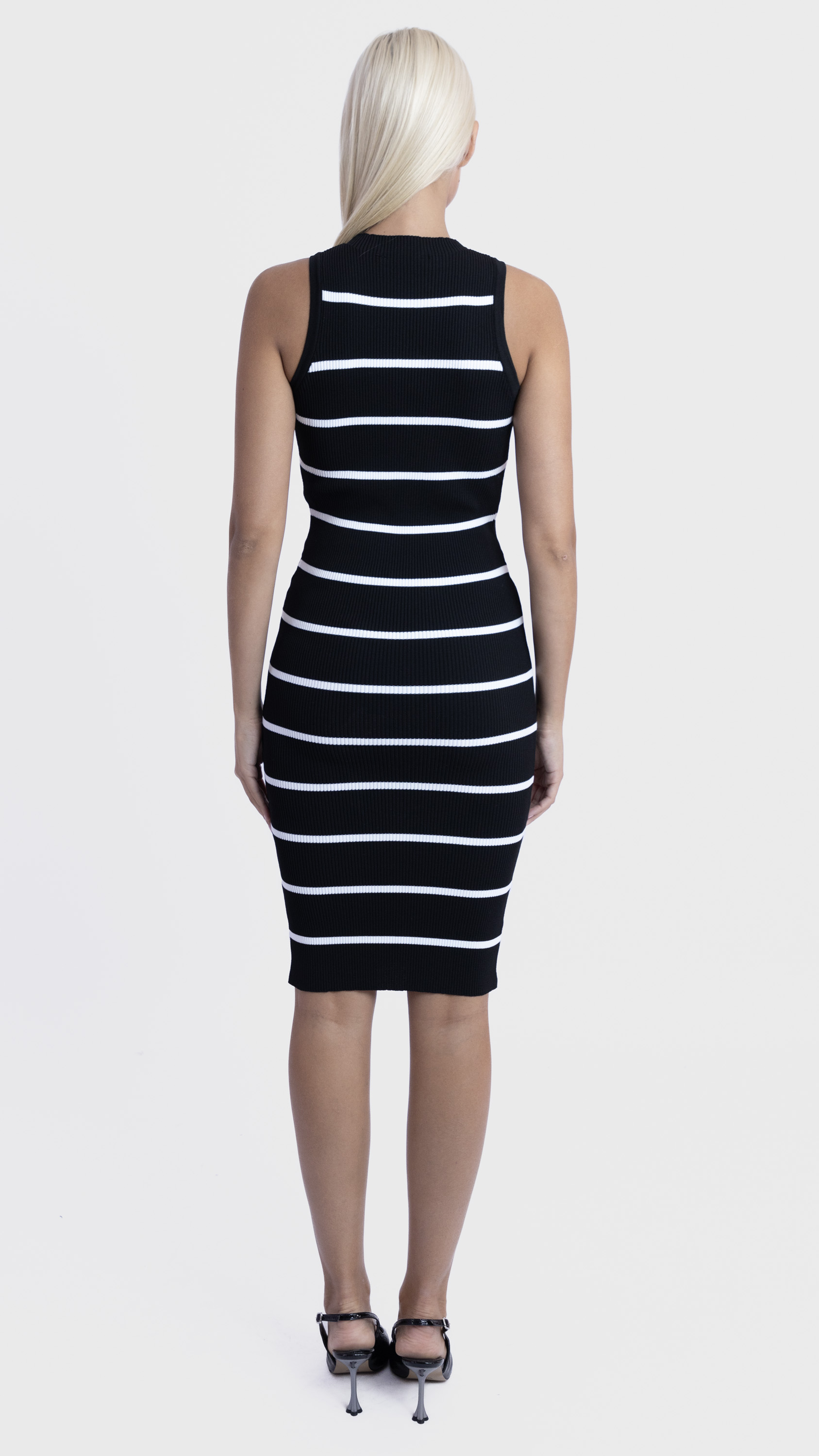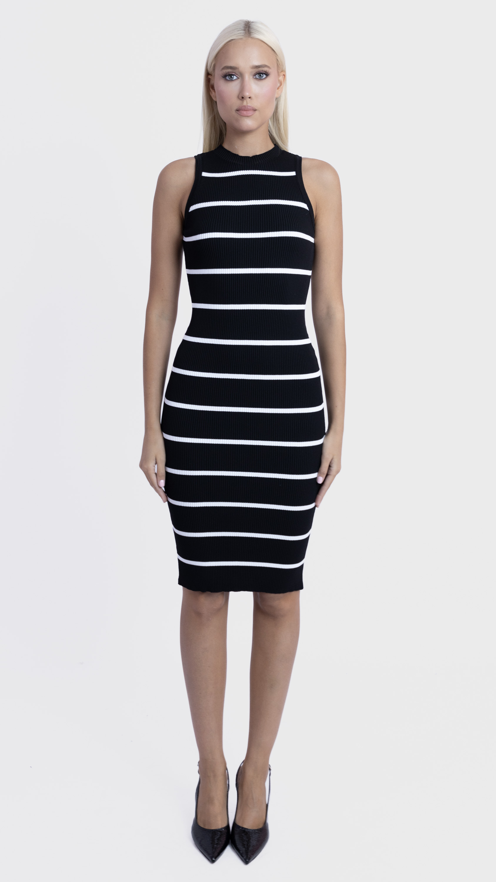 Add a touch of nautical charm to your wardrobe with this sleeveless ribbed knit dress, featuring bold black stripes and a flattering slim fit — perfect for stylish summer days.