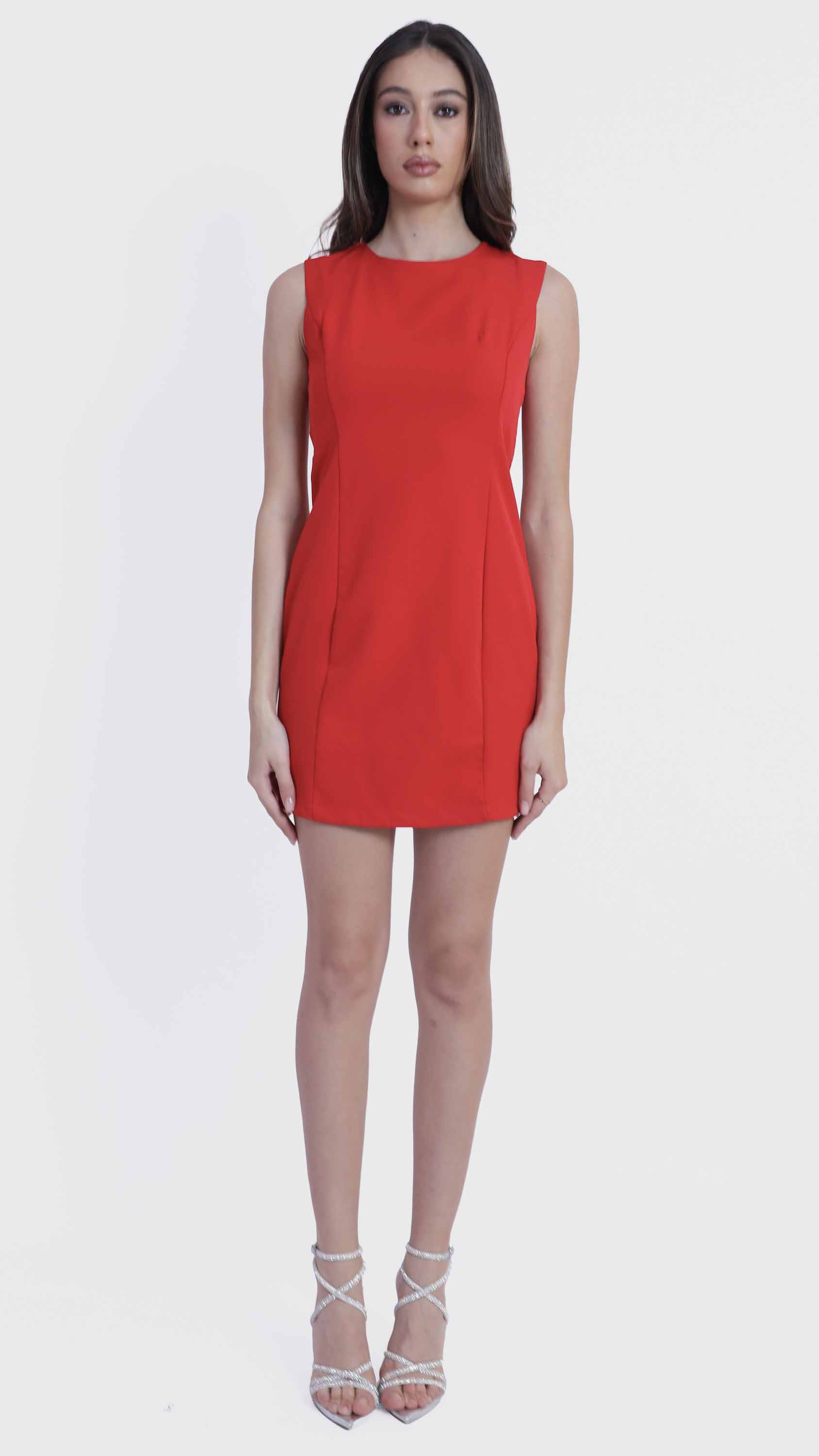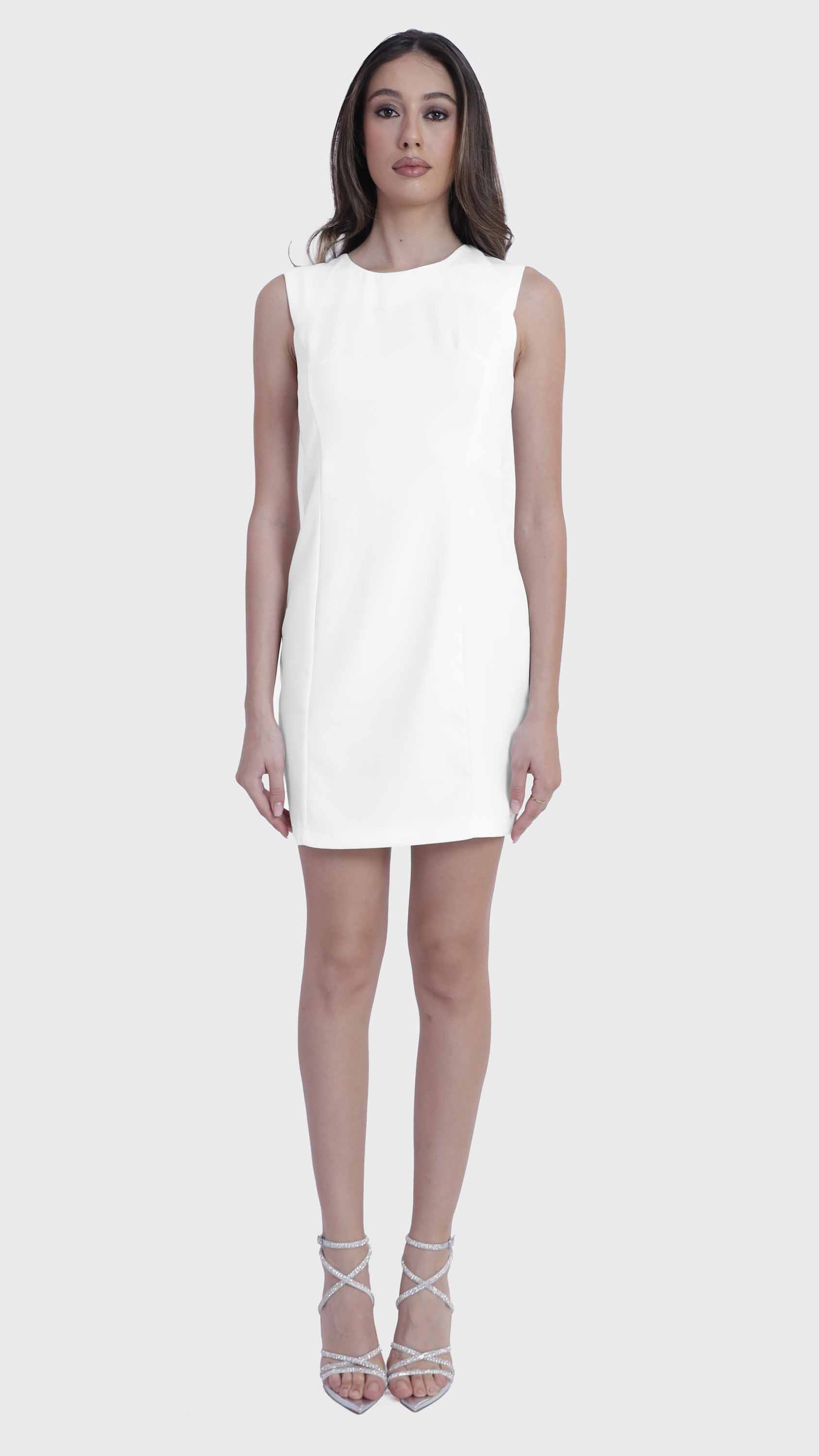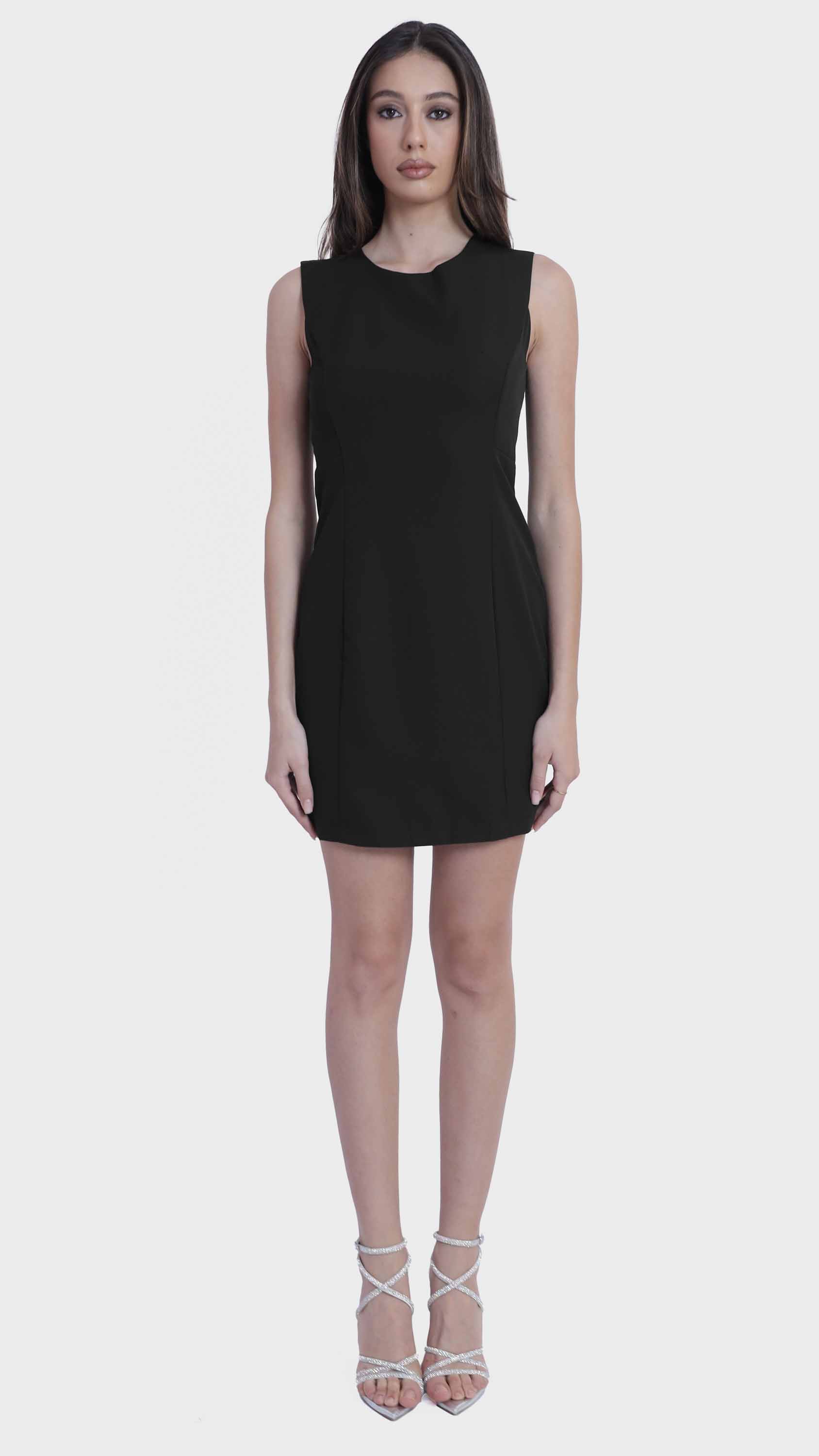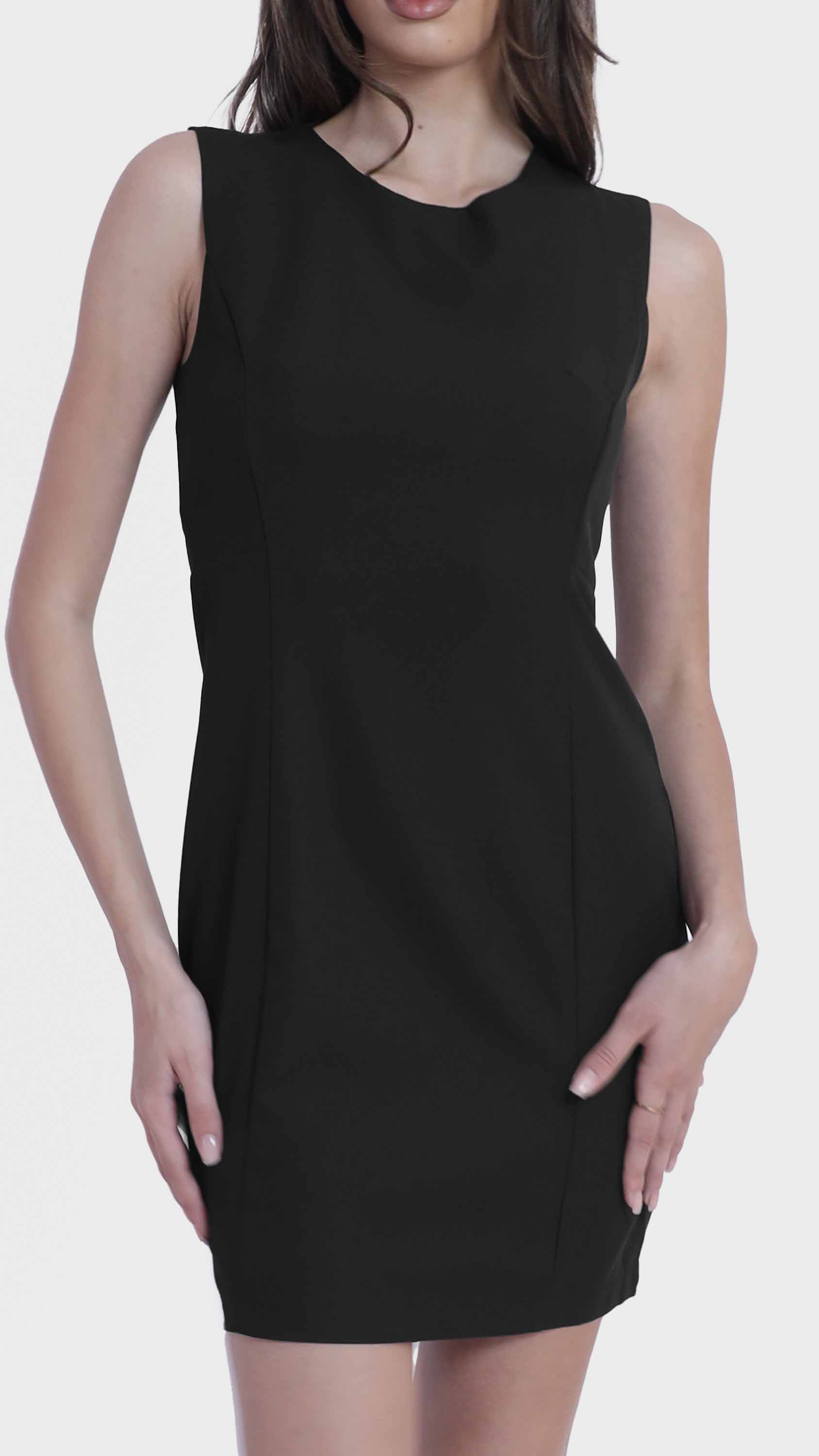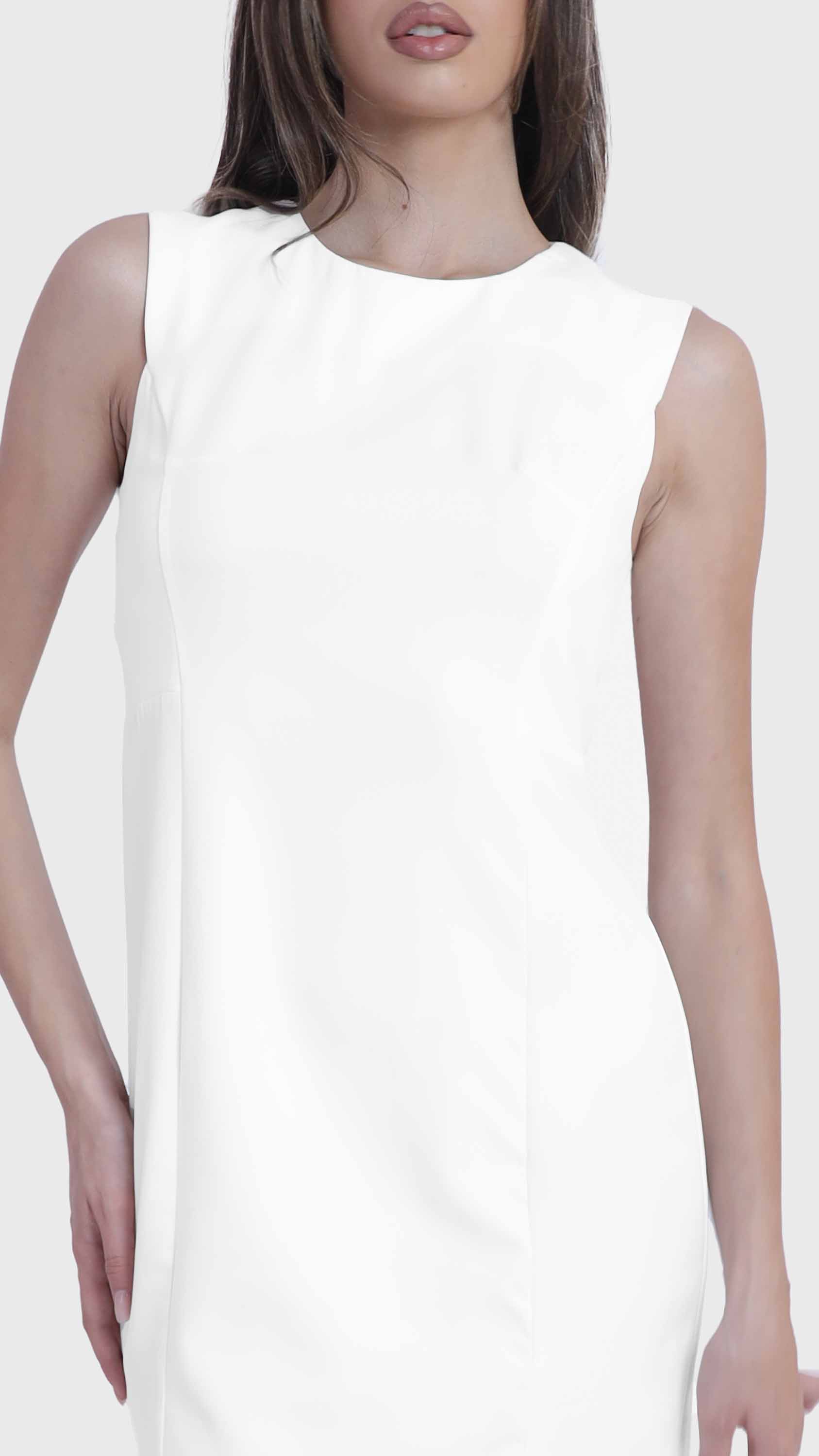 Refined simplicity defines this sleek sleeveless shift dress. Crafted from smooth, structured fabric, it features a minimalist silhouette with tailored seams that offer a subtle, flattering shape. The round neckline, concealed back zipper, and knee-length hem create a clean, polished look perfect for everything from office days to elegant evenings. Effortlessly versatile, it can be styled alone or layered with jackets and accessories.