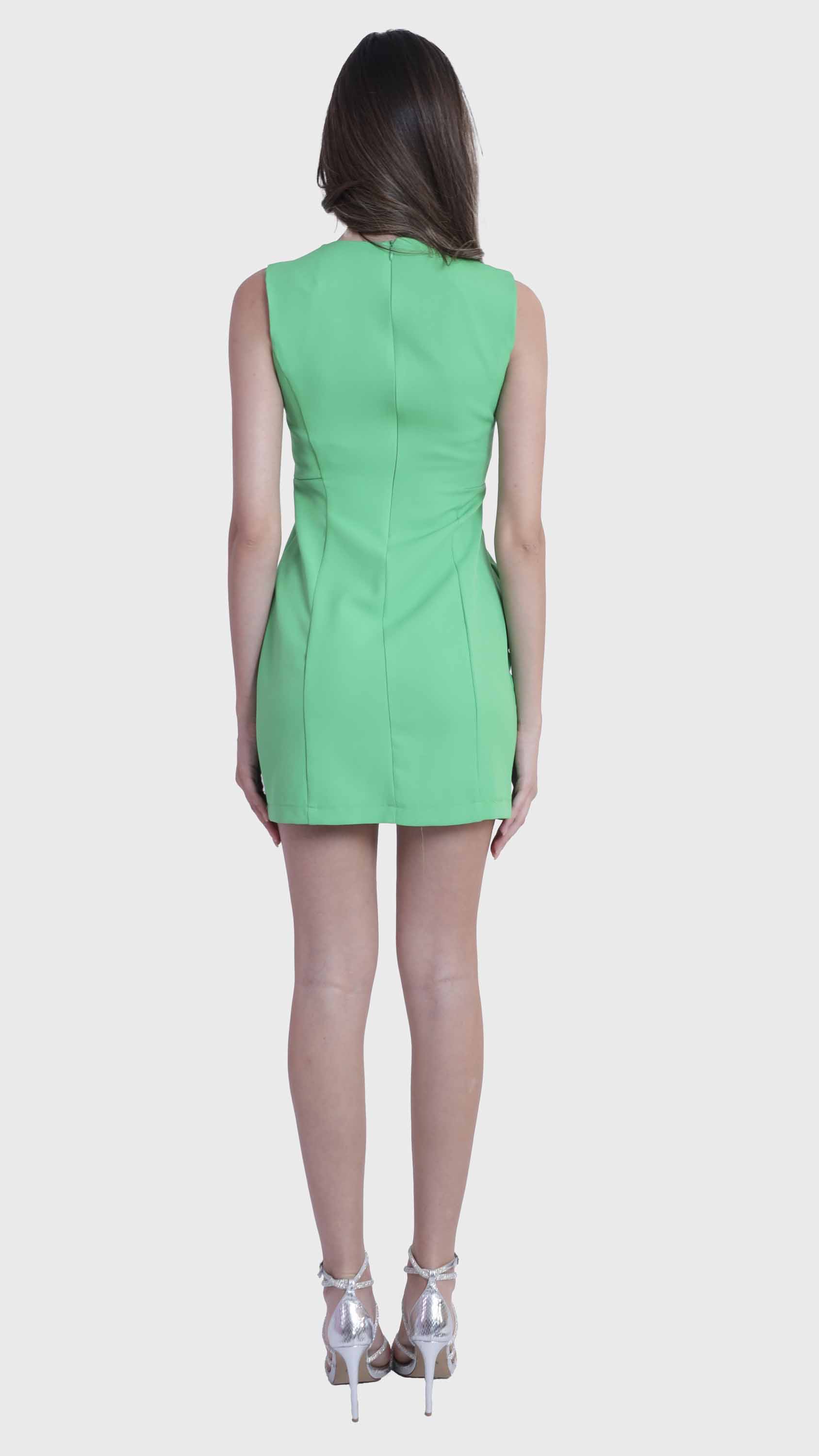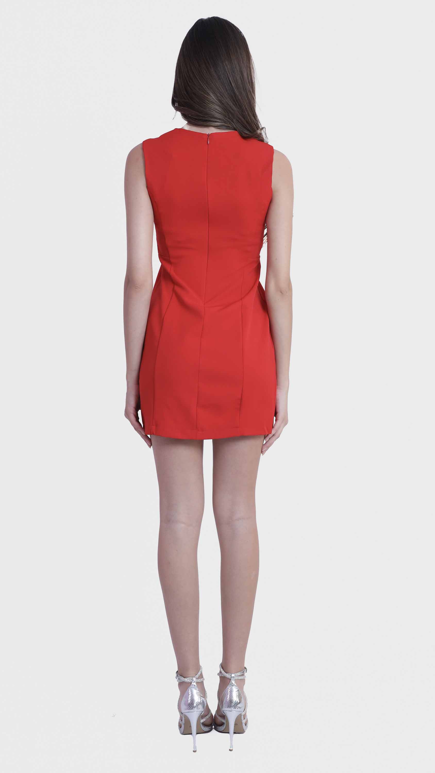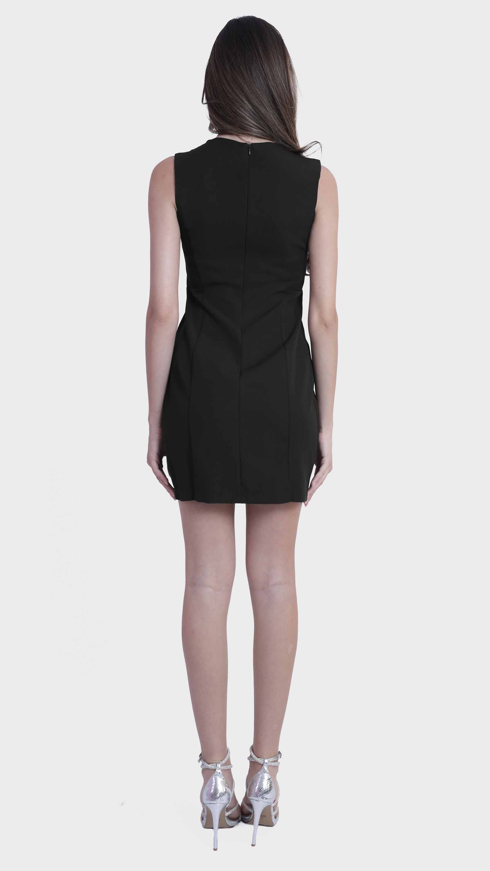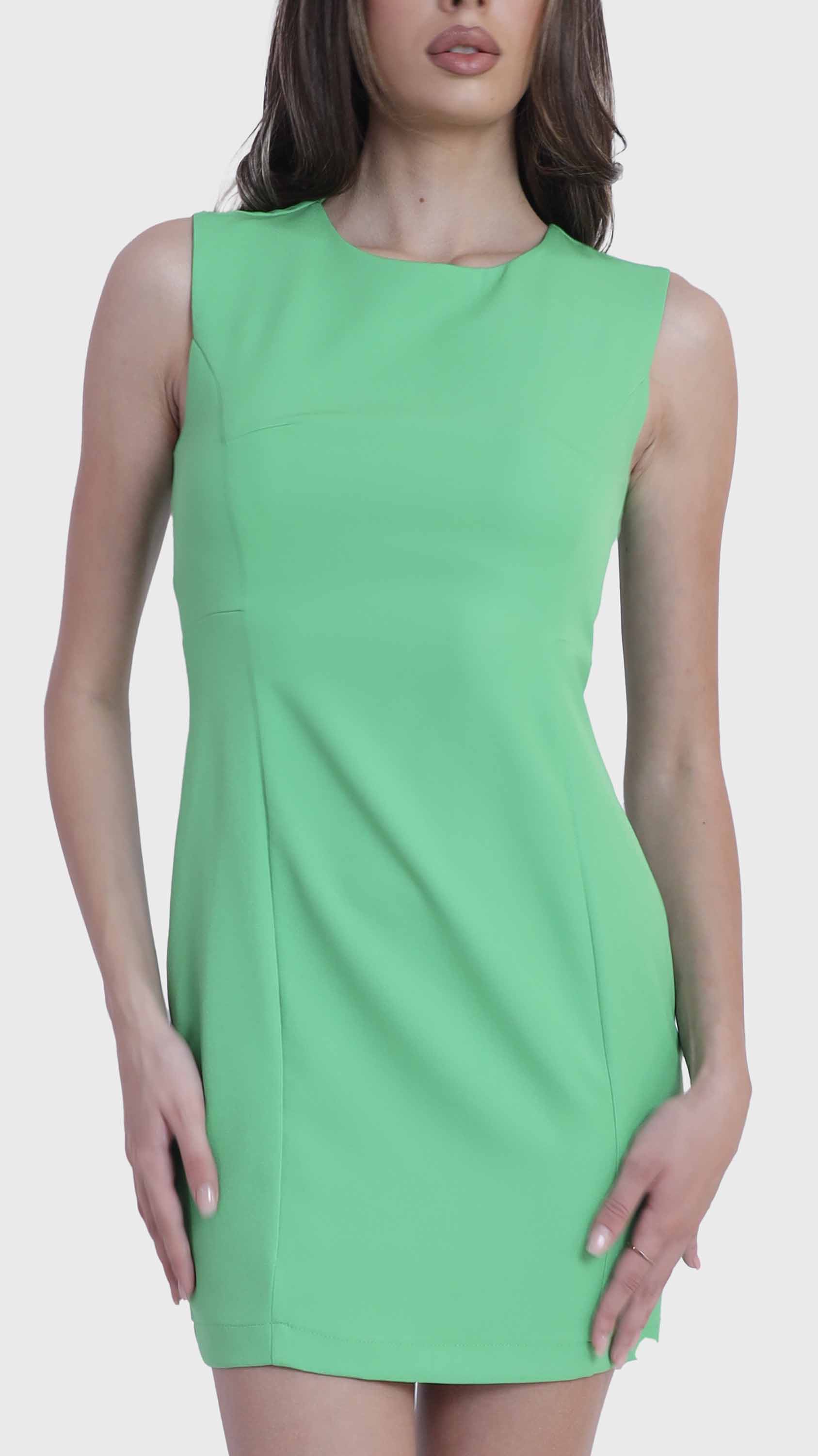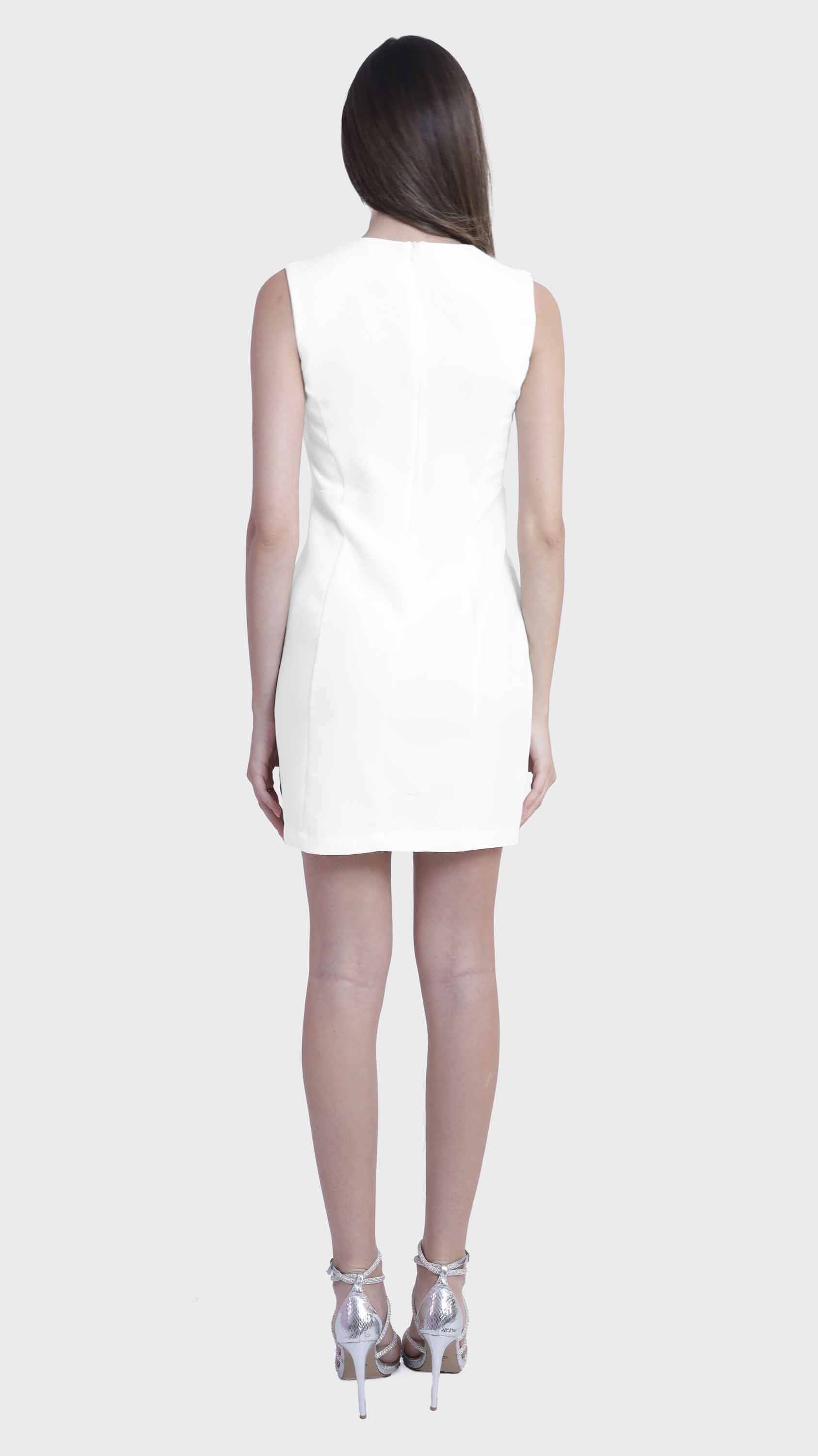 Refined simplicity defines this sleek sleeveless shift dress. Crafted from smooth, structured fabric, it features a minimalist silhouette with tailored seams that offer a subtle, flattering shape. The round neckline, concealed back zipper, and knee-length hem create a clean, polished look perfect for everything from office days to elegant evenings. Effortlessly versatile, it can be styled alone or layered with jackets and accessories.