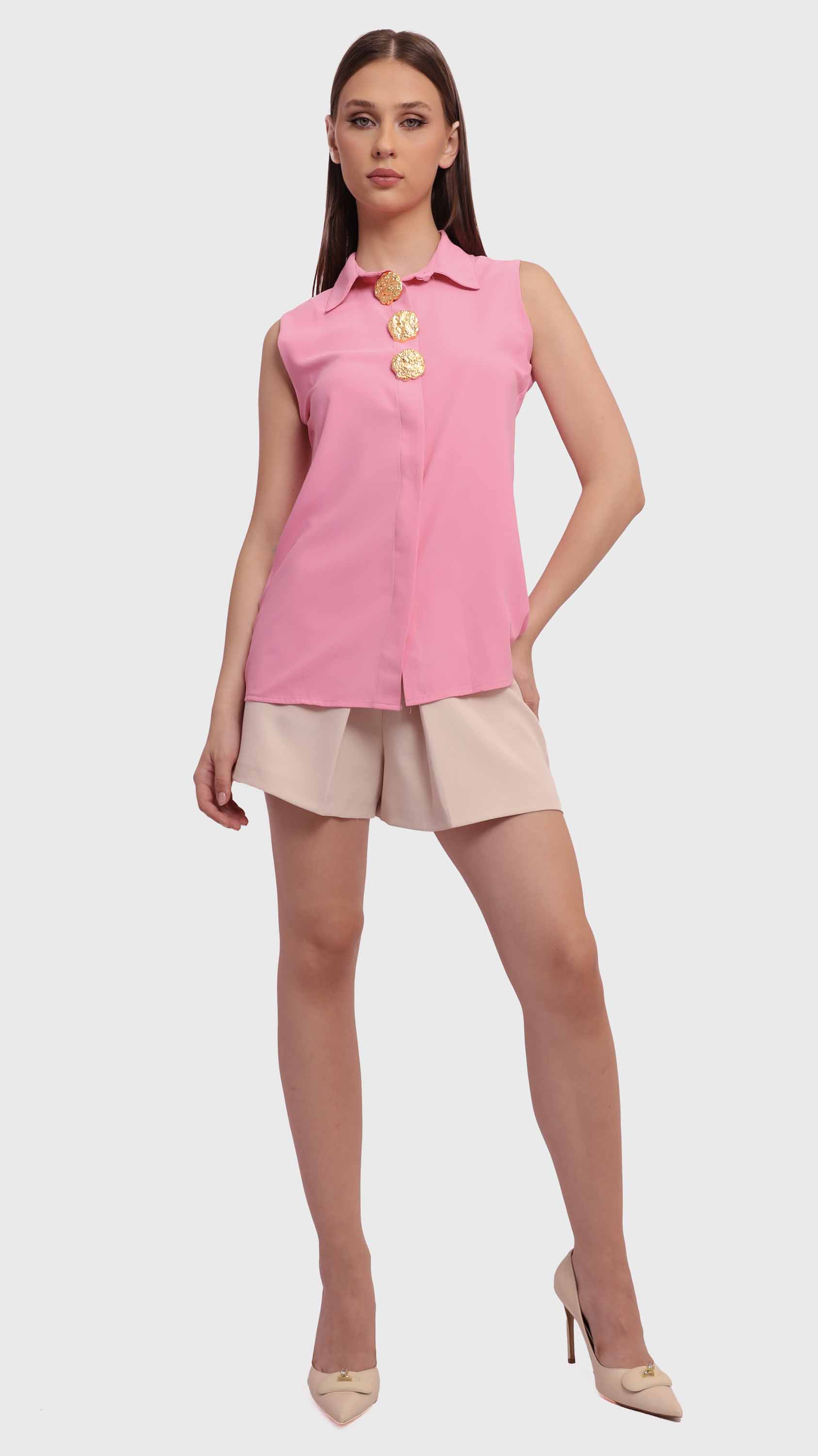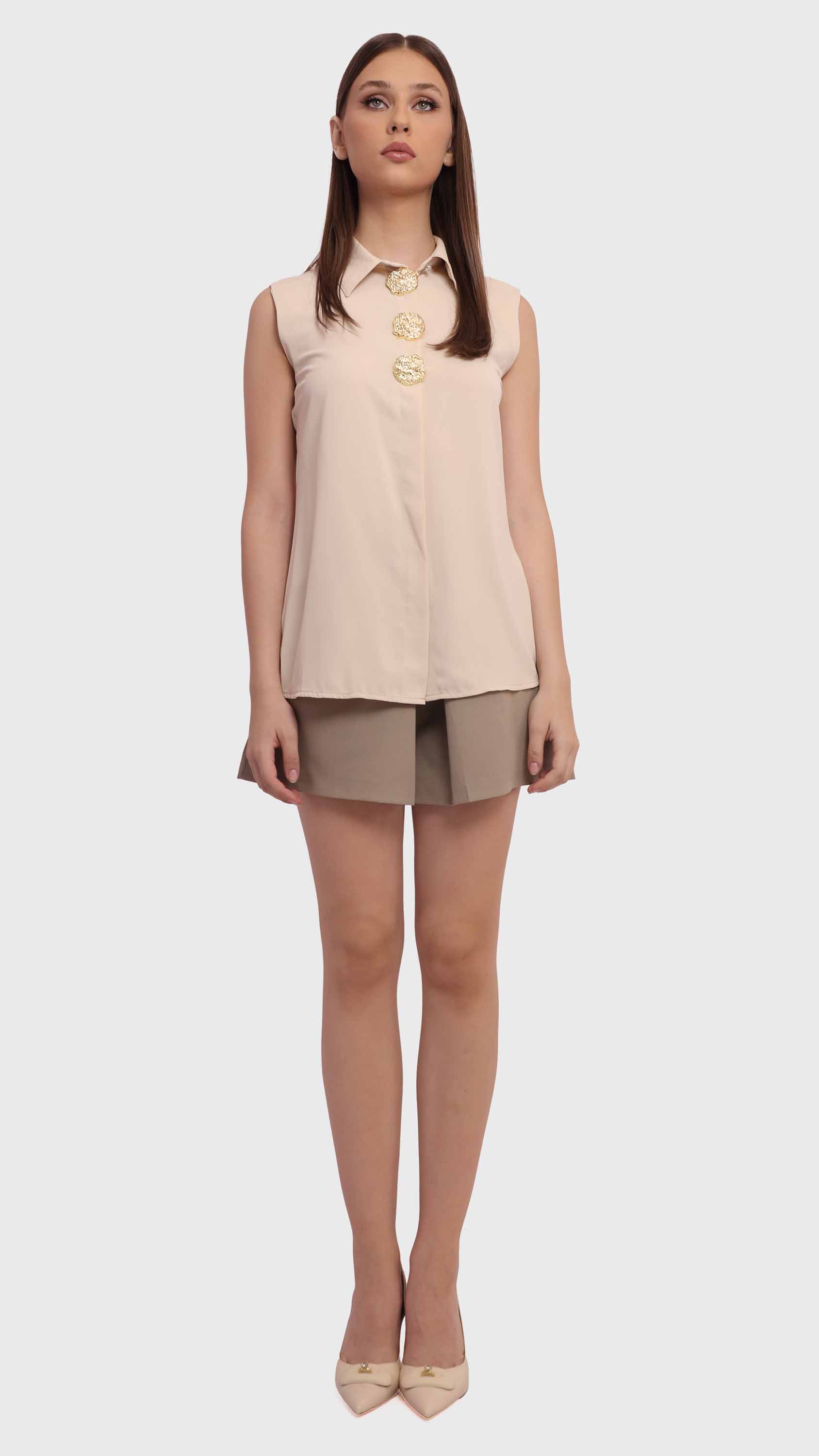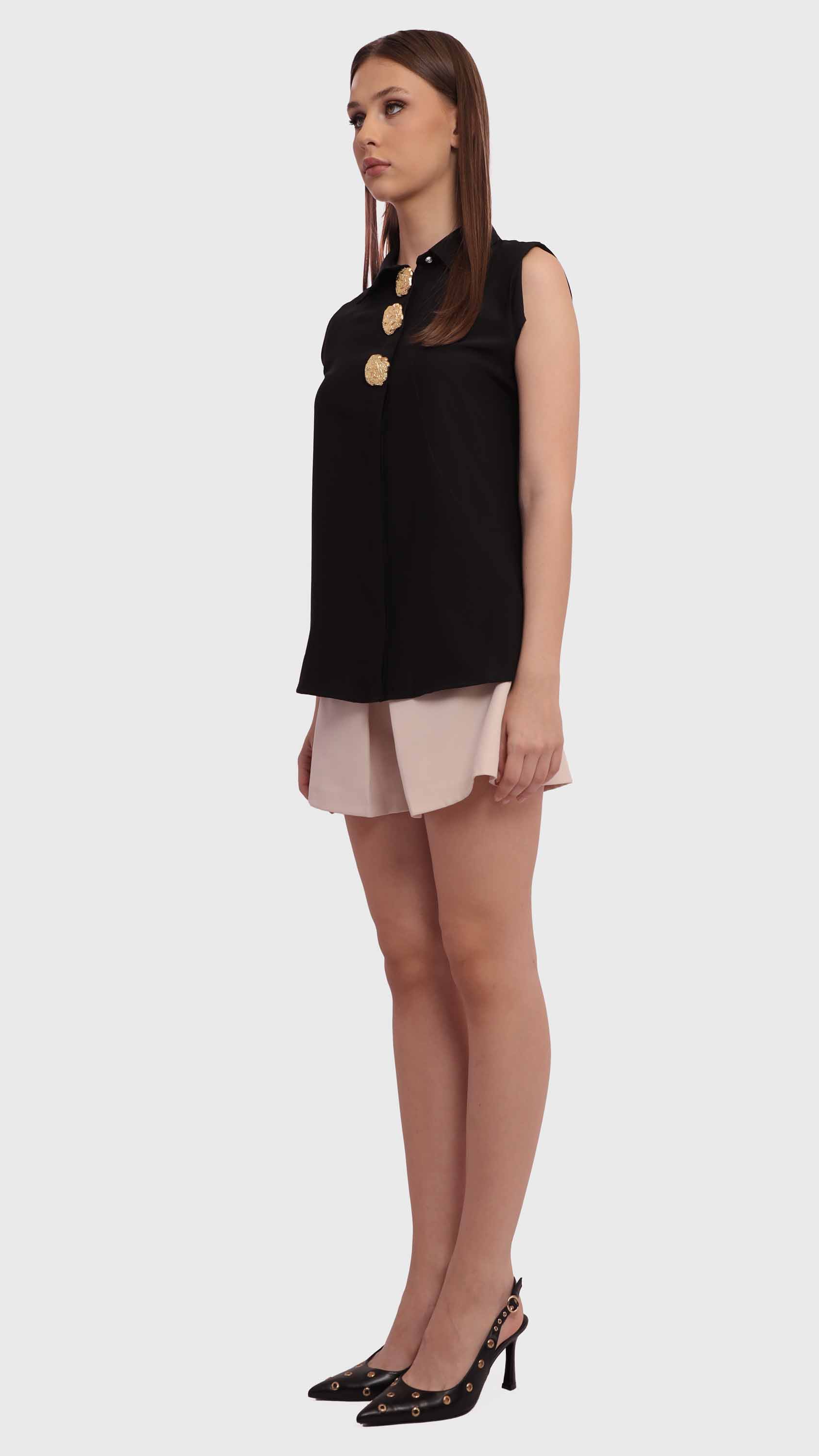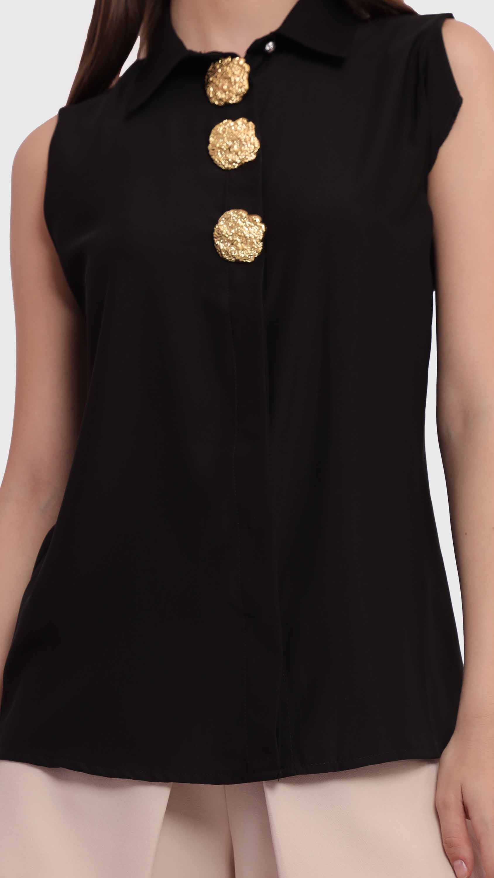 This sleeveless blouse features a bold leopard print with elegant shoulder folds and a wide collar. The front is accented by three textured gold-tone buttons for a statement finish. Crafted from silky, lightweight fabric with a flared hem, it blends fierce style with comfort—perfect for both day and night looks.