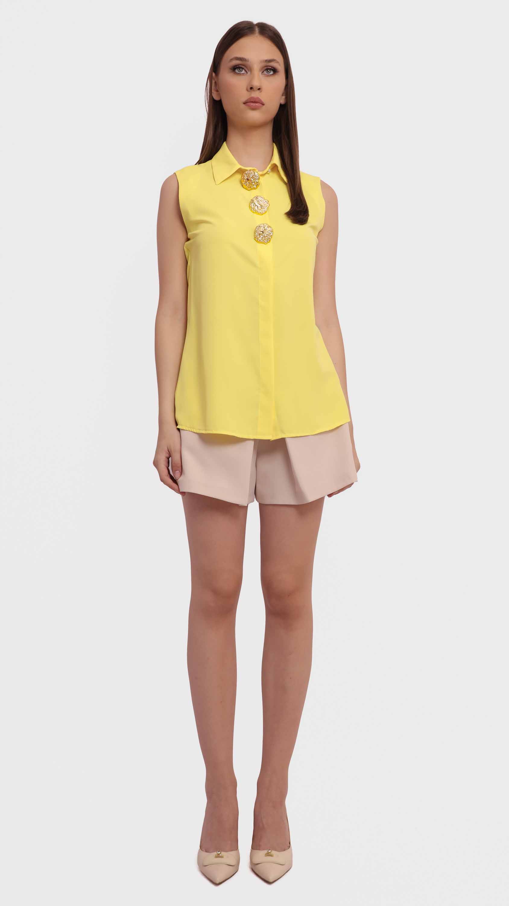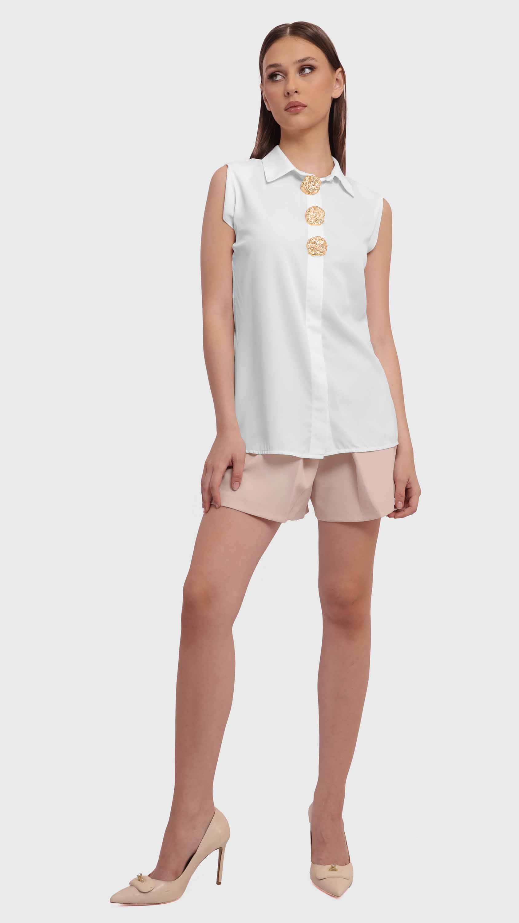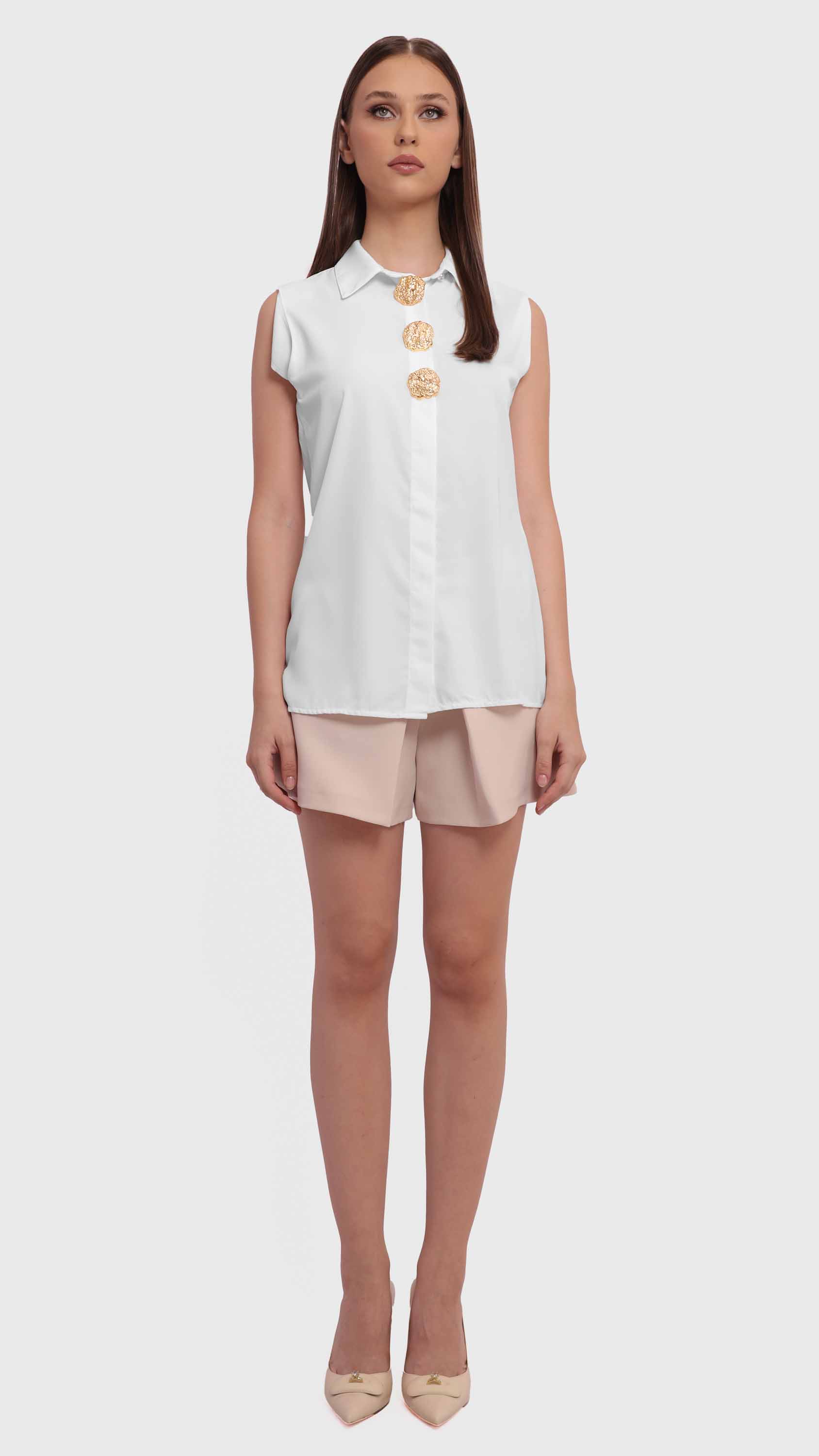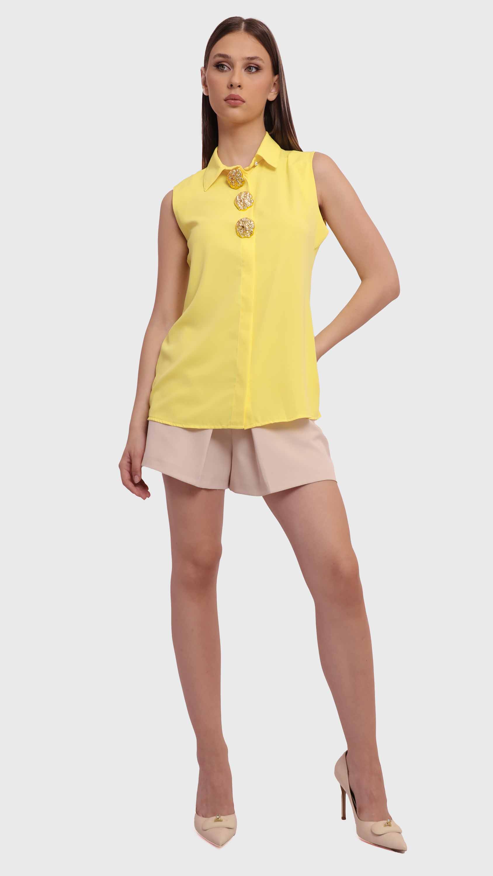 This sleeveless blouse features a bold leopard print with elegant shoulder folds and a wide collar. The front is accented by three textured gold-tone buttons for a statement finish. Crafted from silky, lightweight fabric with a flared hem, it blends fierce style with comfort—perfect for both day and night looks.