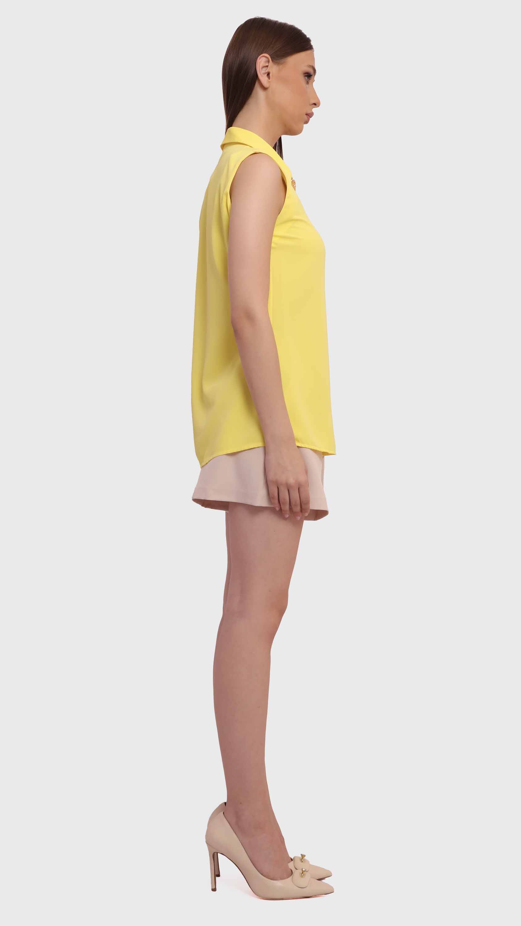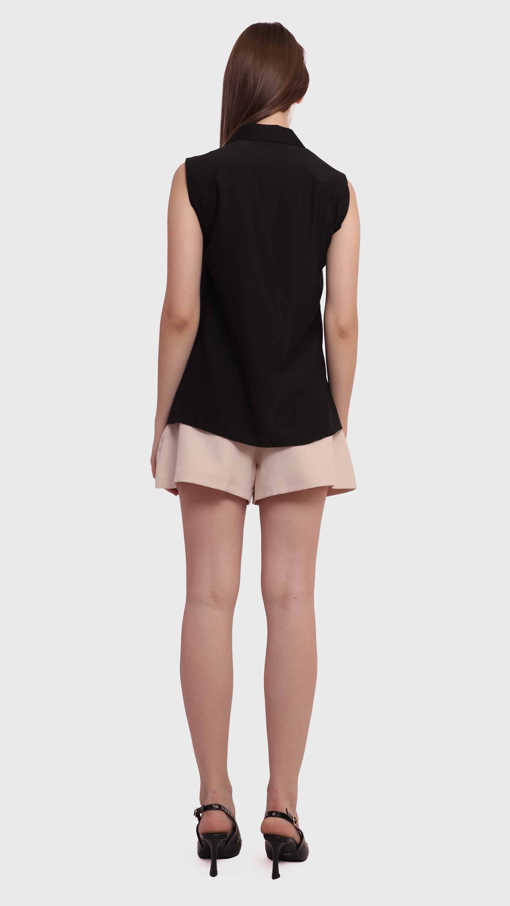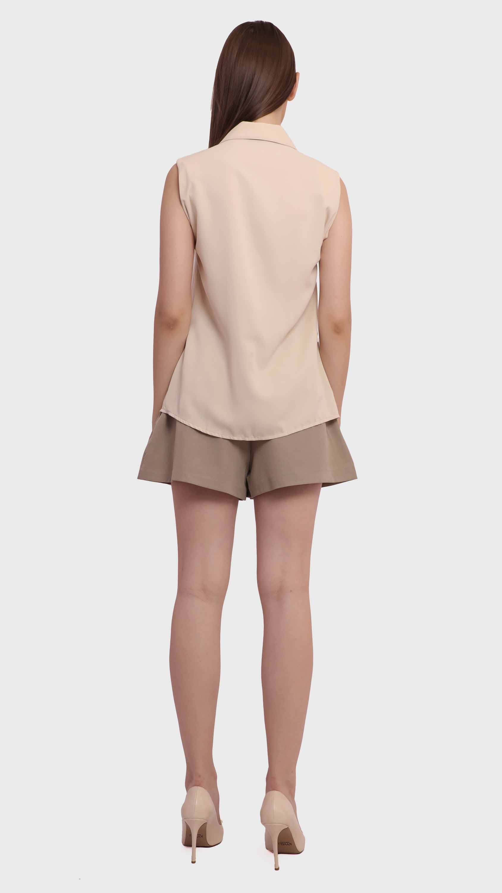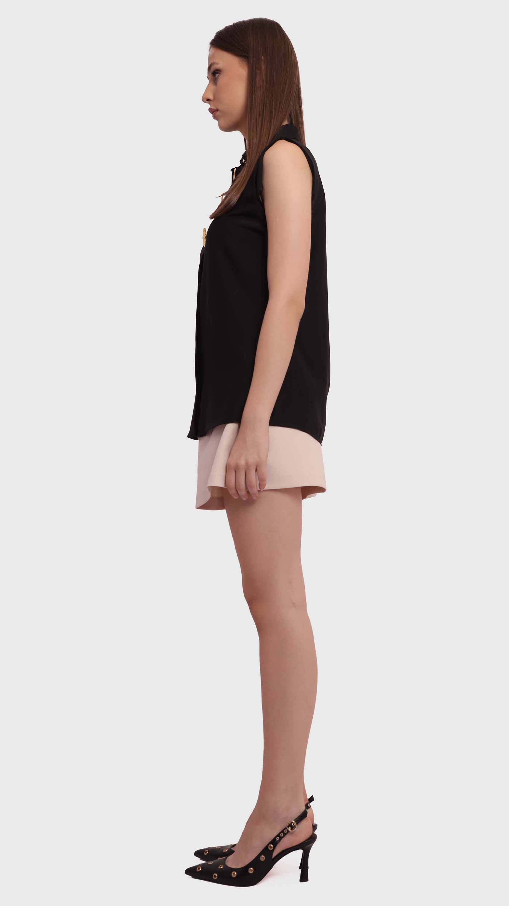 This sleeveless blouse features a bold leopard print with elegant shoulder folds and a wide collar. The front is accented by three textured gold-tone buttons for a statement finish. Crafted from silky, lightweight fabric with a flared hem, it blends fierce style with comfort—perfect for both day and night looks.