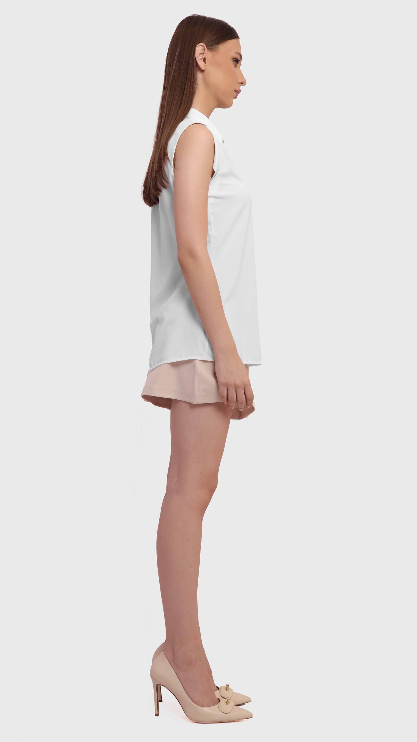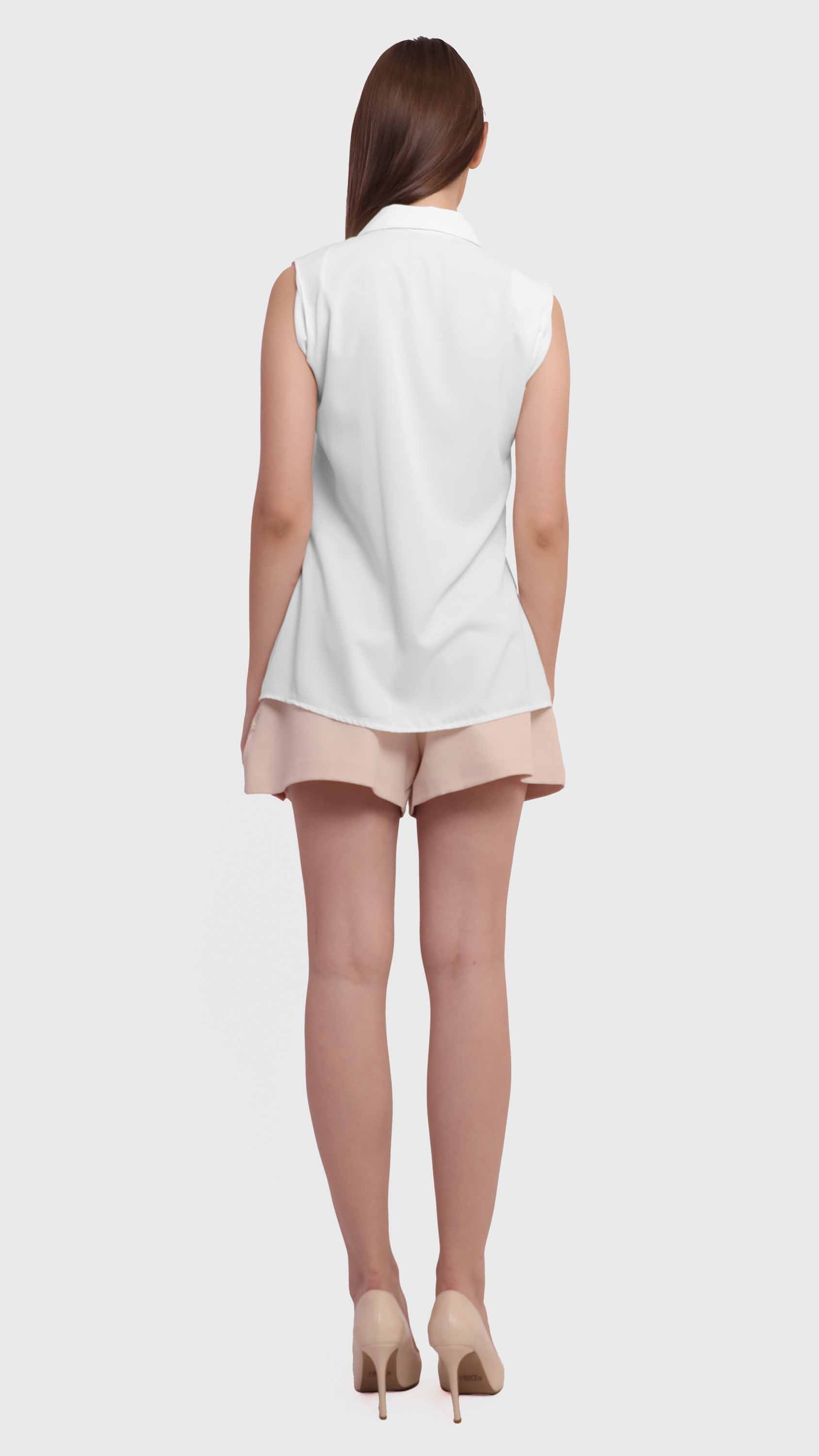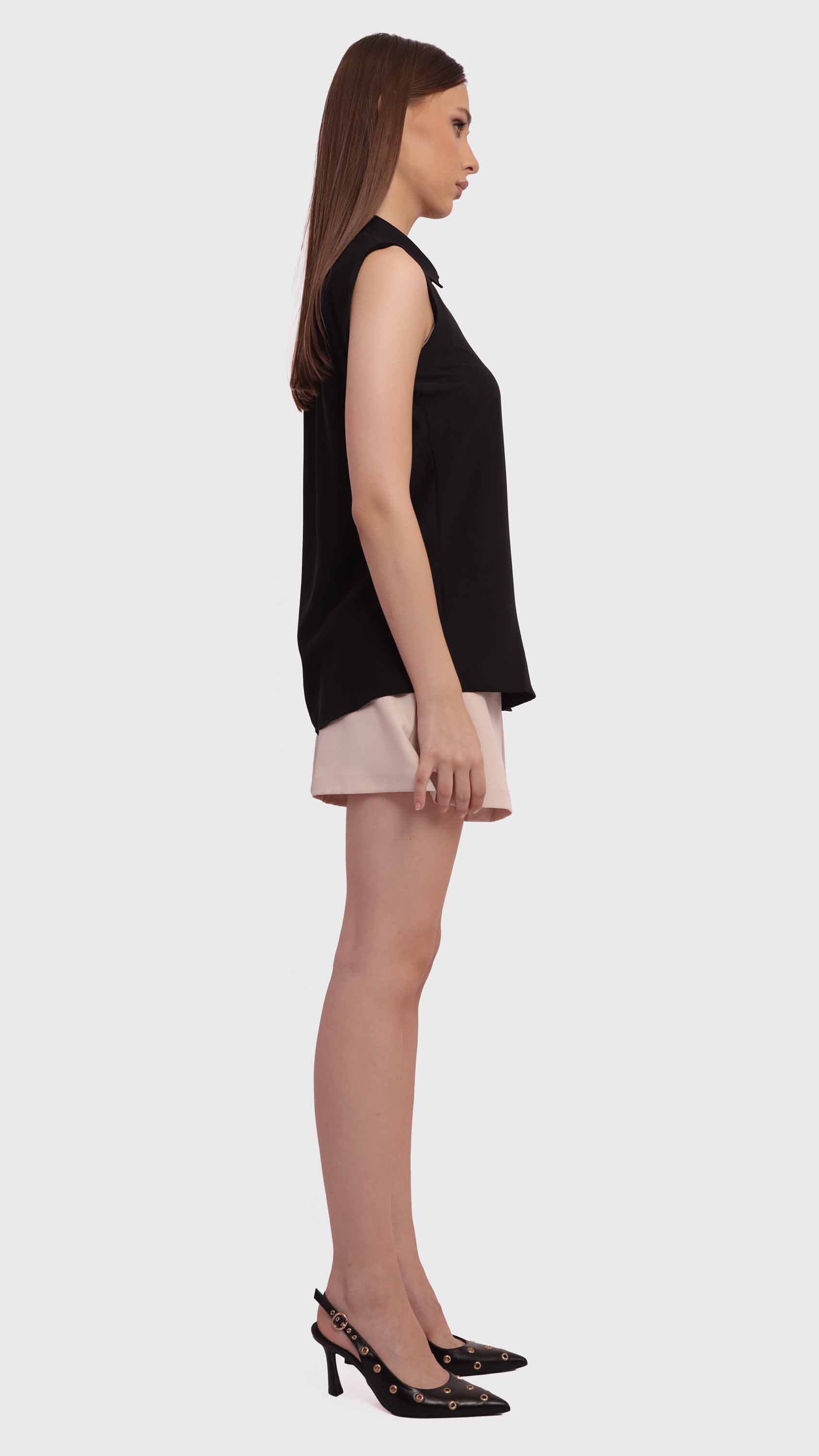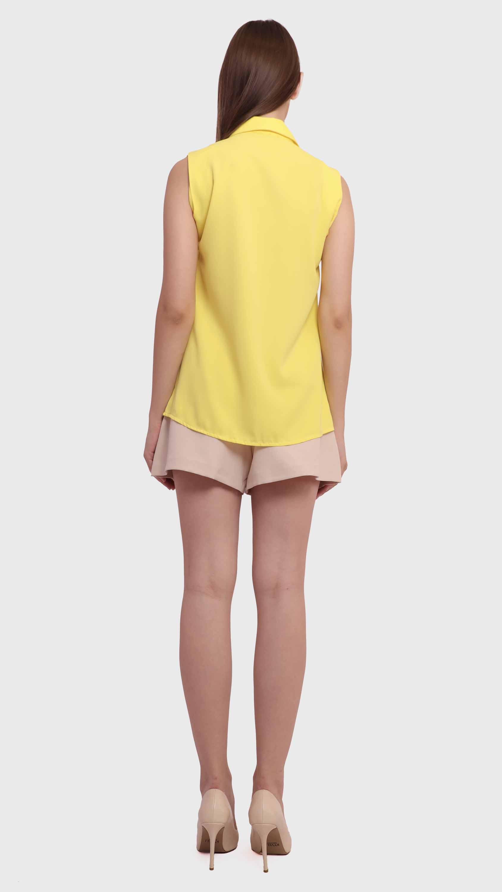 This sleeveless blouse features a bold leopard print with elegant shoulder folds and a wide collar. The front is accented by three textured gold-tone buttons for a statement finish. Crafted from silky, lightweight fabric with a flared hem, it blends fierce style with comfort—perfect for both day and night looks.