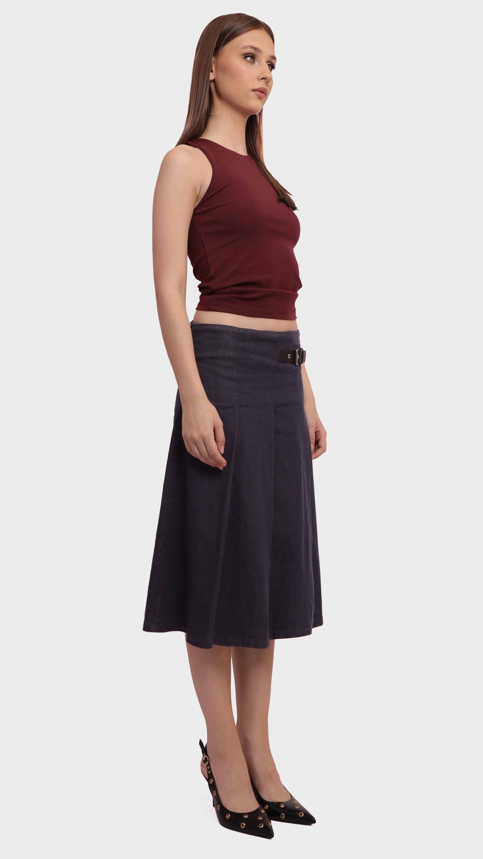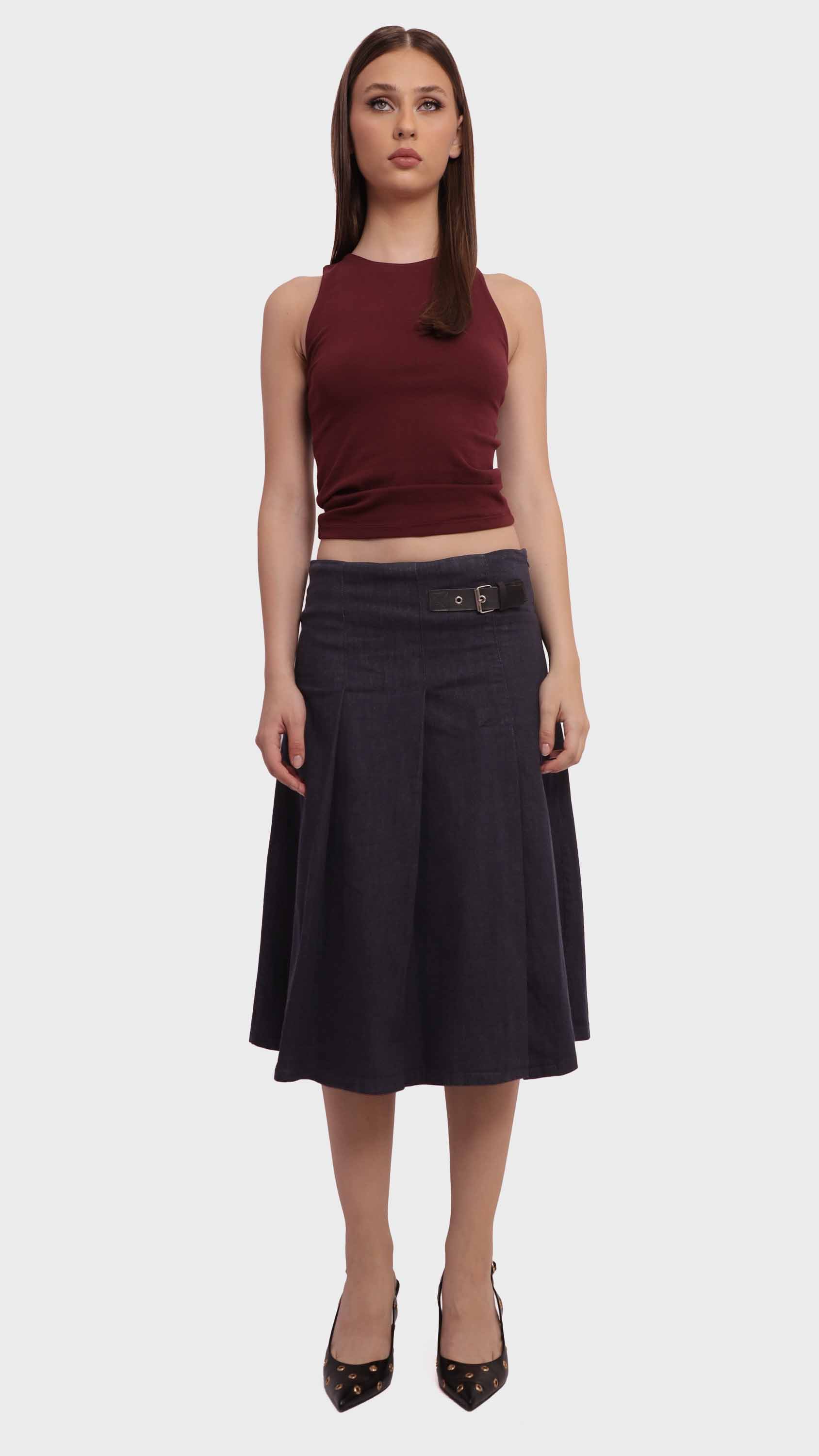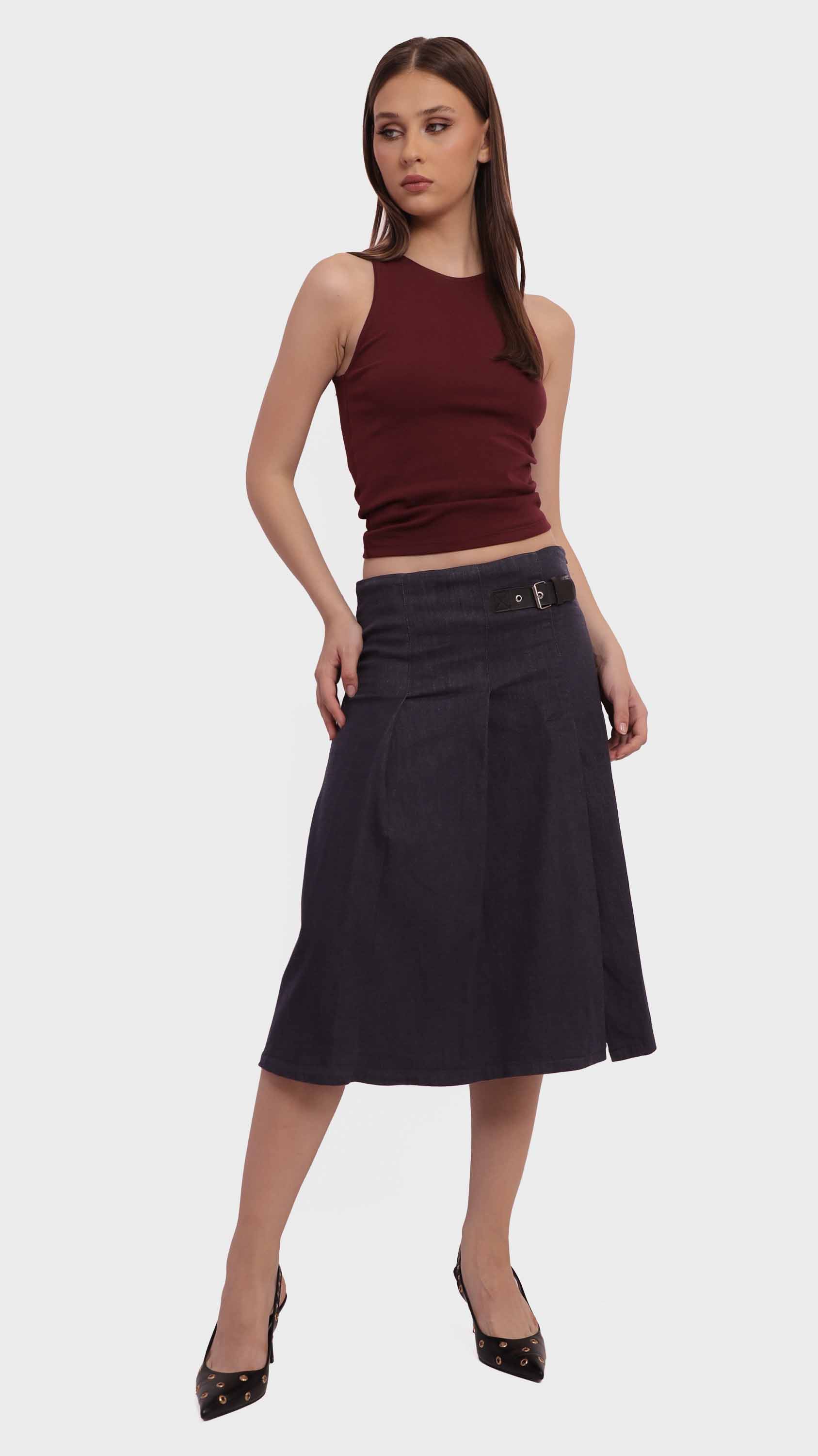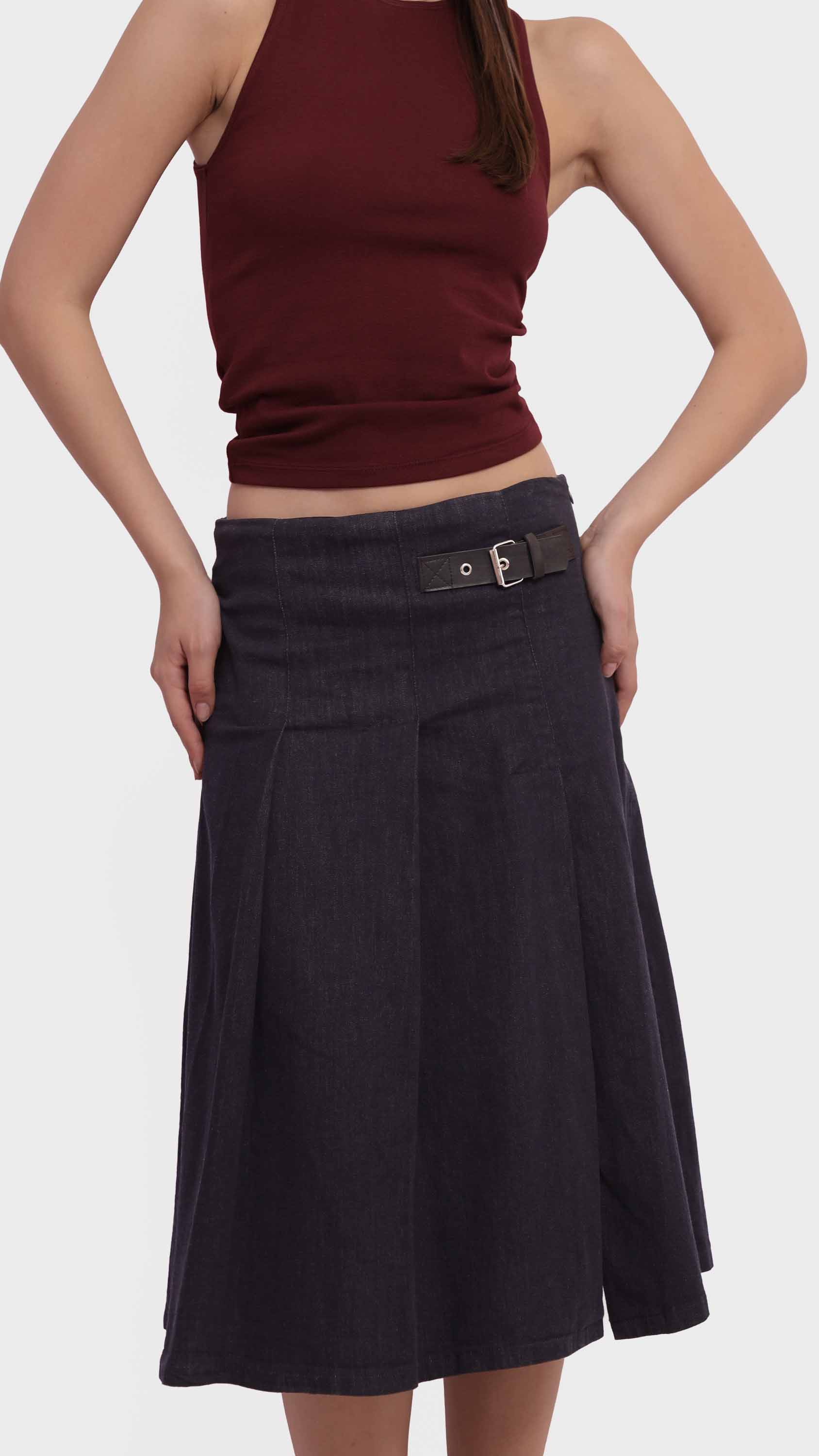 Elevate your everyday look with this dark denim wrap midi skirt, designed with a flattering belted waist and a sleek silhouette