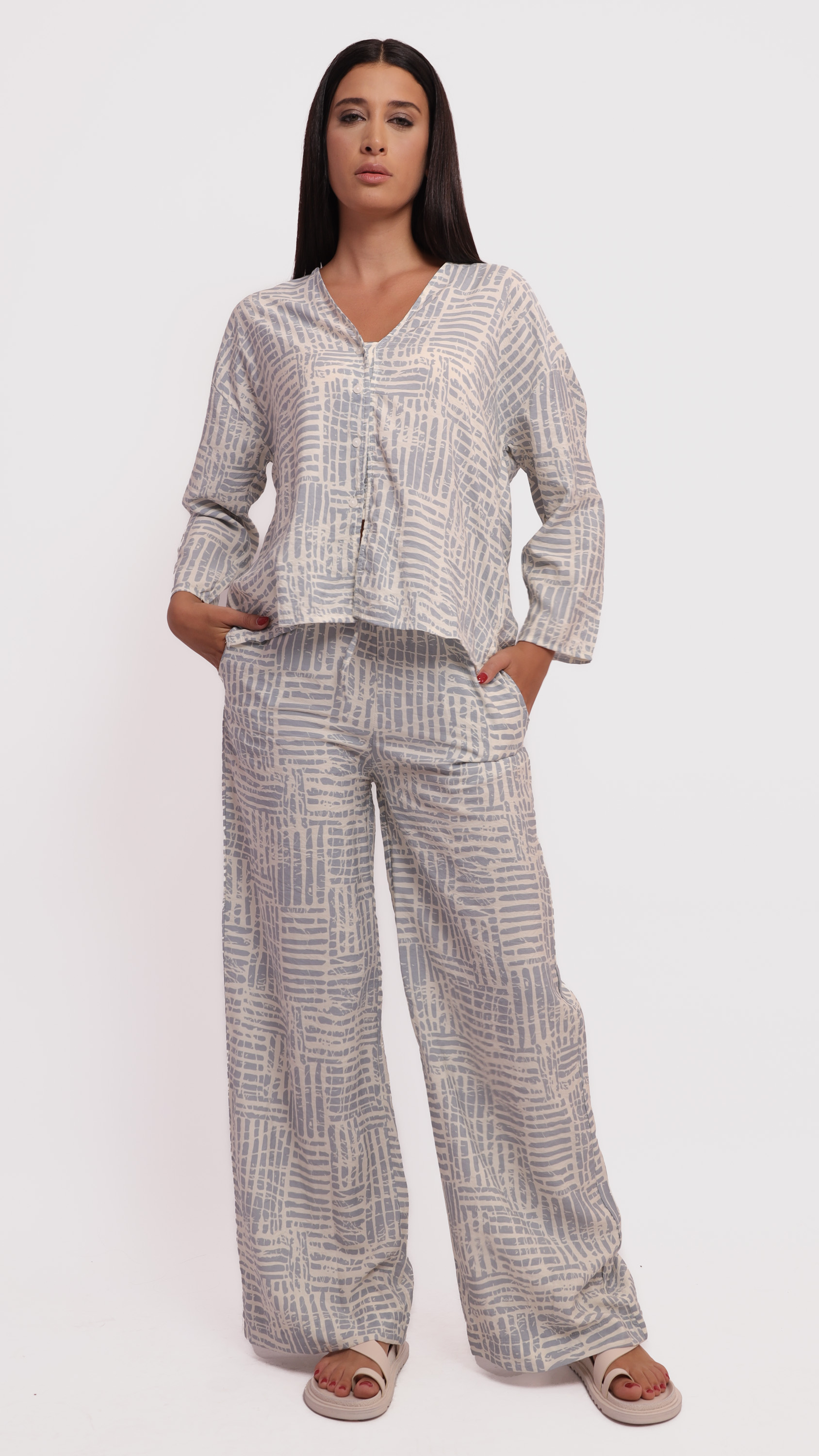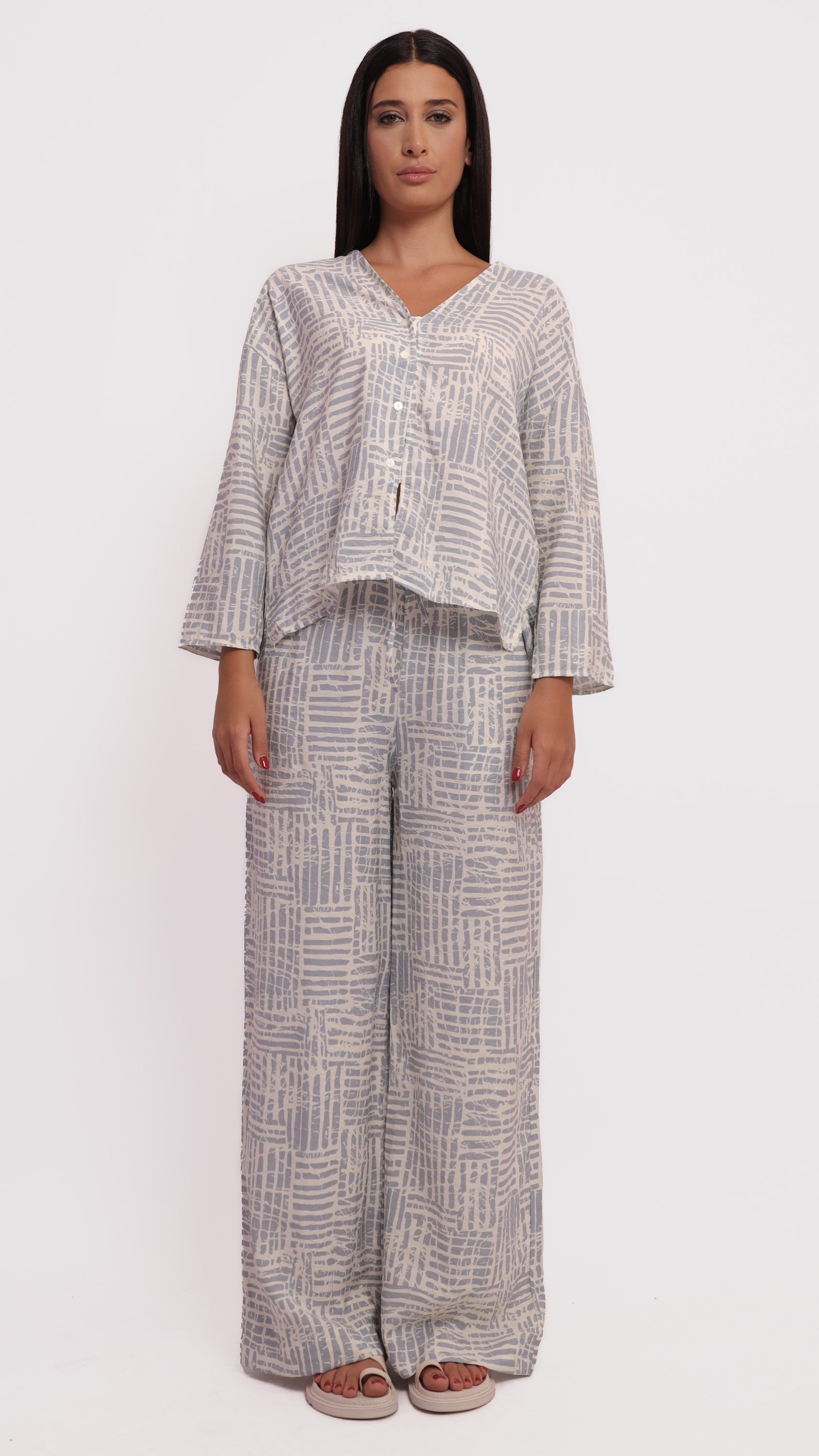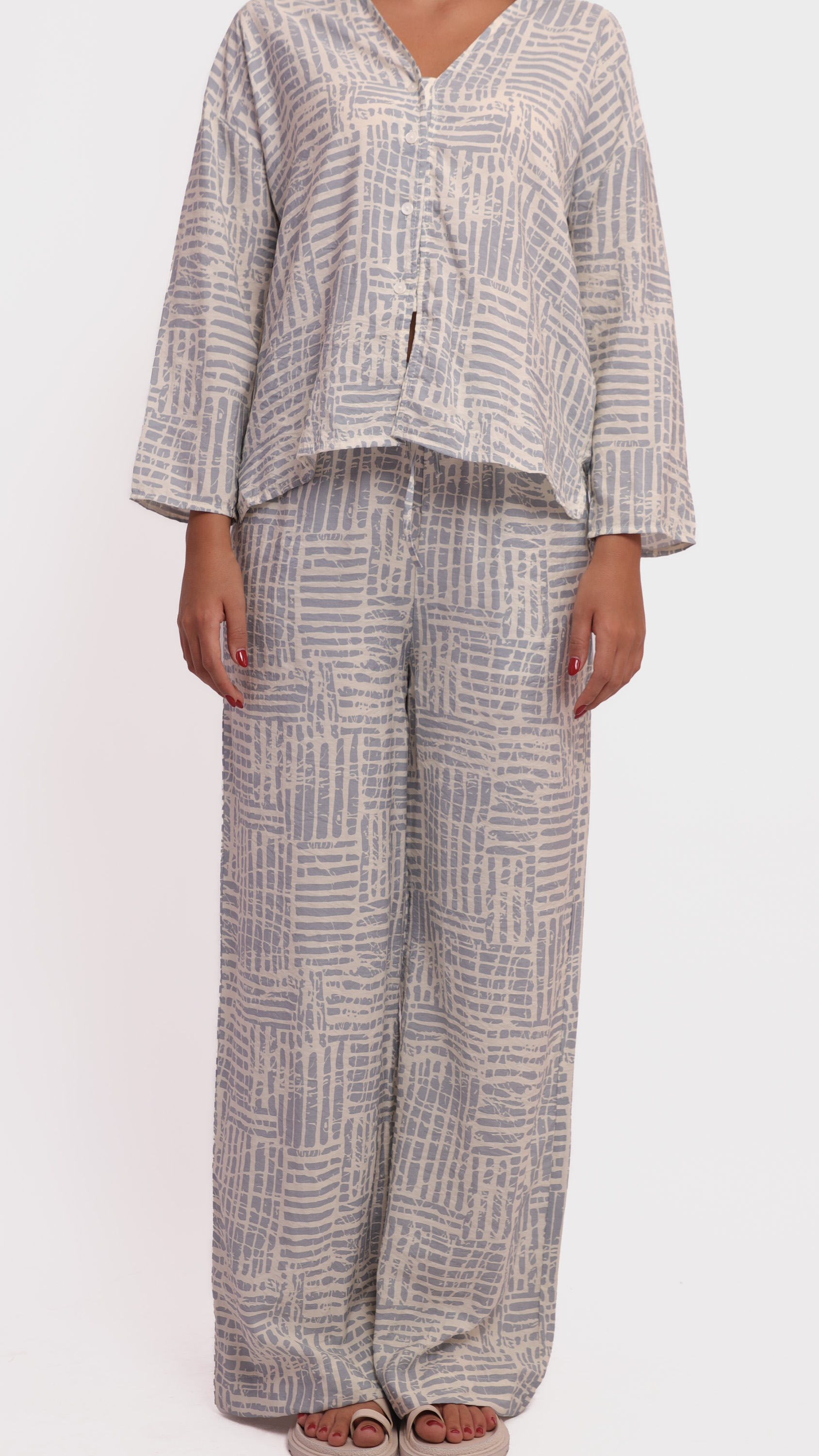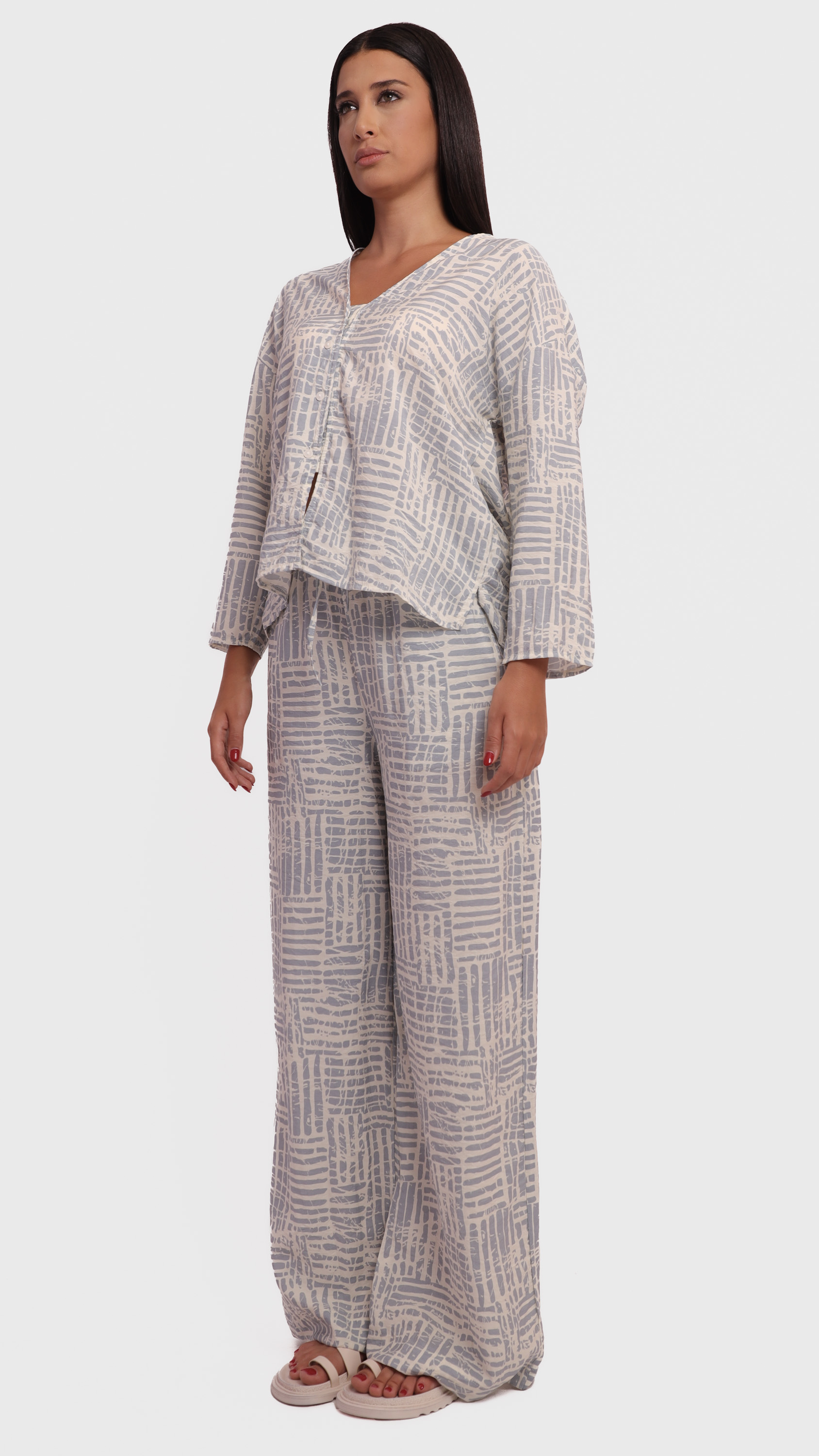 This two-piece lounge set features a relaxed-fit long-sleeve top and wide-leg pants, designed in a soft fabric with a modern abstract line pattern in grey and off-white tones. The top has a V-neckline and front button detailing, while the pants include an elastic waistband for added comfort. Ideal for casual wear or cozy days indoors.