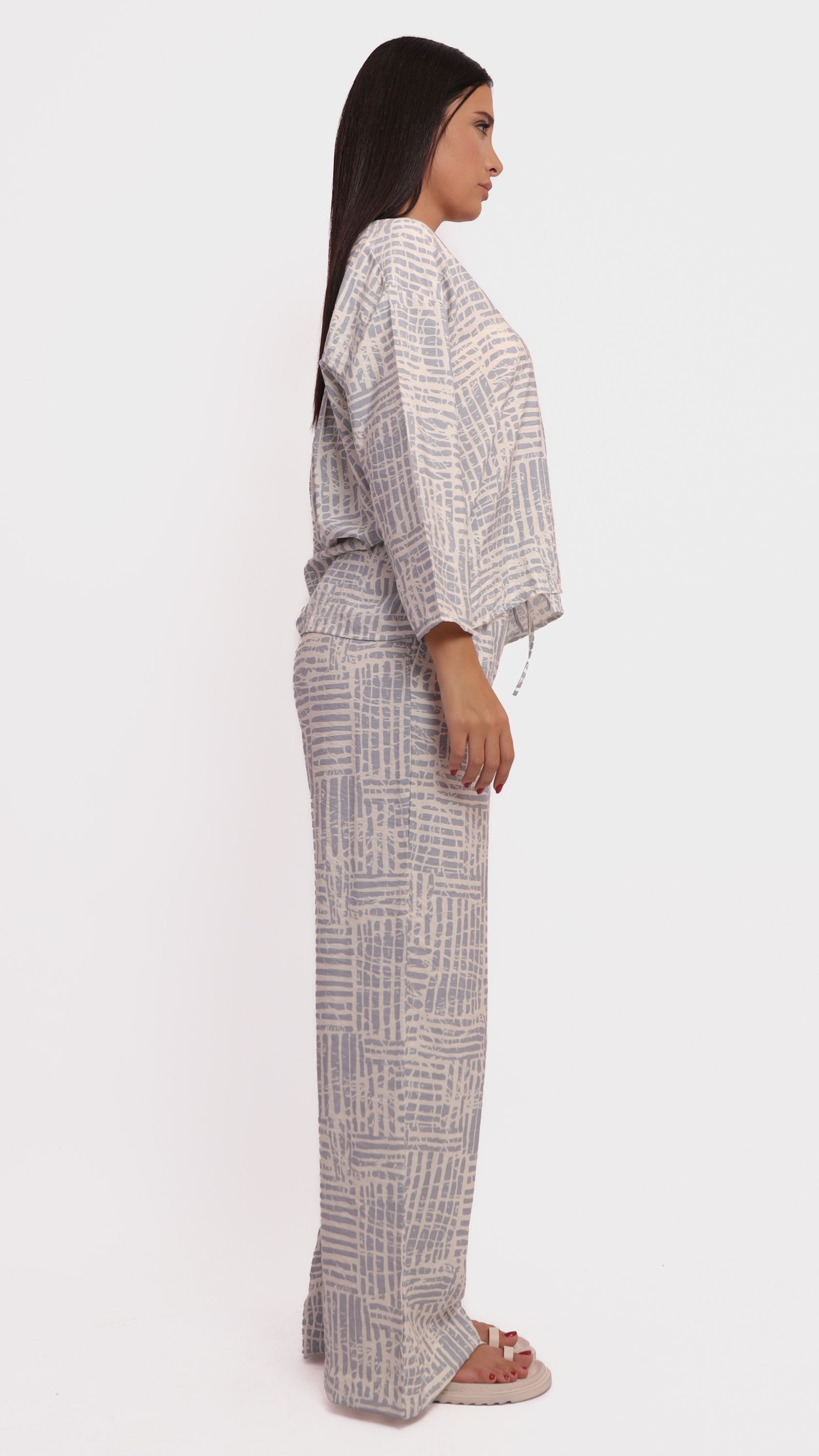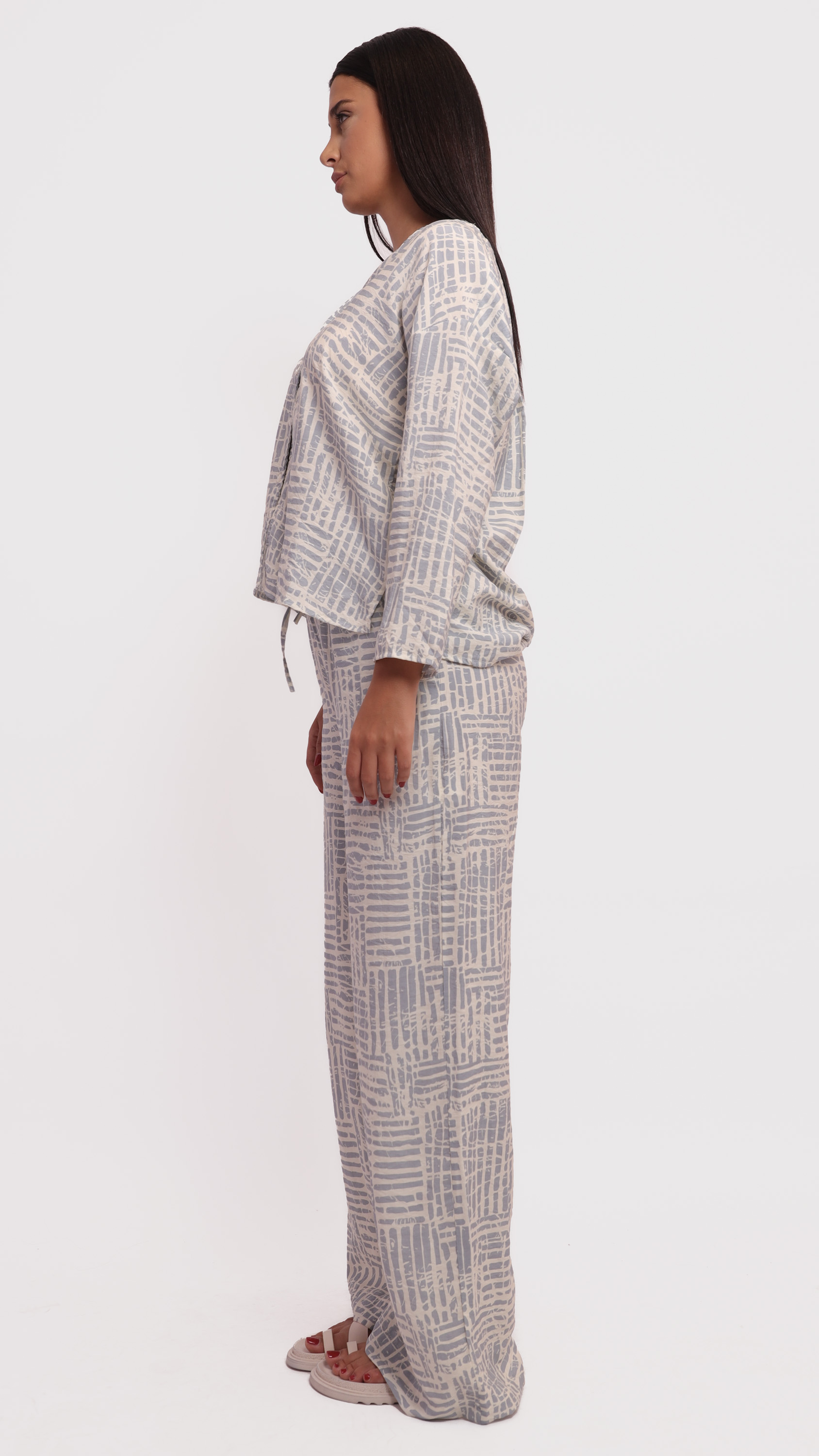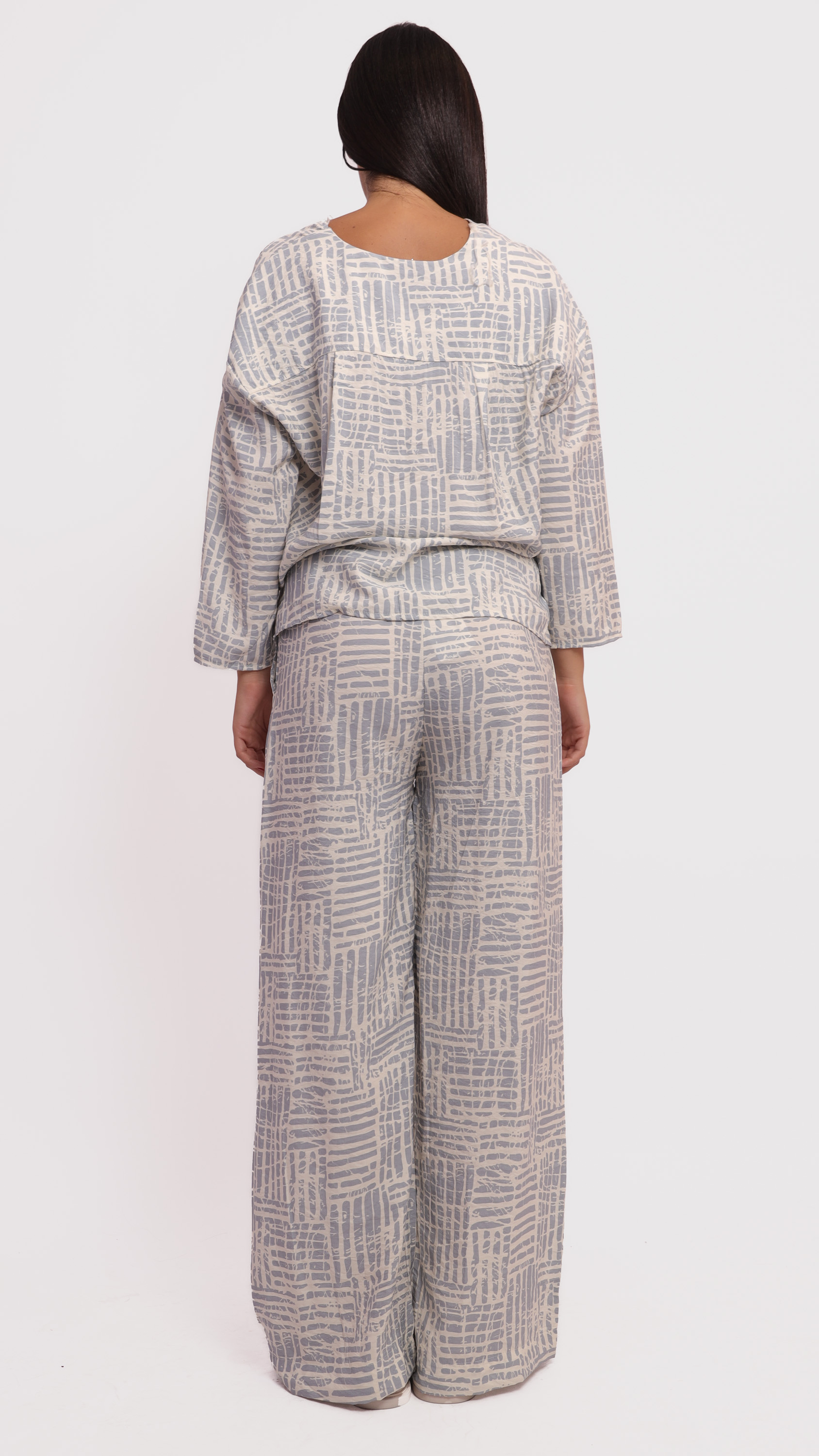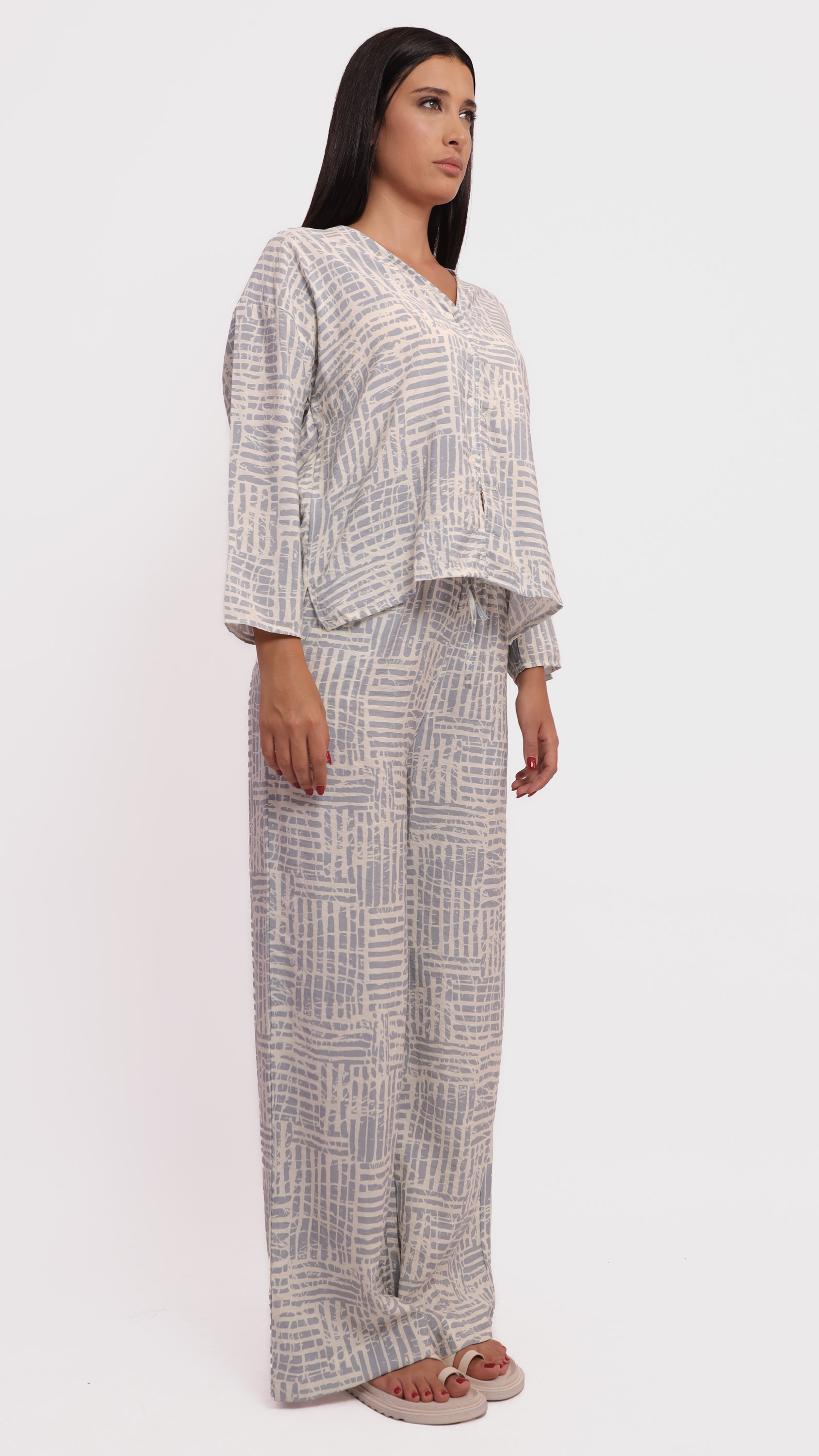 This two-piece lounge set features a relaxed-fit long-sleeve top and wide-leg pants, designed in a soft fabric with a modern abstract line pattern in grey and off-white tones. The top has a V-neckline and front button detailing, while the pants include an elastic waistband for added comfort. Ideal for casual wear or cozy days indoors.