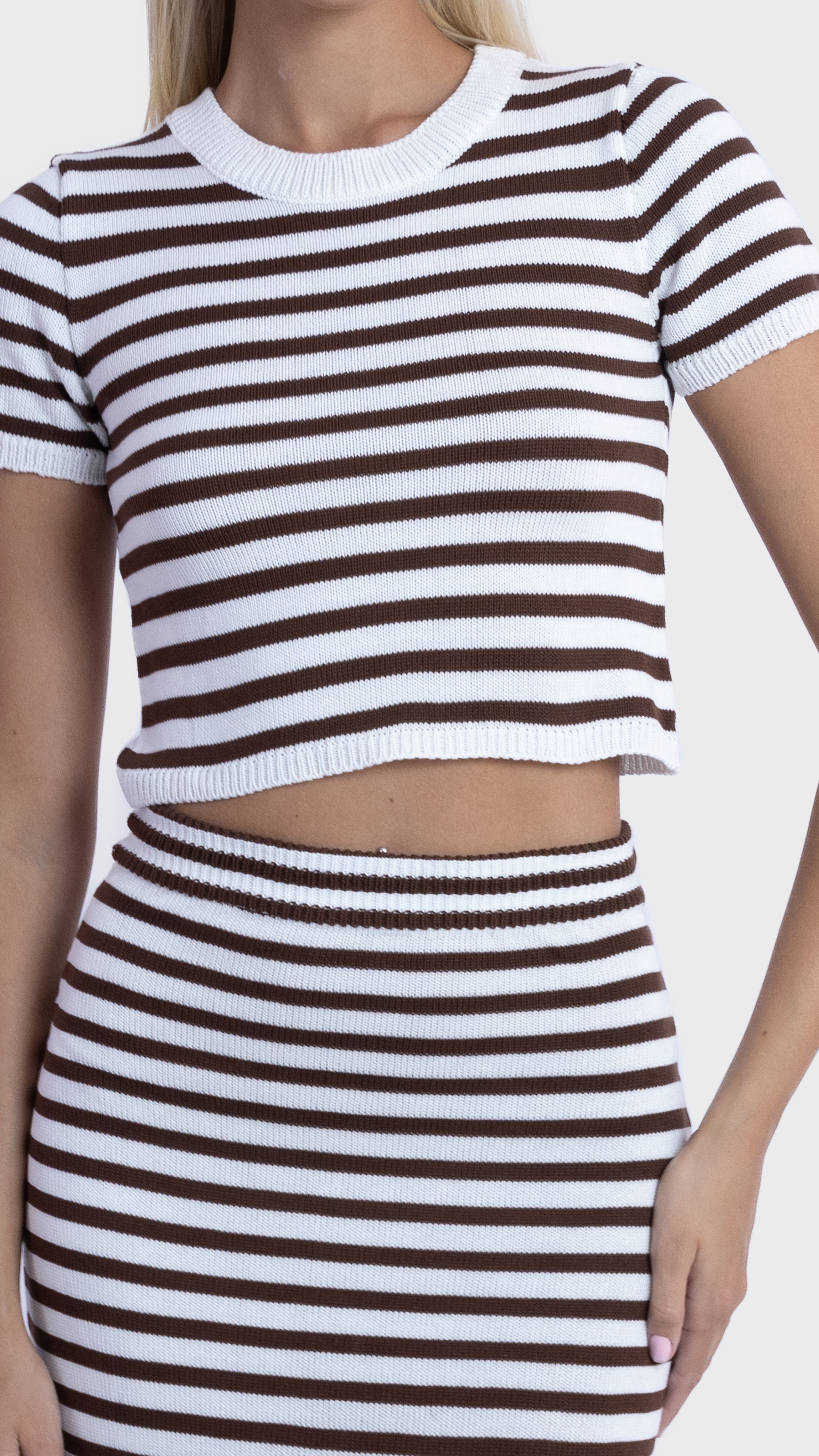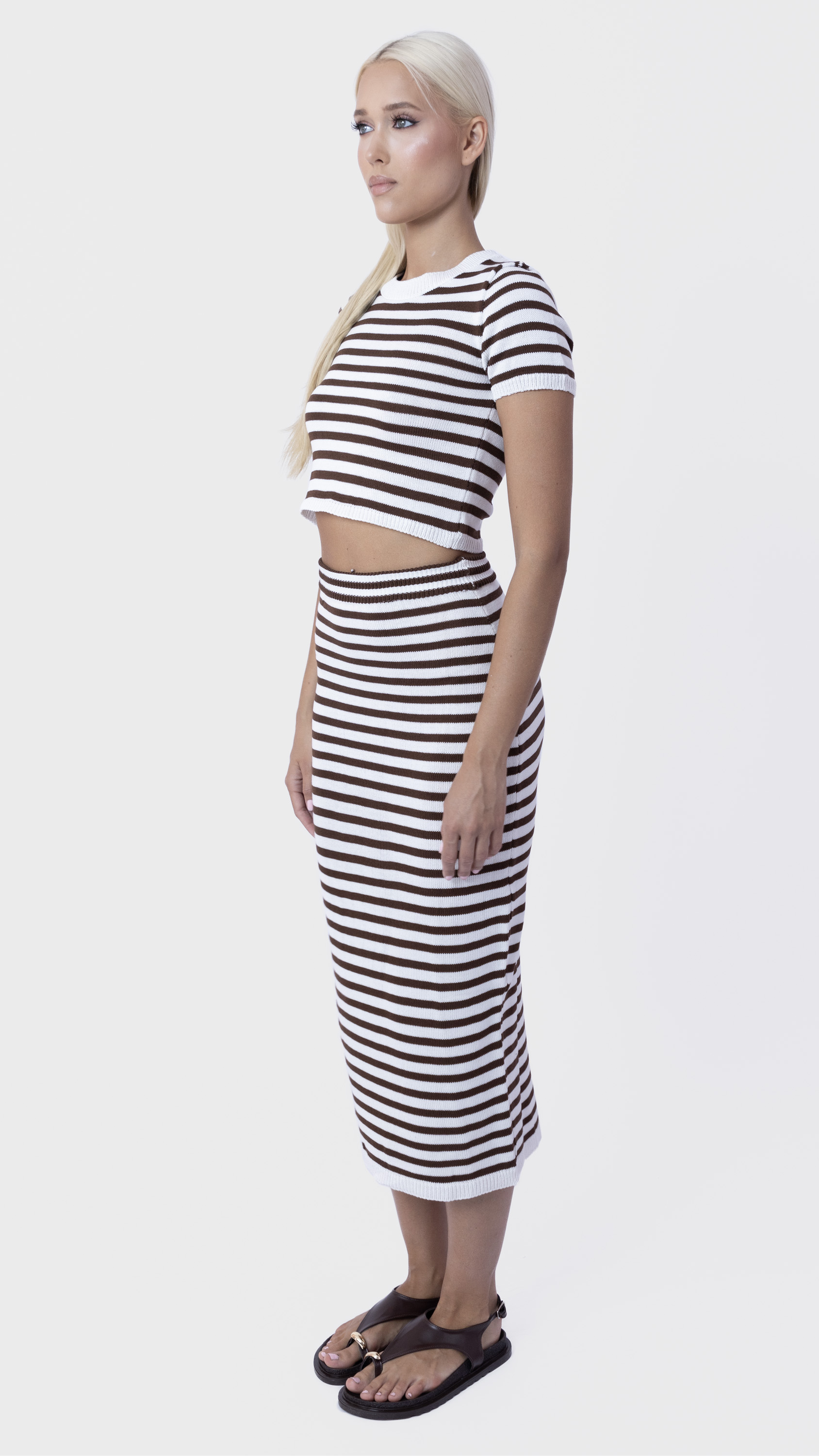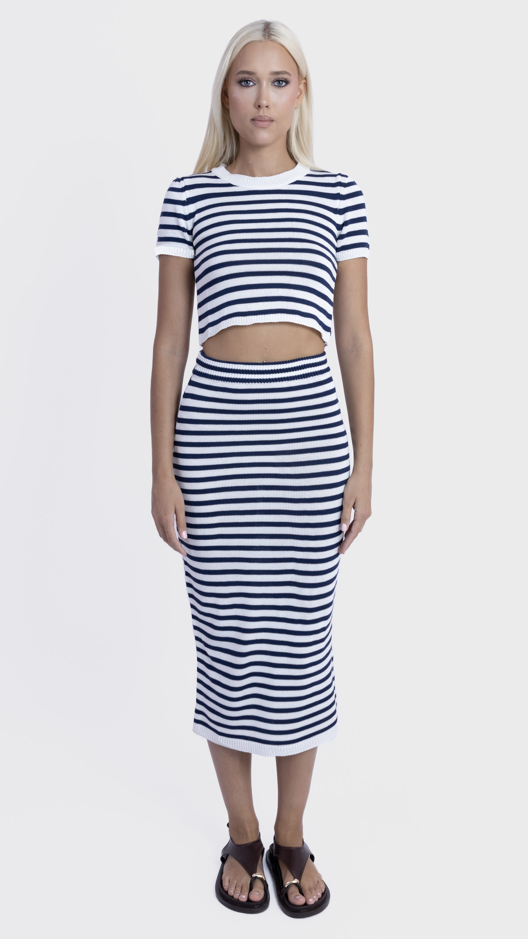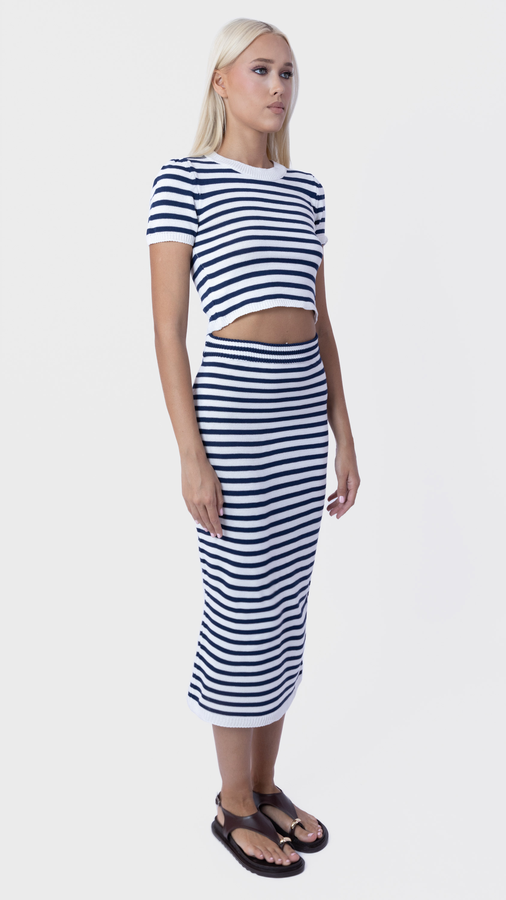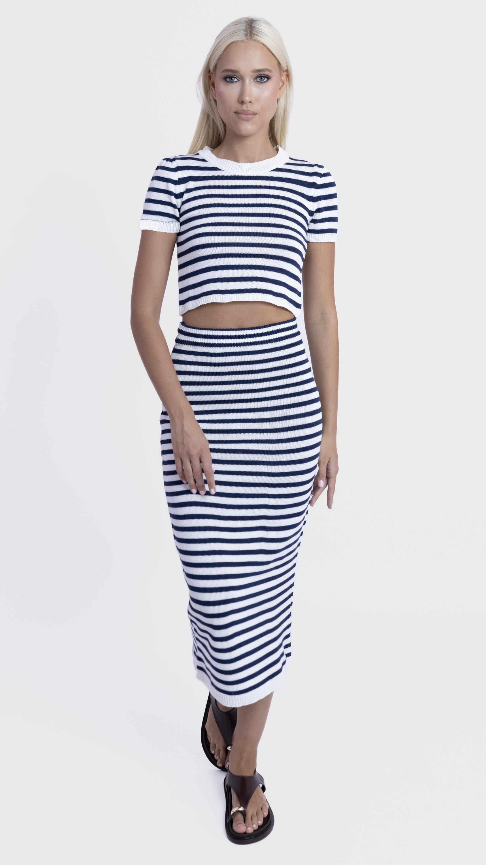 Keep it sleek and simple with this striped co-ord set featuring a ribbed crop top and matching midi skirt for a flattering everyday look.