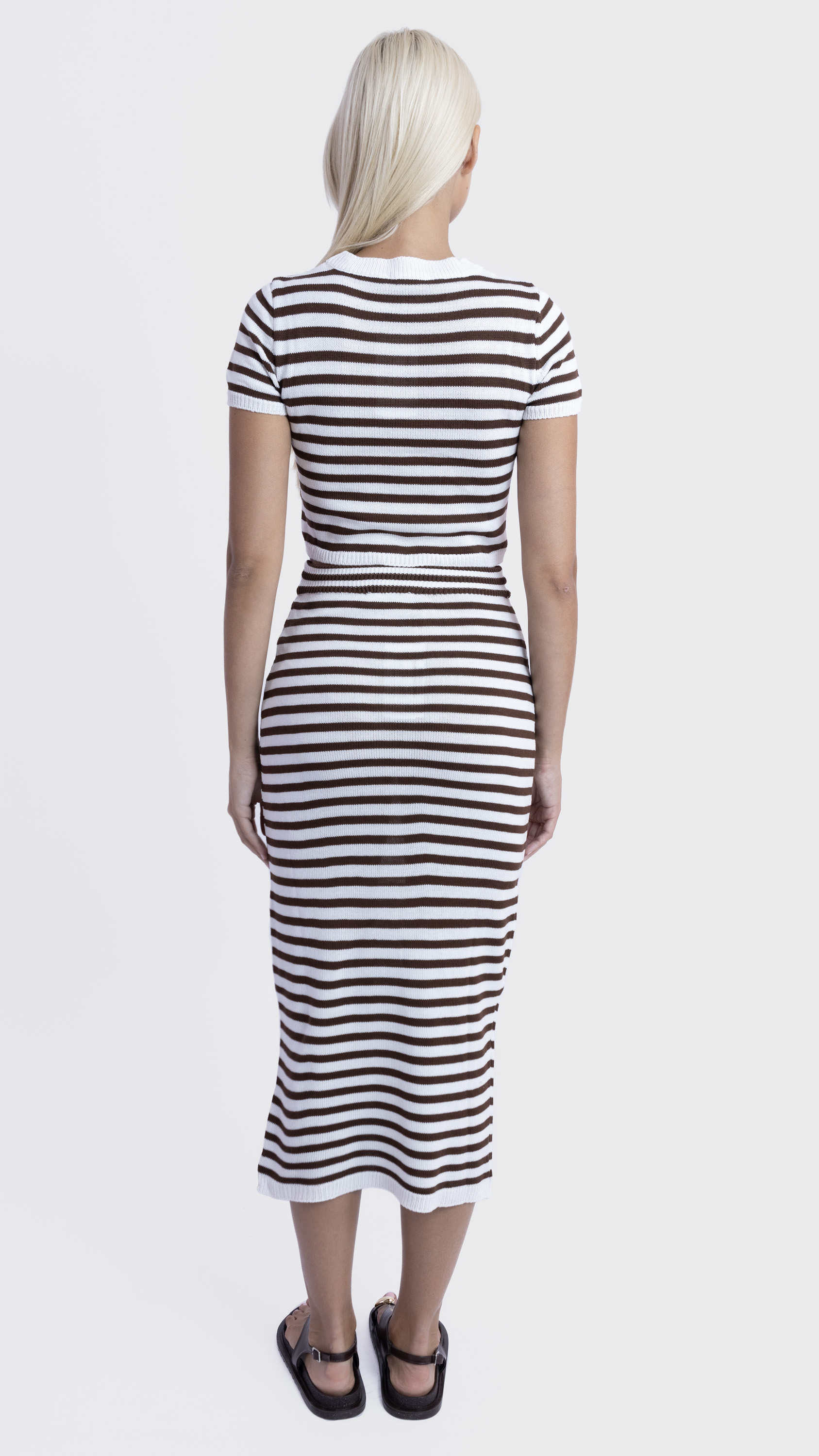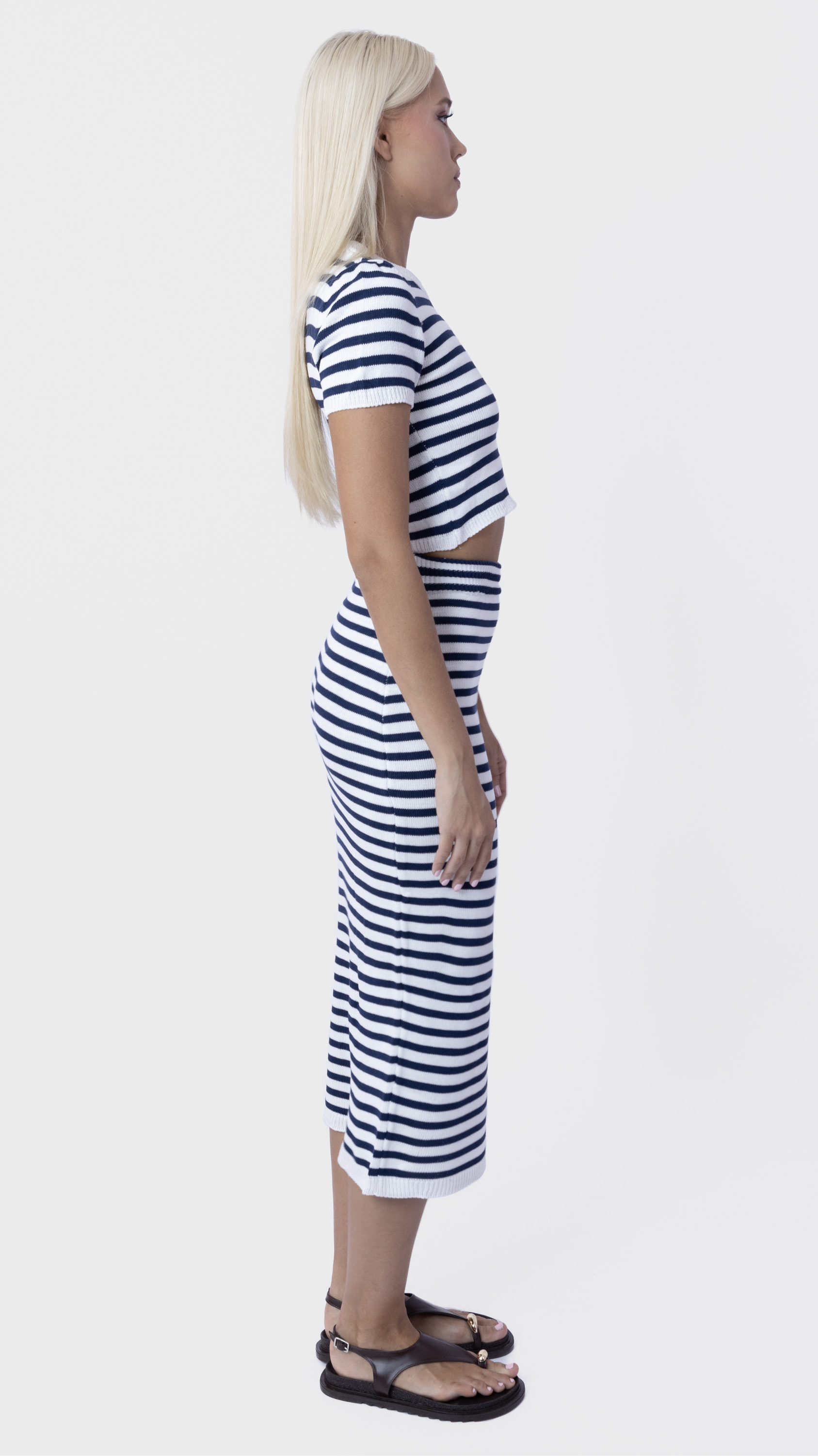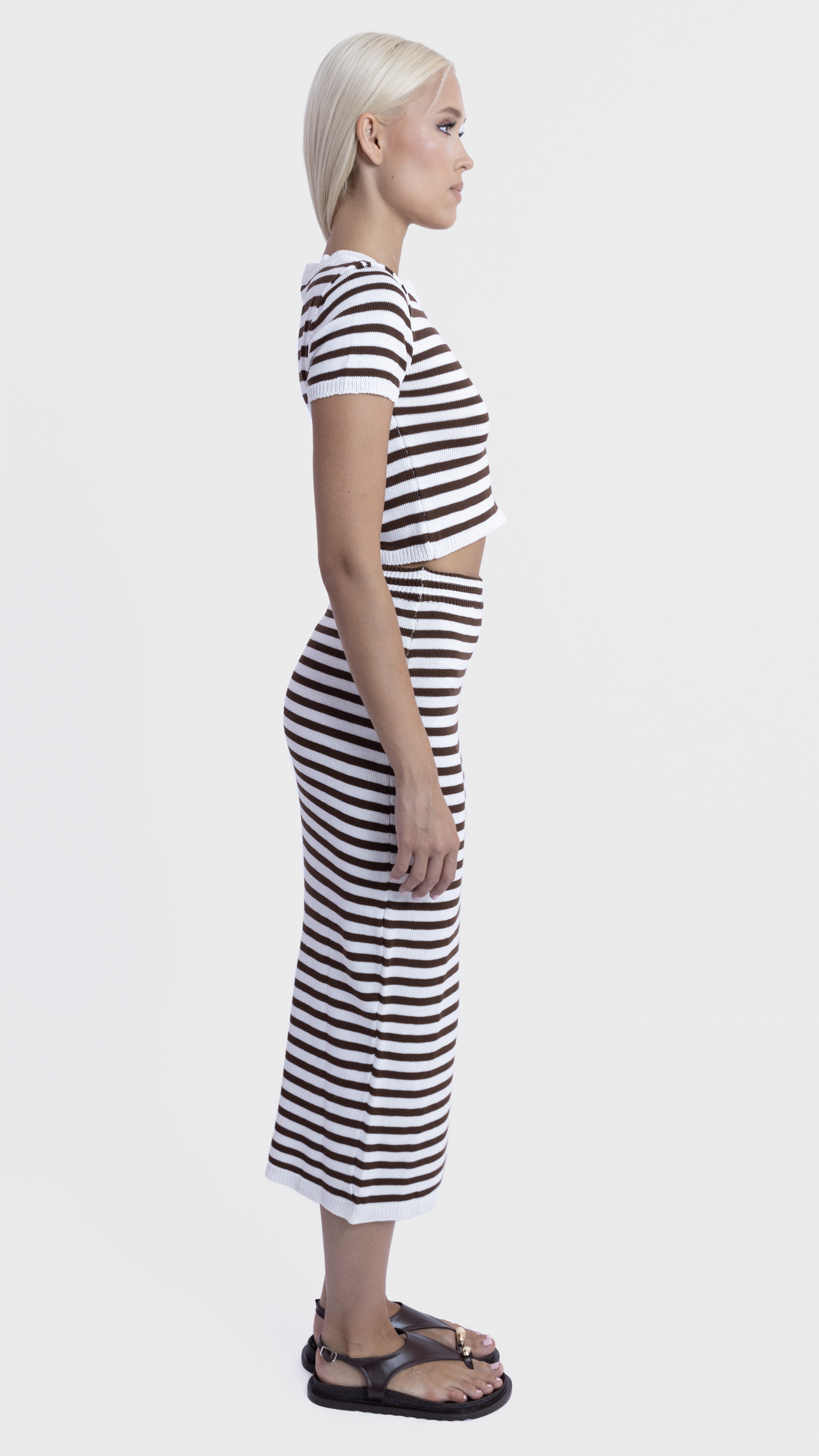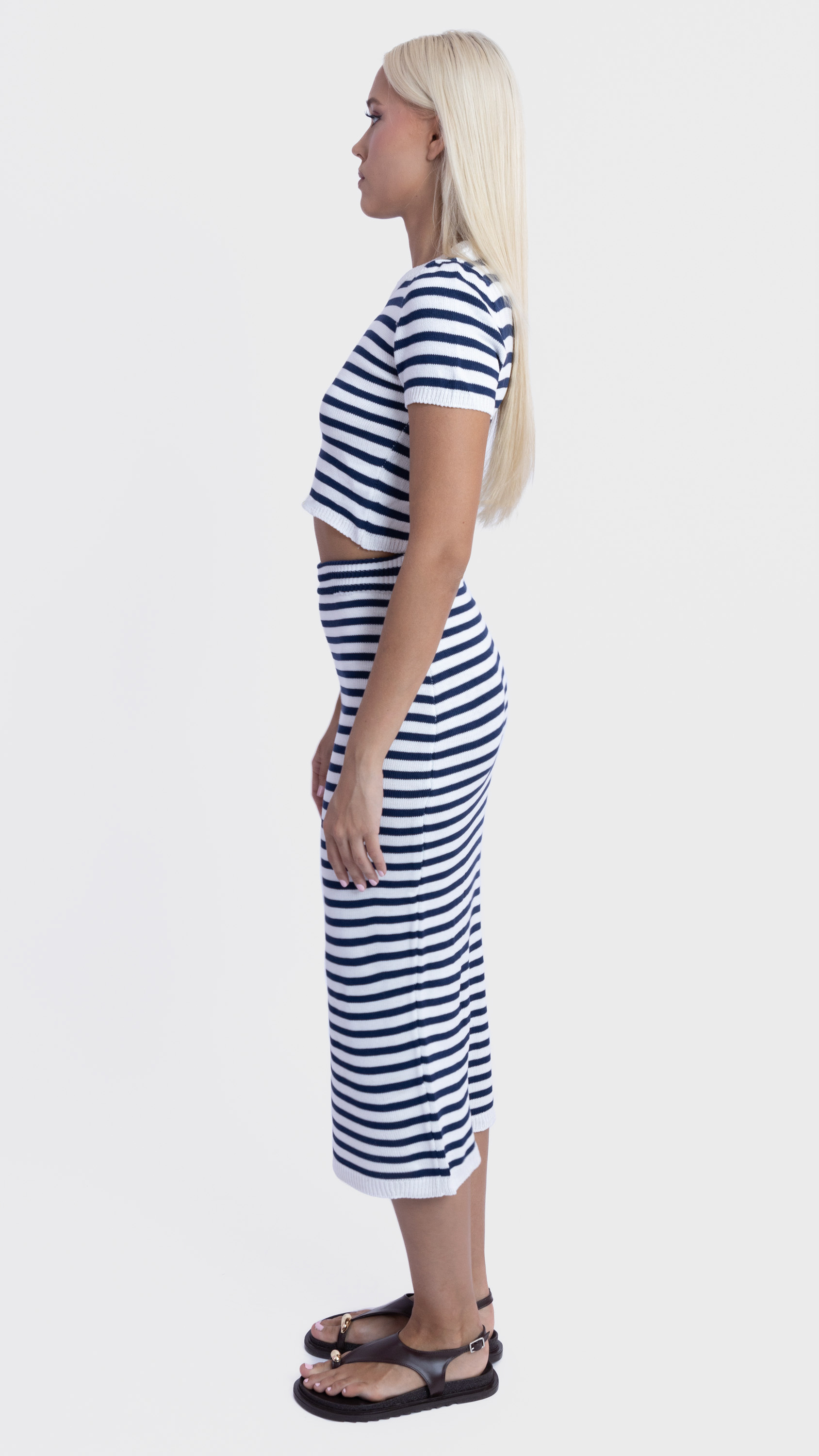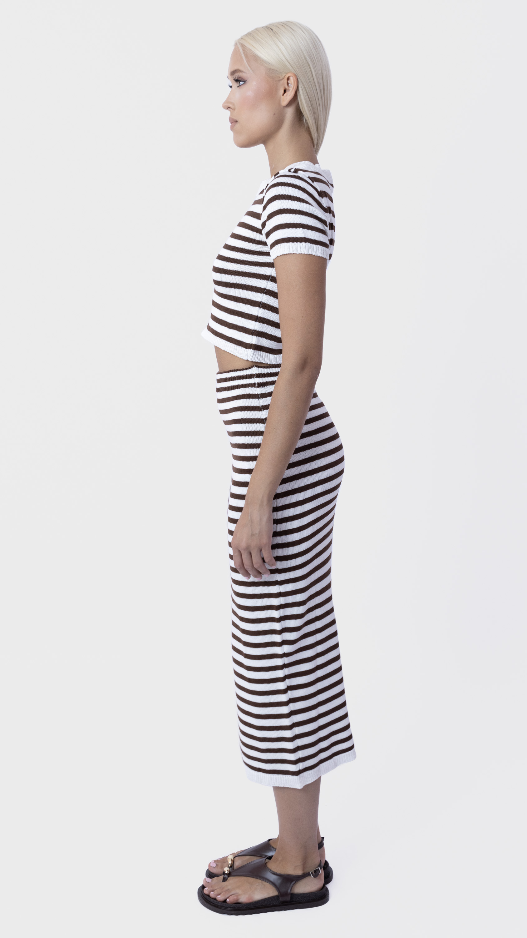 Keep it sleek and simple with this striped co-ord set featuring a ribbed crop top and matching midi skirt for a flattering everyday look.