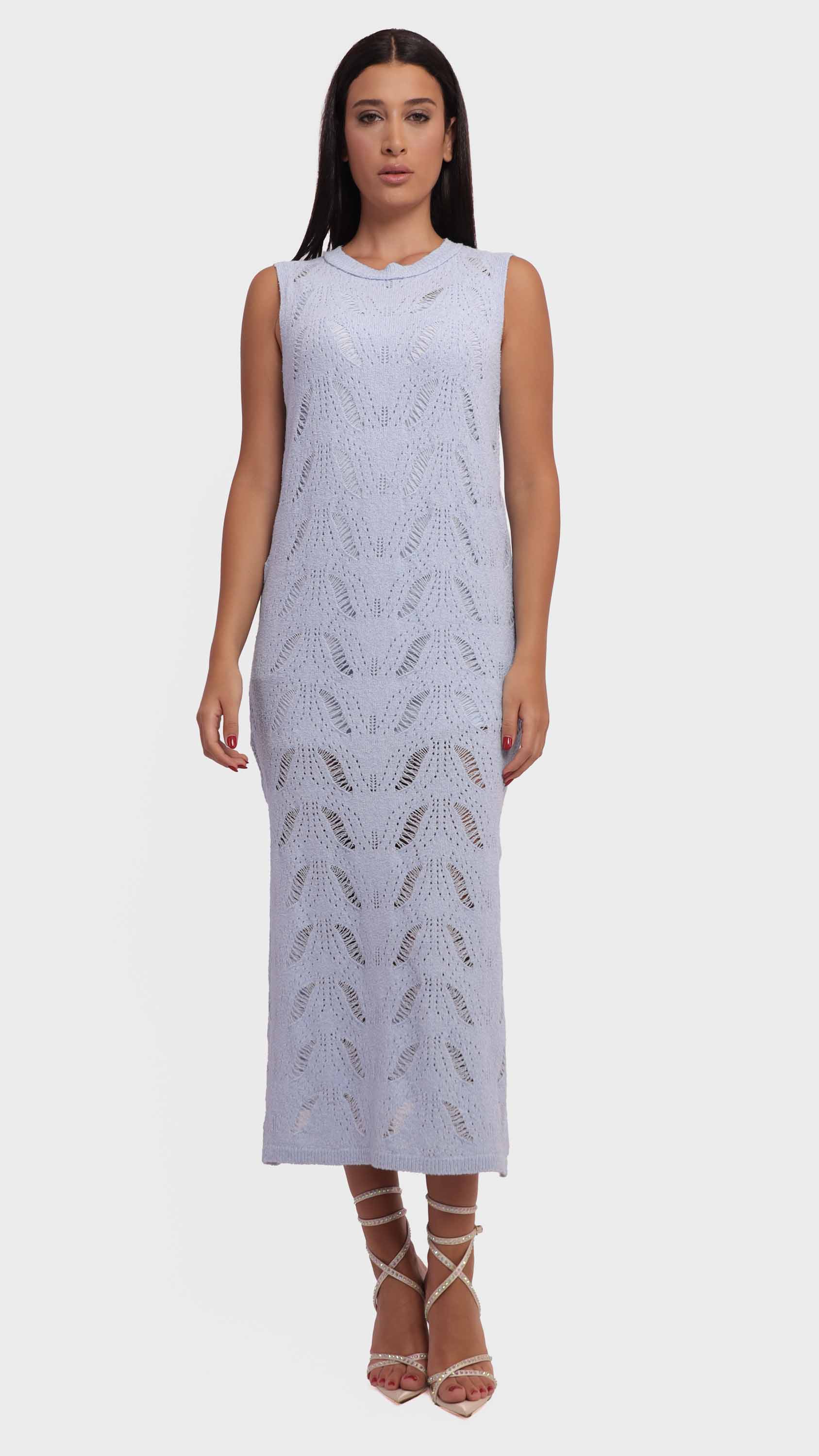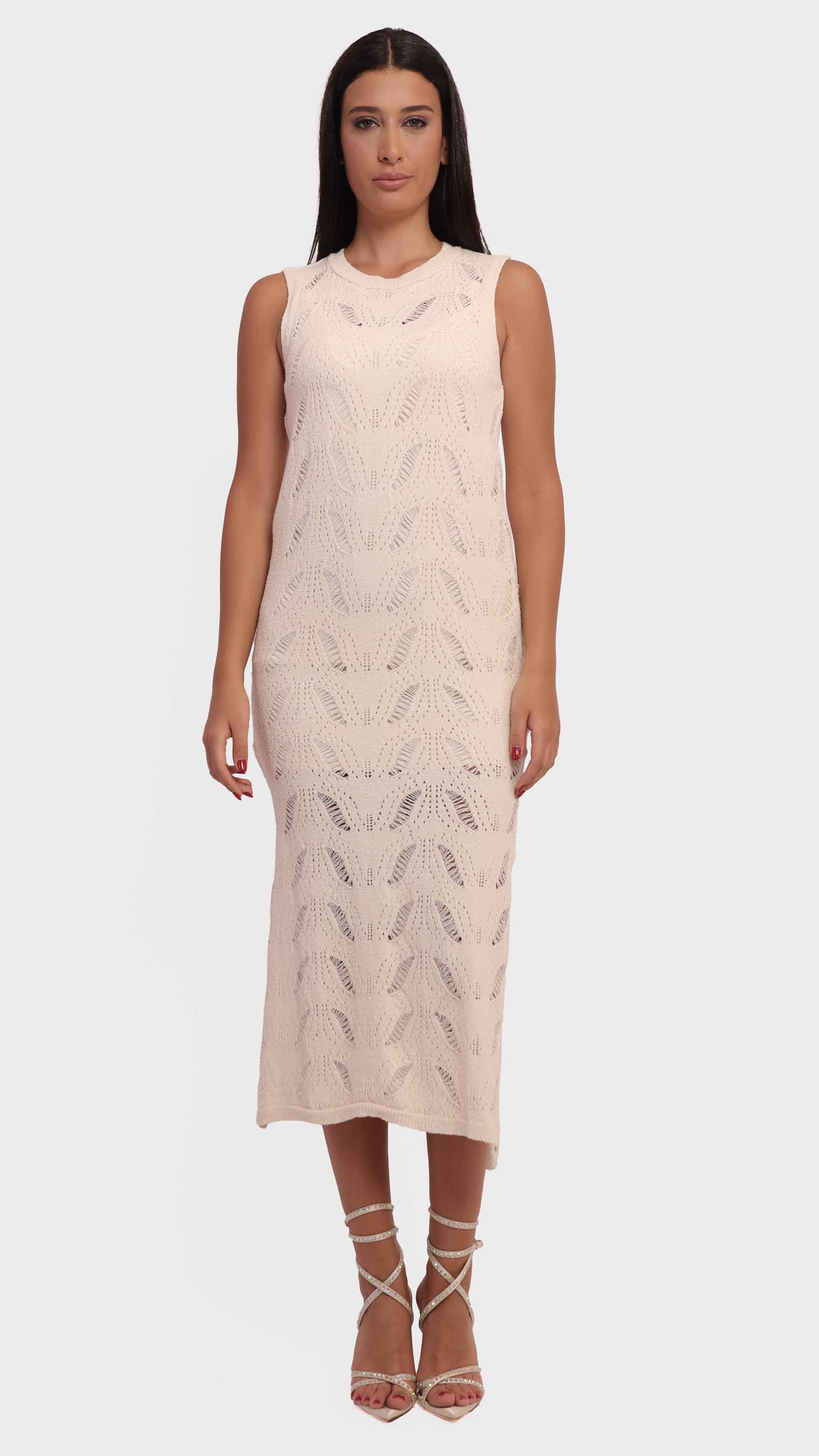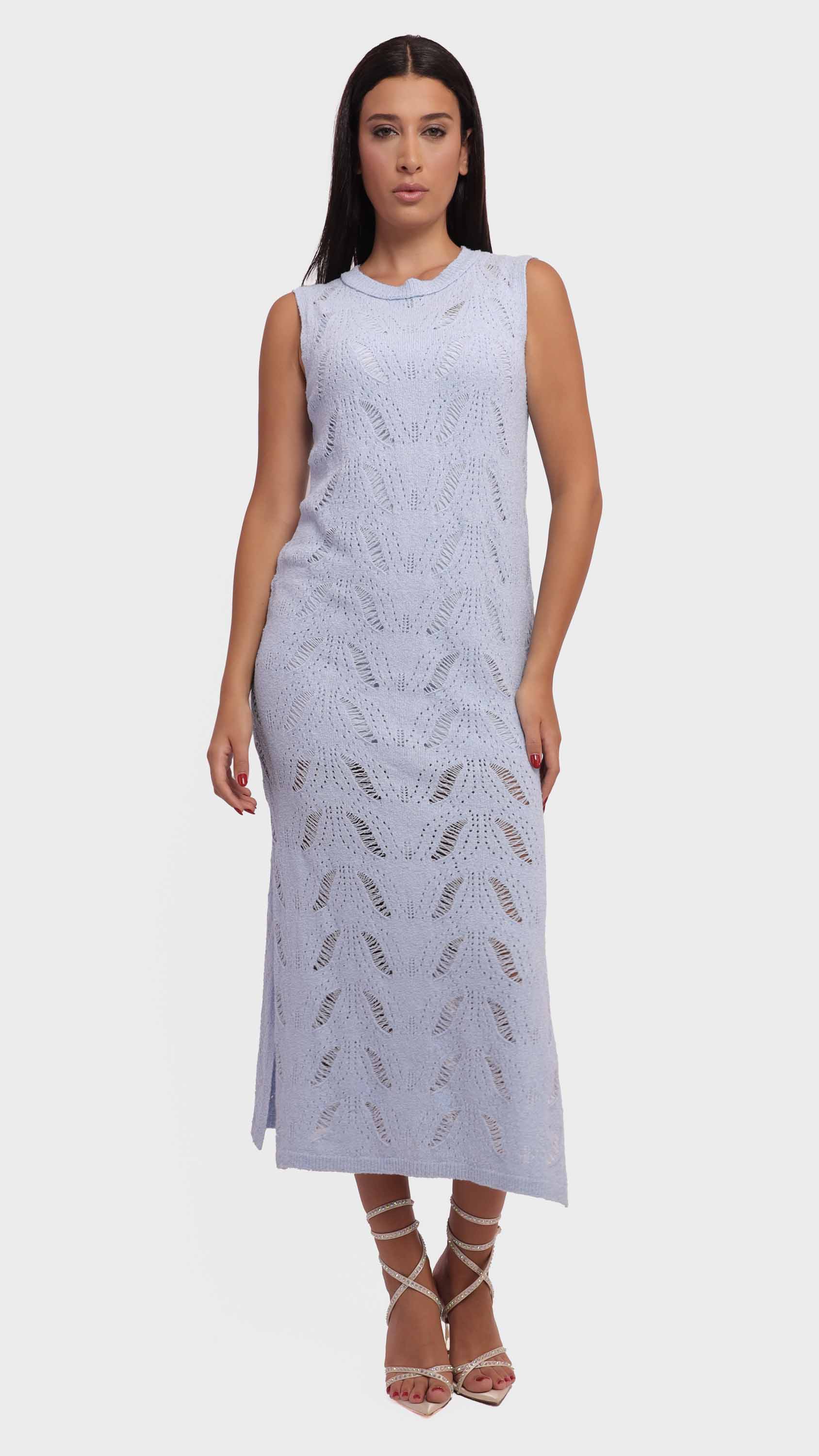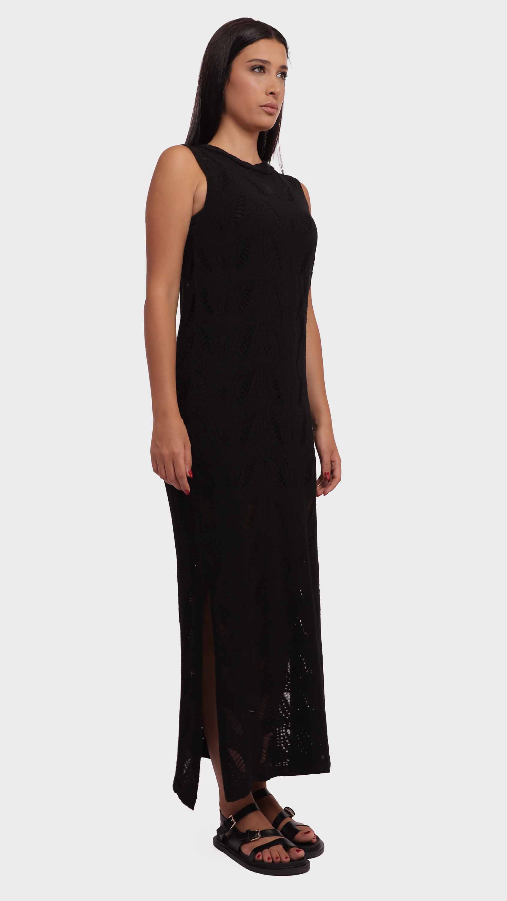 Bring a touch of artisanal charm to your summer wardrobe with this crochet knit sleeveless maxi dress. Crafted from soft, textured fabric, it features an intricate open-knit design with leaf-like detailing throughout. The sleeveless cut, round neckline, and semi-sheer finish create an effortlessly breezy and elegant silhouette, perfect for layering over swimwear or styling with slip dresses for relaxed, sun-drenched days.