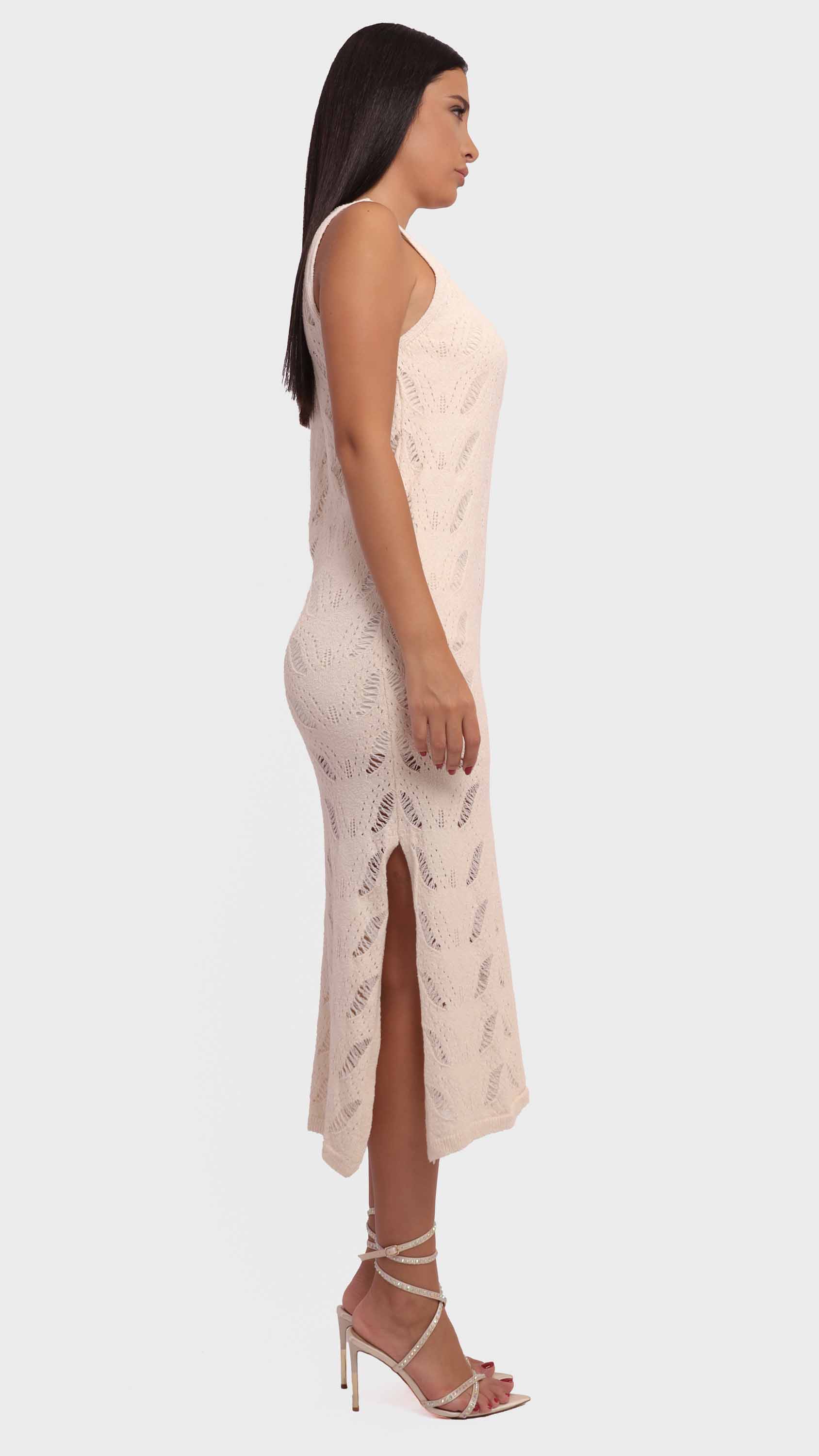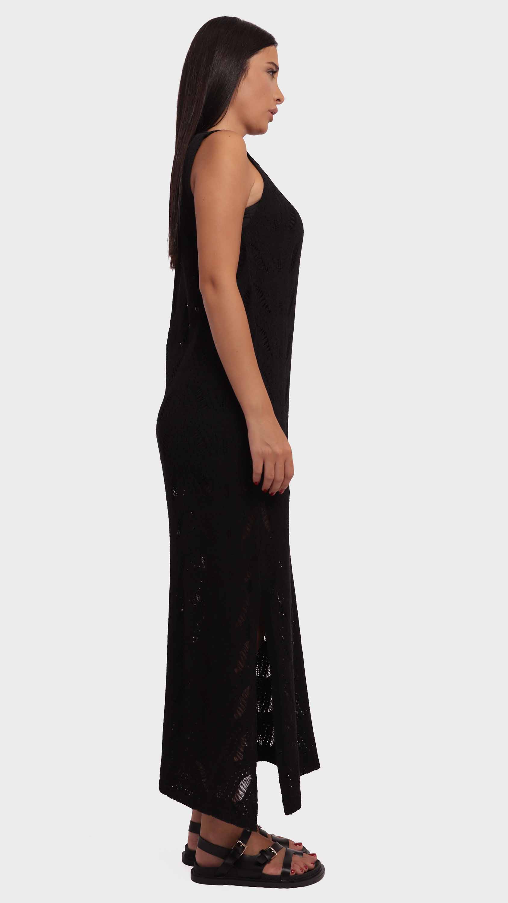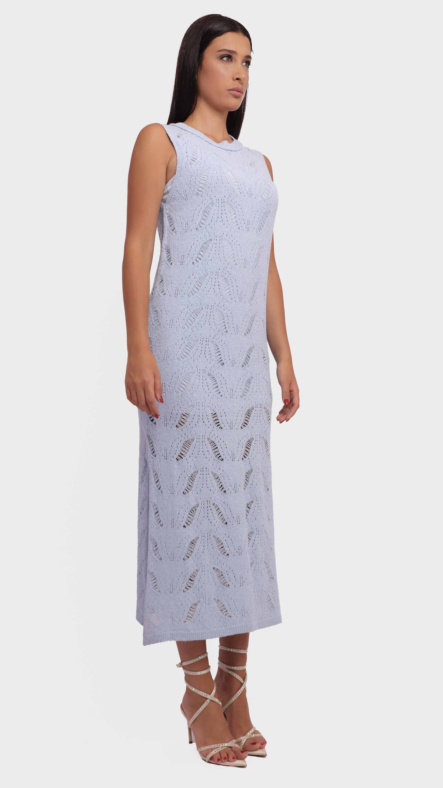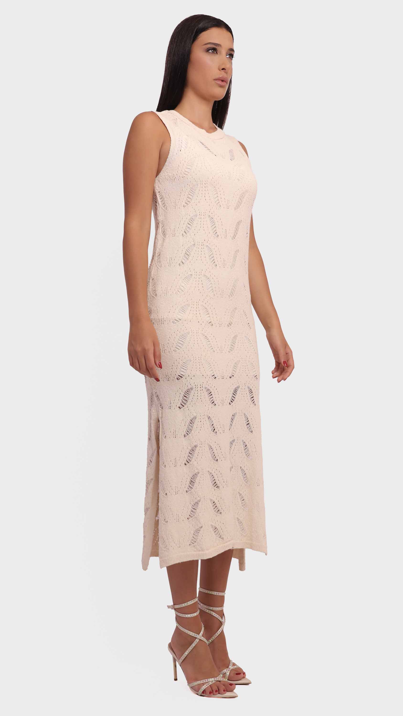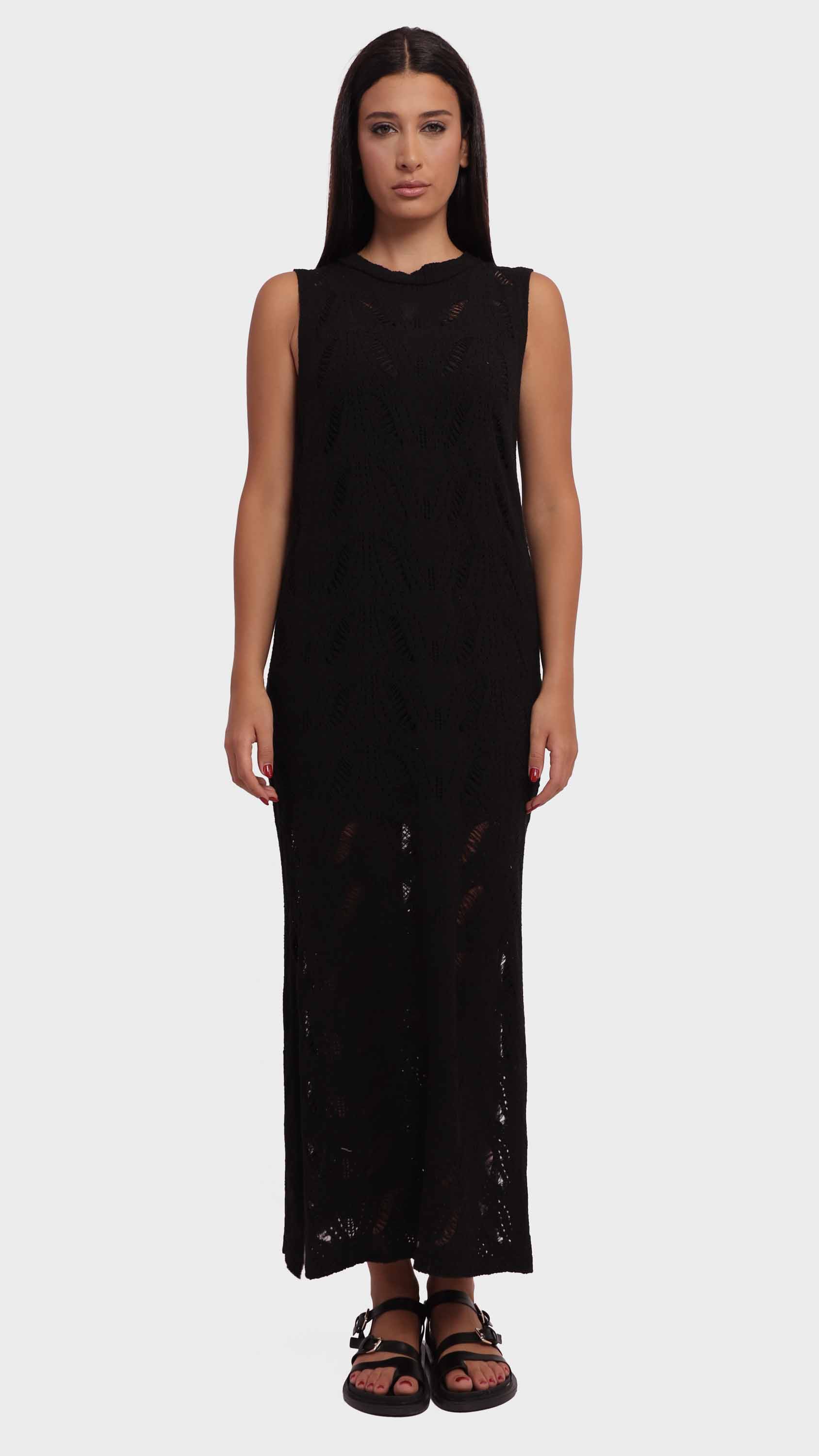 Bring a touch of artisanal charm to your summer wardrobe with this crochet knit sleeveless maxi dress. Crafted from soft, textured fabric, it features an intricate open-knit design with leaf-like detailing throughout. The sleeveless cut, round neckline, and semi-sheer finish create an effortlessly breezy and elegant silhouette, perfect for layering over swimwear or styling with slip dresses for relaxed, sun-drenched days.