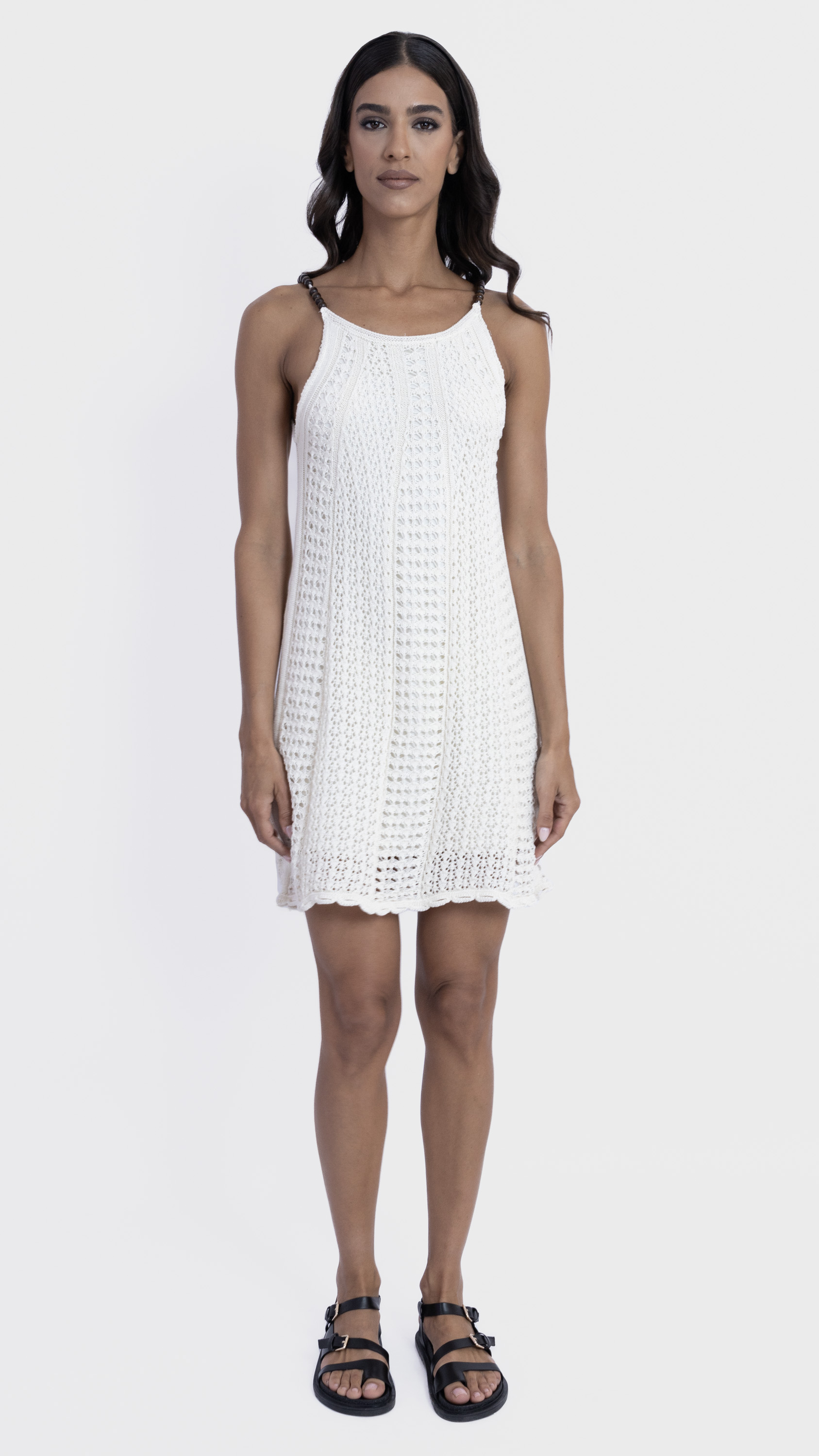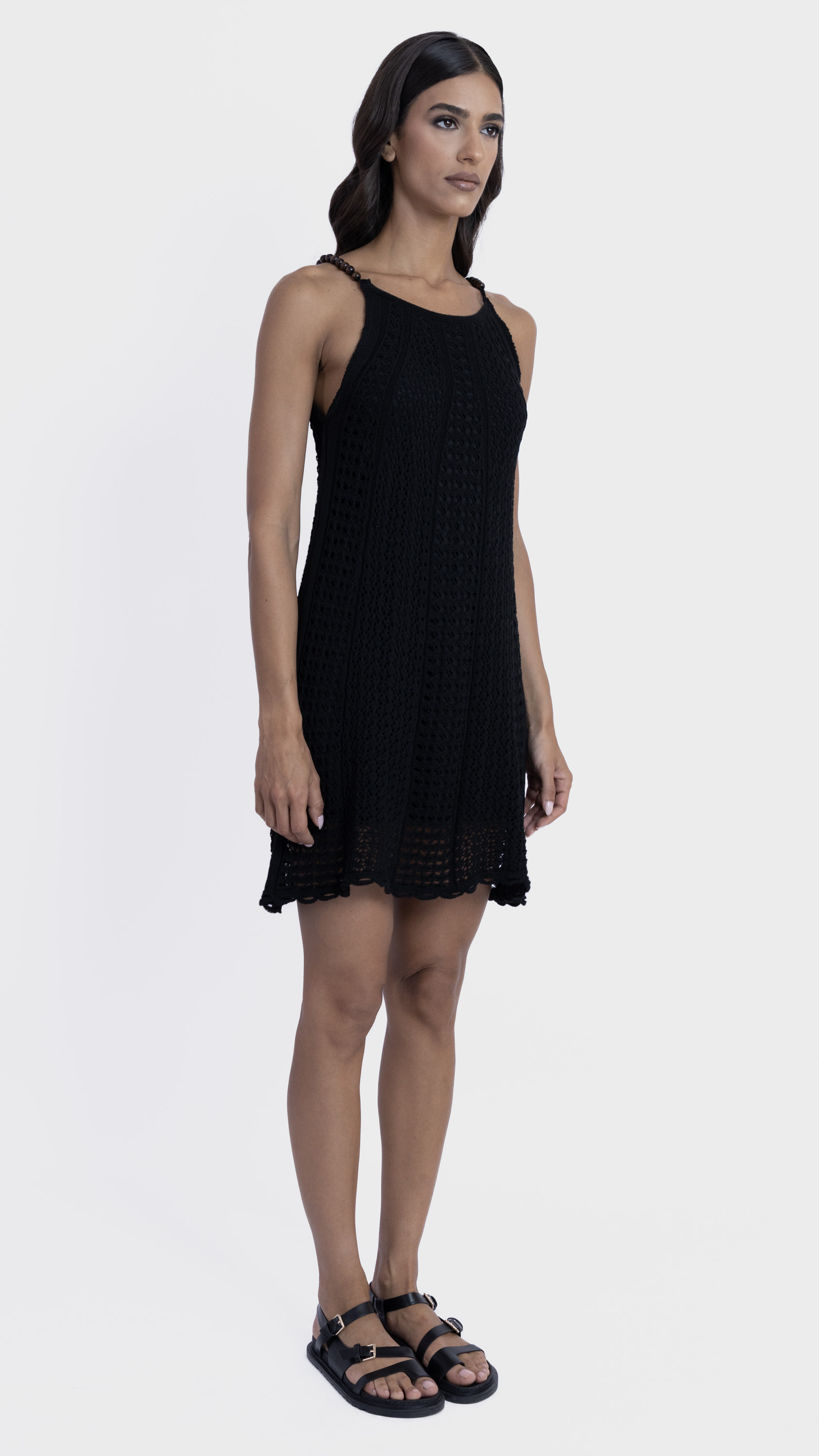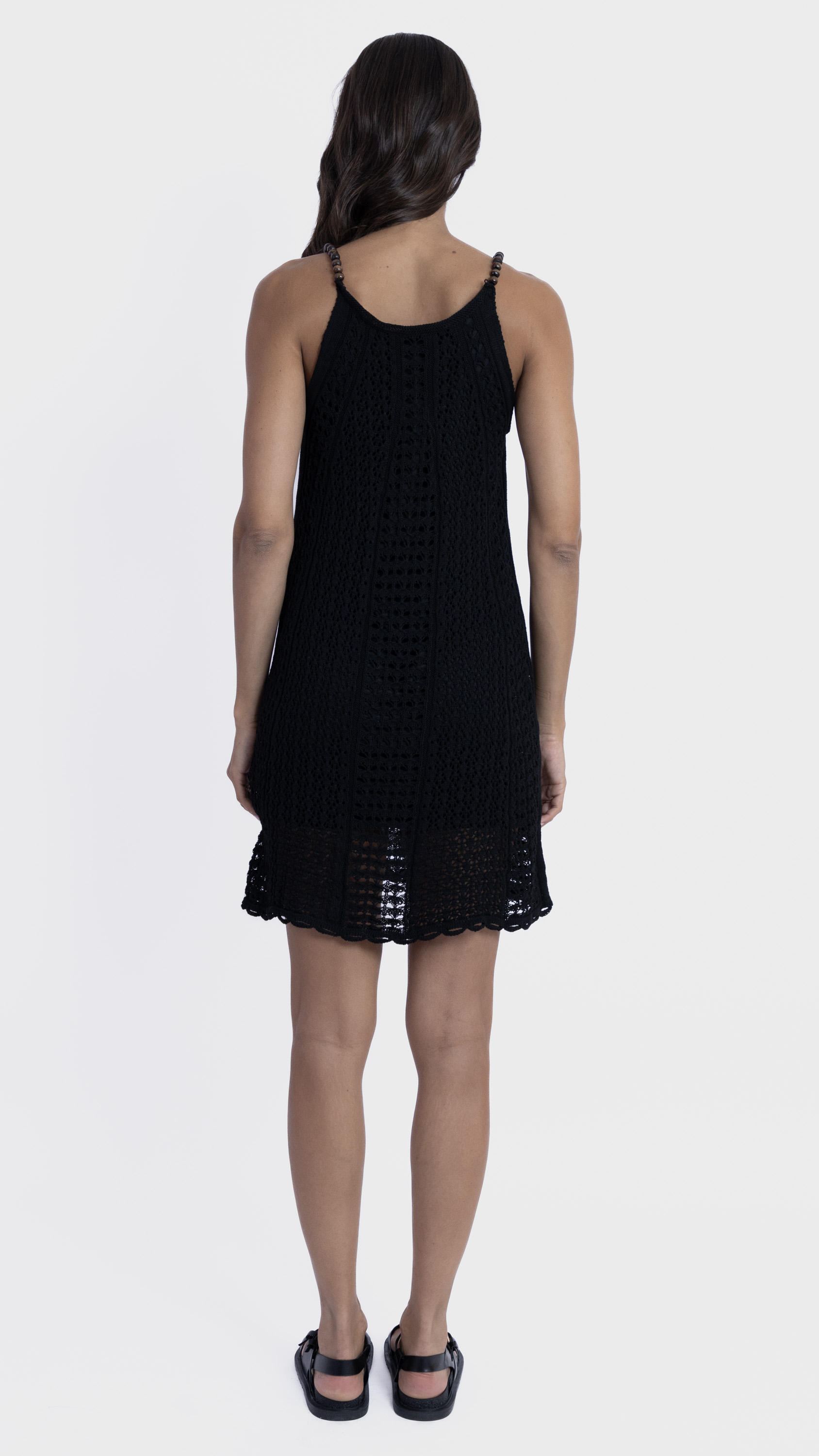 Turn heads in this elegant crochet maxi dress, crafted with intricate open-knit details and accented with chic black beaded straps for a breezy, sophisticated finish.