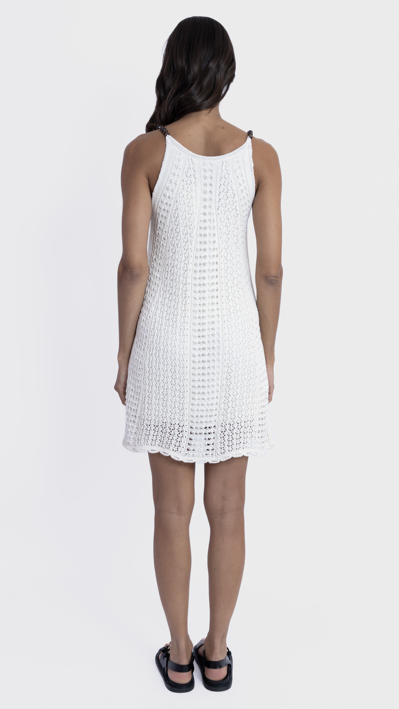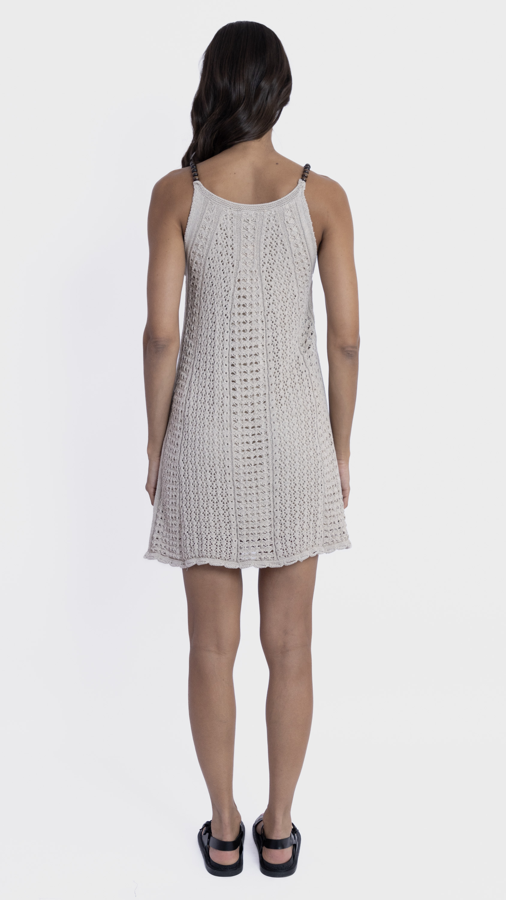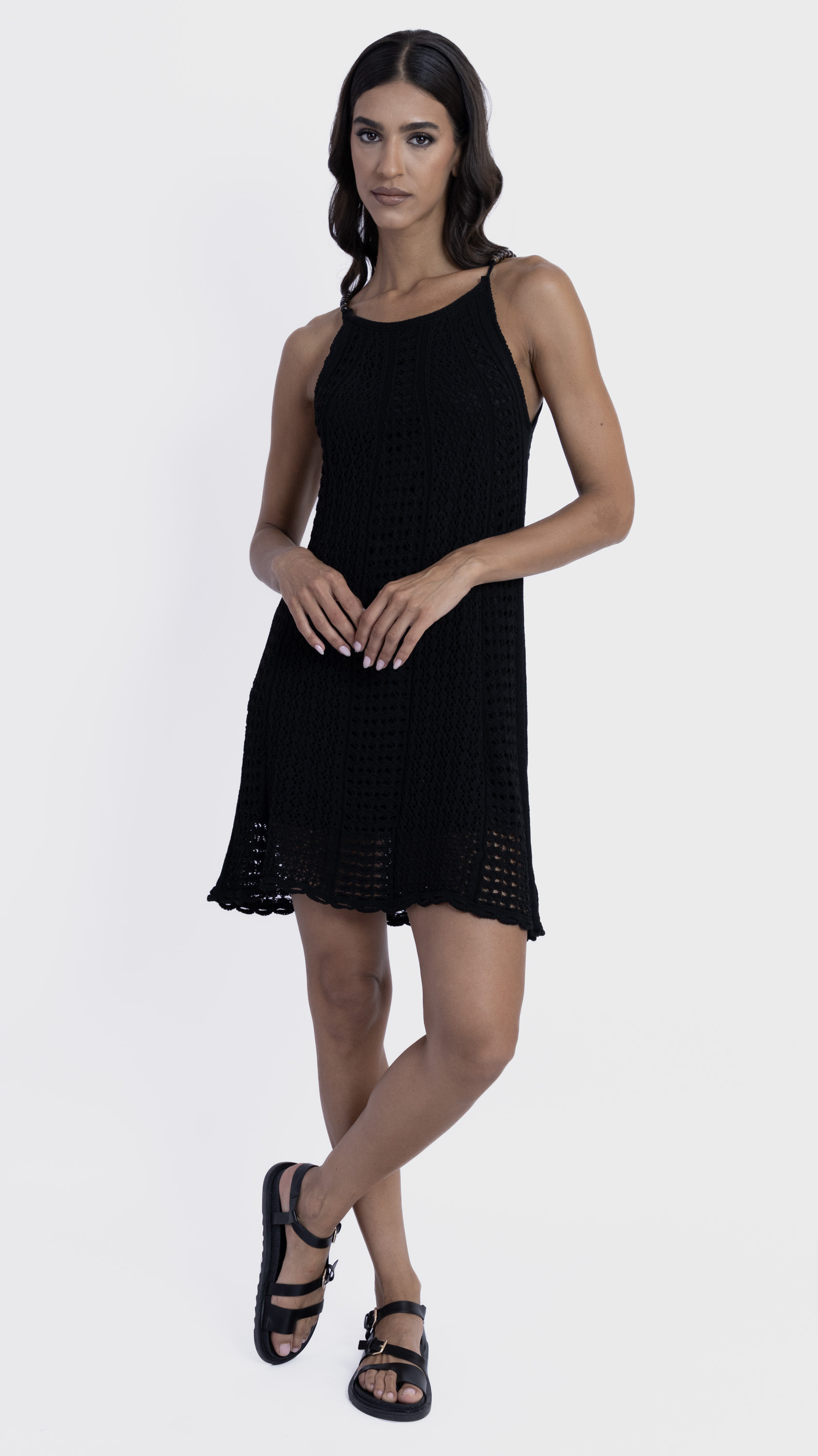 Turn heads in this elegant crochet maxi dress, crafted with intricate open-knit details and accented with chic black beaded straps for a breezy, sophisticated finish.