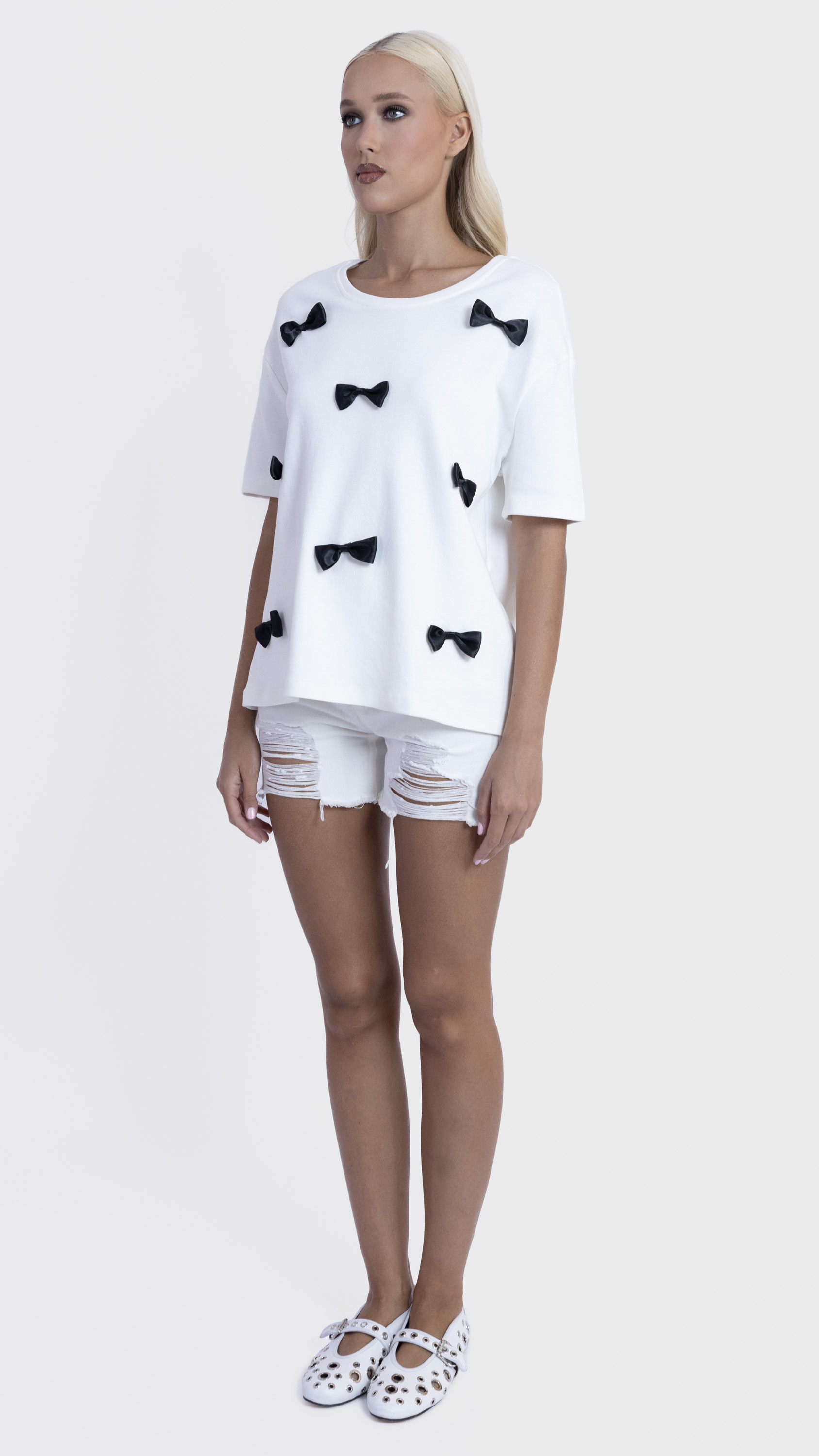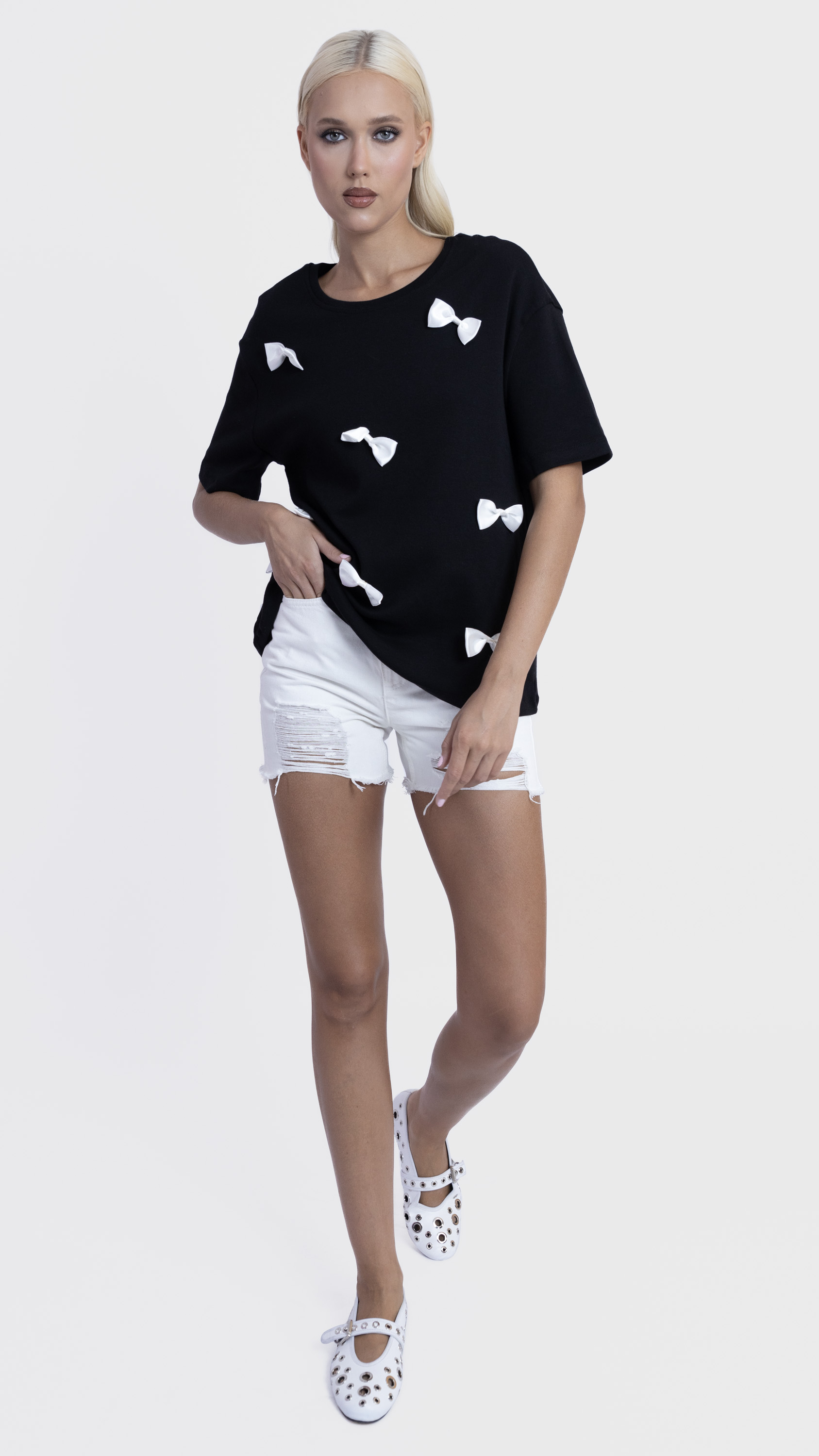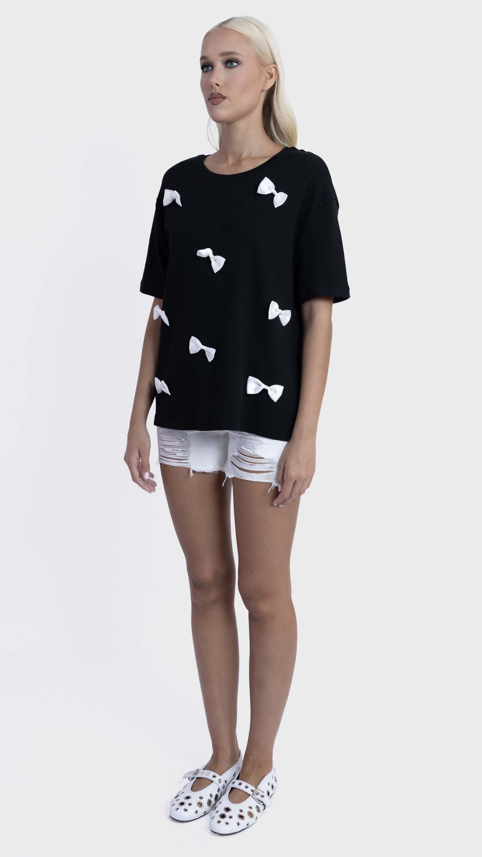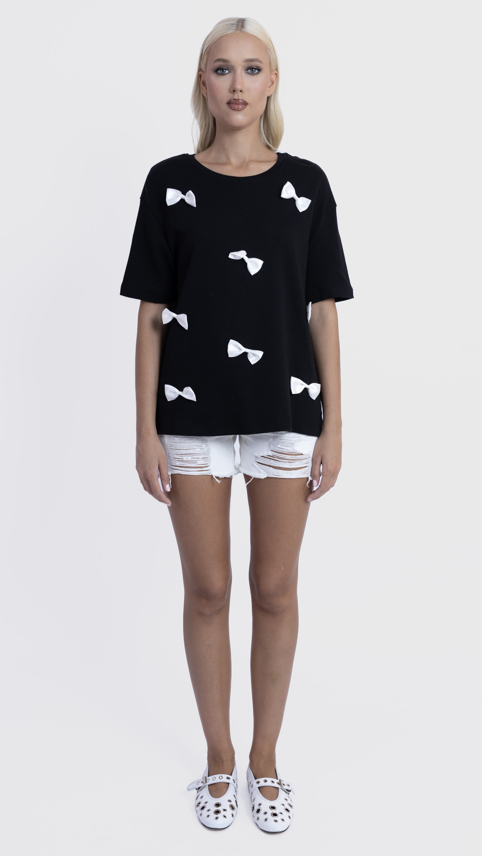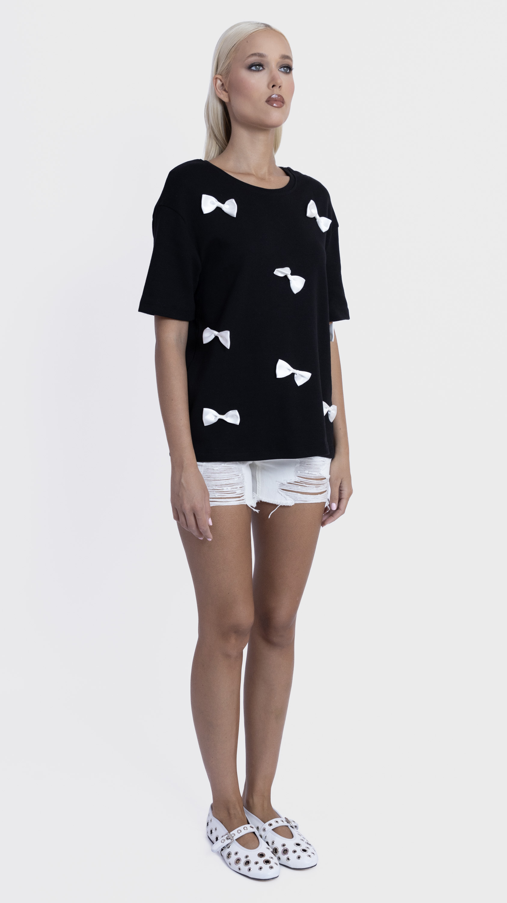Add a touch of charm to your casual wardrobe with this T-shirt, featuring playful black bow appliqués all over.