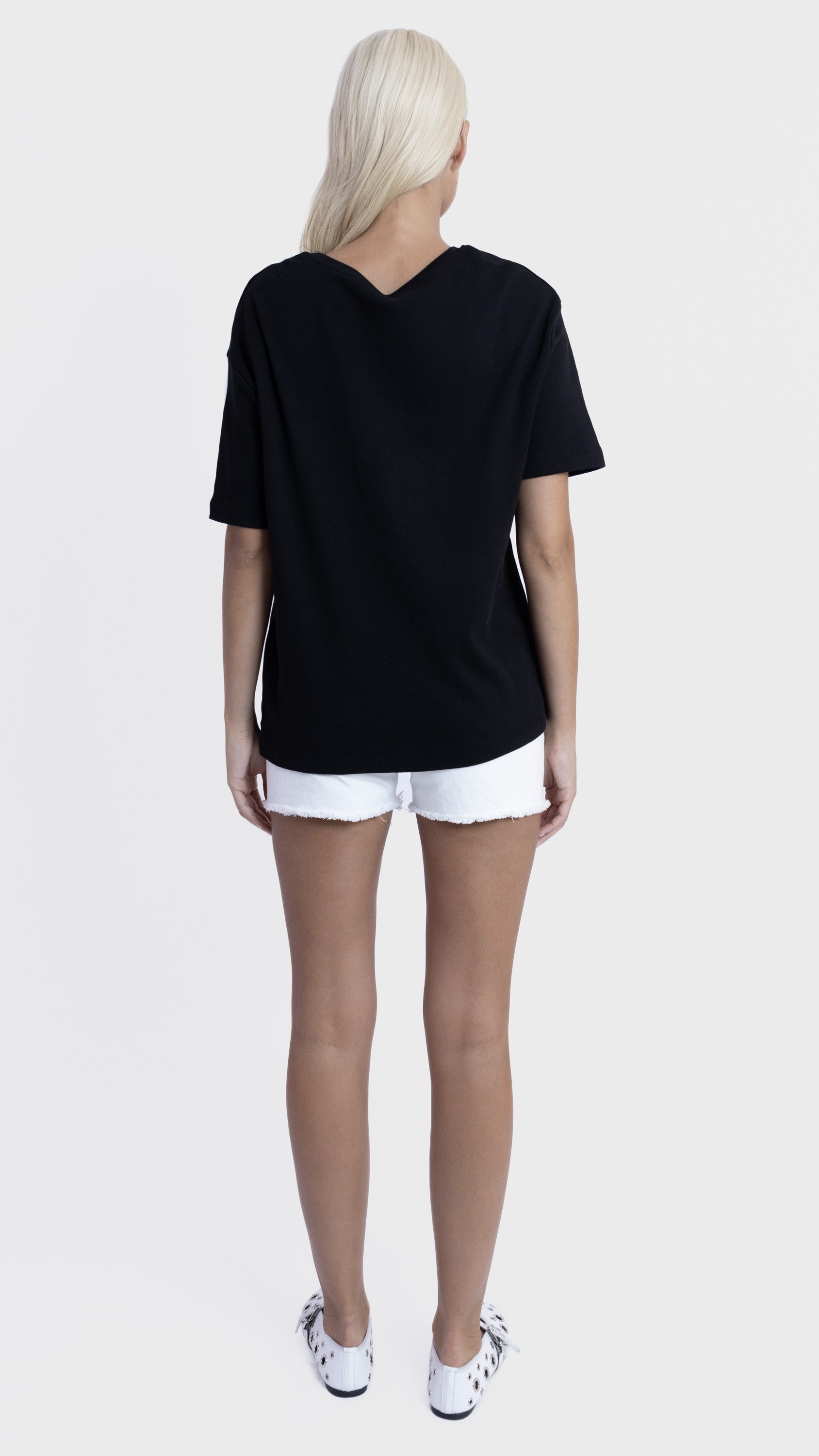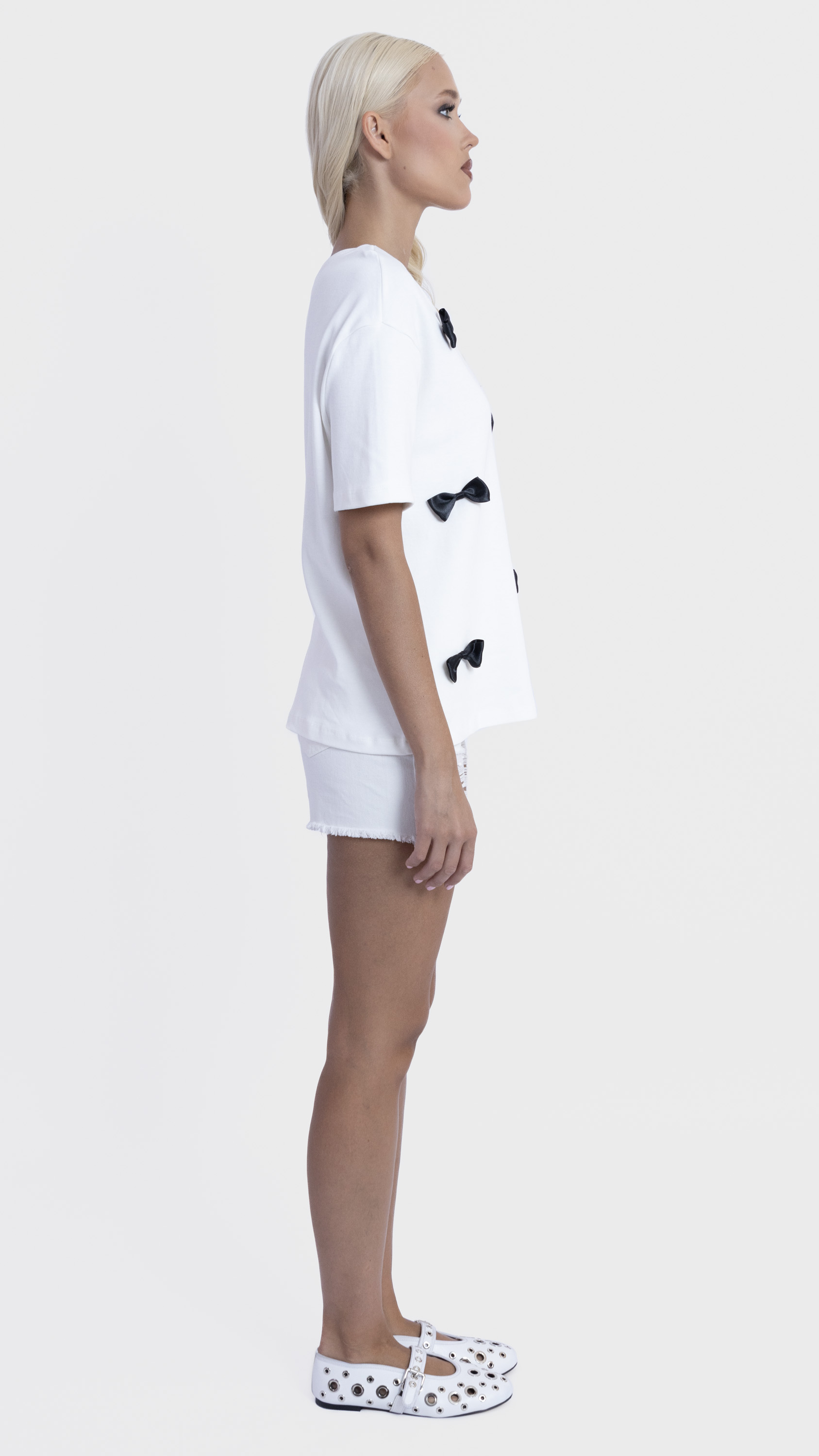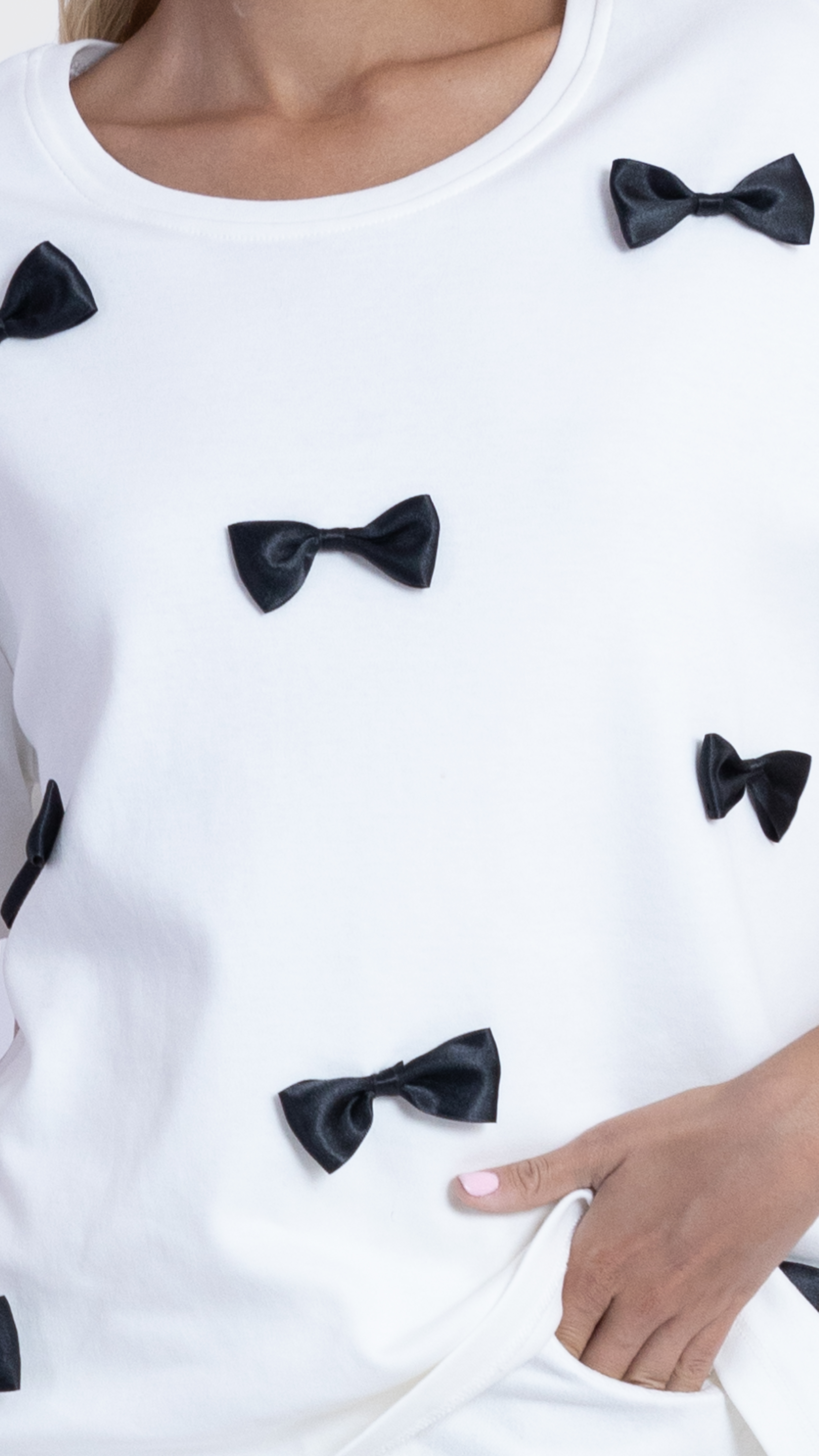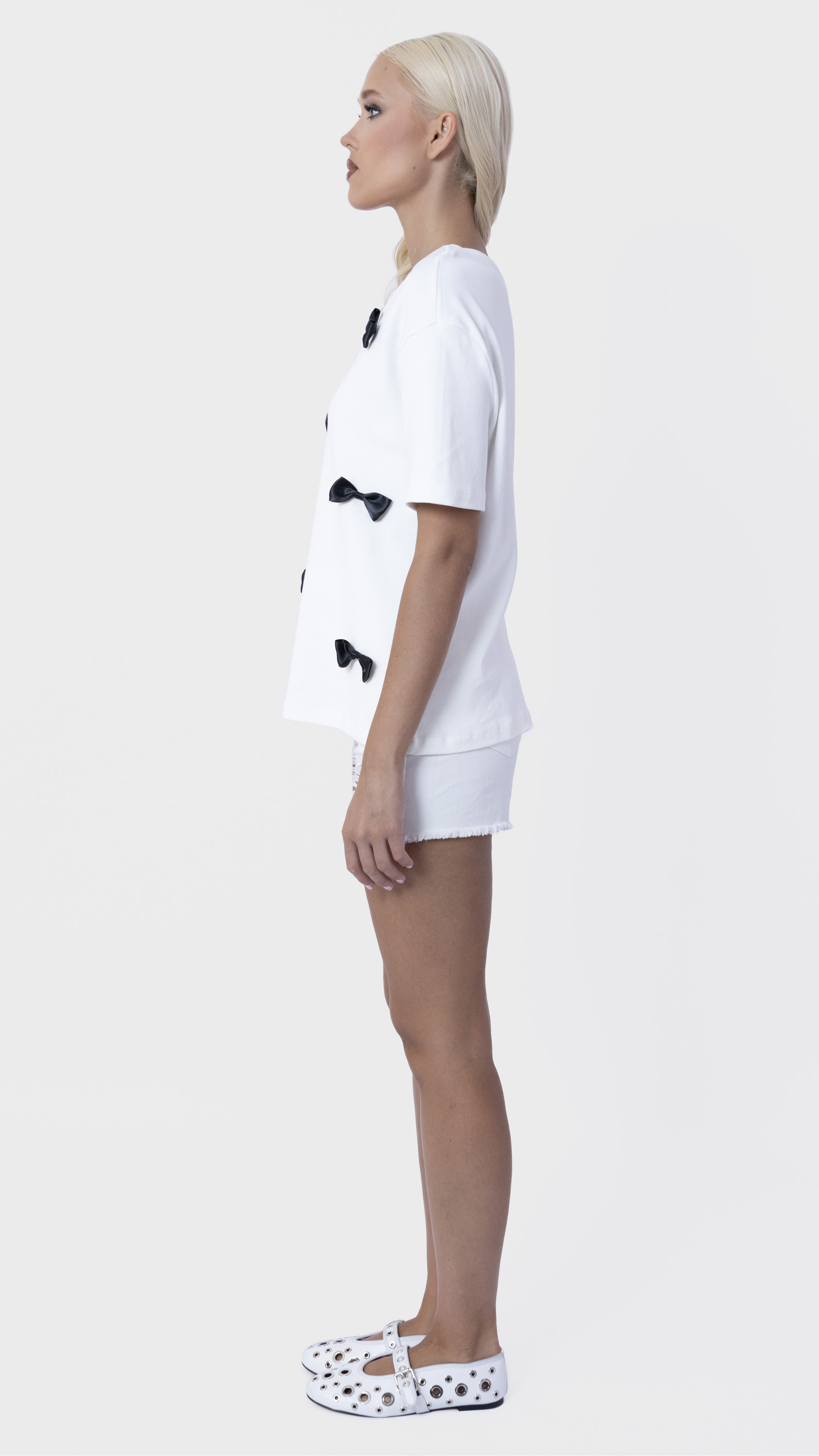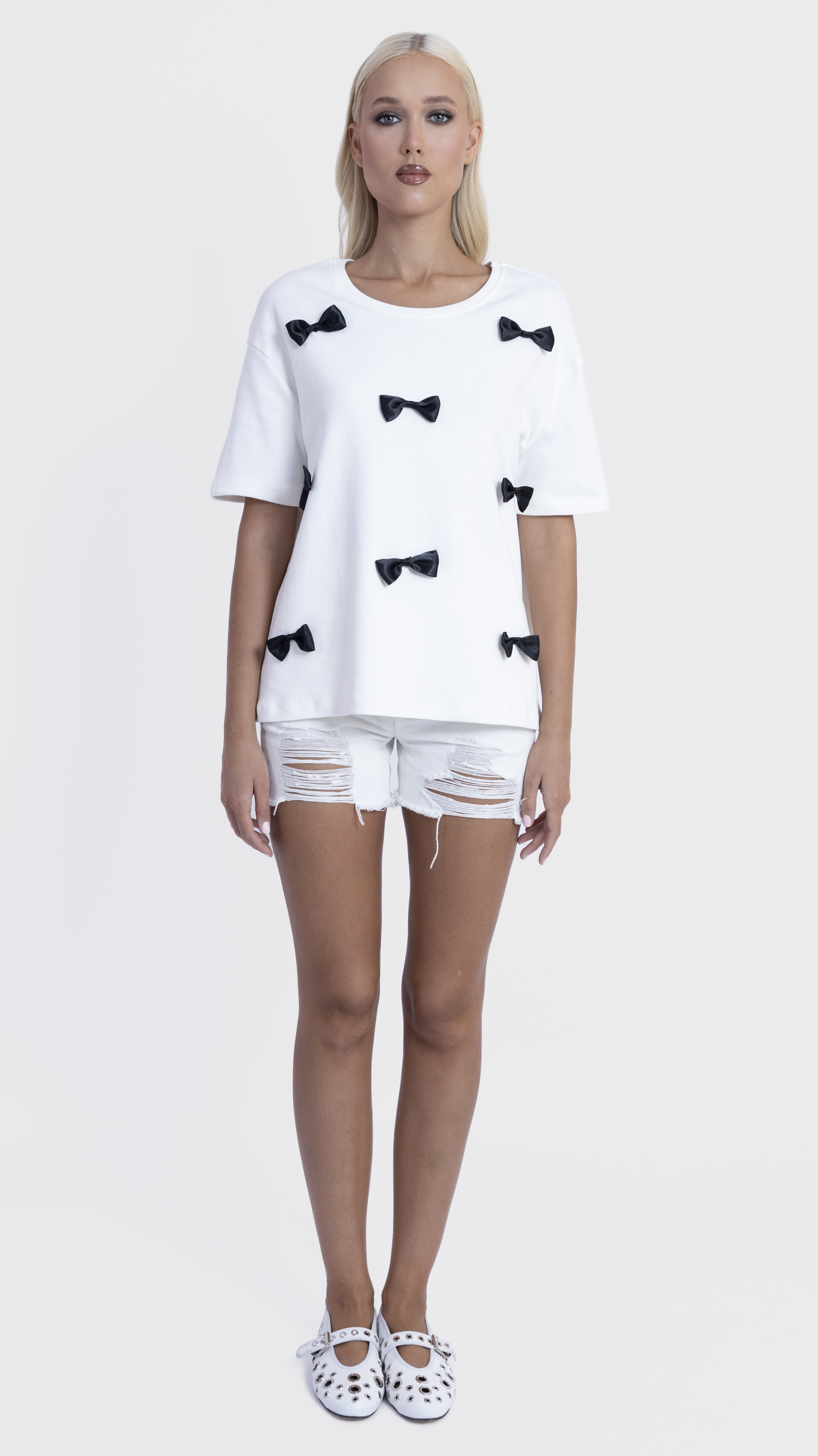 Add a touch of charm to your casual wardrobe with this T-shirt, featuring playful black bow appliqués all over.