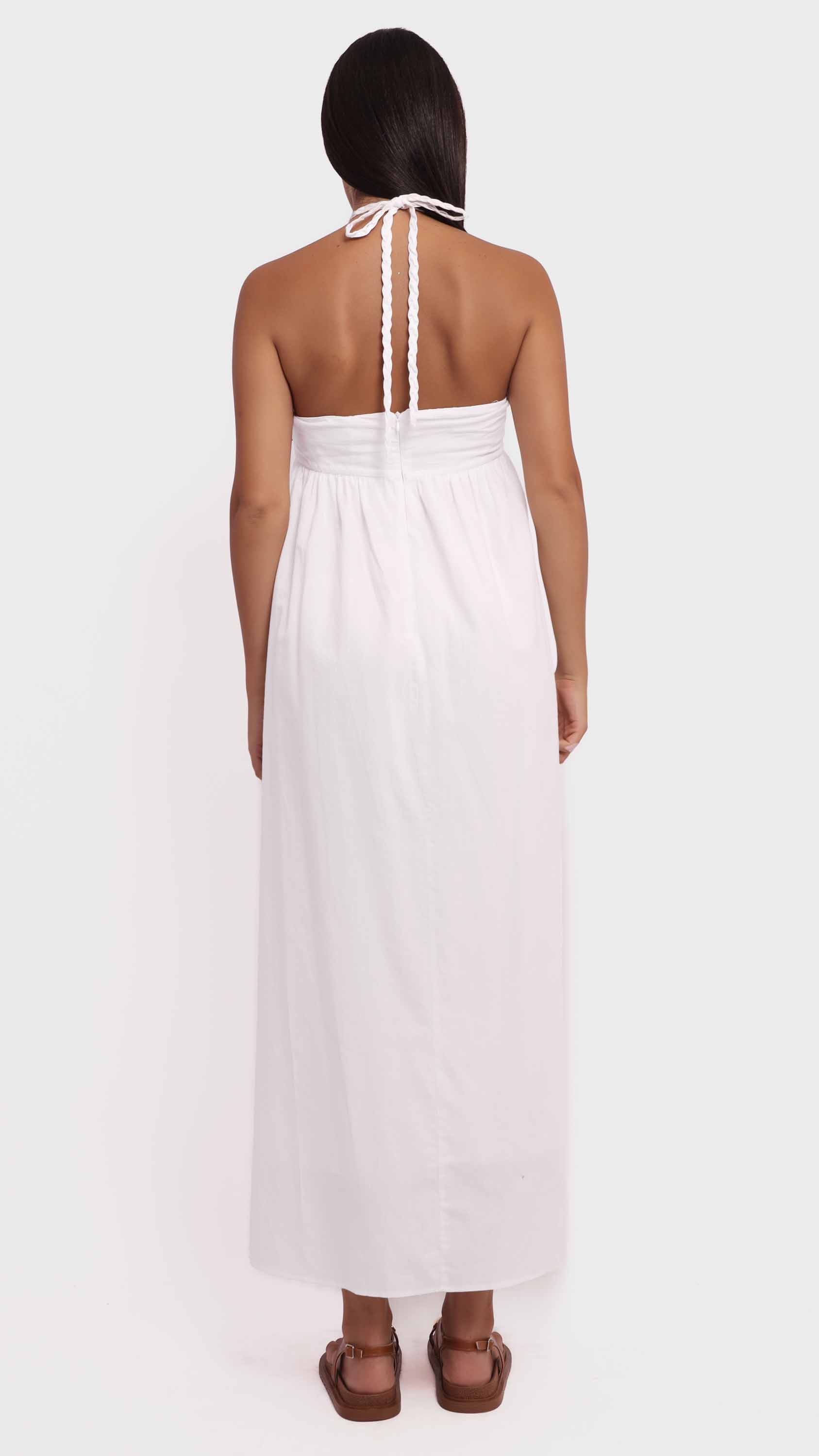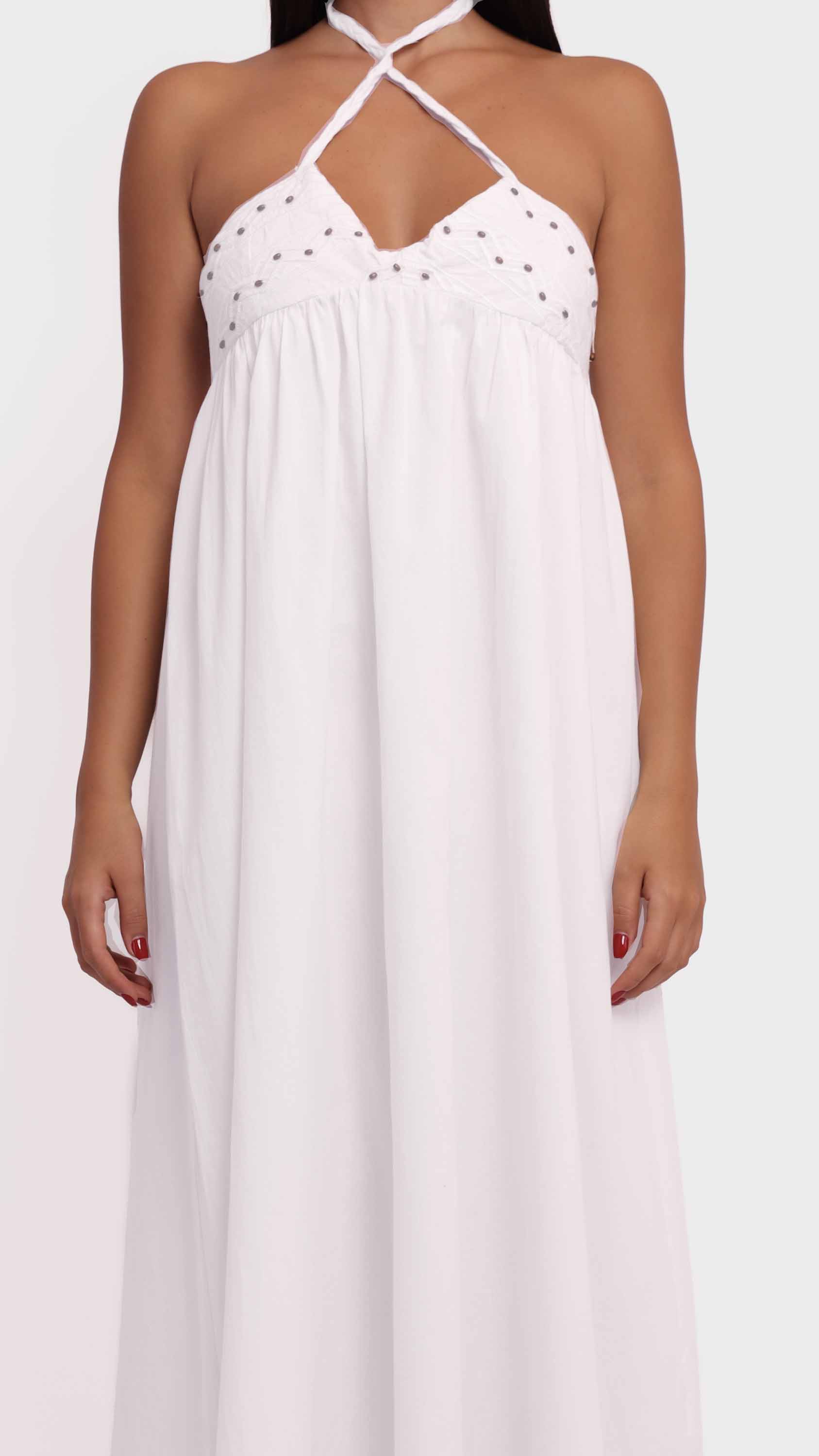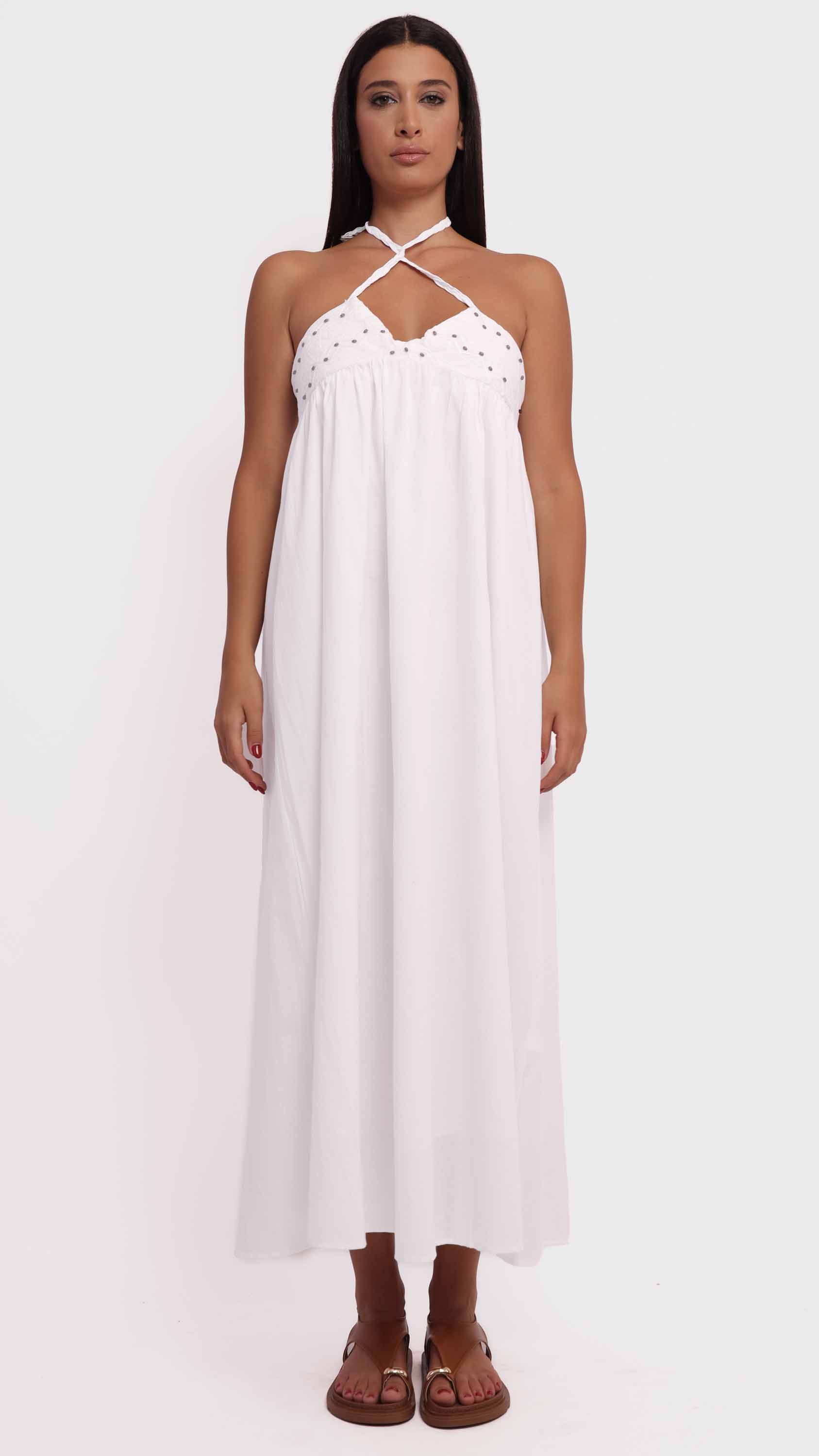 Channel effortless summer charm with this embroidered halter maxi dress. Designed with a flowing A-line silhouette and an empire waistline, it features a halter neckline with braided straps and a delicately embroidered bodice accented by small black dots. Crafted from lightweight, breathable fabric, its backless, minimally structured design makes it perfect for warm-weather outings, beach days, or casual summer events.