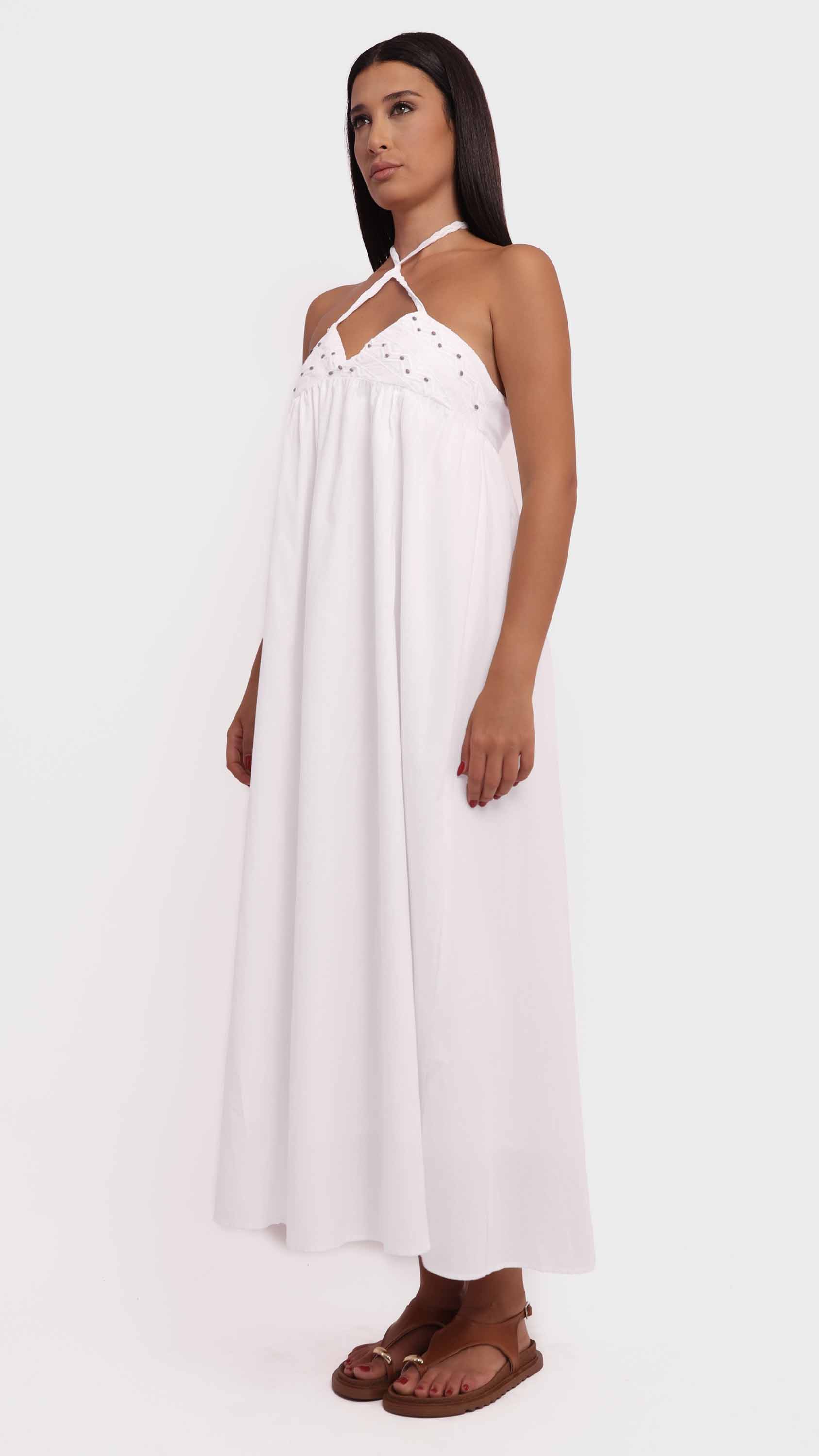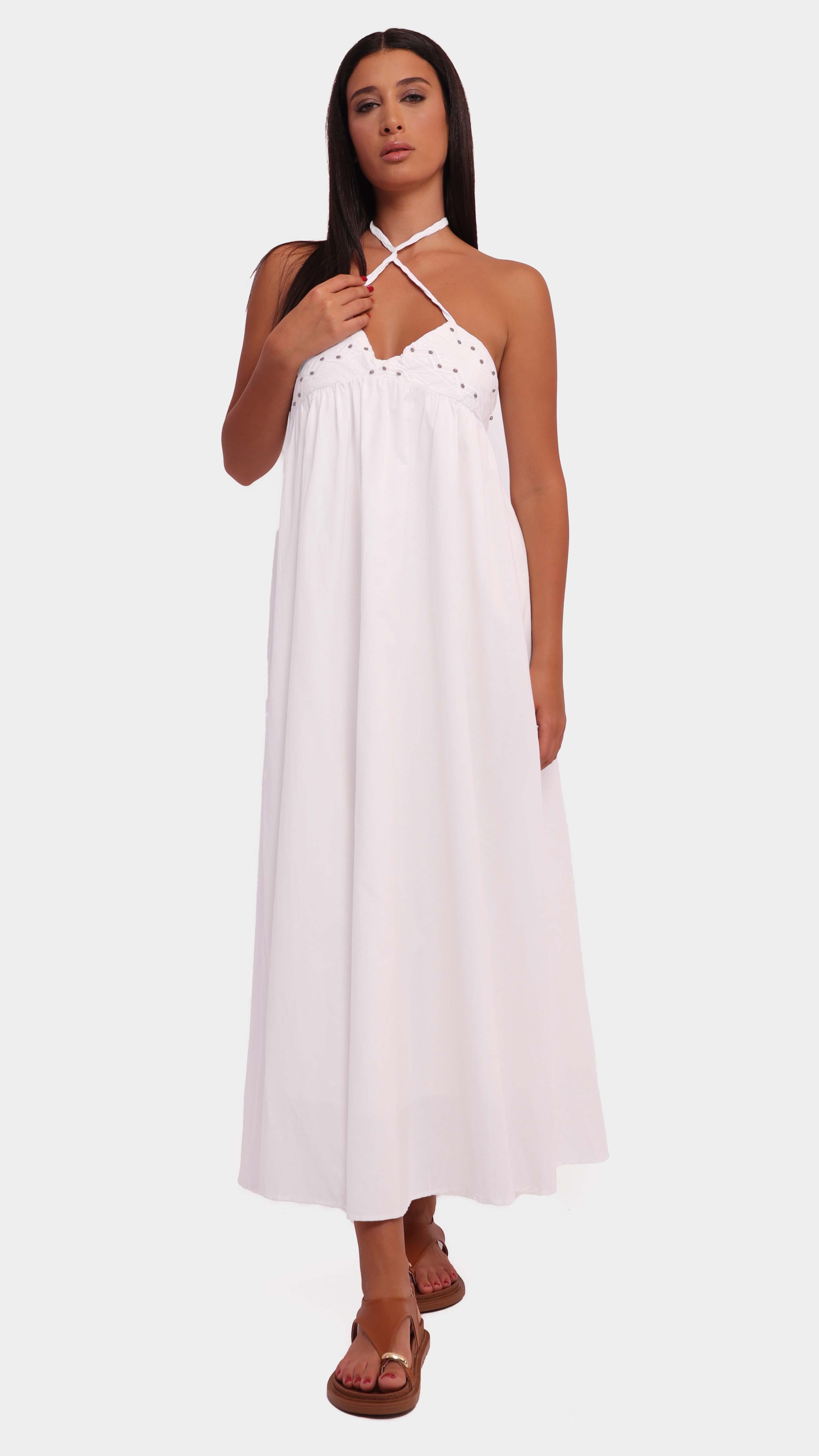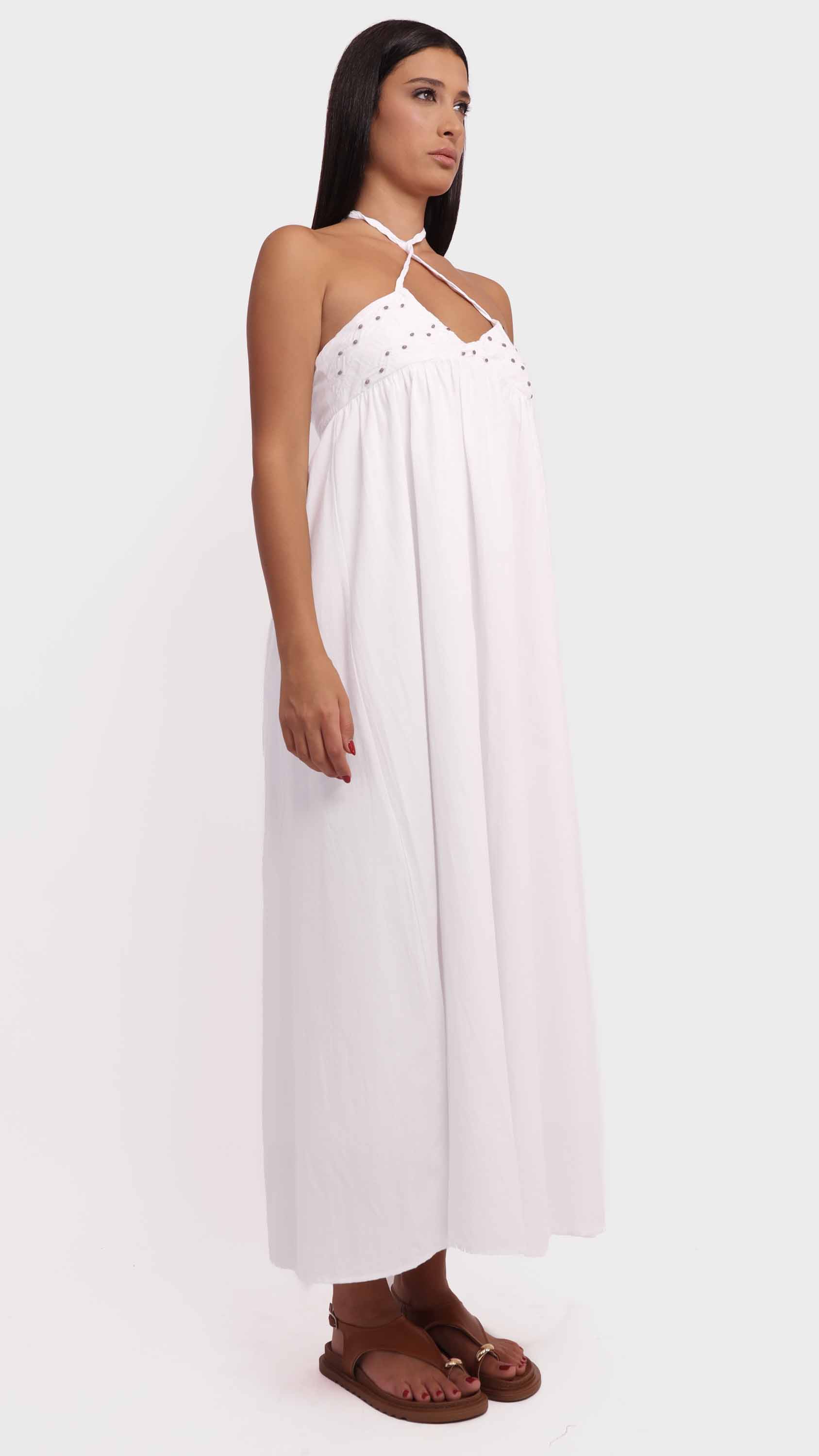 Channel effortless summer charm with this embroidered halter maxi dress. Designed with a flowing A-line silhouette and an empire waistline, it features a halter neckline with braided straps and a delicately embroidered bodice accented by small black dots. Crafted from lightweight, breathable fabric, its backless, minimally structured design makes it perfect for warm-weather outings, beach days, or casual summer events.