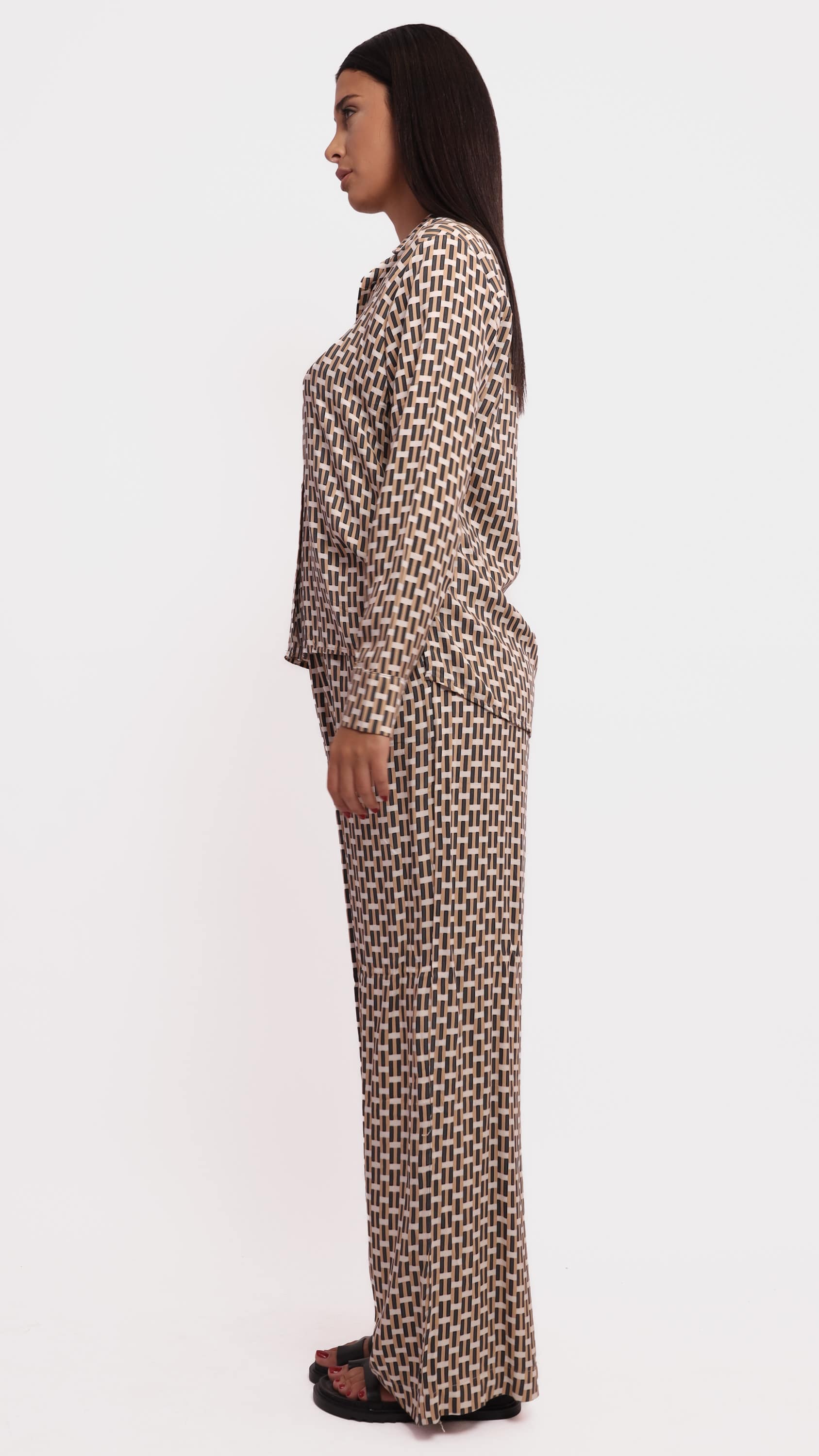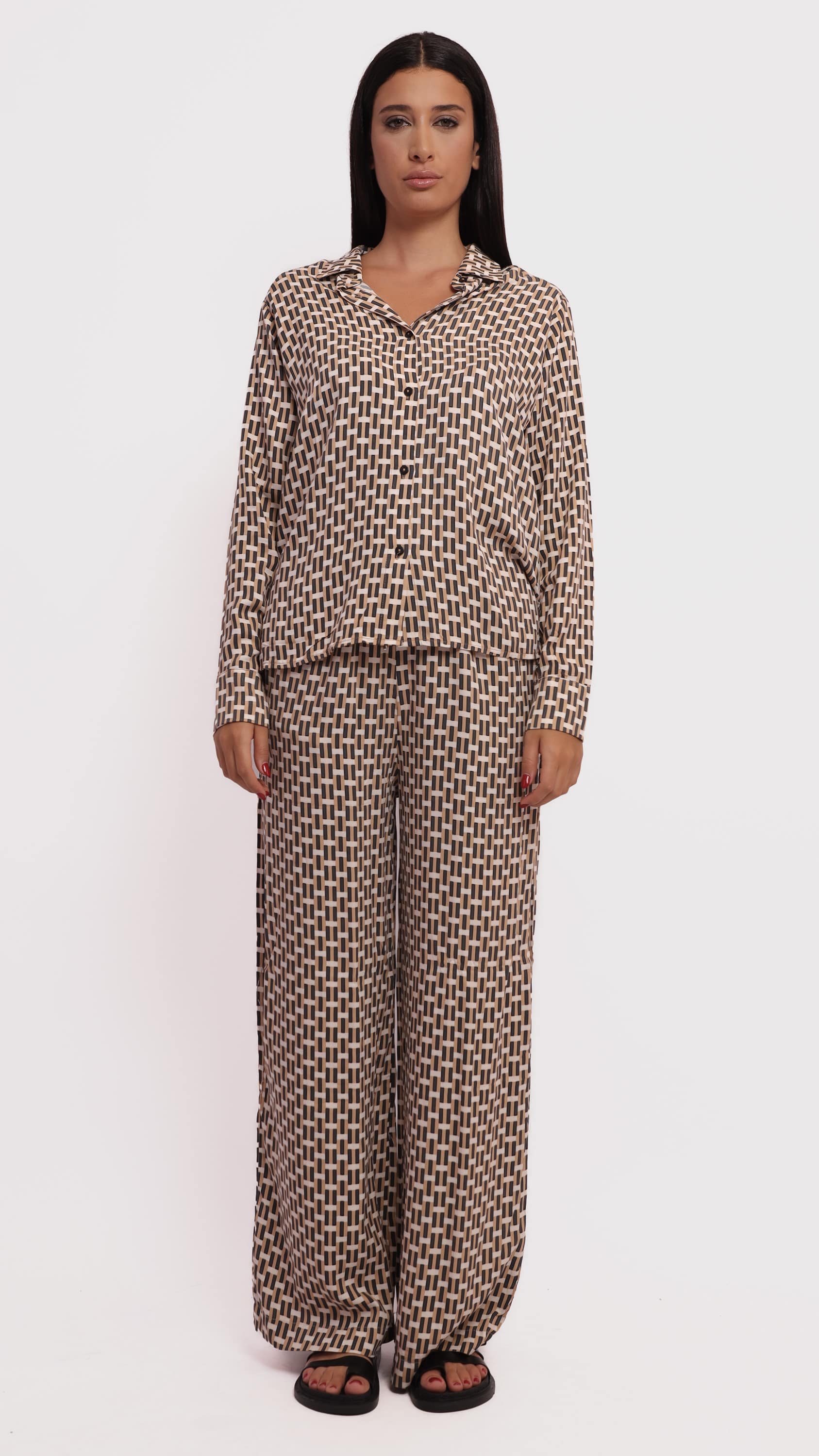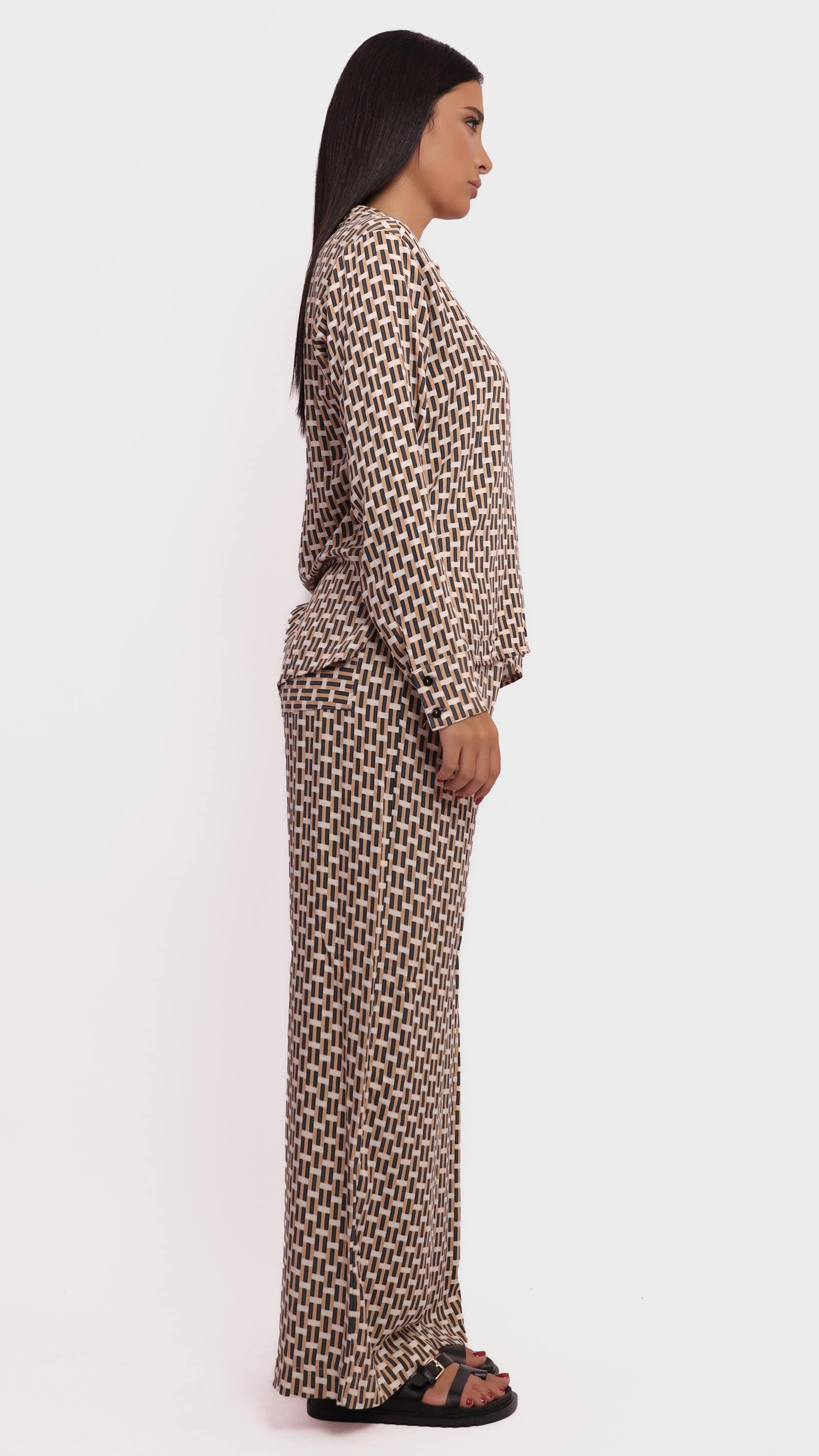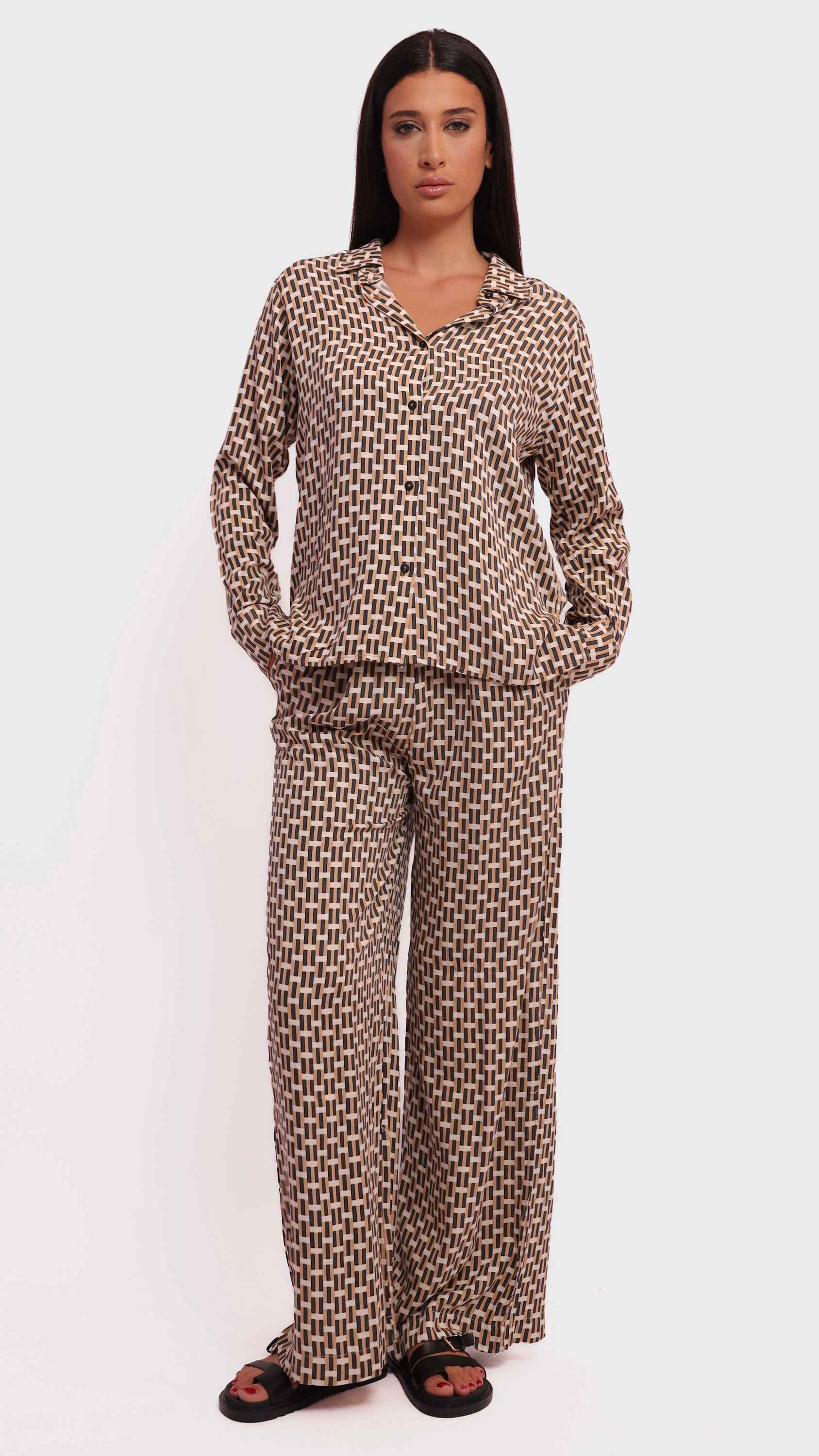 This long sleeve jumpsuit features a bold geometric print in black and brown on a soft cream base. Designed with a collared neckline, buttoned cuffs, and a flattering elastic waist, it combines structured elegance with effortless comfort. The wide-leg silhouette adds movement and style, perfect for day-to-night wear.