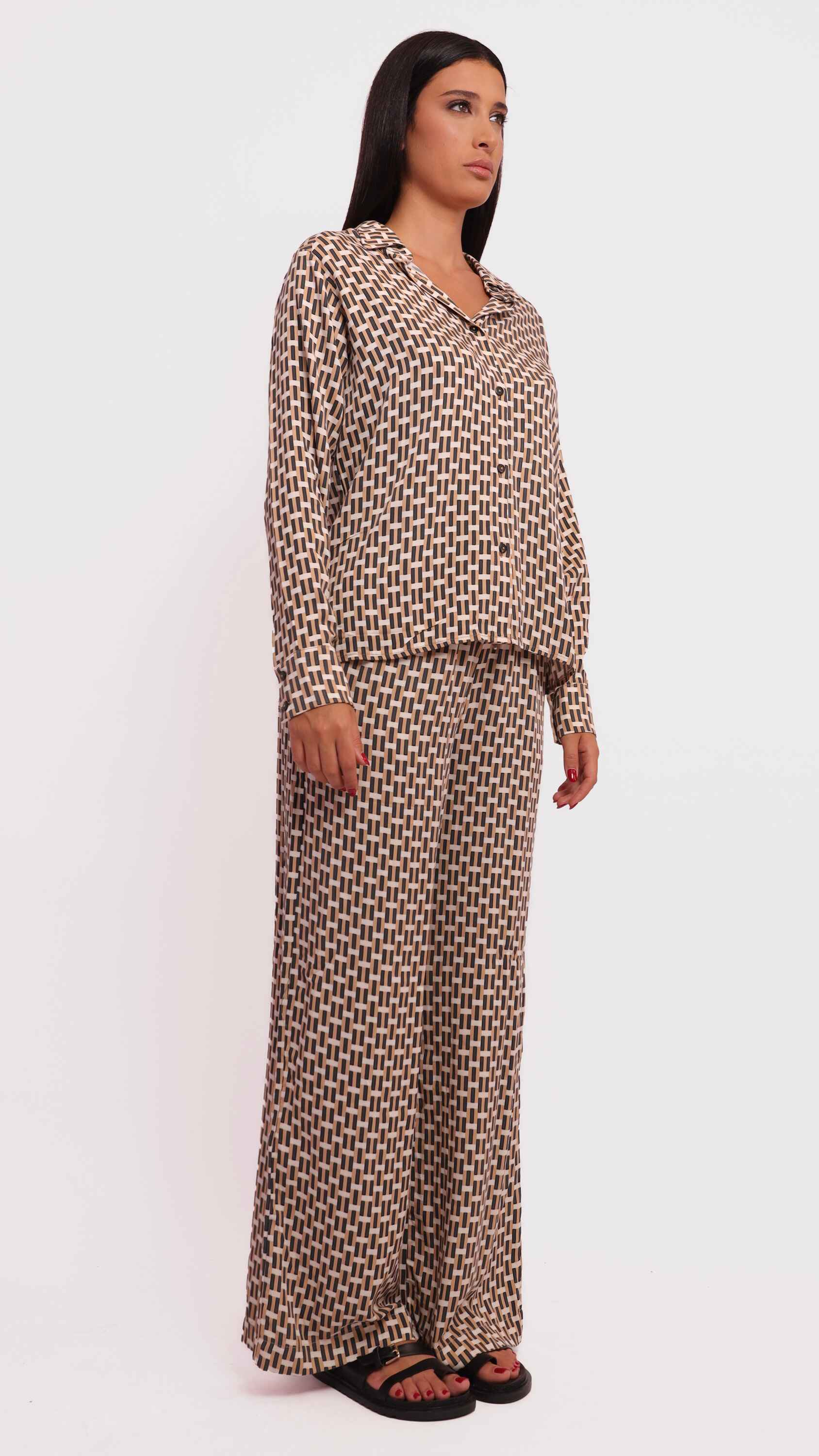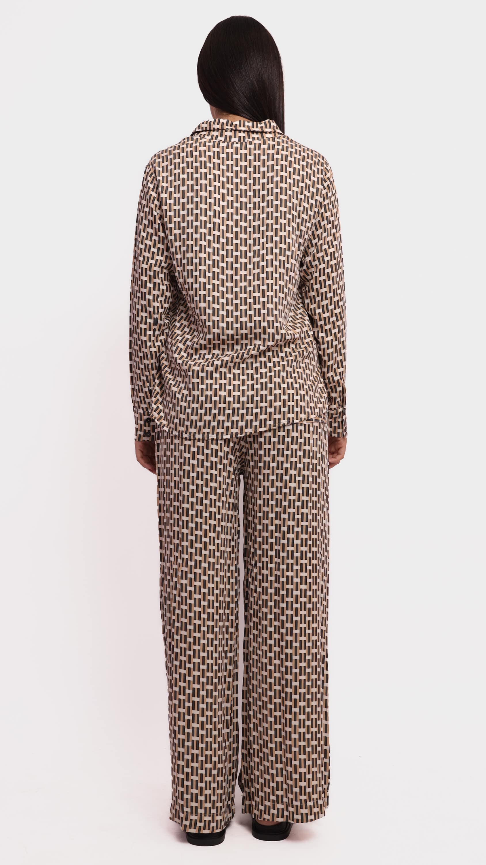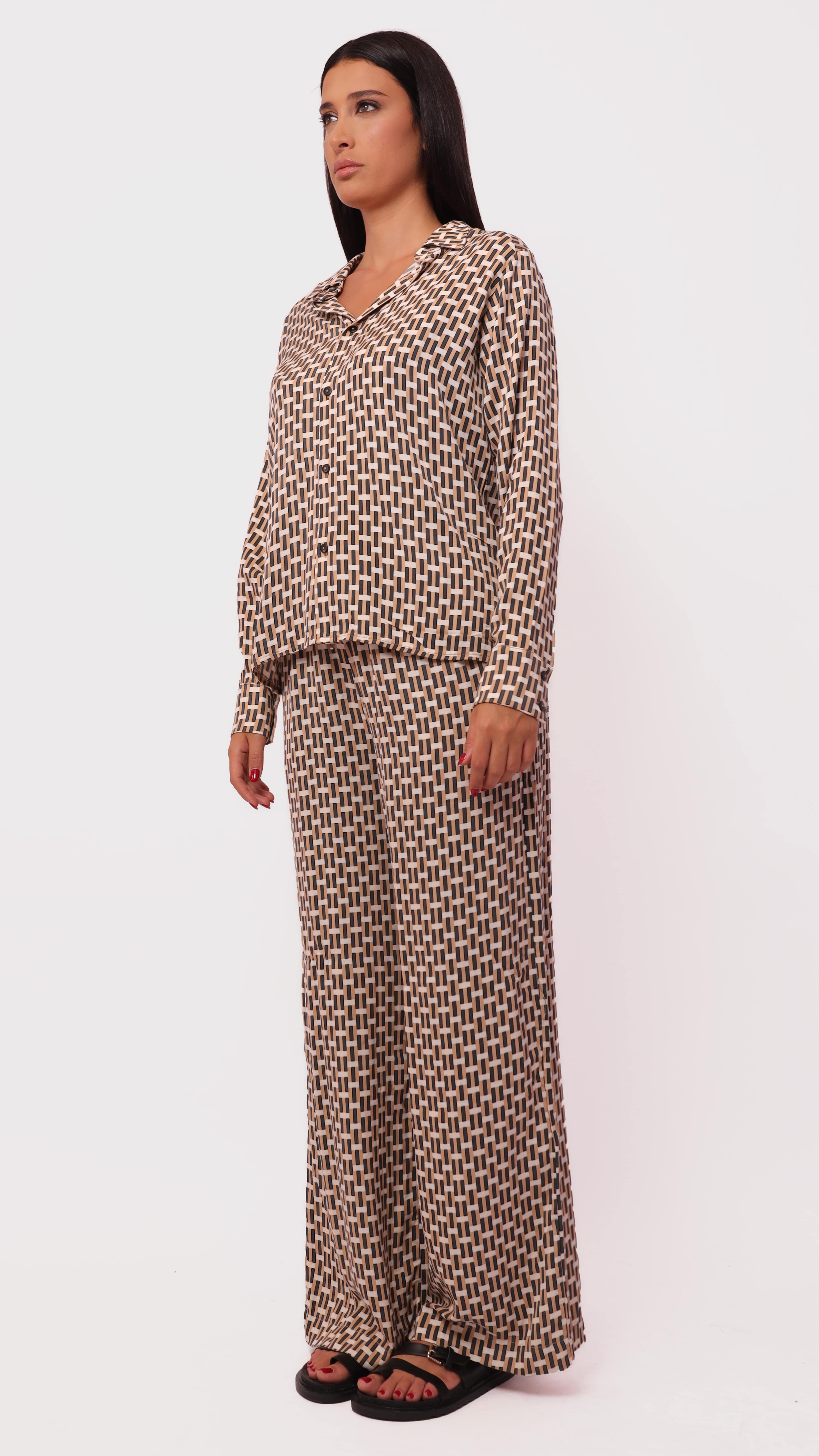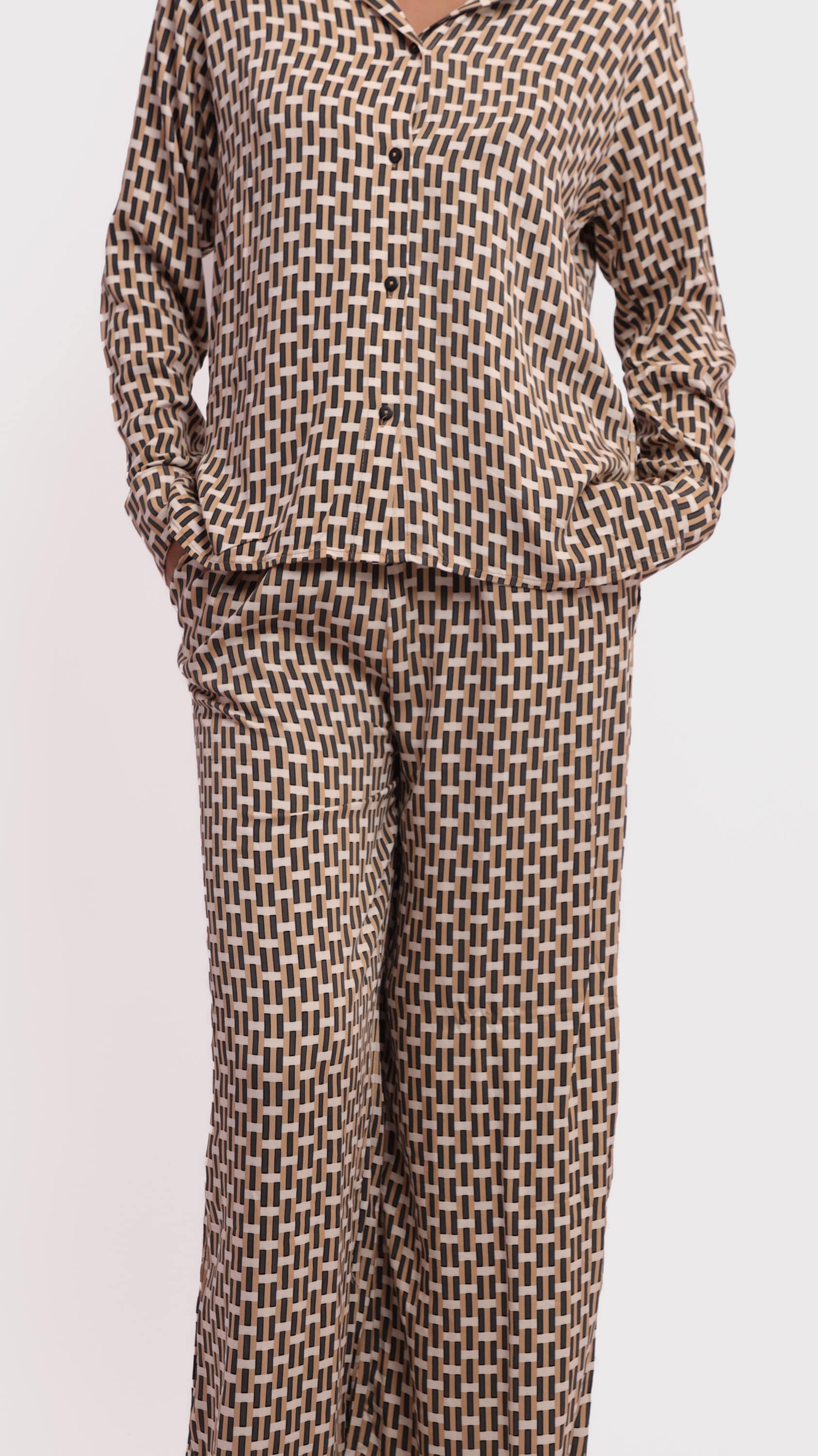 This long sleeve jumpsuit features a bold geometric print in black and brown on a soft cream base. Designed with a collared neckline, buttoned cuffs, and a flattering elastic waist, it combines structured elegance with effortless comfort. The wide-leg silhouette adds movement and style, perfect for day-to-night wear.