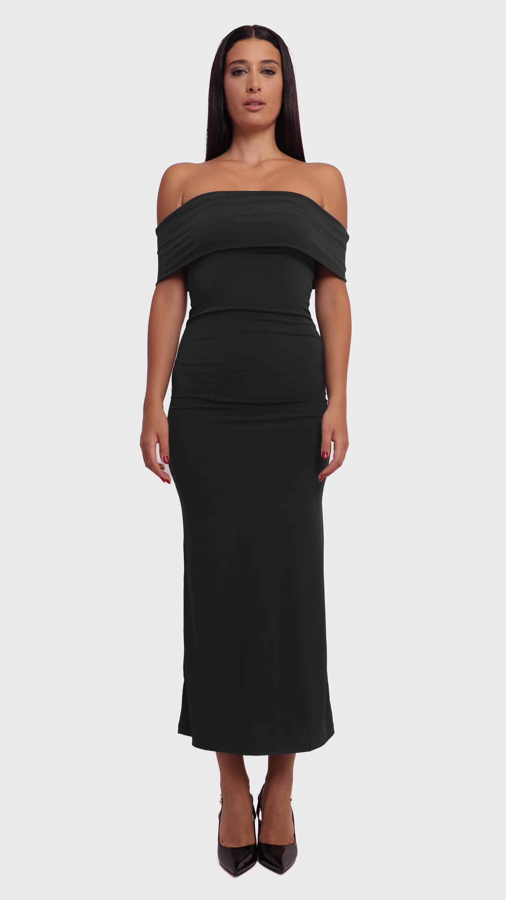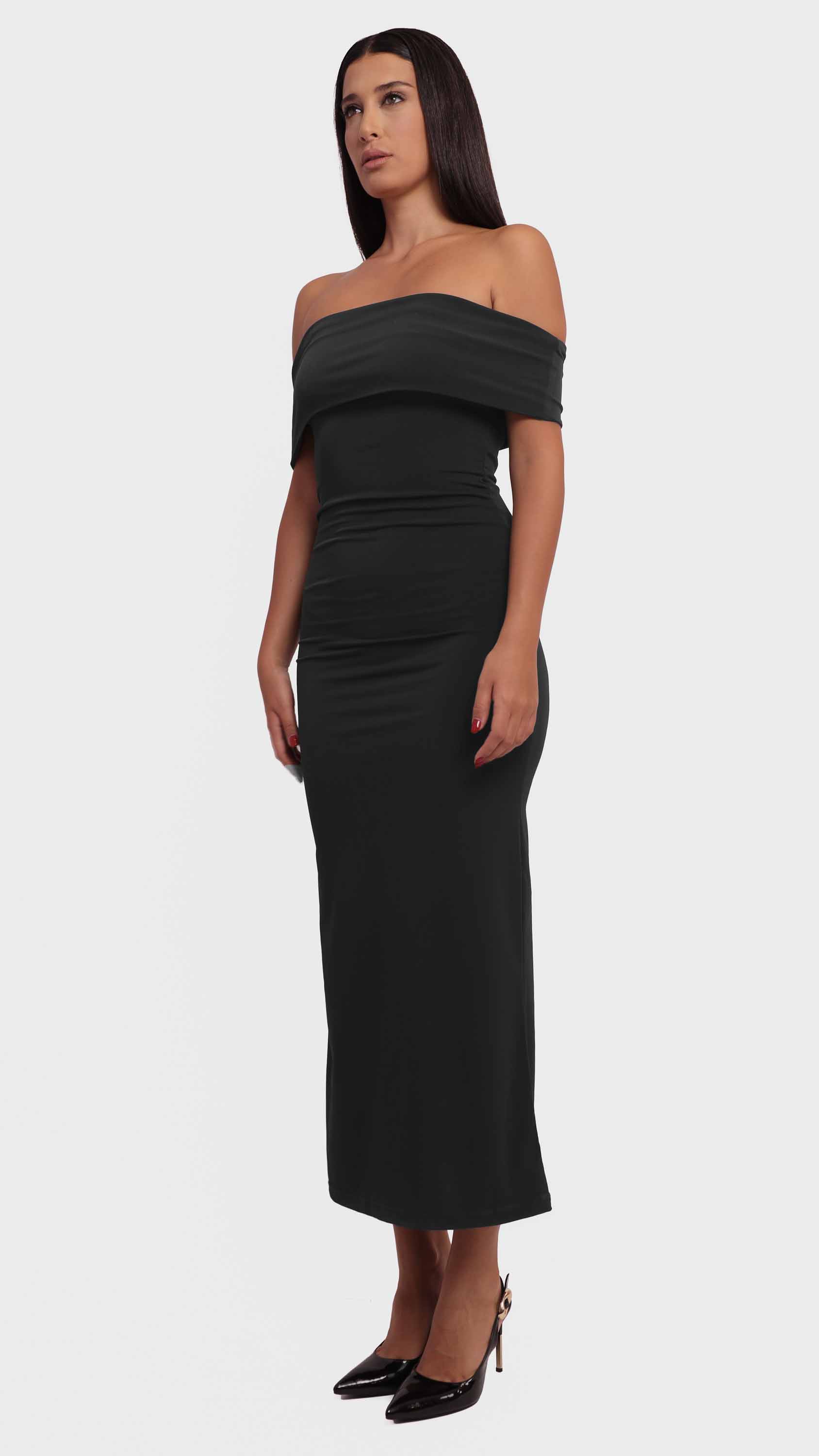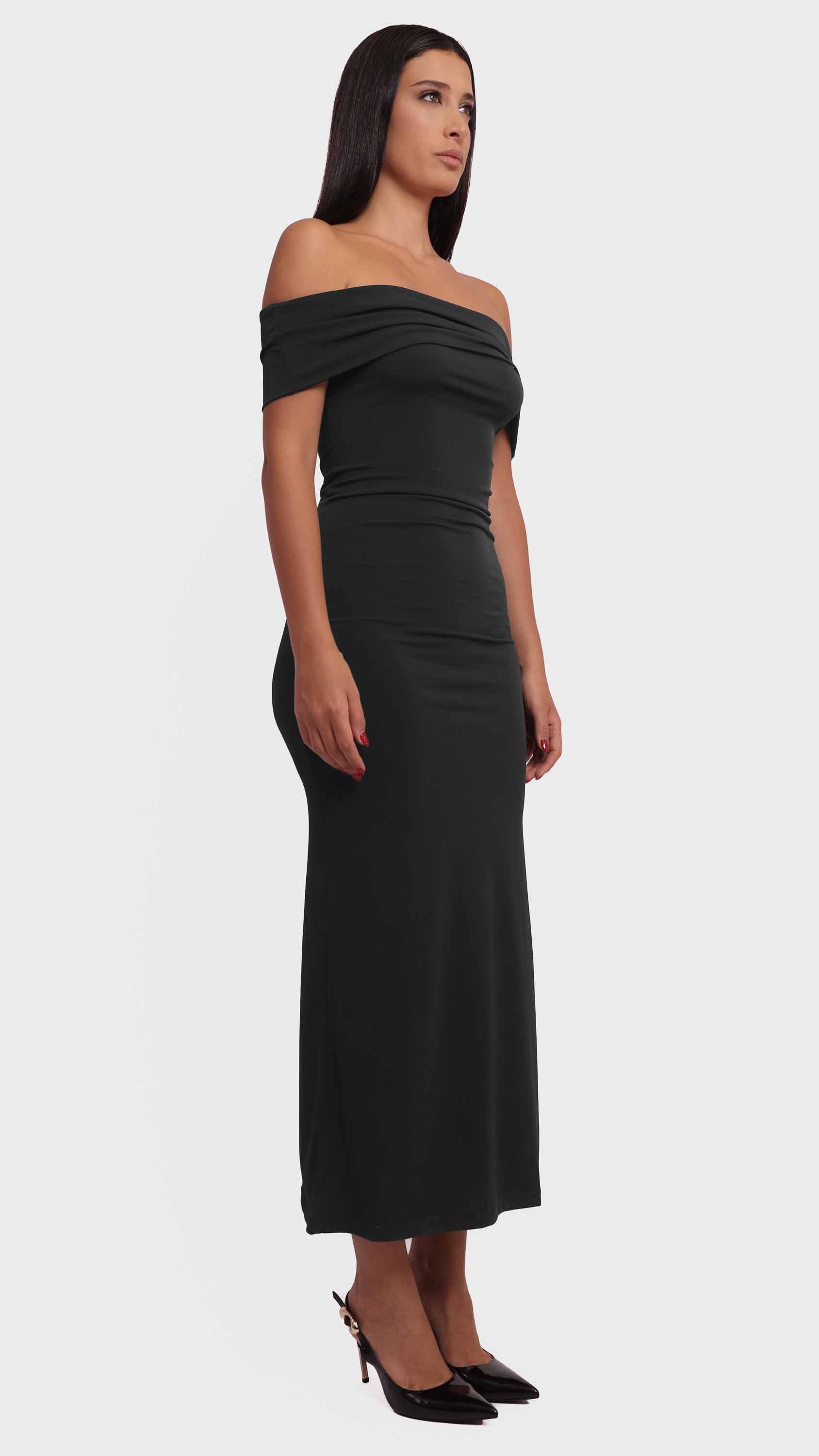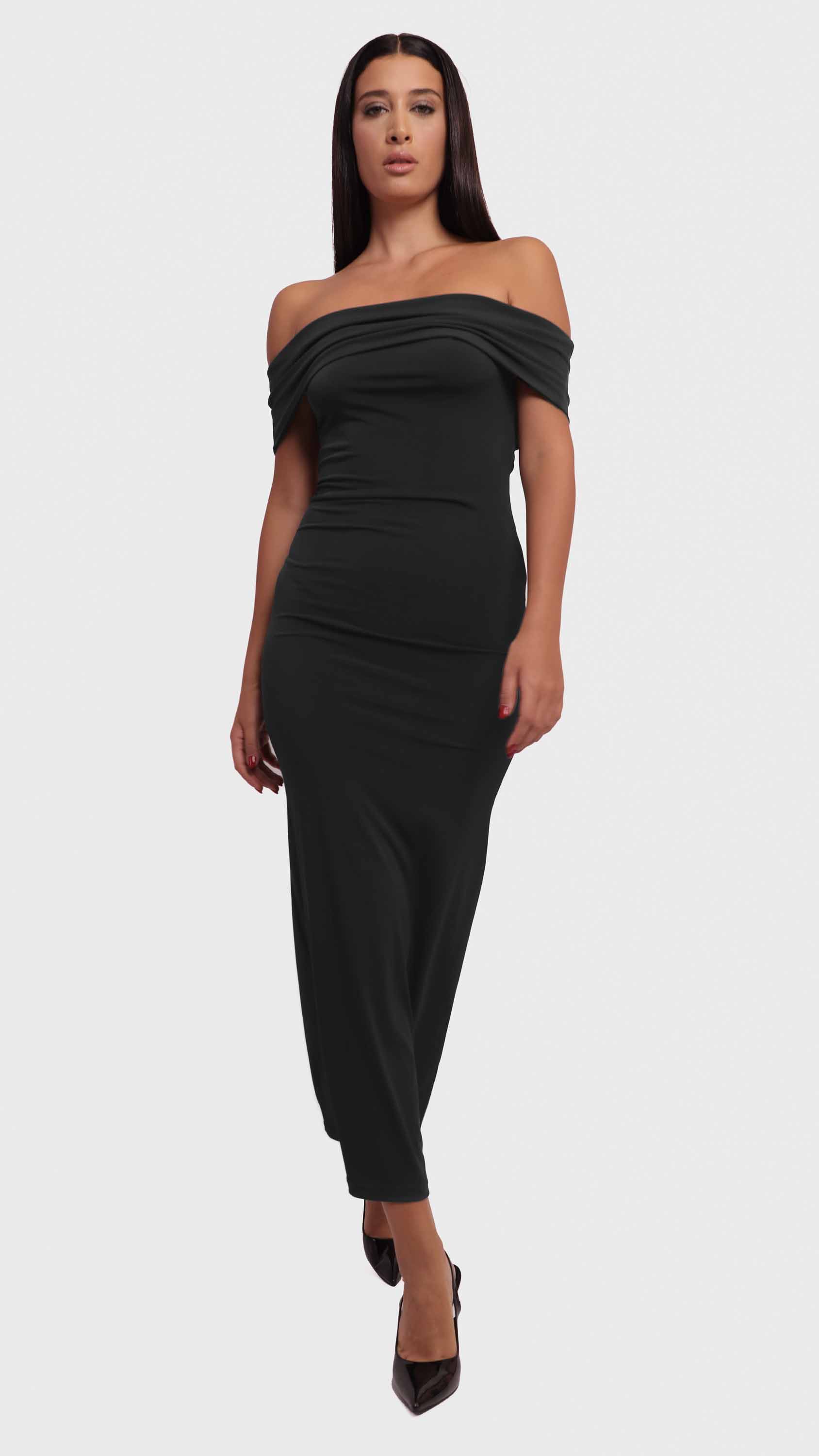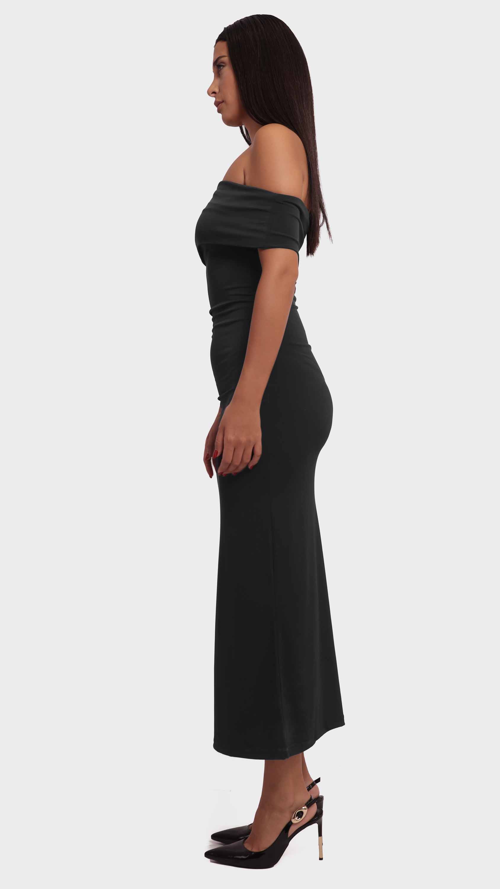 Show off your silhouette with this off-shoulder maxi dress, designed for sleek elegance and timeless charm.