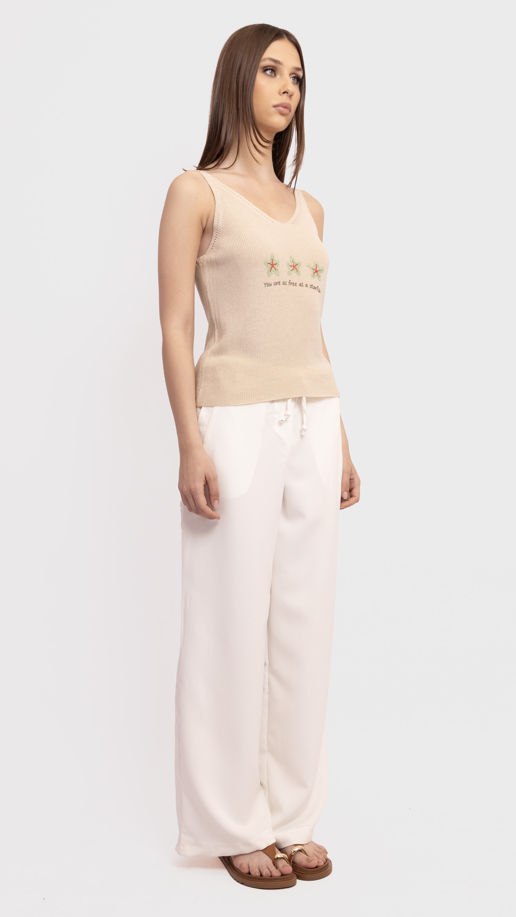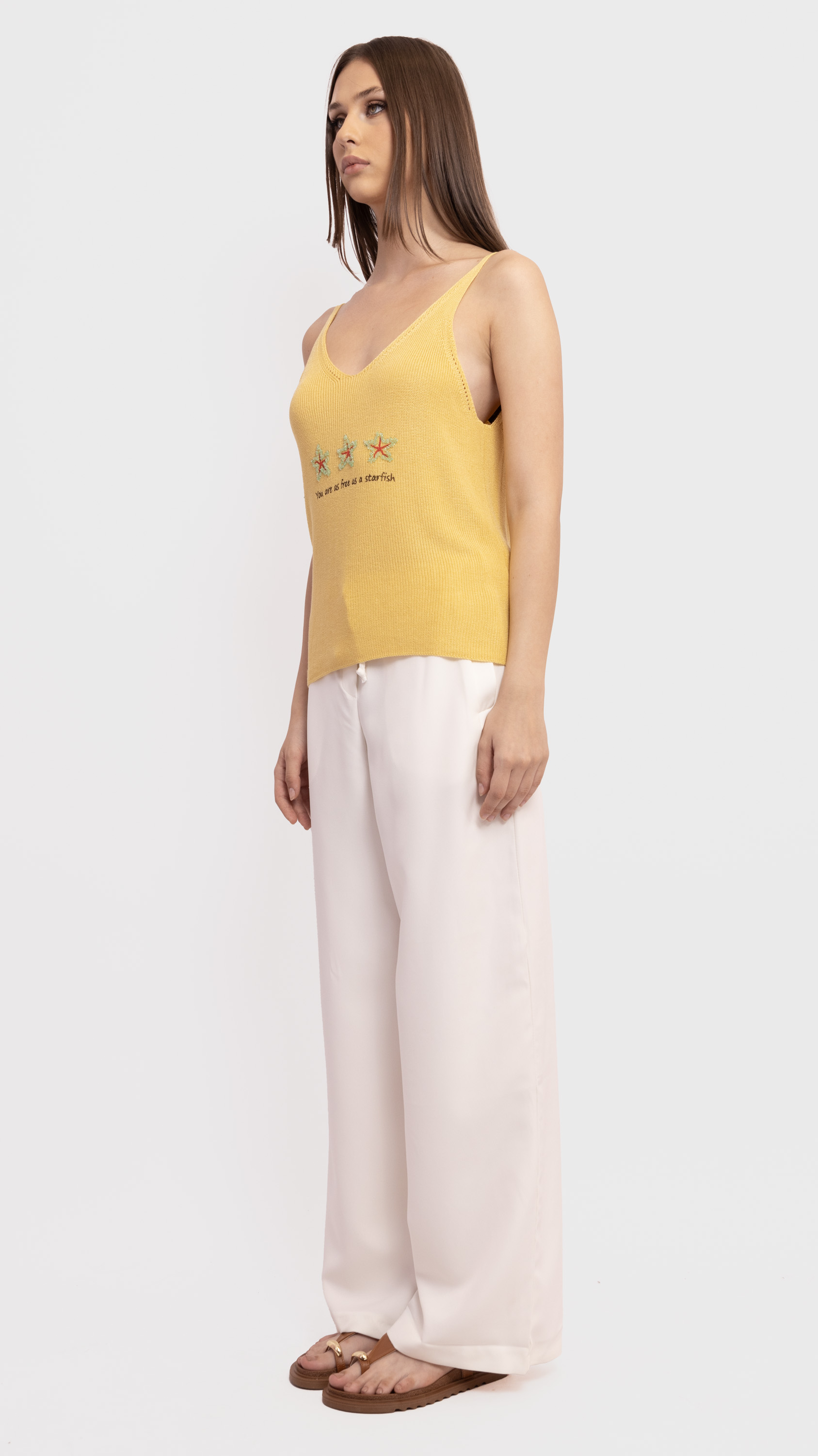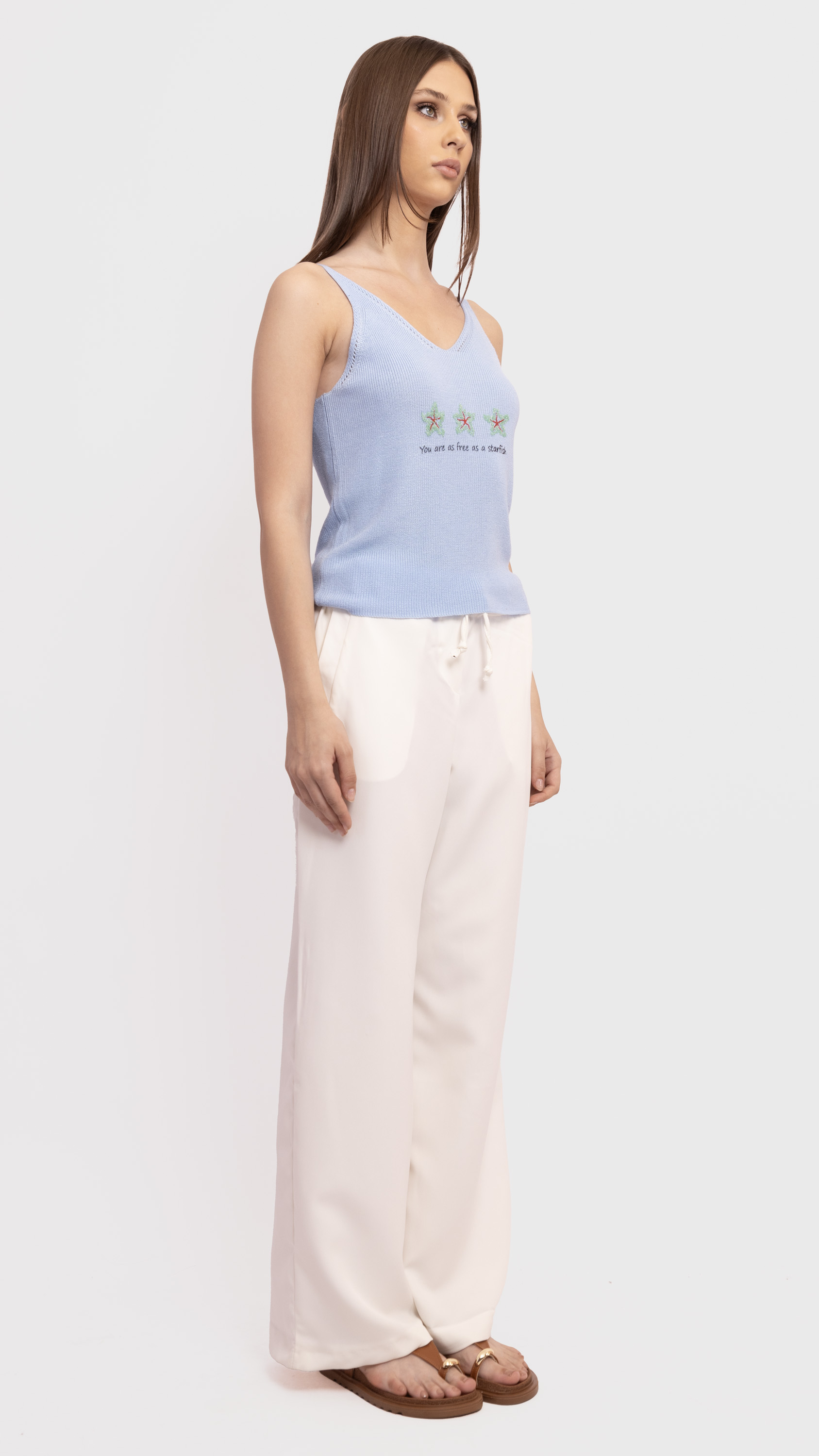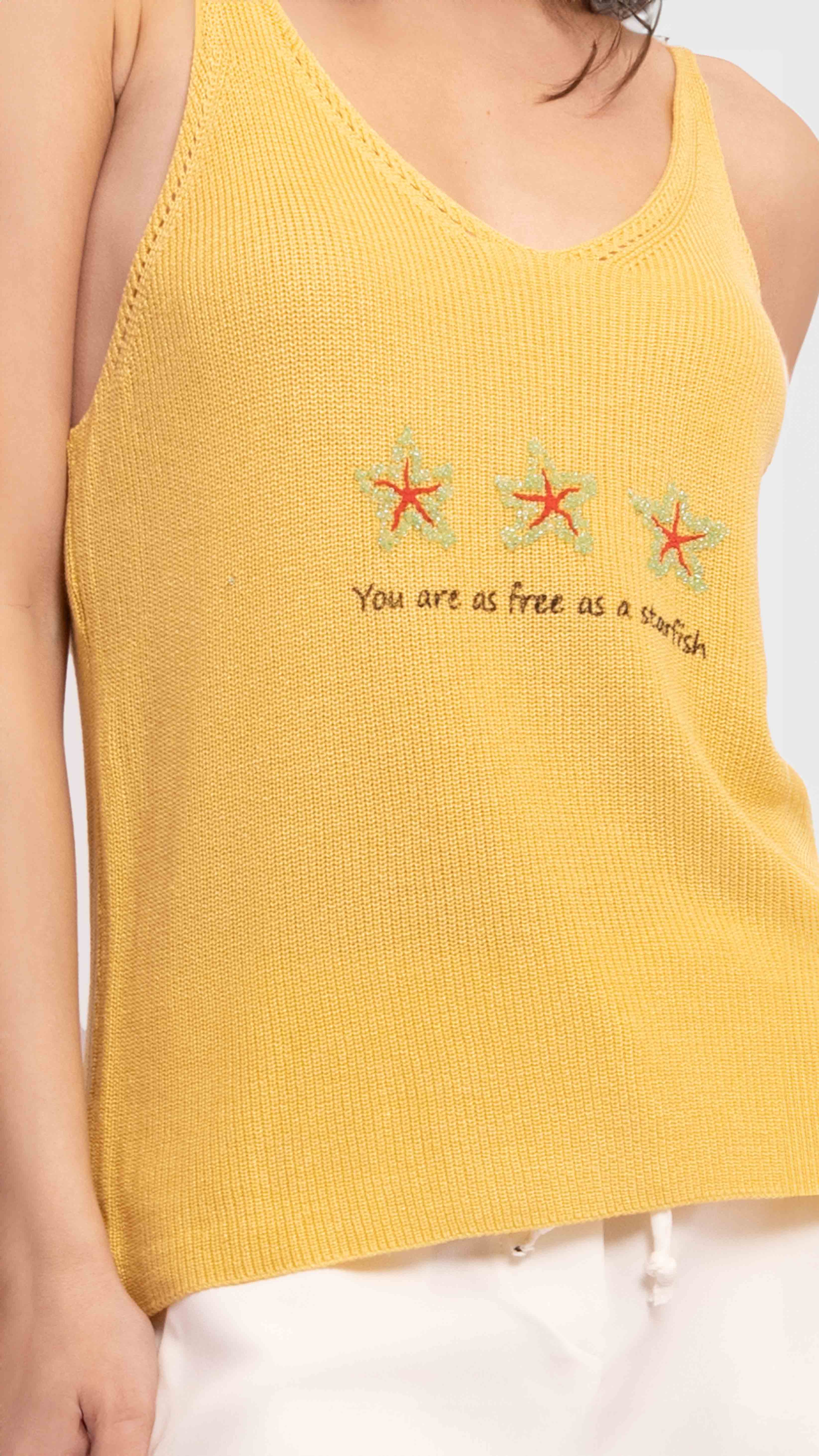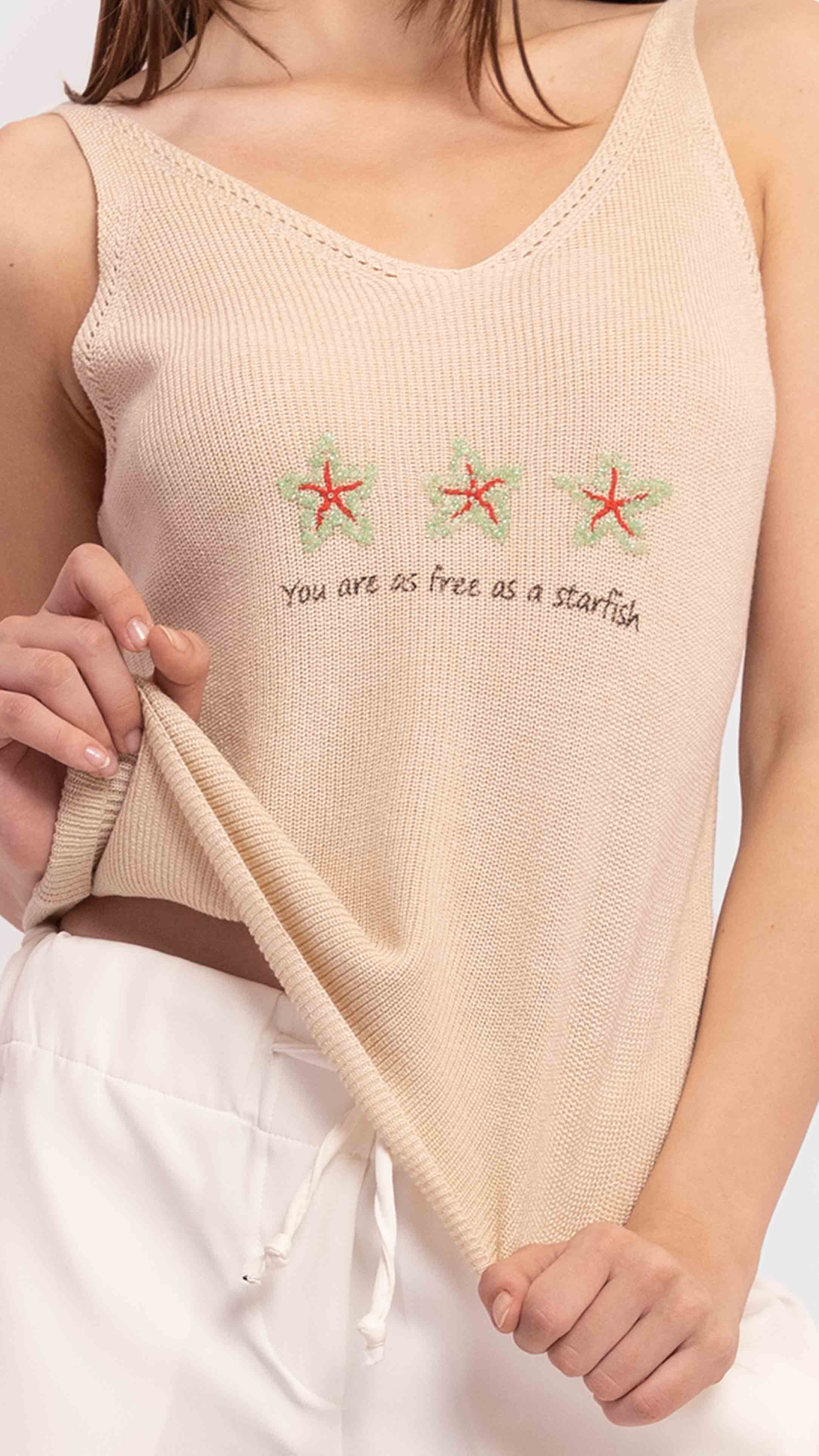 Add a whimsical touch to your summer wardrobe with this embroidered knit tank, featuring playful starfish and inspiring text.