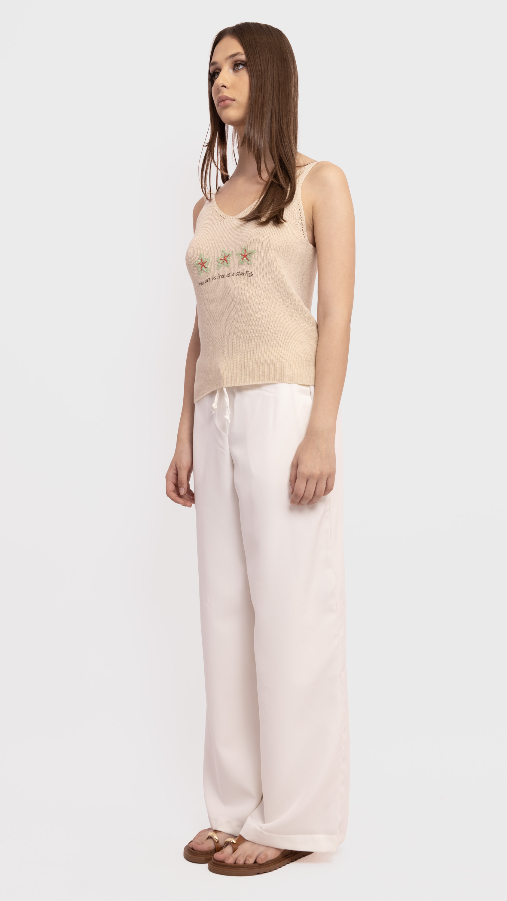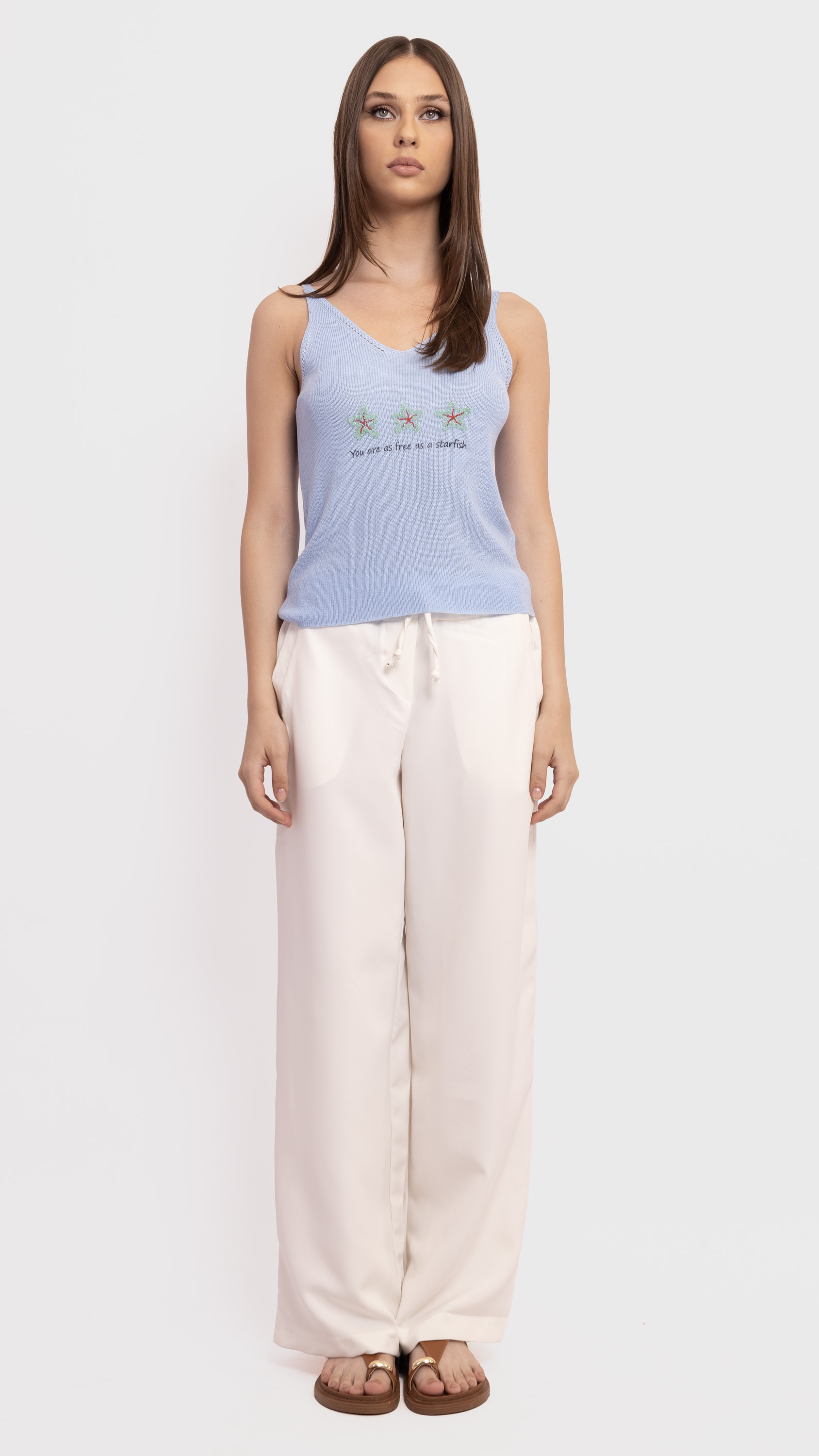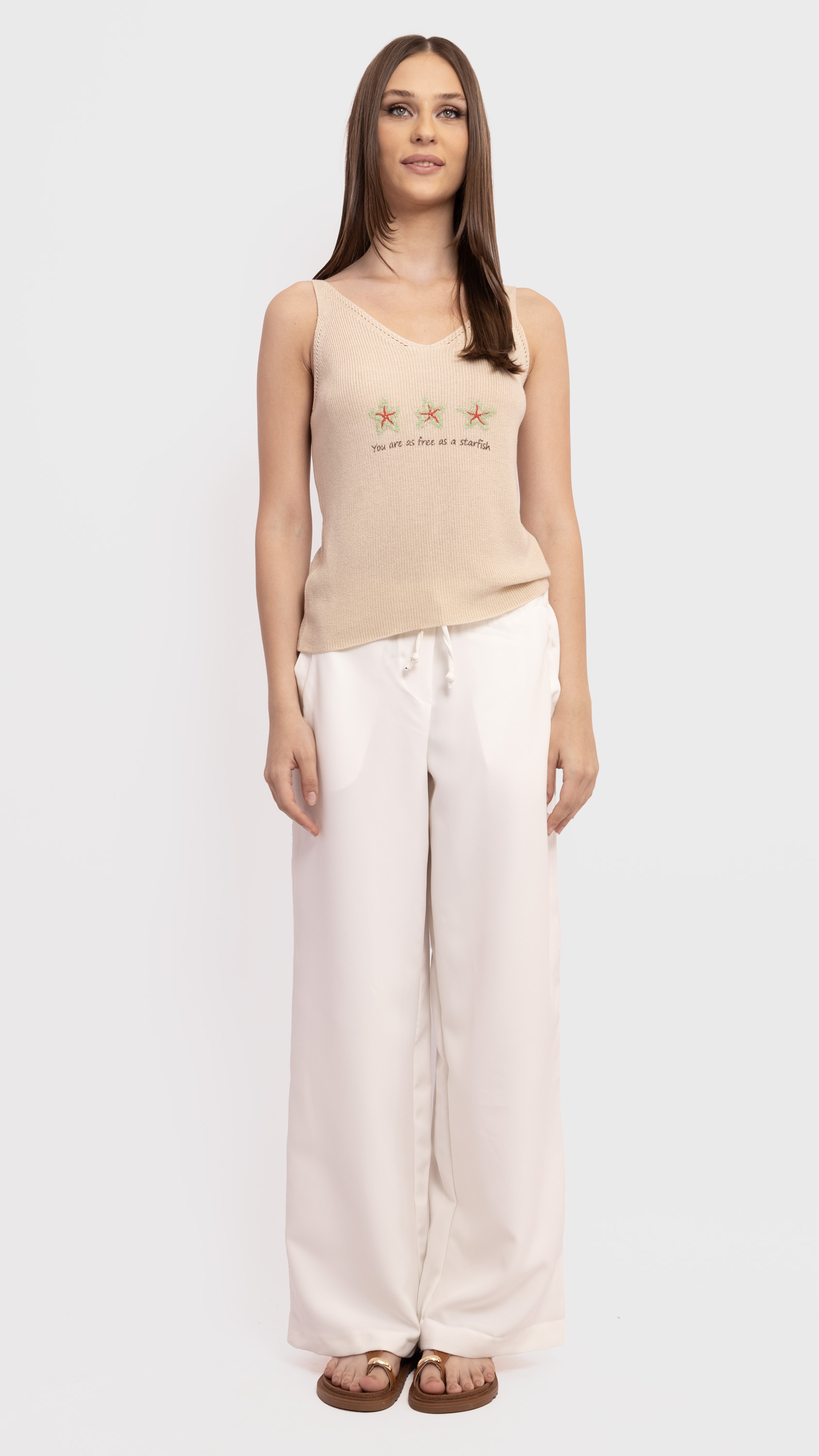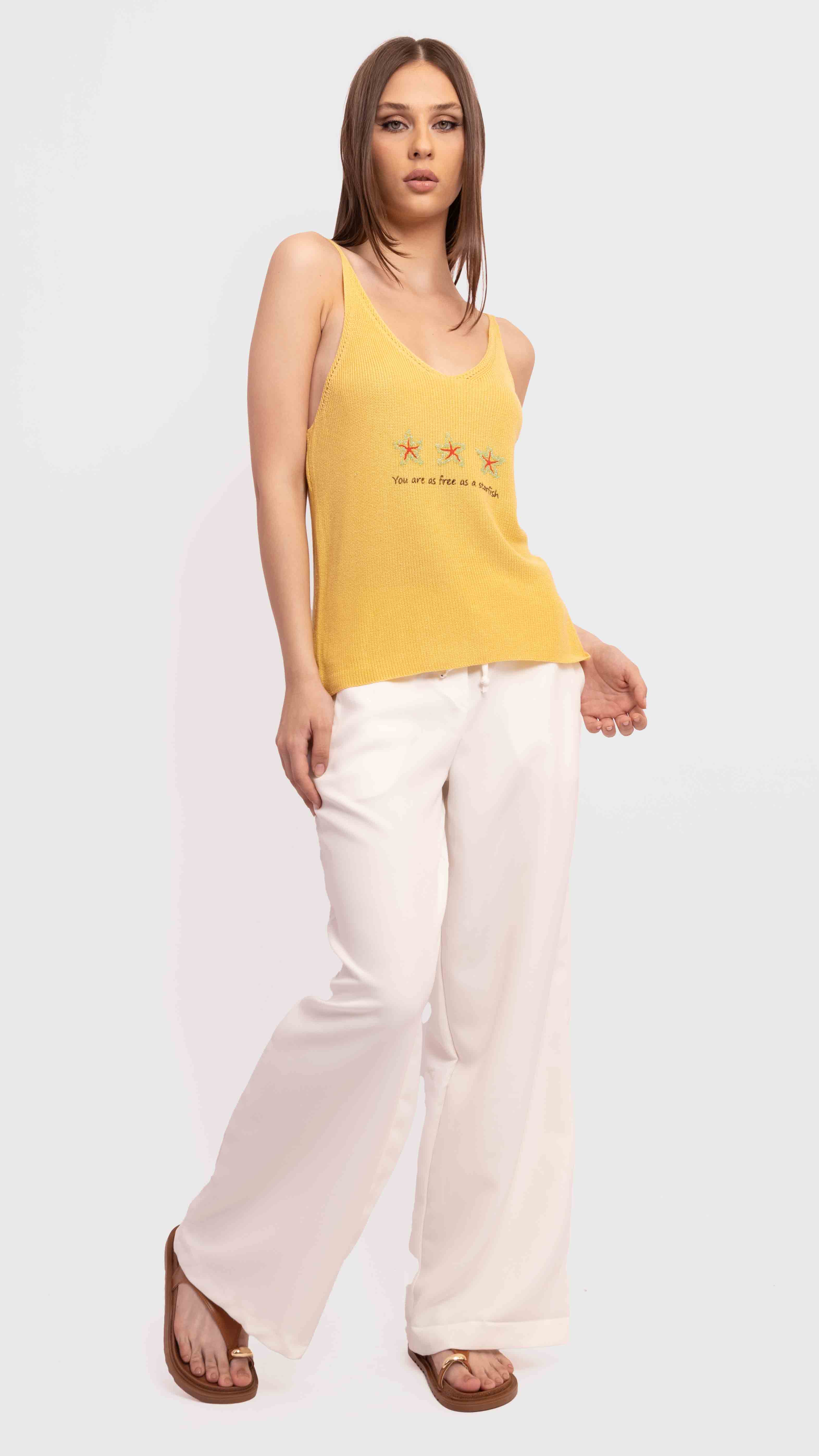 Add a whimsical touch to your summer wardrobe with this embroidered knit tank, featuring playful starfish and inspiring text.