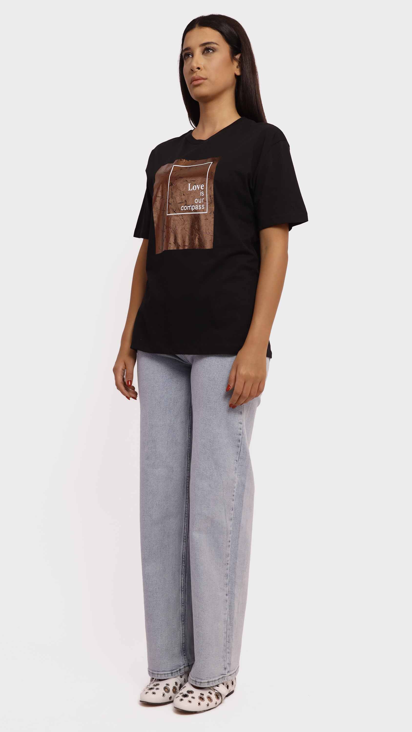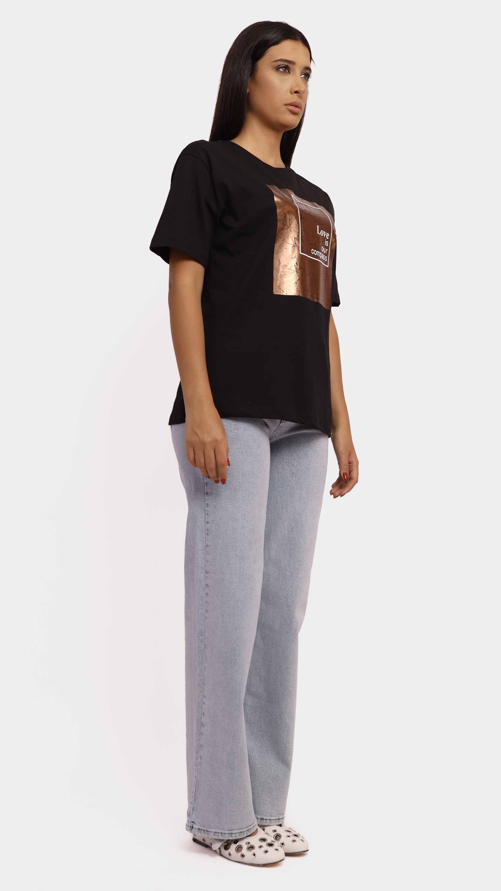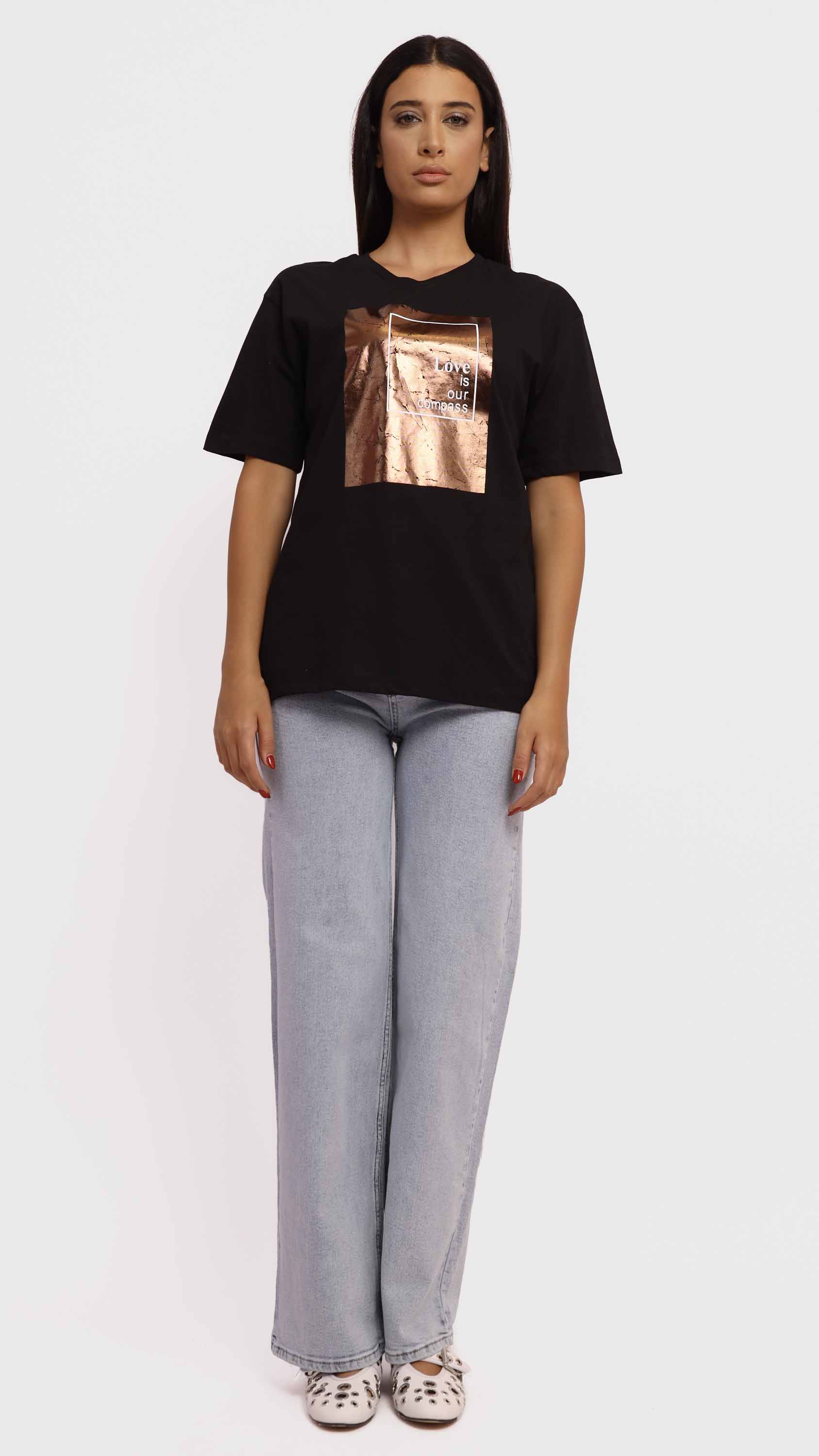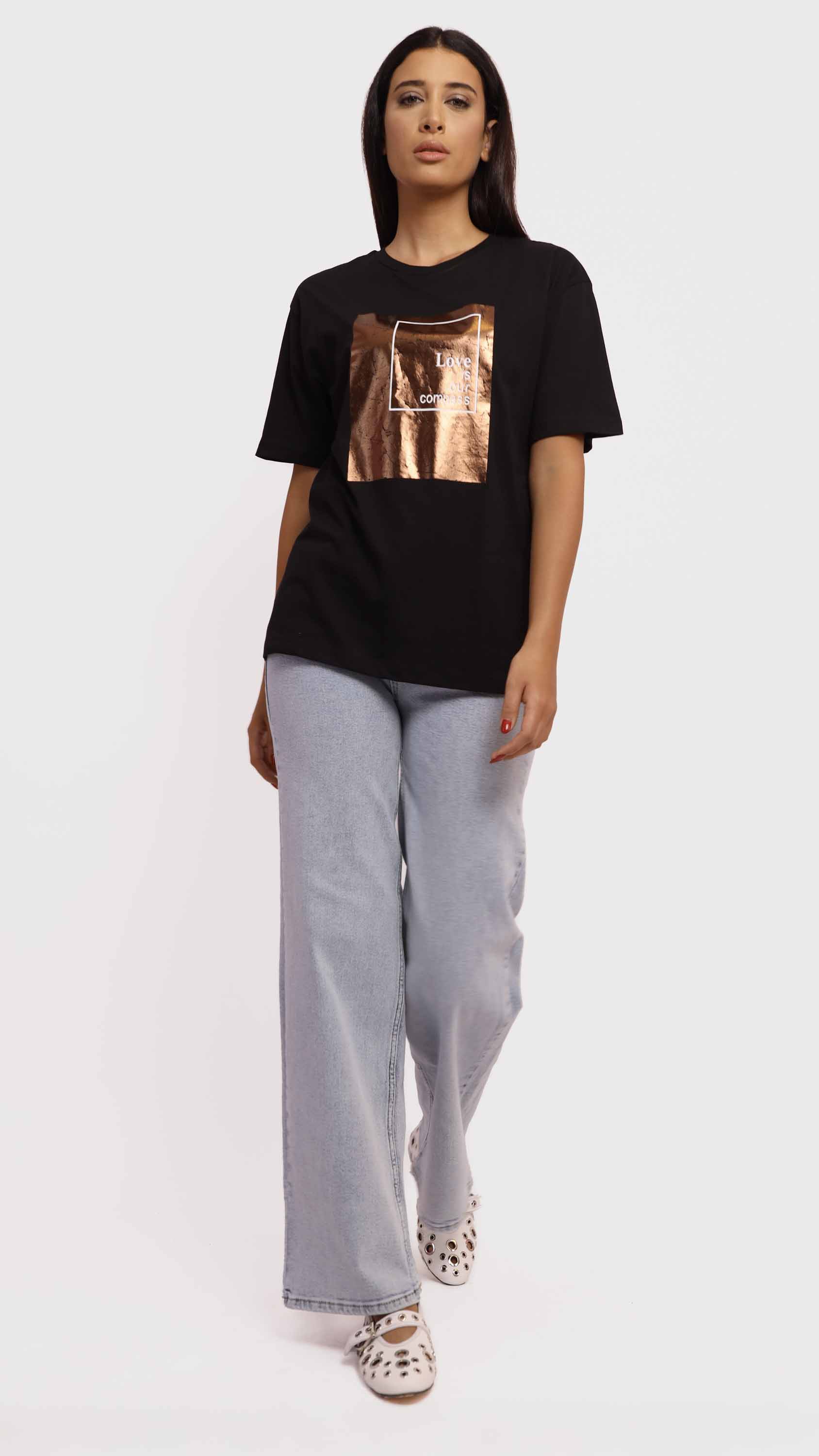 Make a subtle yet powerful statement with this Graphic Tee with Copper Foil Print. Crafted from soft cotton-blend fabric, it features a striking crinkled copper foil square with the uplifting message “Love is our compass” at the center. With its regular fit, crew neckline, and minimalist style, it’s perfect for adding a meaningful touch to your casual wardrobe.