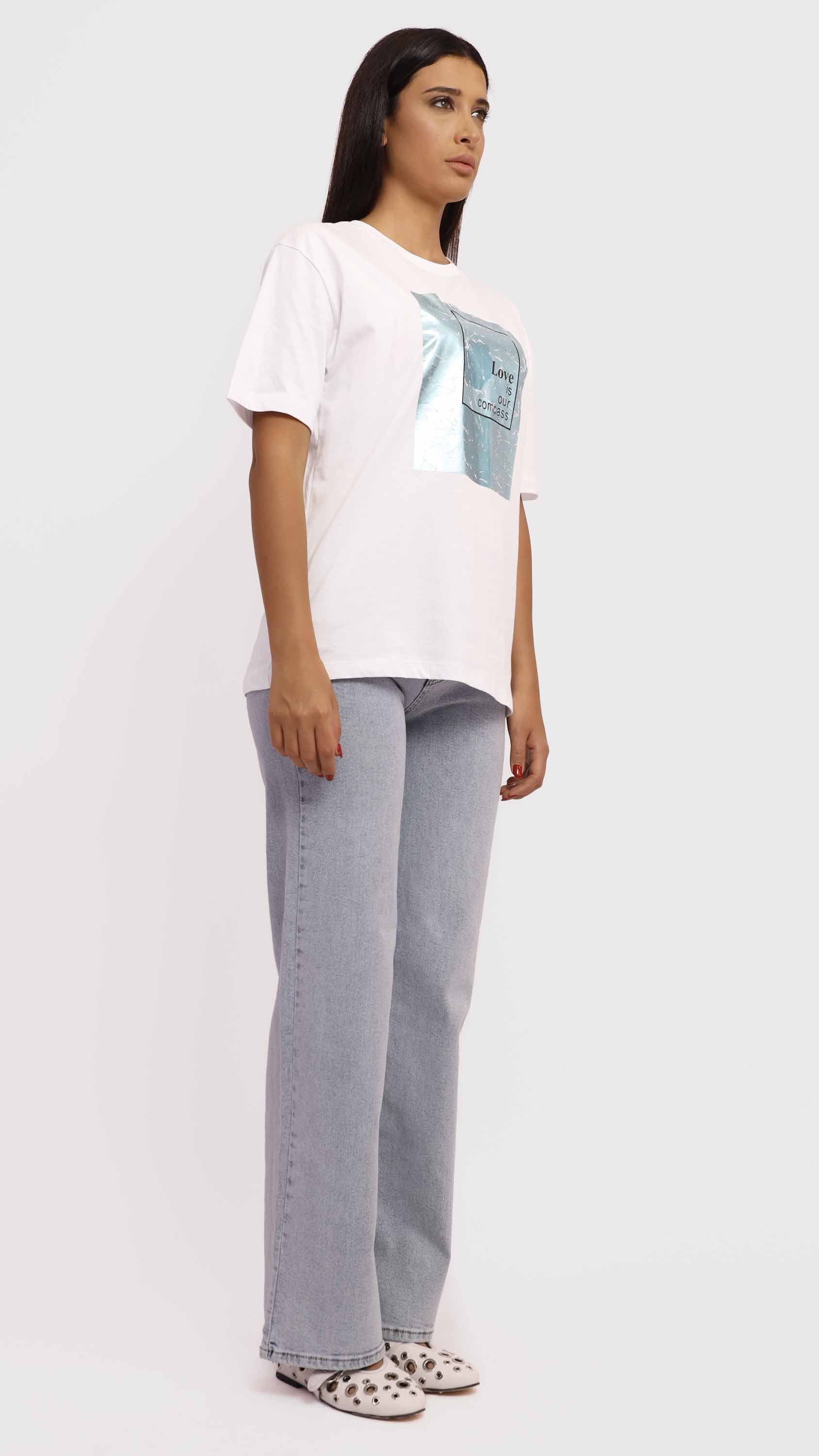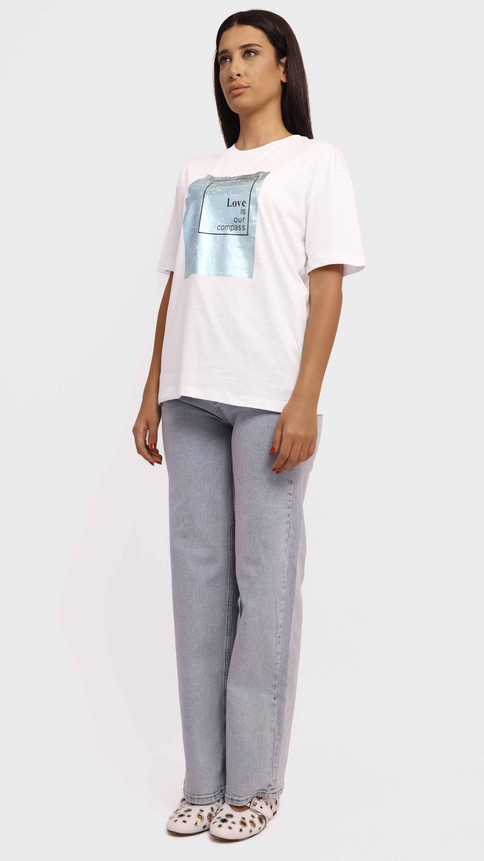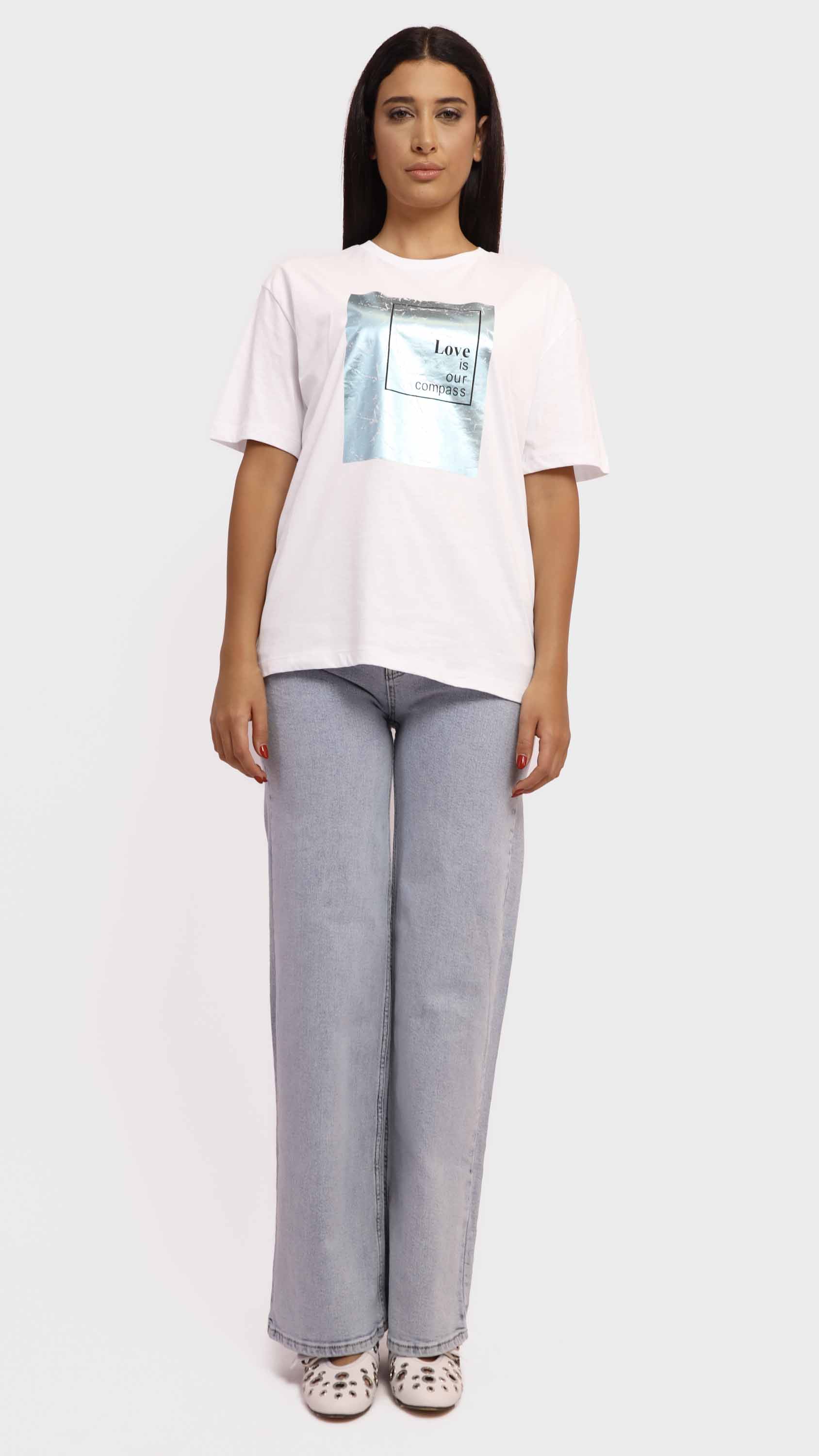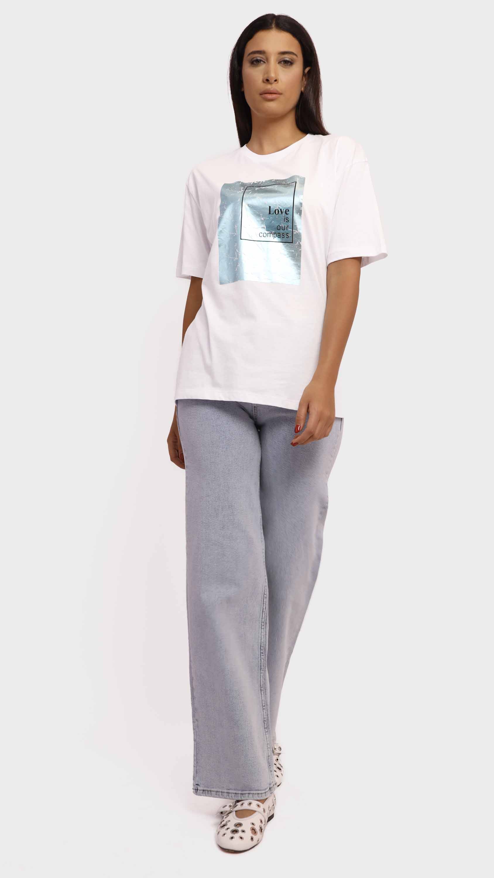 Make a subtle yet powerful statement with this Graphic Tee with Copper Foil Print. Crafted from soft cotton-blend fabric, it features a striking crinkled copper foil square with the uplifting message “Love is our compass” at the center. With its regular fit, crew neckline, and minimalist style, it’s perfect for adding a meaningful touch to your casual wardrobe.