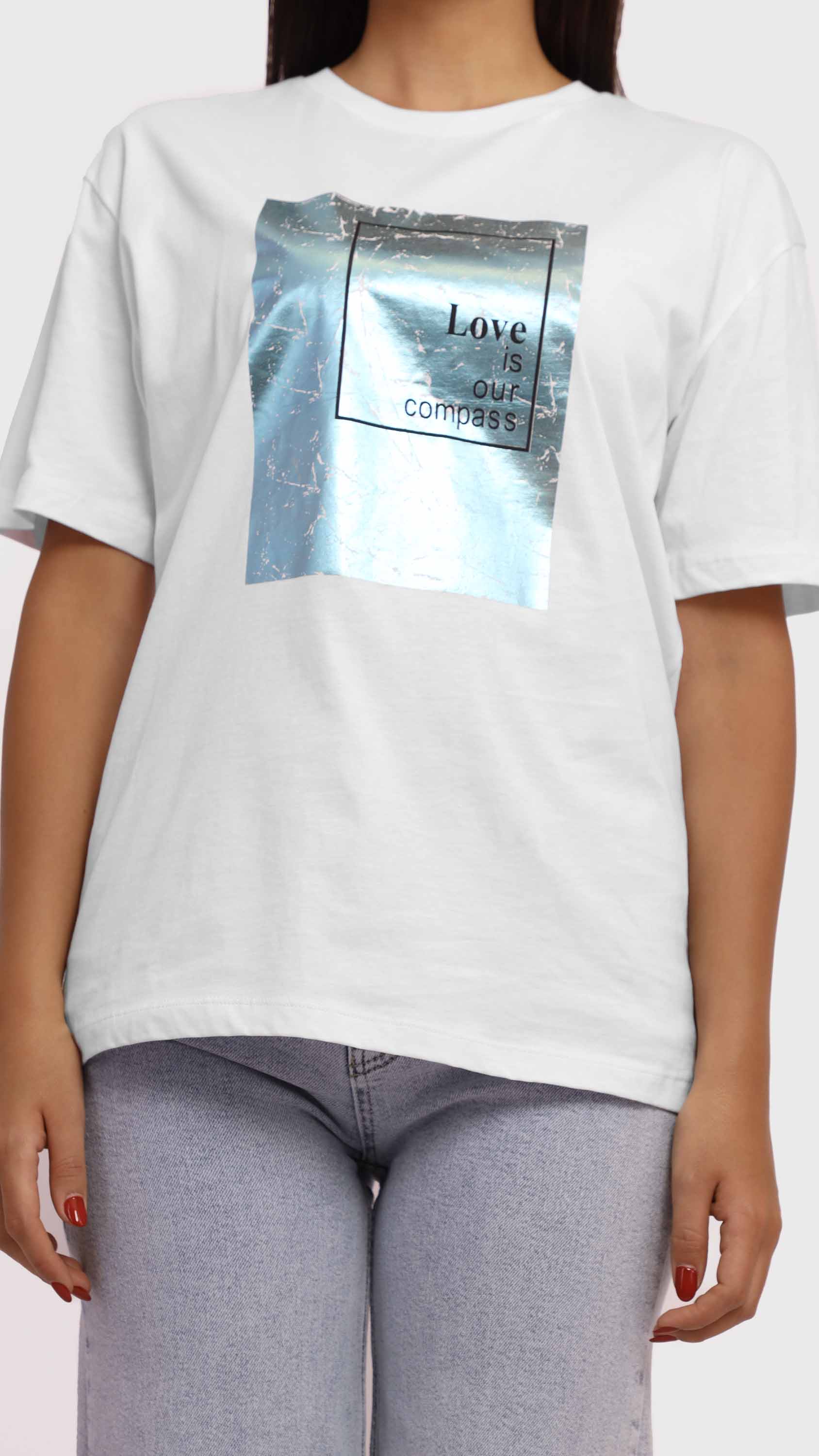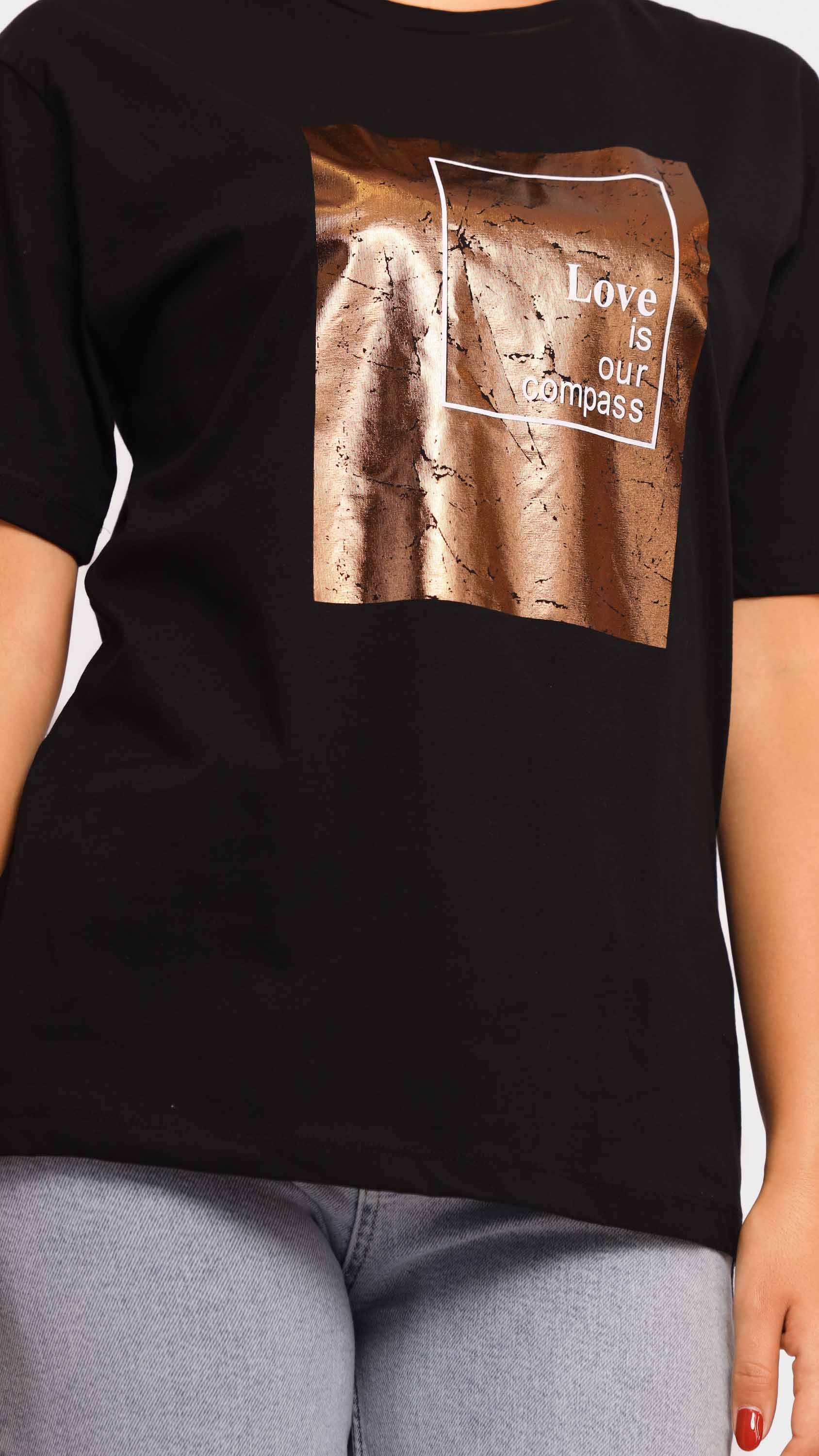 Add a meaningful touch to your casual wardrobe with this graphic tee featuring a striking copper foil square and the uplifting quote “Love is our compass.”