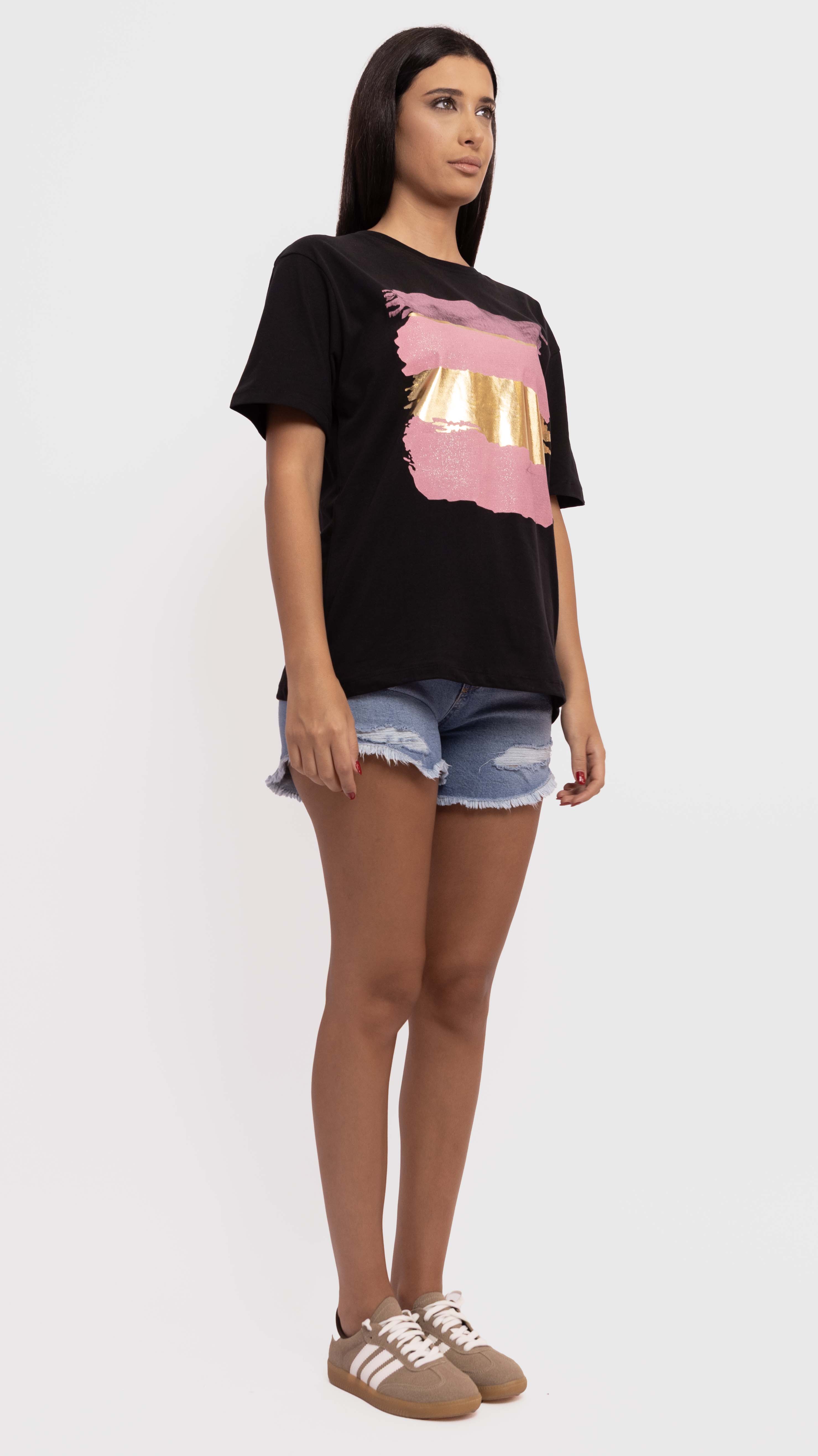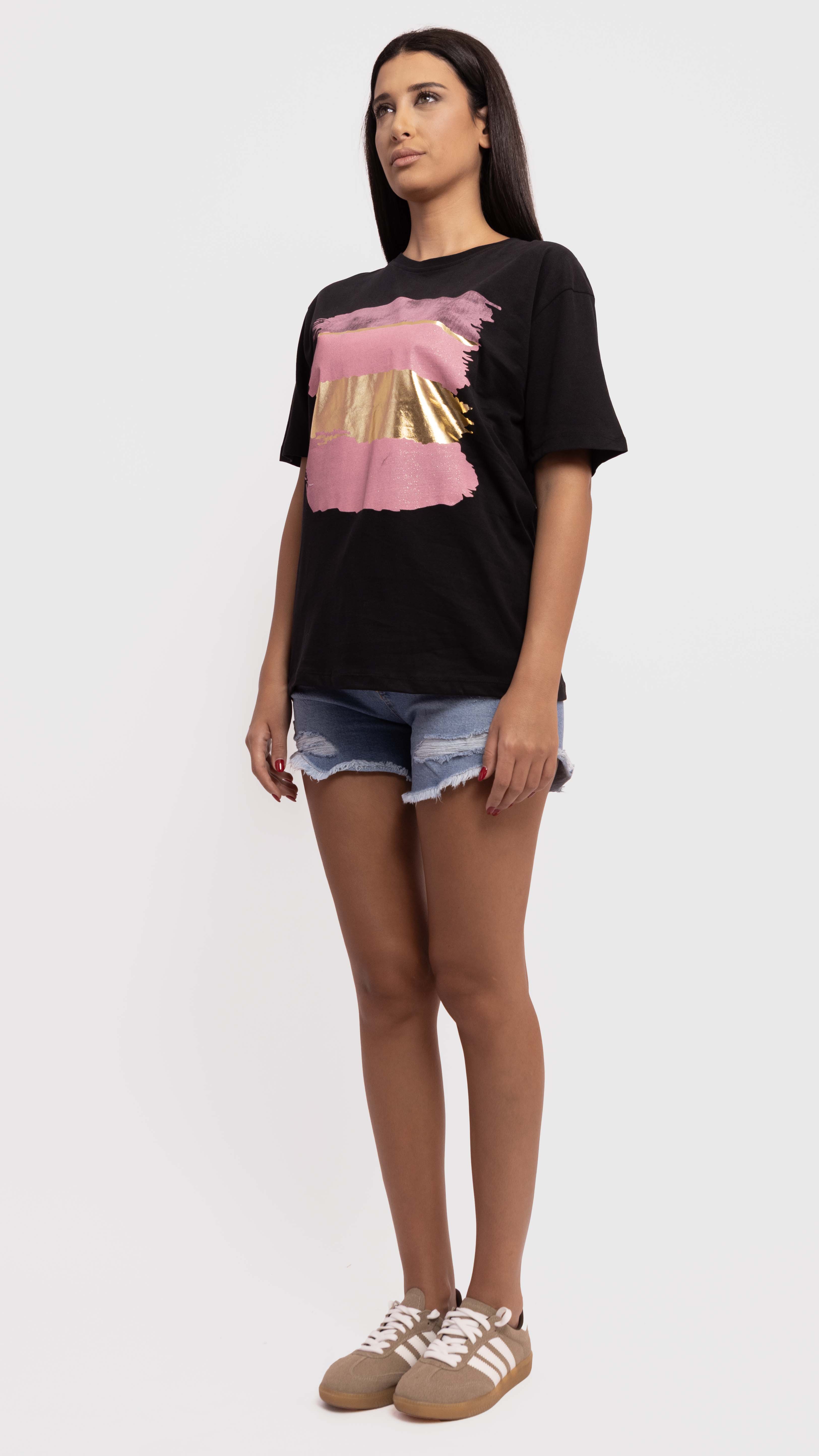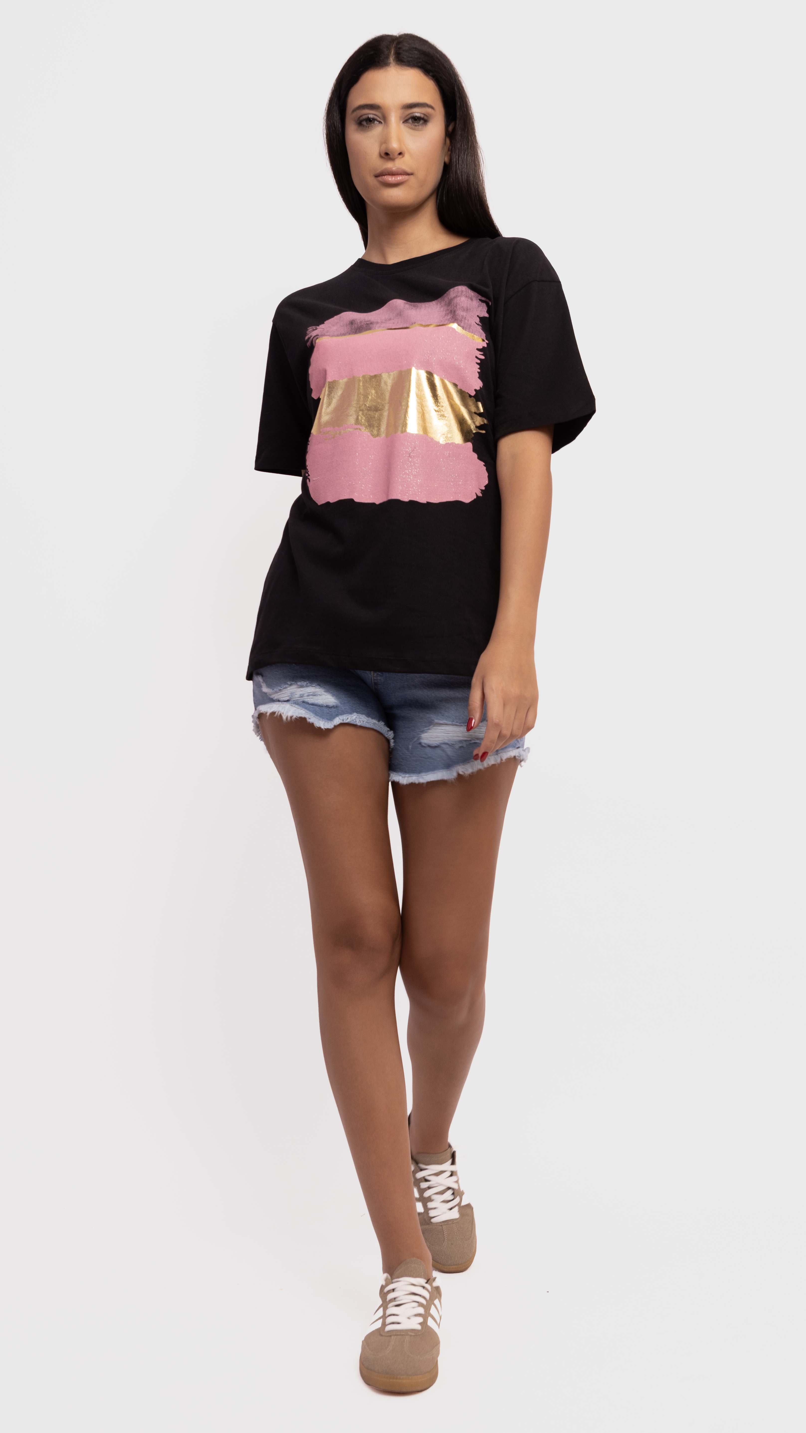 Add an artsy edge to your casual looks with this black graphic tee, featuring bold pink and gold brushstroke prints.